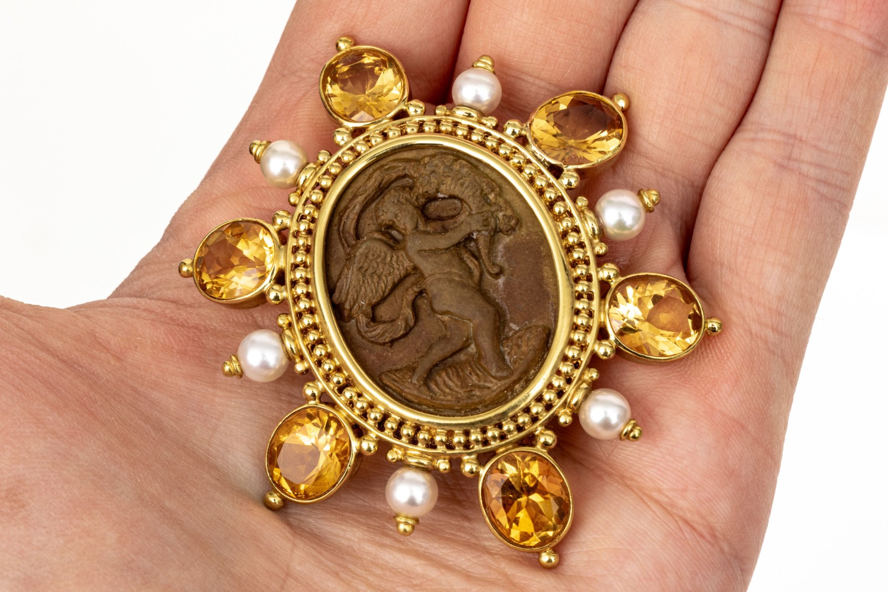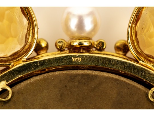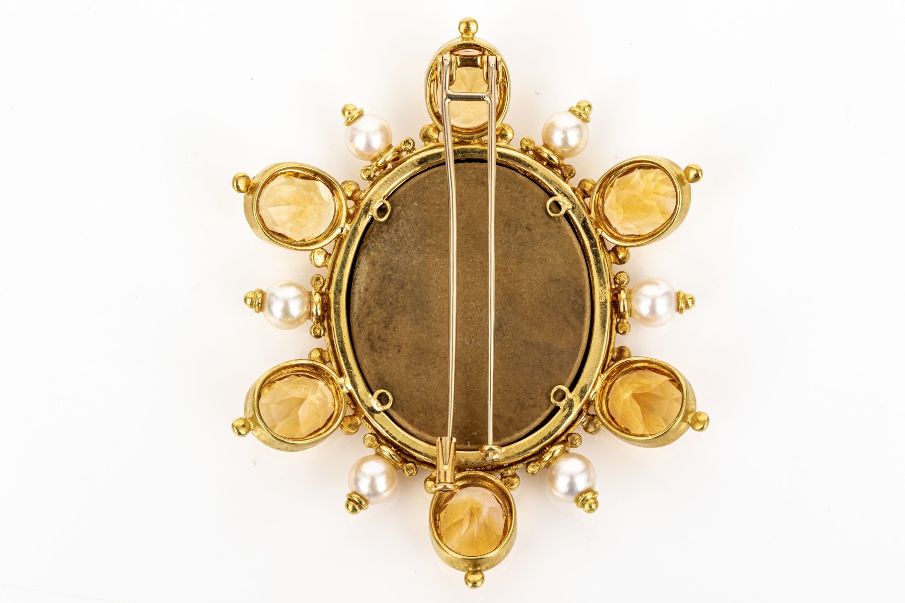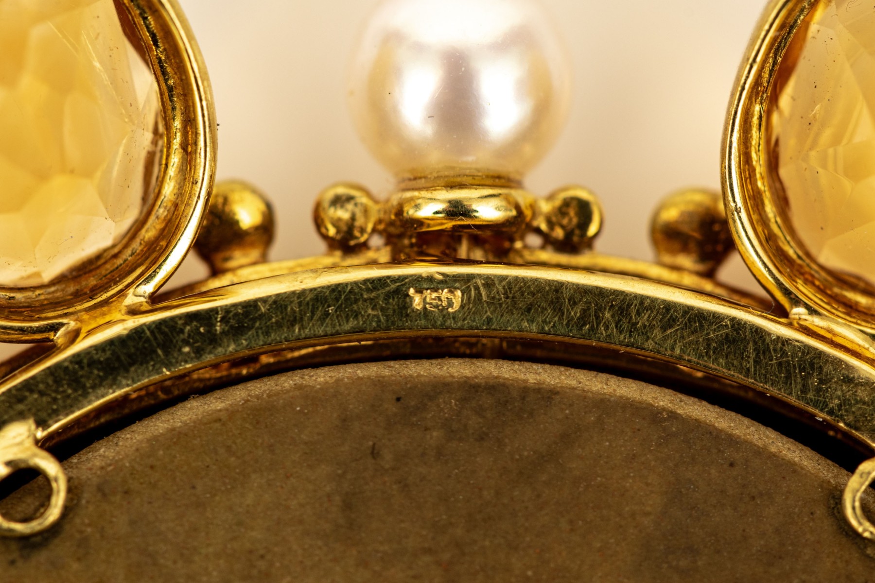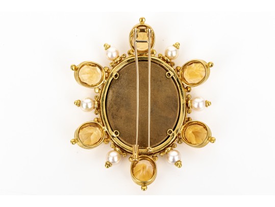 18k yellow gold stunning citrine and cultured pearl framed cherub cameo brooch. This magnificent piece features a fabulous carved cherub cameo, surrounded by a beaded frame and finished by a border of 5.75 mm cultured pearls and alternating oval faceted, yellow citrines, app. 14.52 TCW, bezel set. The brooch is finished by a two pronged pin stem.