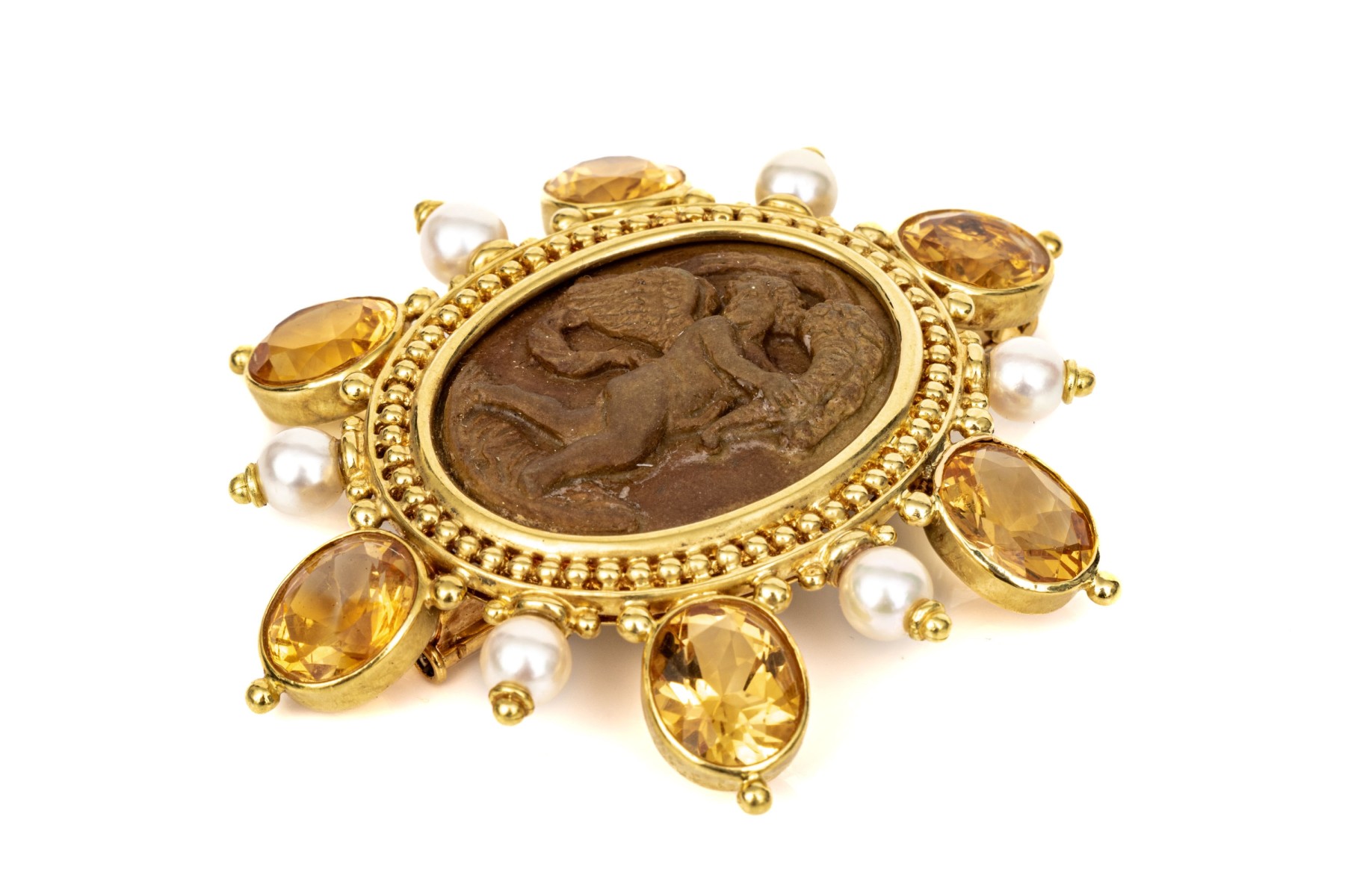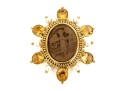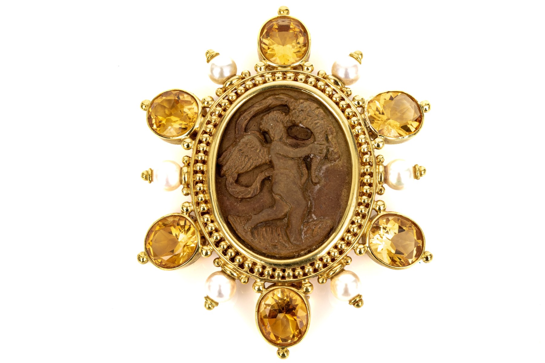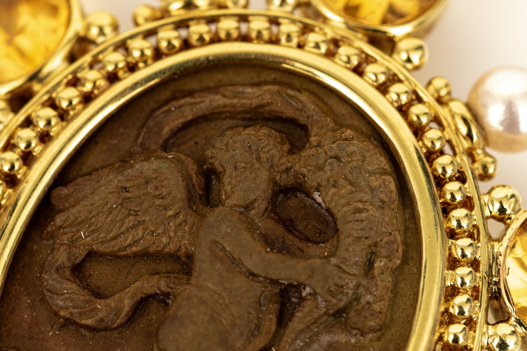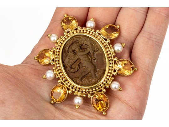 18k yellow gold stunning citrine and cultured pearl framed cherub cameo brooch. This magnificent piece features a fabulous carved cherub cameo, surrounded by a beaded frame and finished by a border of 5.75 mm cultured pearls and alternating oval faceted, yellow citrines, app. 14.52 TCW, bezel set. The brooch is finished by a two pronged pin stem.