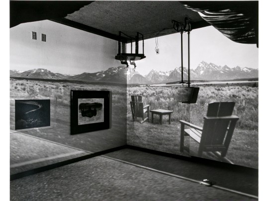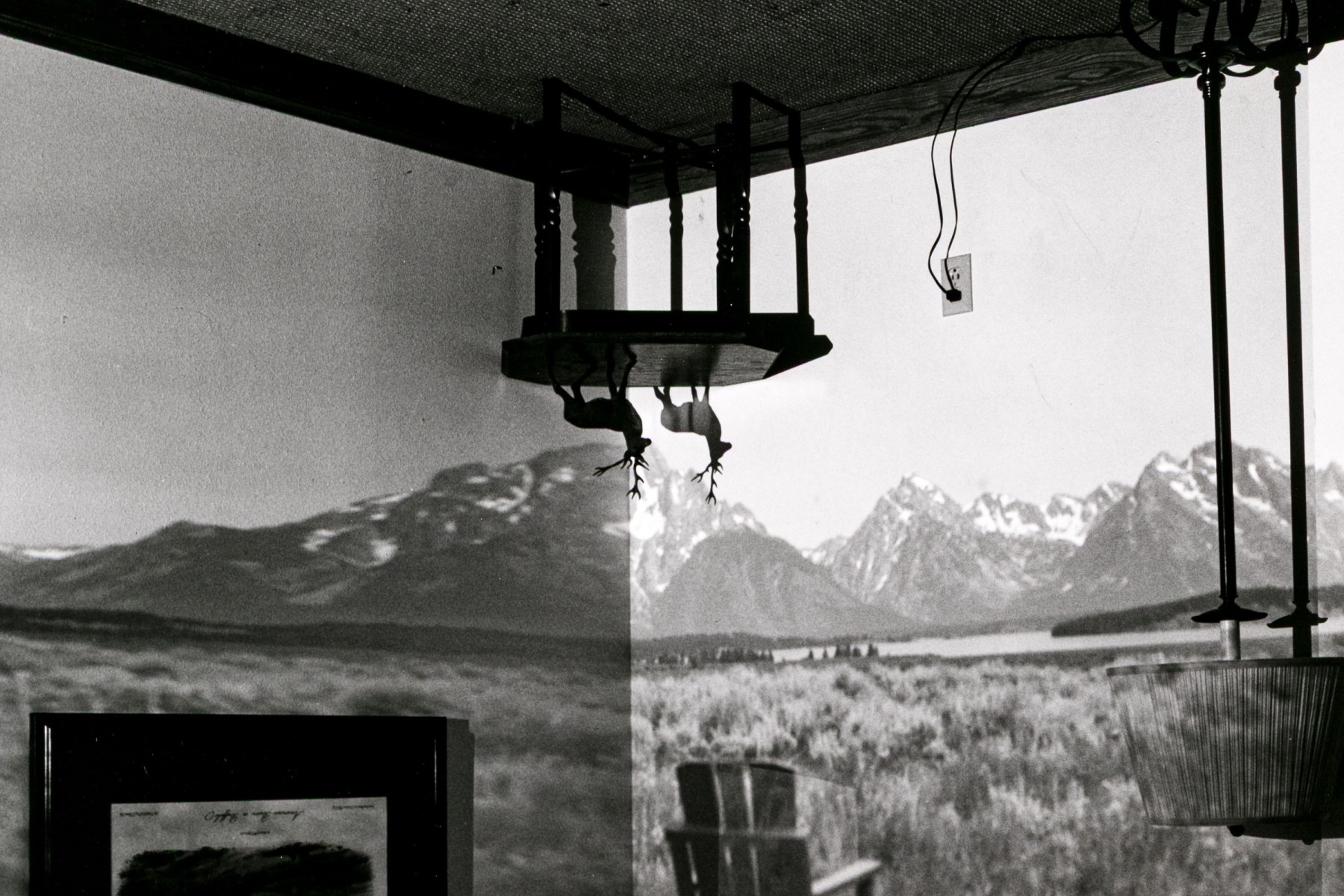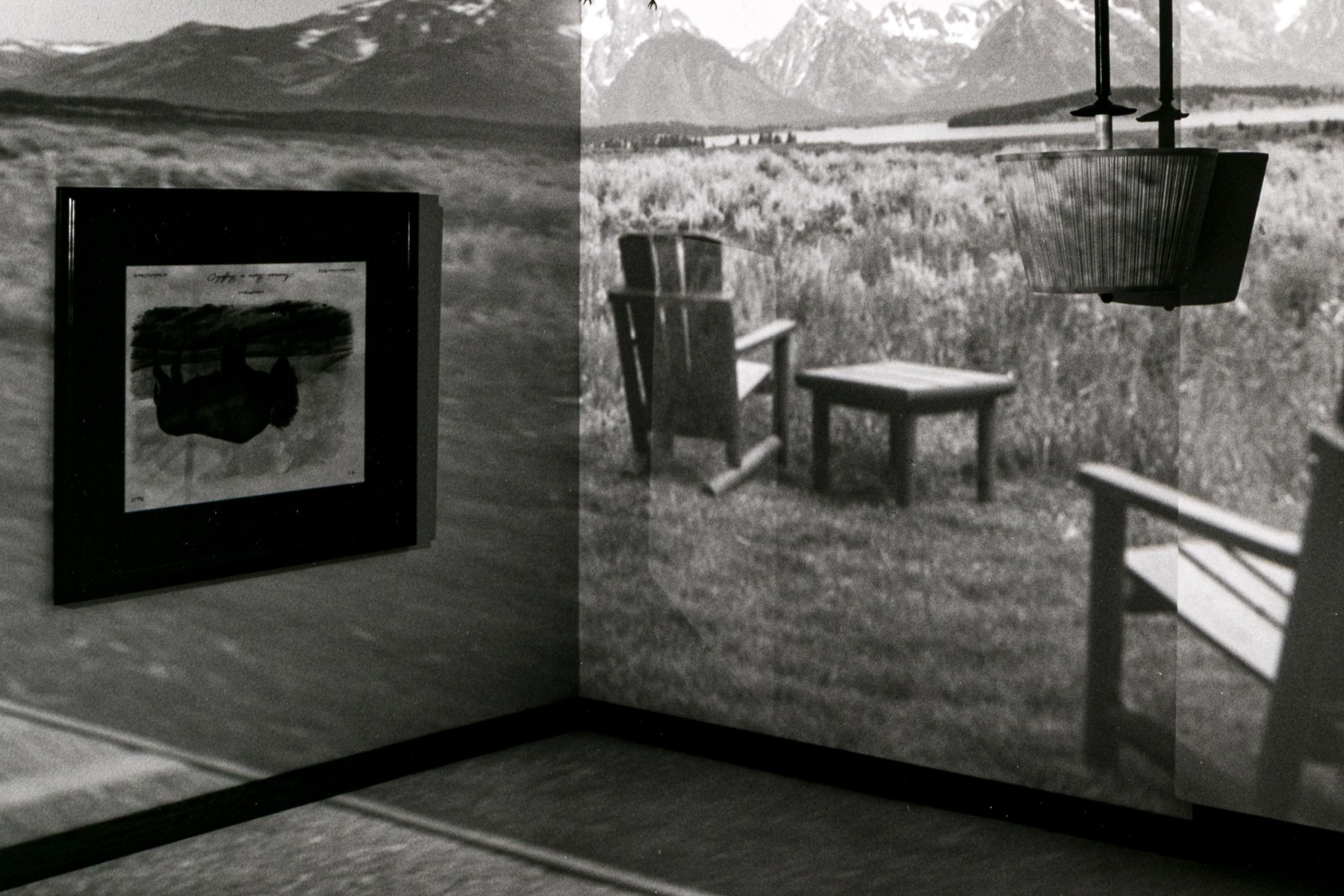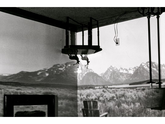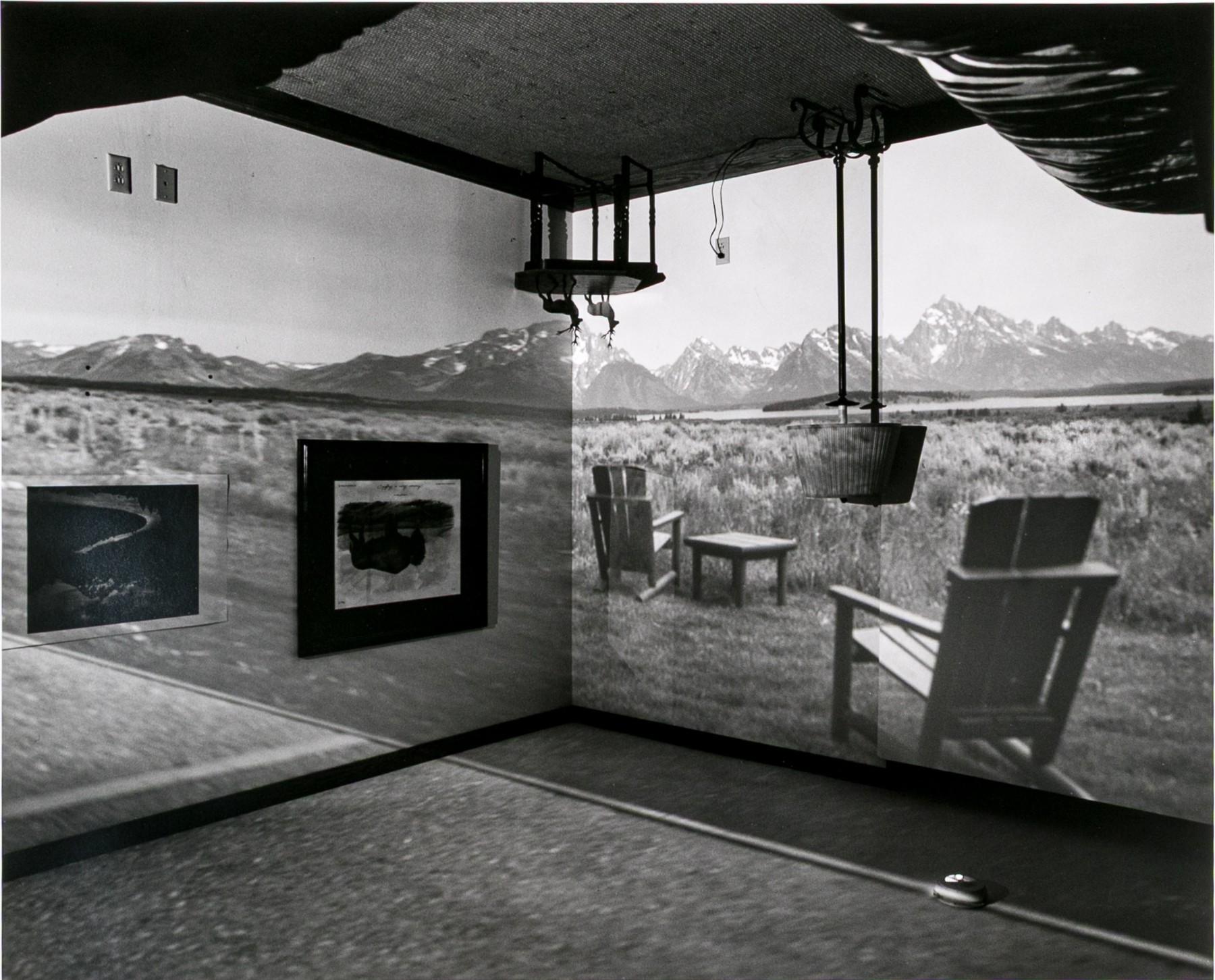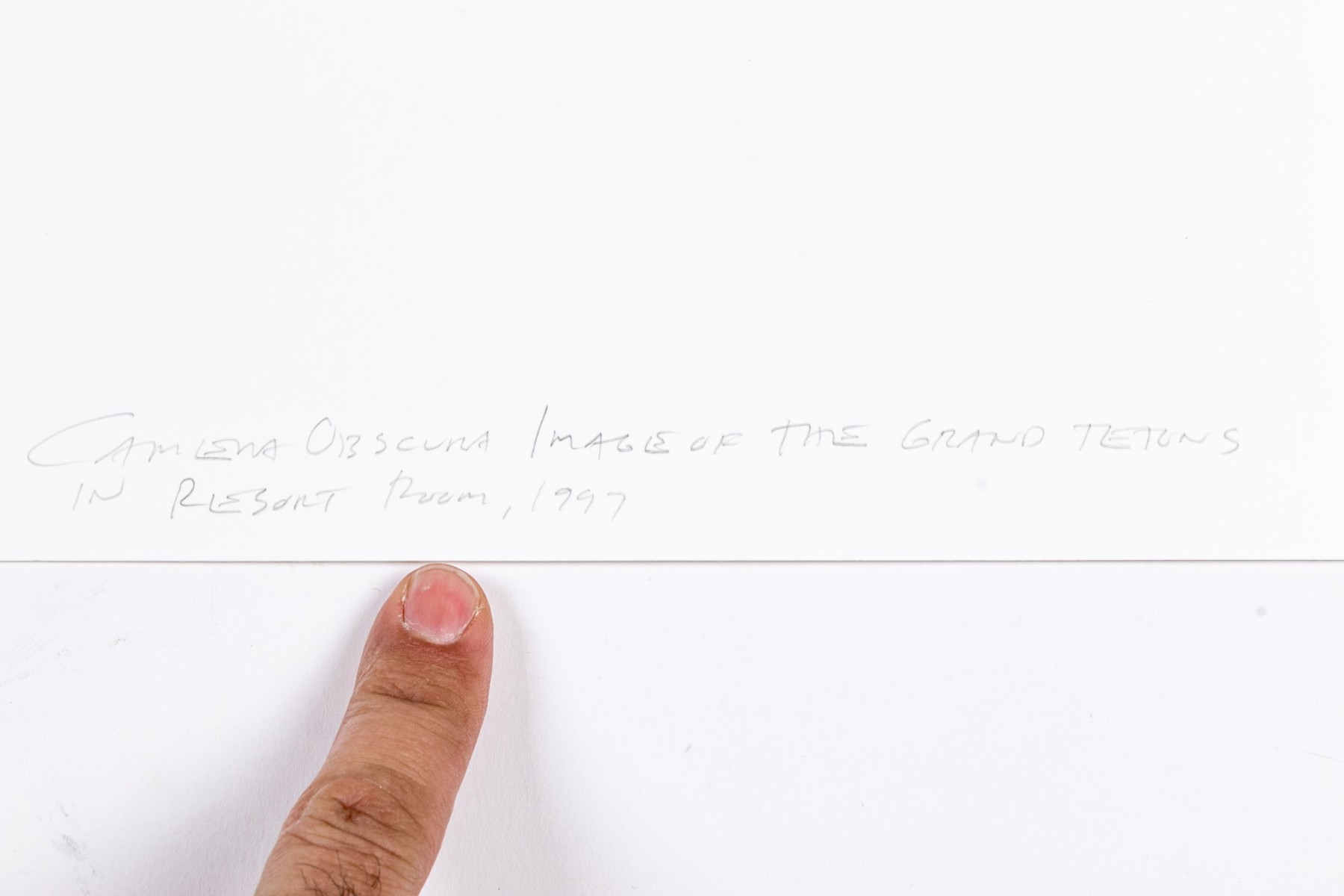 Abelardo Morell (Cuban-American, b. 1948) "Camera Obscura Image of the Grand Teton in Resort Room, 1997" photographic print depicting a view of Adirondack chairs overlooking a vast natural landscape with mountains cast over a room interior with a lamp, table, and framed pictures on the wall. Handwritten labels on the verso. Unframed.