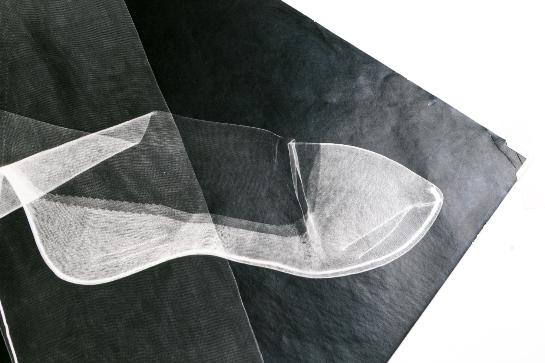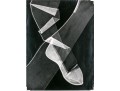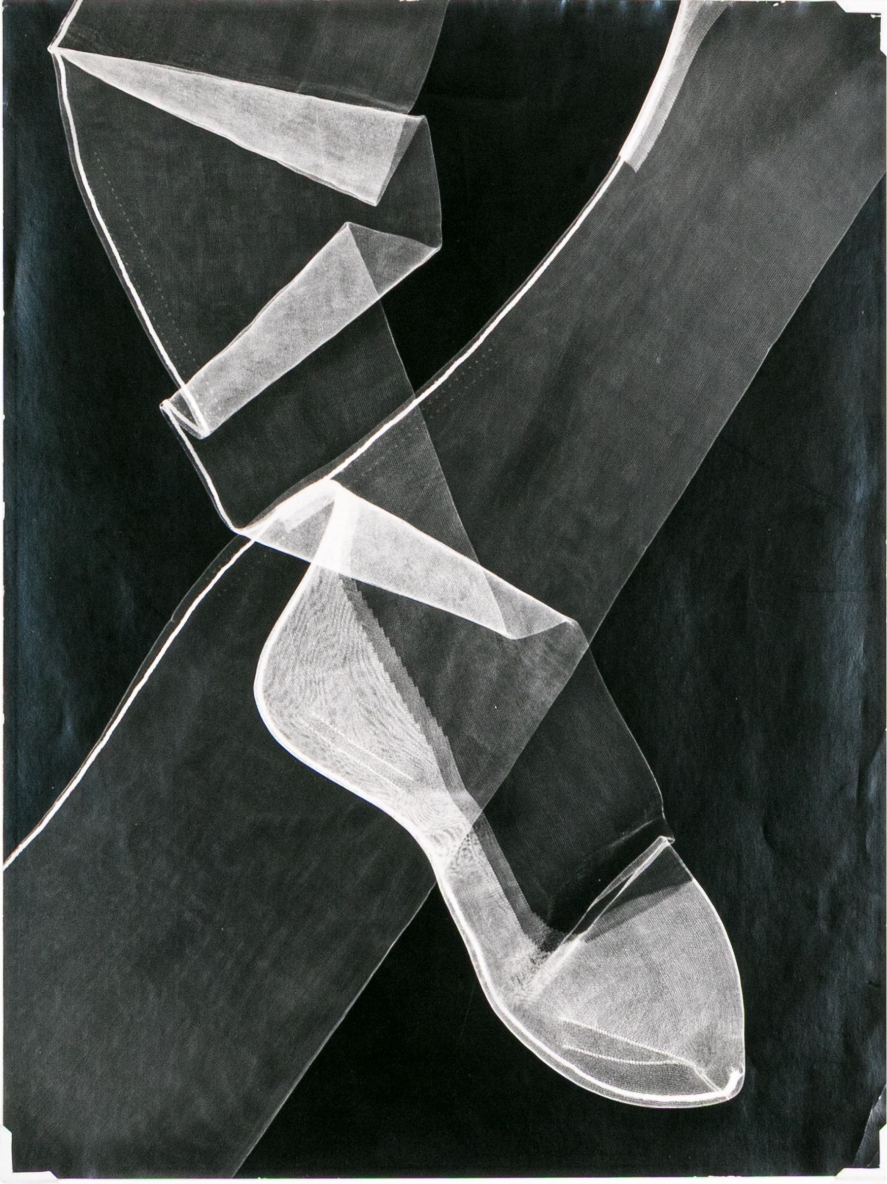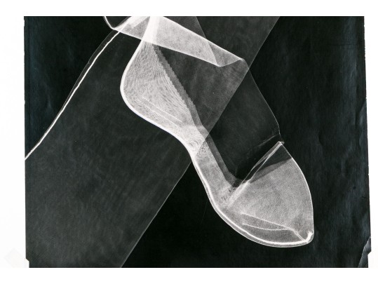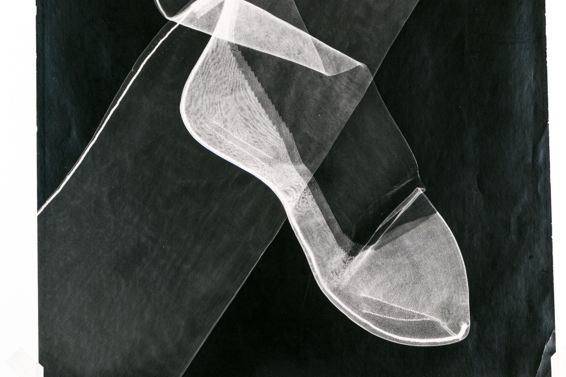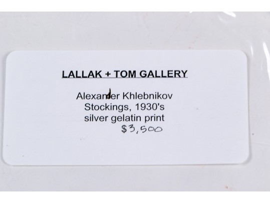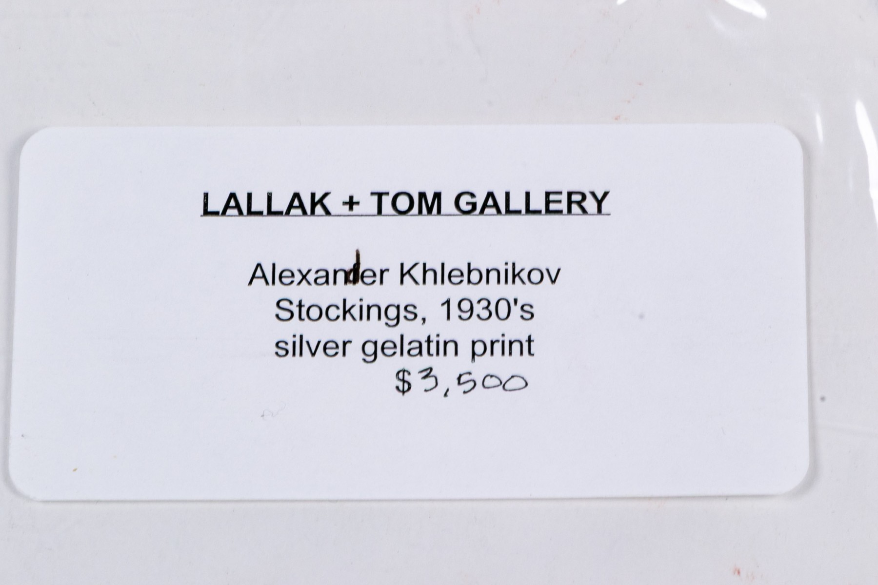 Alexander Khlebnikov (Russian, 1897-1979) “Photogram" 1935 gelatin silver print depicting a pair of stockings with eye-catching contrast created by the overlapping transparent fabric against a black ground. With handwritten labels on the verso and bearing a label from Lallak + Tom Gallery denoting the original gallery price of $3,500. Unframed.
