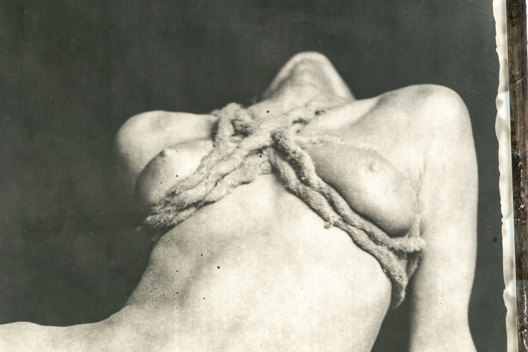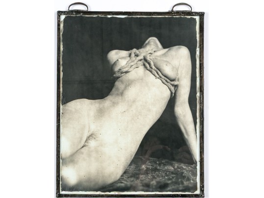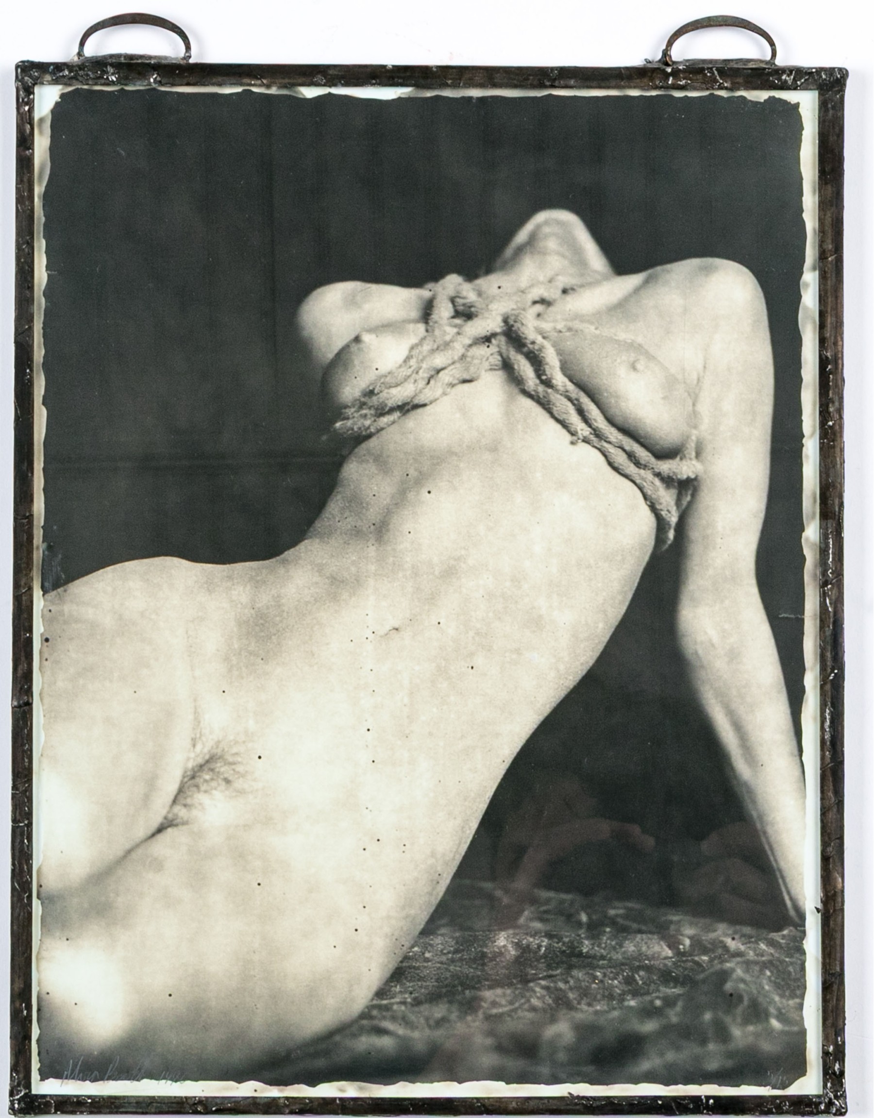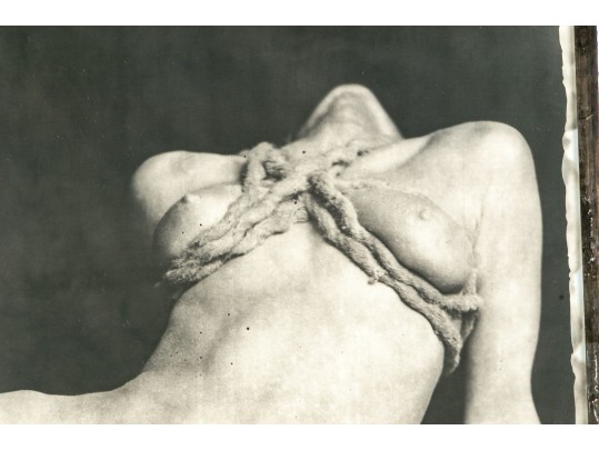 Alvin Booth (English-American [NY], B. 1959) "Untitled #960322" photographic print depicting a female nude with rope tied around the chest posed dramatically reclined with head tipped back against a dark ground. Pencil signed and dated lower left and labeled on the verso.