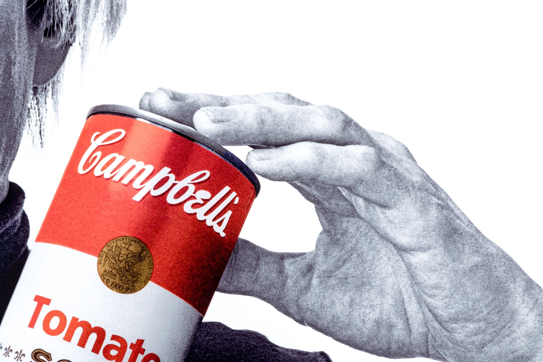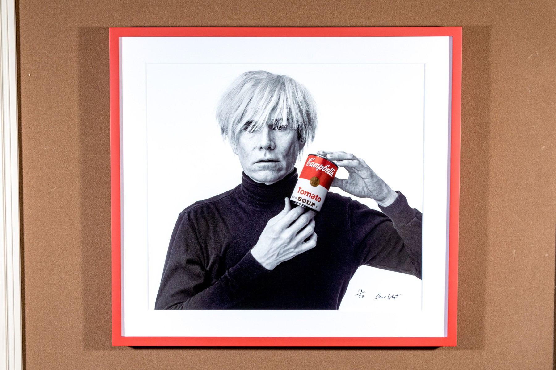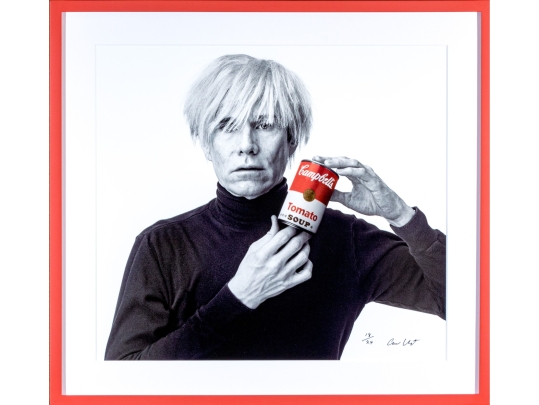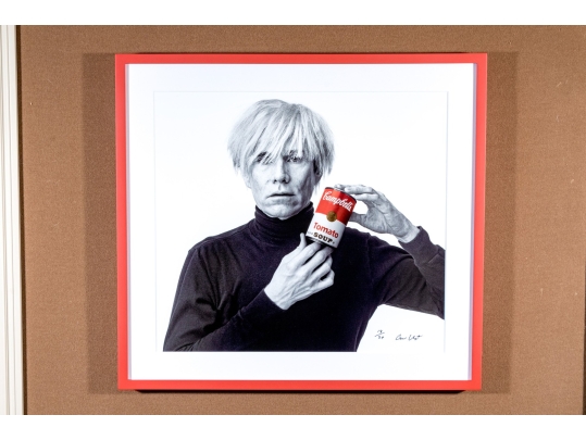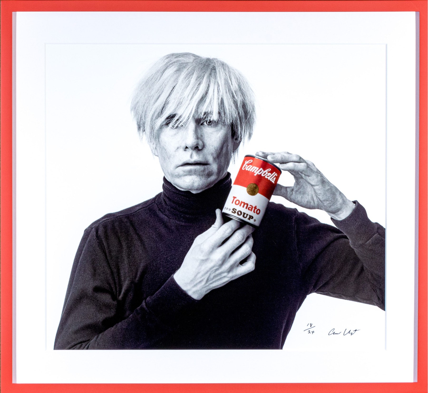 Andrew Unangst (American, b. 1950) "Andy Warhol with Red Campbell's Soup" limited edition archival photographic print on paper, circa 2020. Ink signed lower right and hand numbered 18/24 lower left. The photographic print is presented matted, glazed, and framed in red.