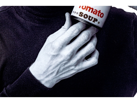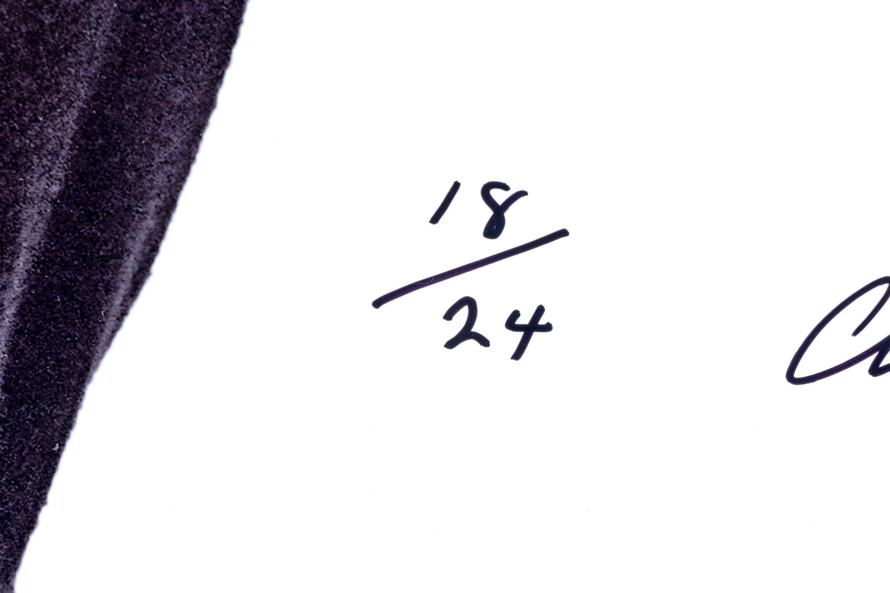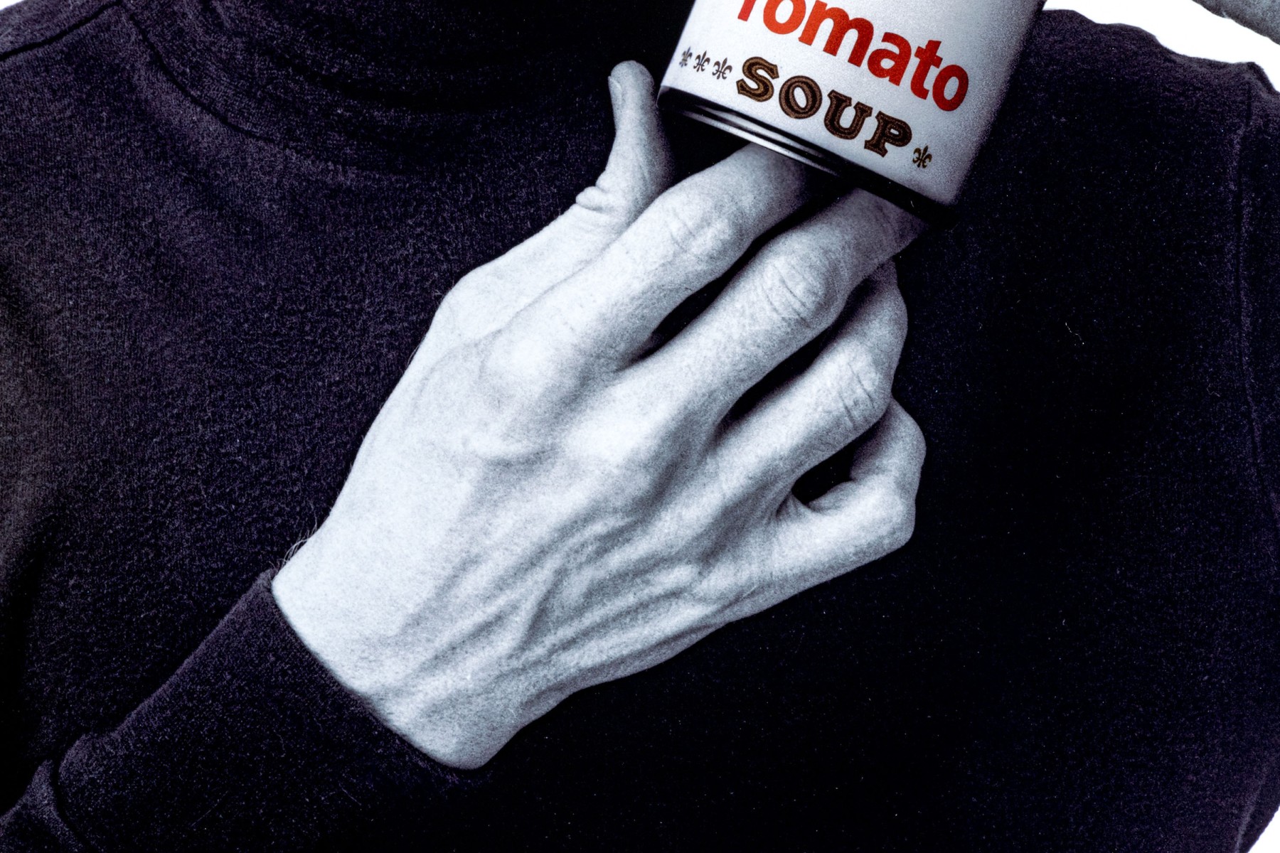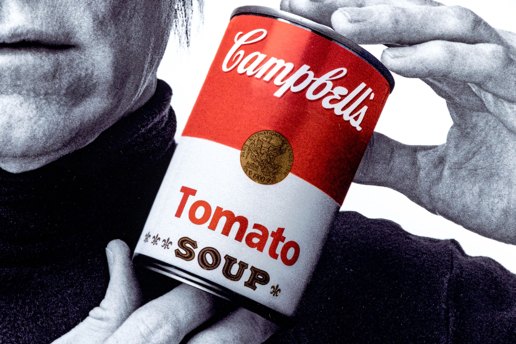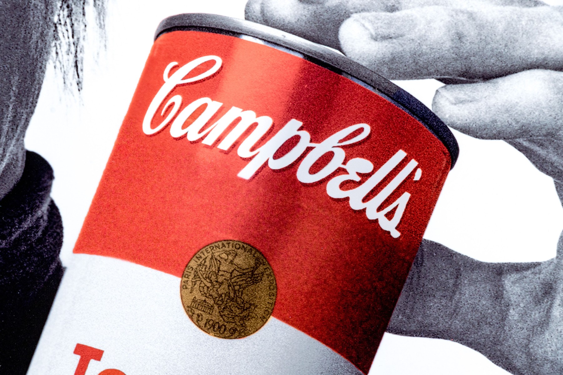 Andrew Unangst (American, b. 1950) "Andy Warhol with Red Campbell's Soup" limited edition archival photographic print on paper, circa 2020. Ink signed lower right and hand numbered 18/24 lower left. The photographic print is presented matted, glazed, and framed in red.