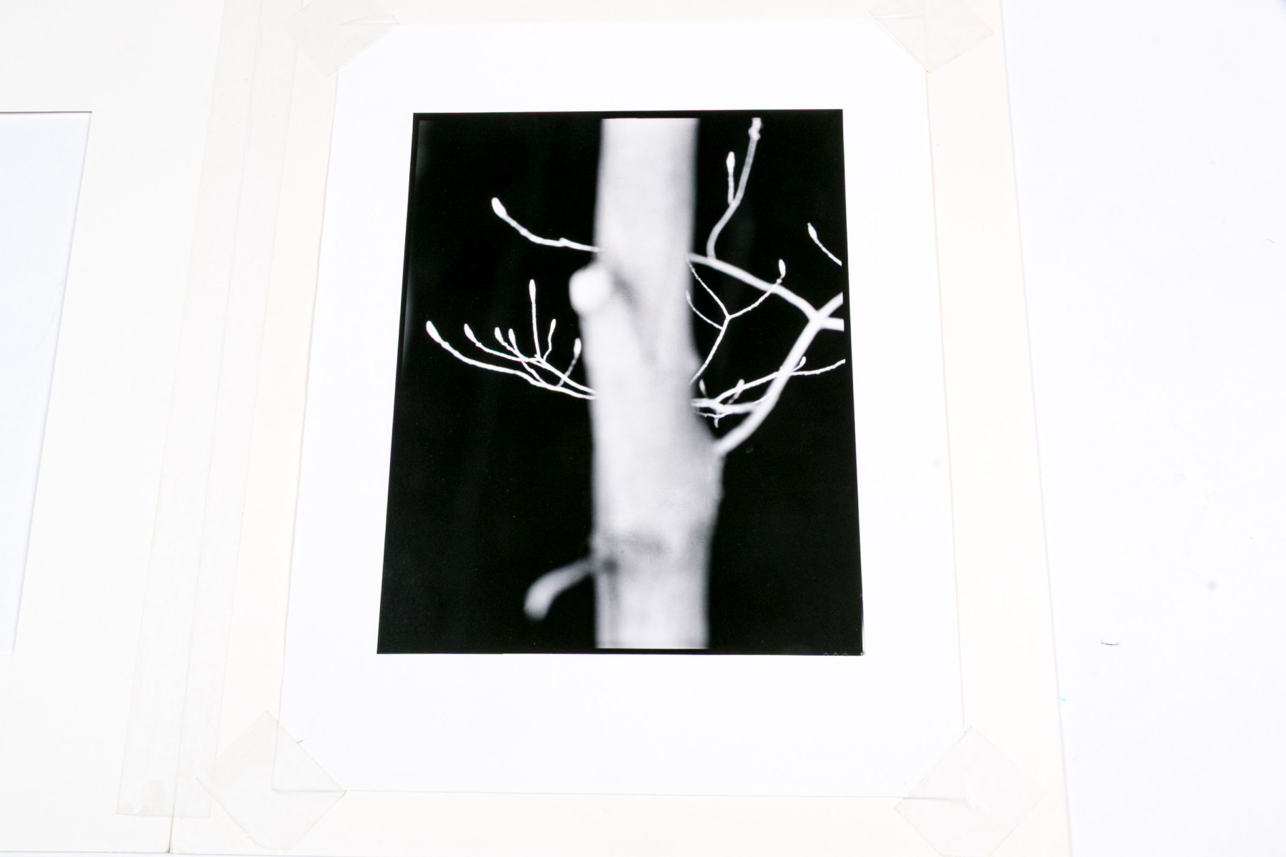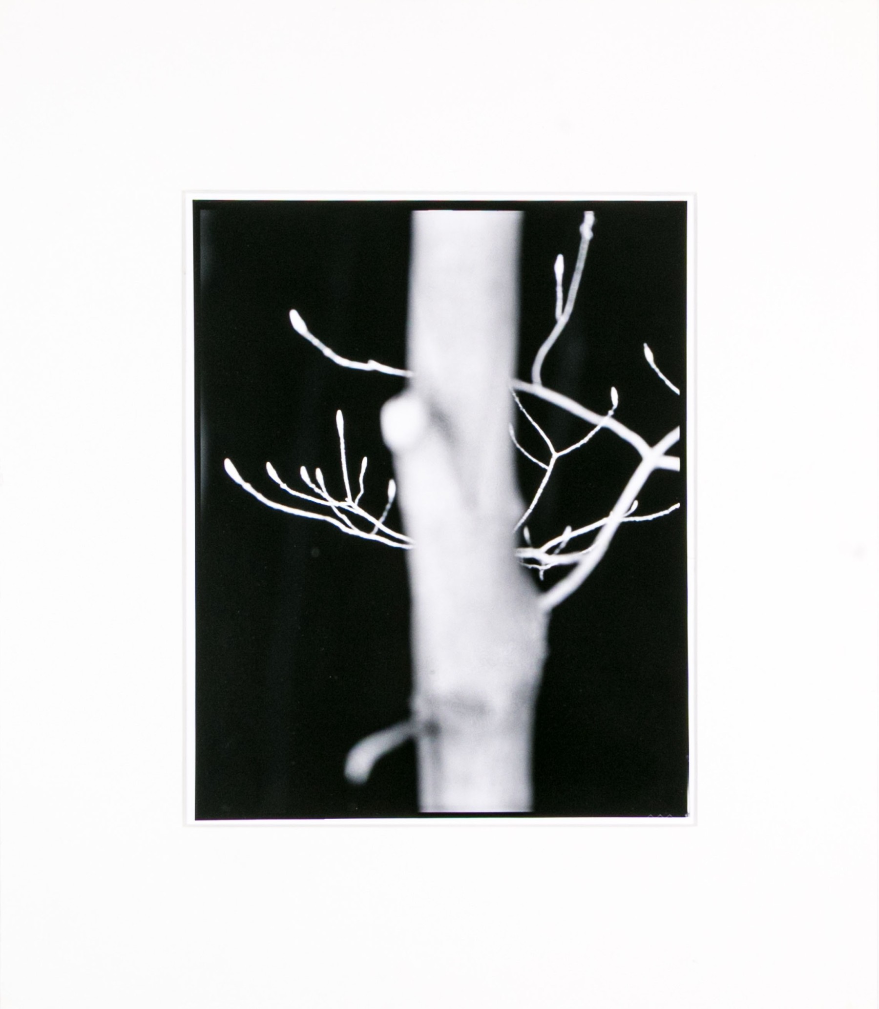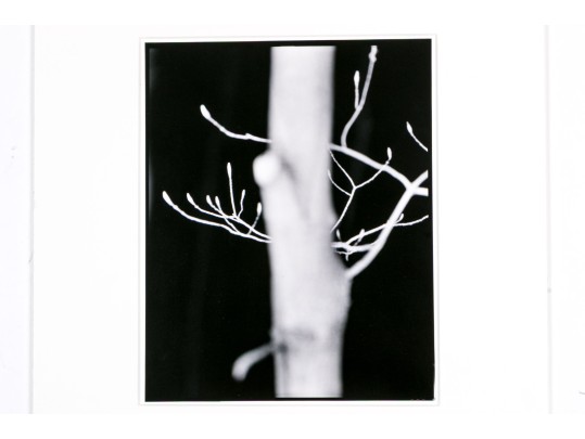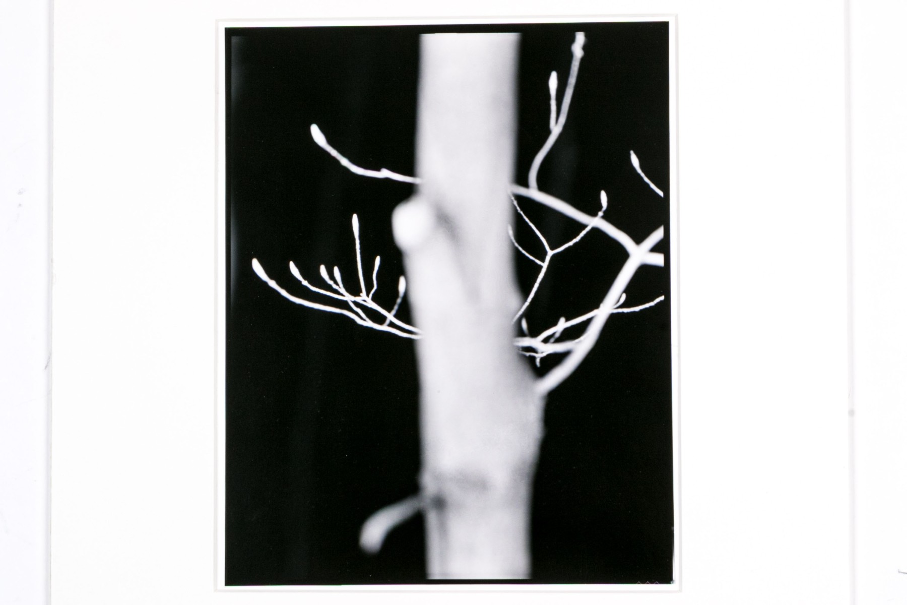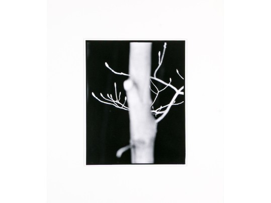 Barbara Crane (American, 1928-2019) gelatin silver print from the Coloma to Covert Series depicting a blurry white tree branch and spindly branches behind against a black background. With a handwritten label on the verso and bearing a label from Lallak + Tom Gallery with the original gallery price of $600. Unframed.