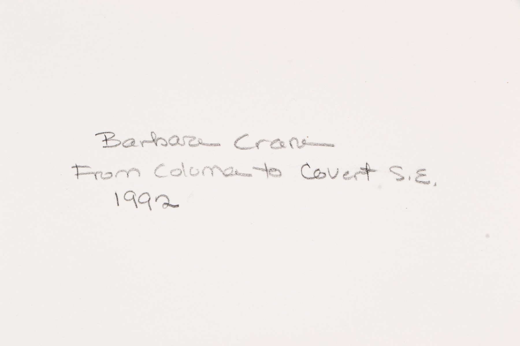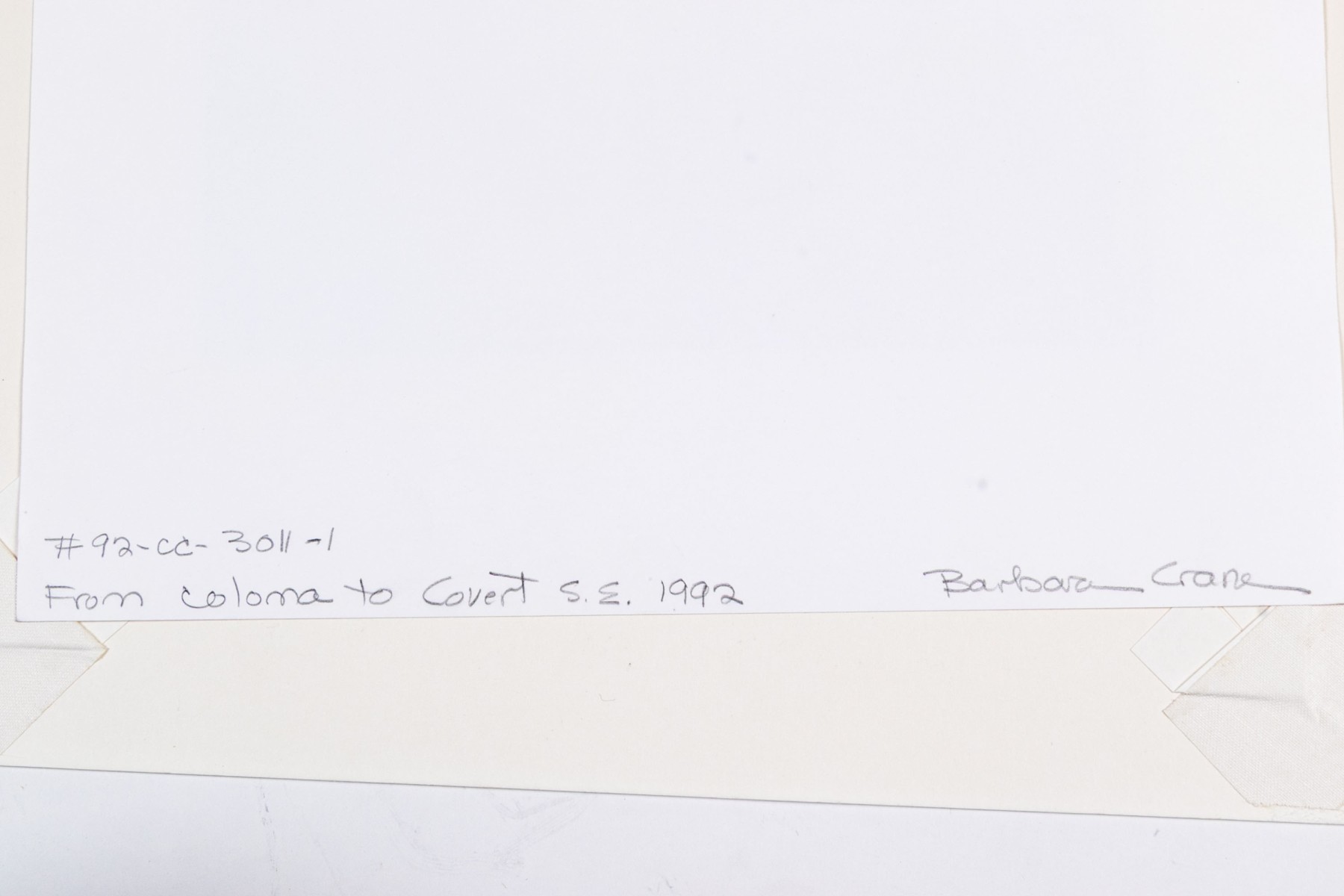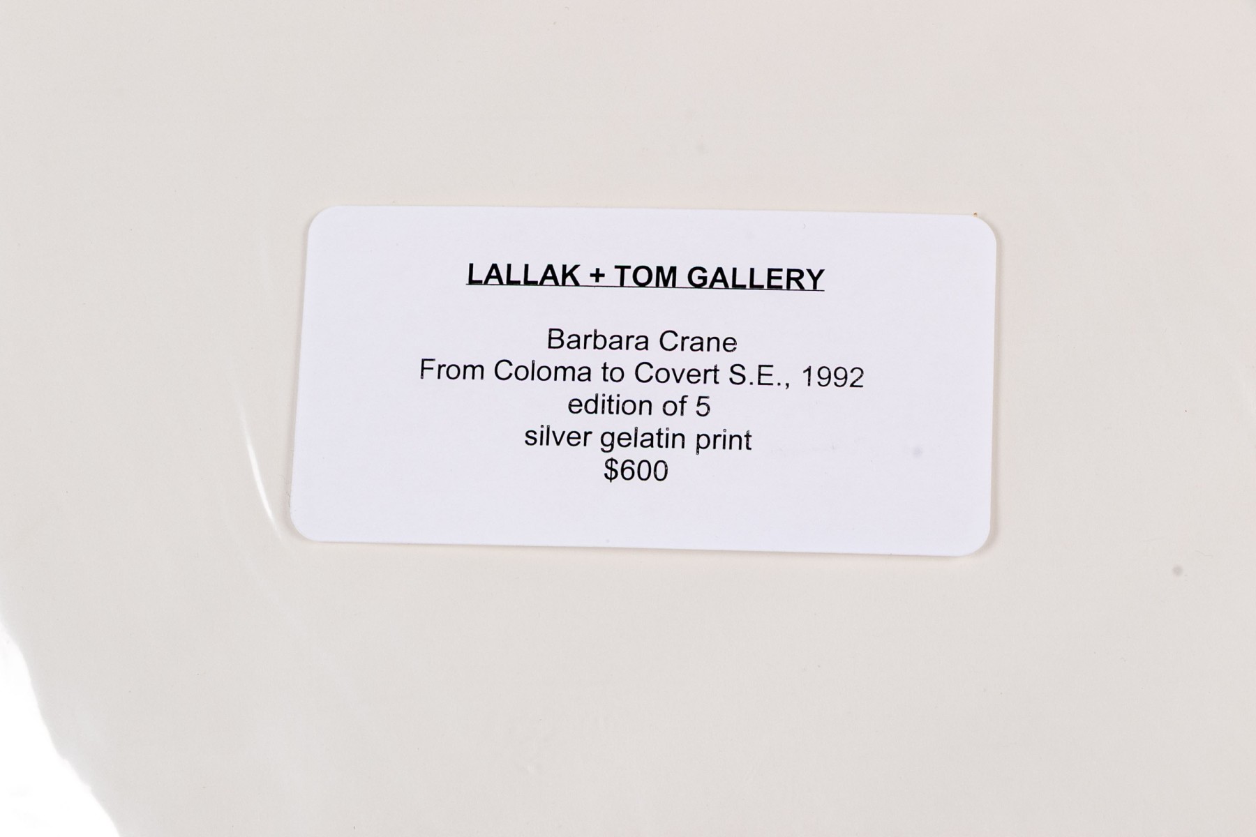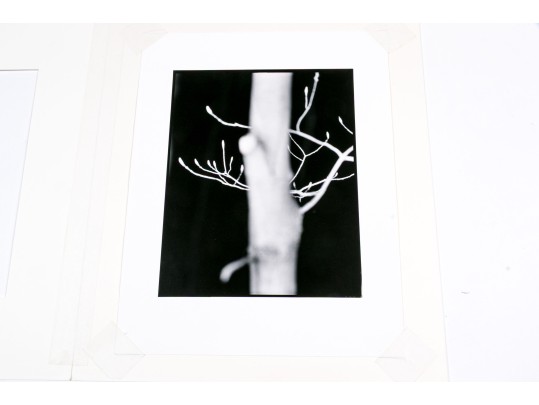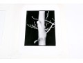 Barbara Crane (American, 1928-2019) gelatin silver print from the Coloma to Covert Series depicting a blurry white tree branch and spindly branches behind against a black background. With a handwritten label on the verso and bearing a label from Lallak + Tom Gallery with the original gallery price of $600. Unframed.