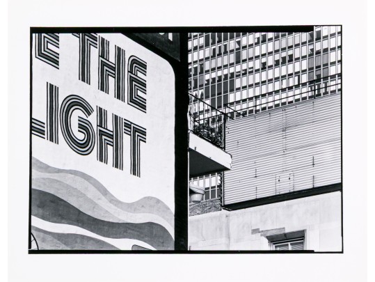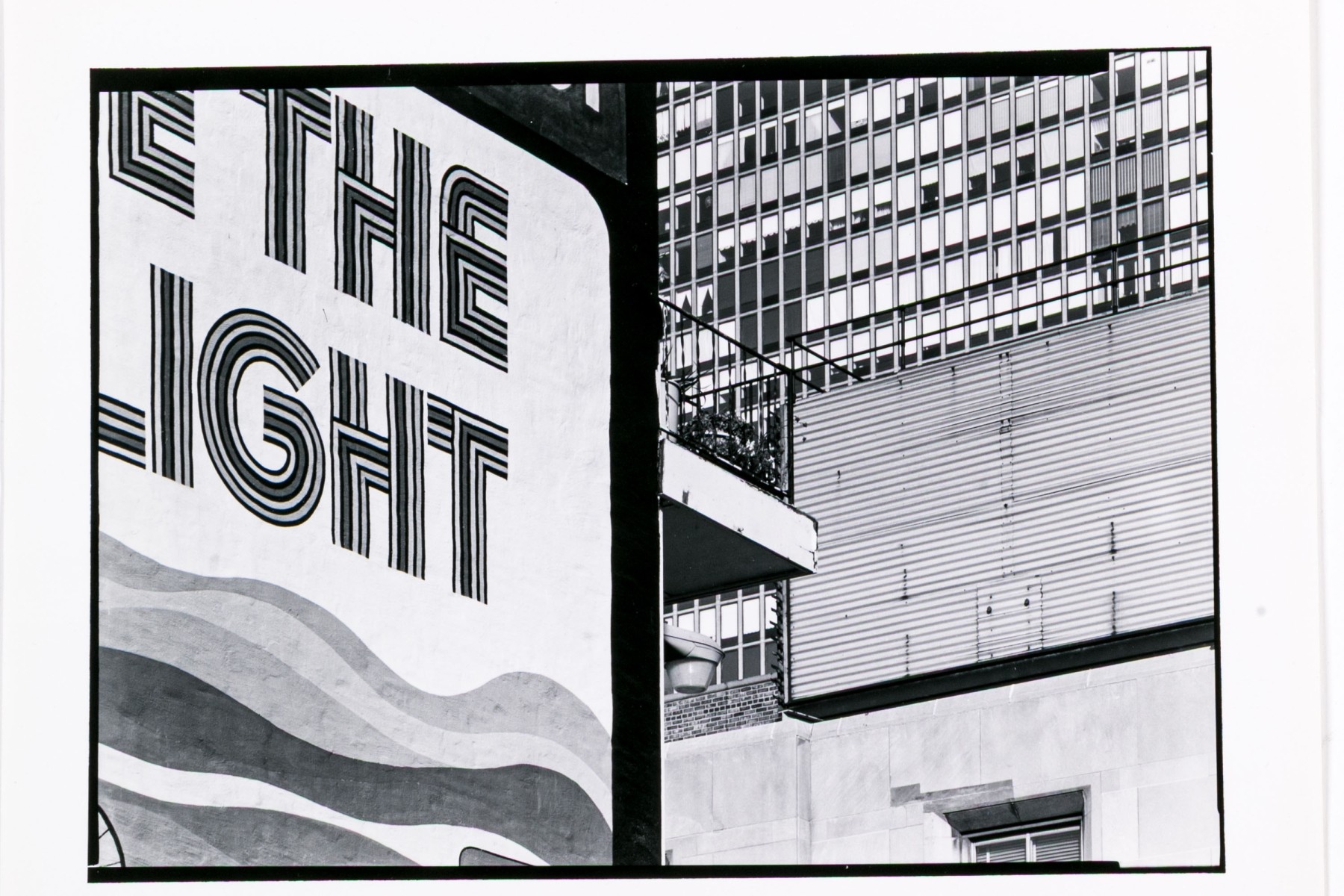 Barbara Crane (American, 1928-2019) "Loophole Symphony" photographic print depicting a large advertisement partially reading "The Light" leading to a skyscraper in the background. Handwritten label on the verso. Unframed.