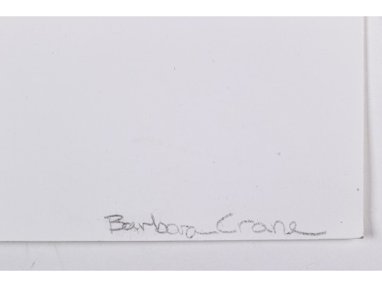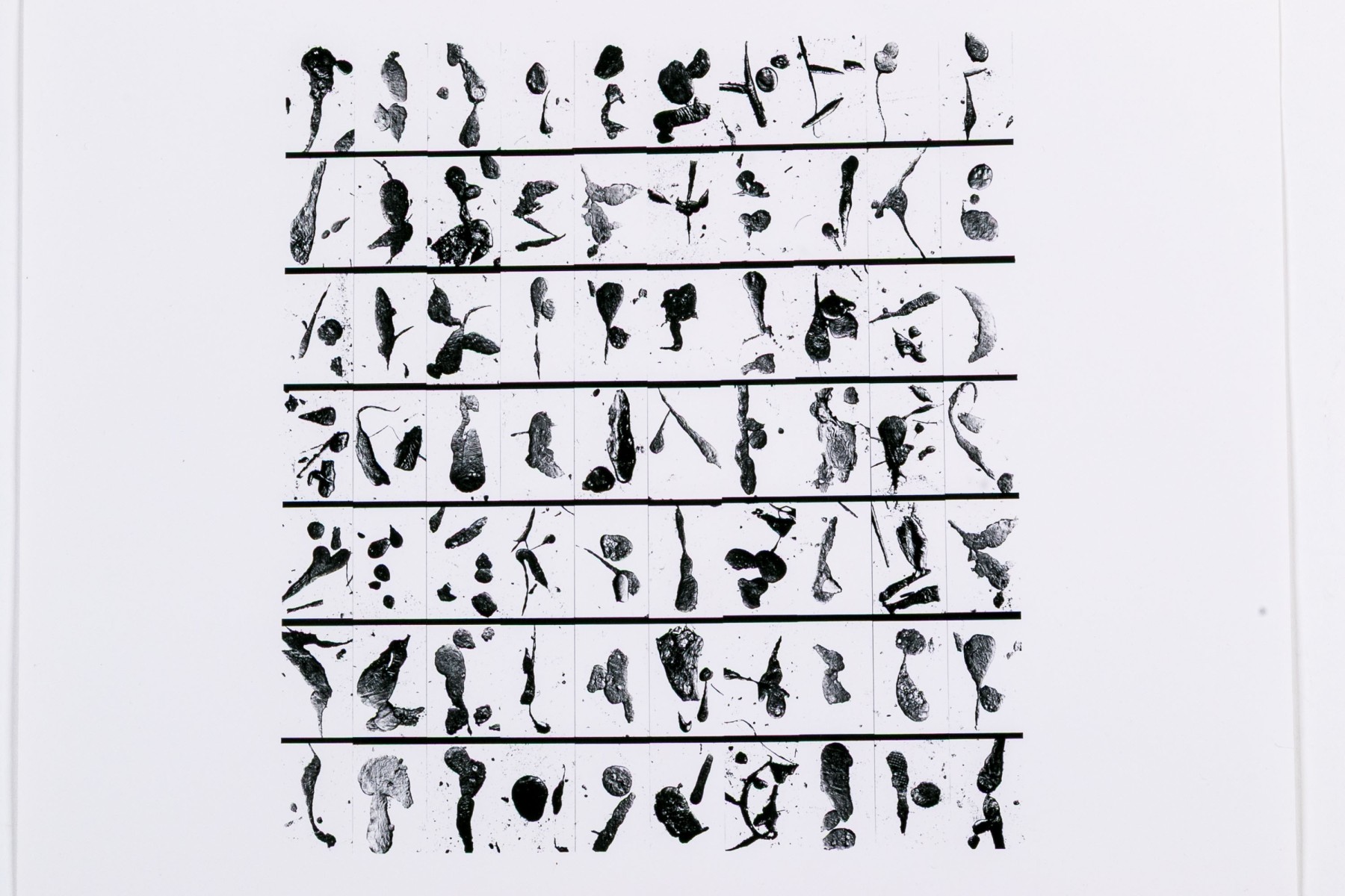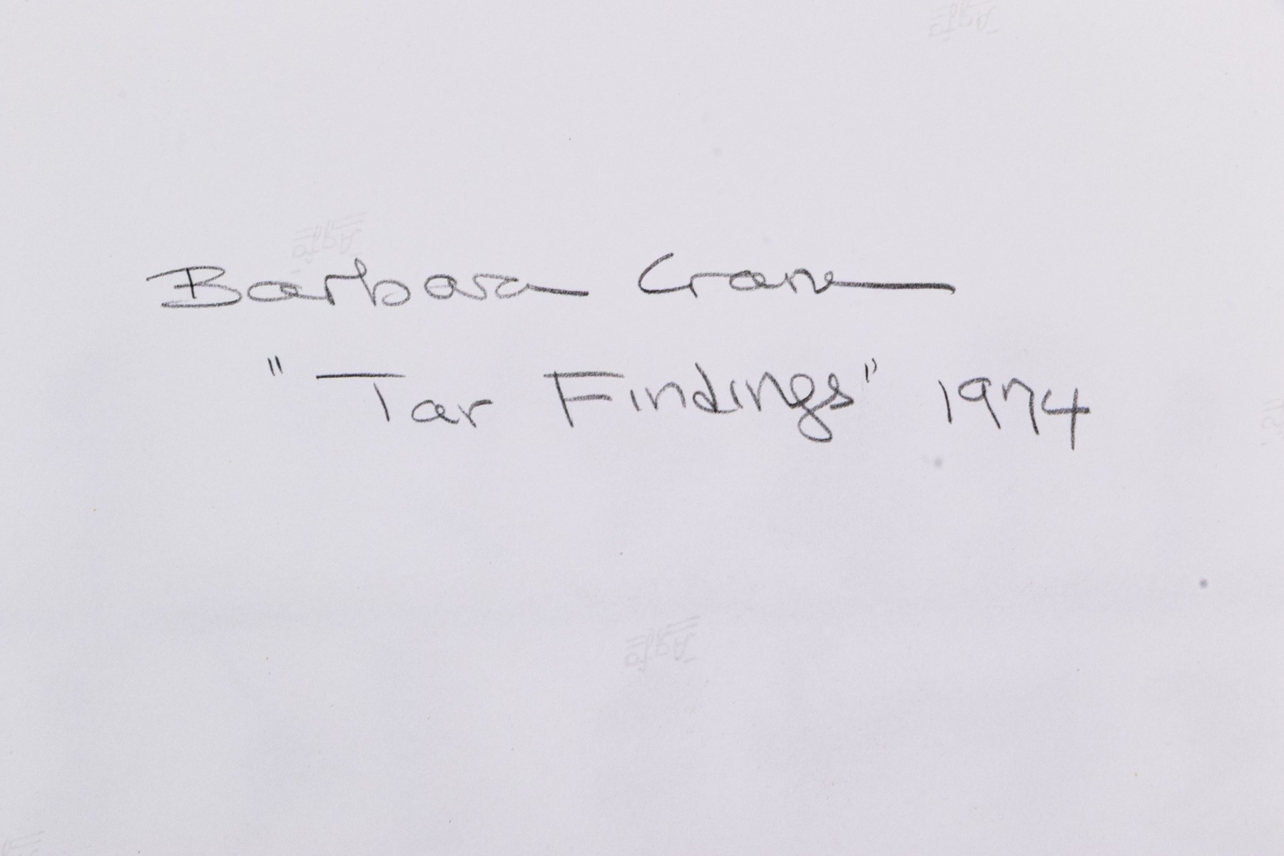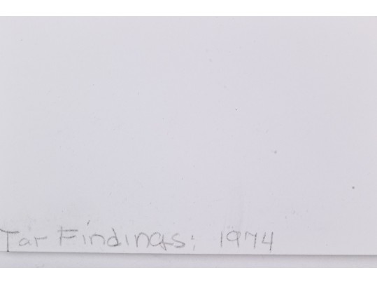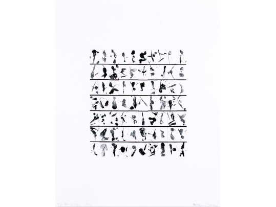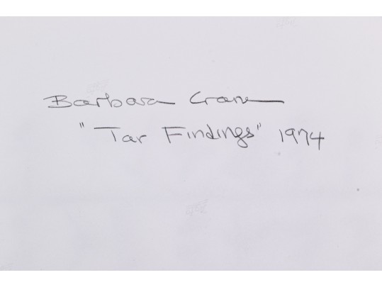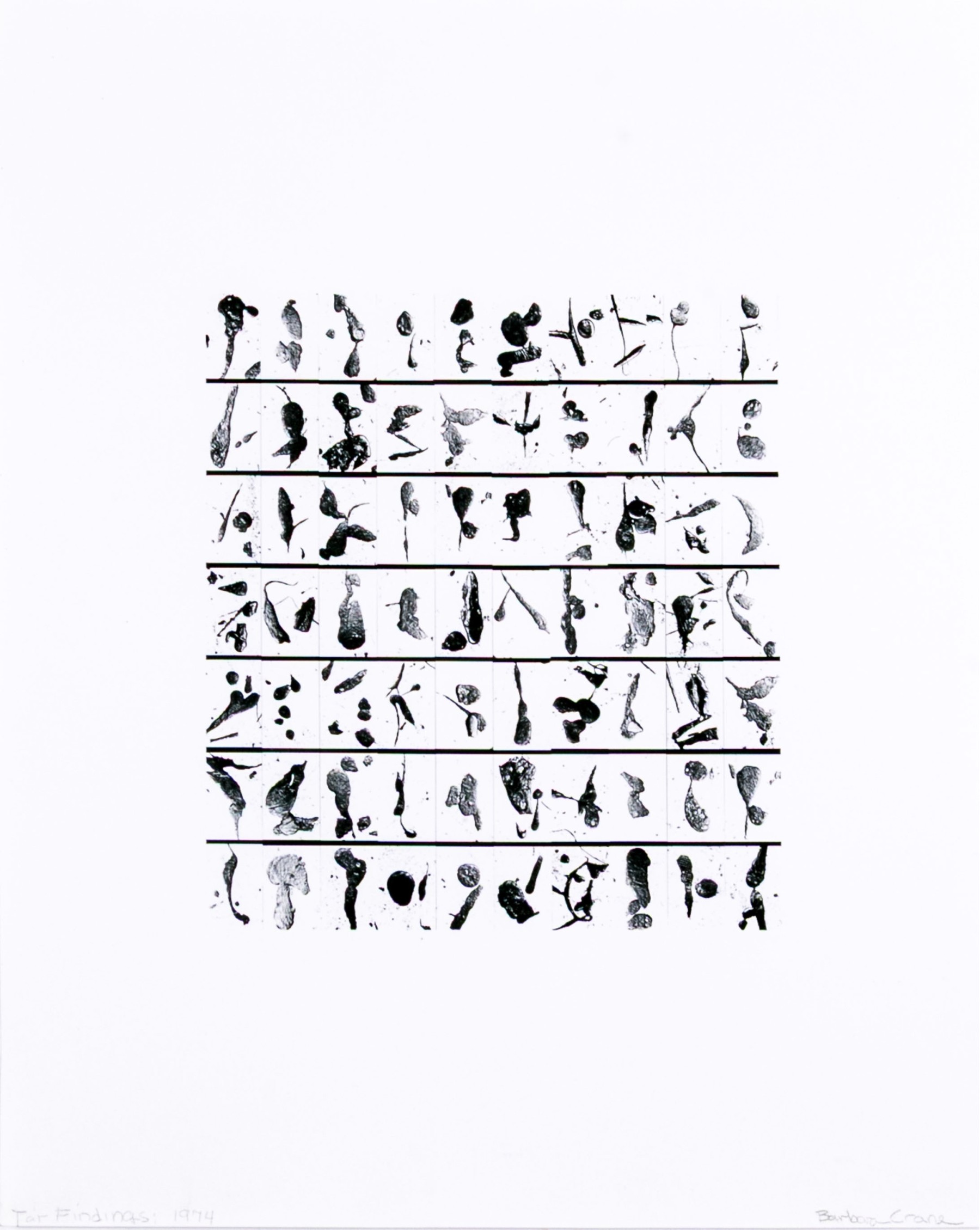 Barbara Crane (American, 1928-2019) "Tar Findings" print depicting rows of gestural black tar marks separated by horizontal lines against a white ground. Handwritten labels to verso. Unframed.