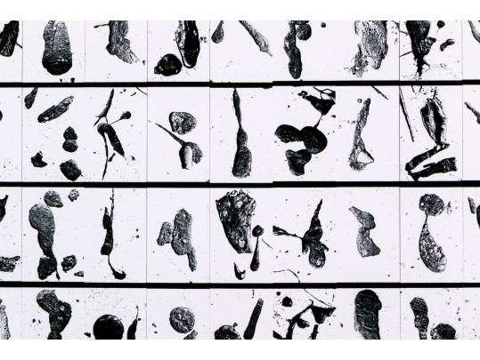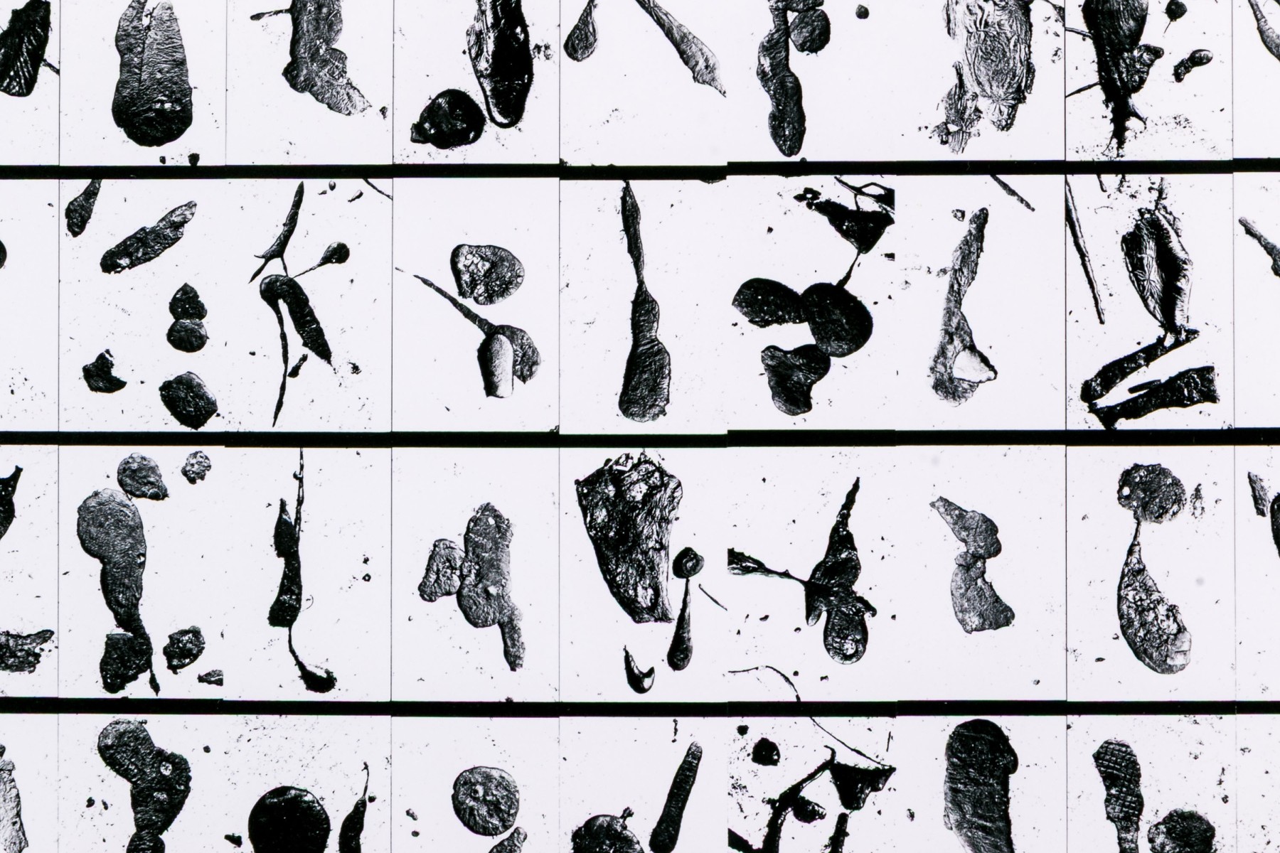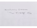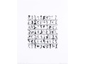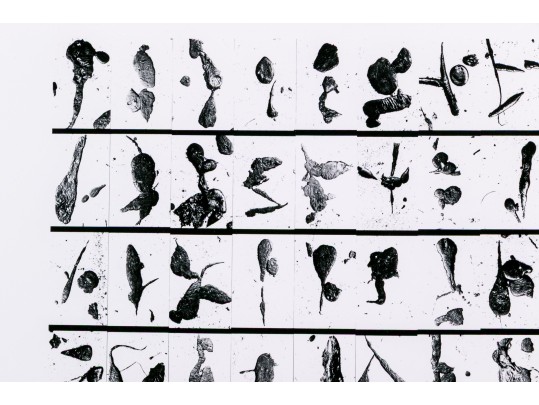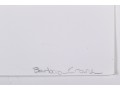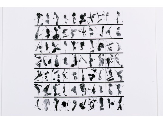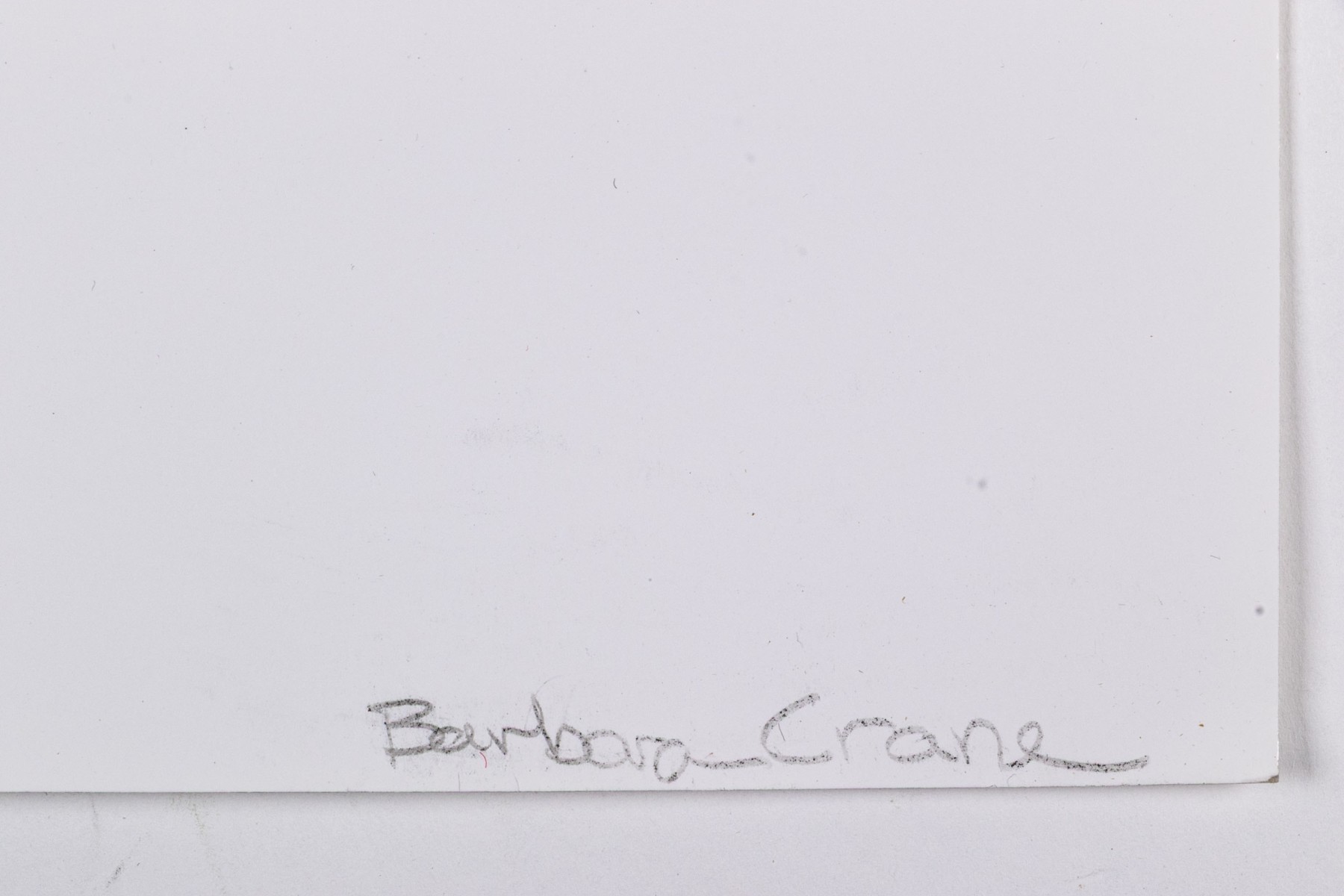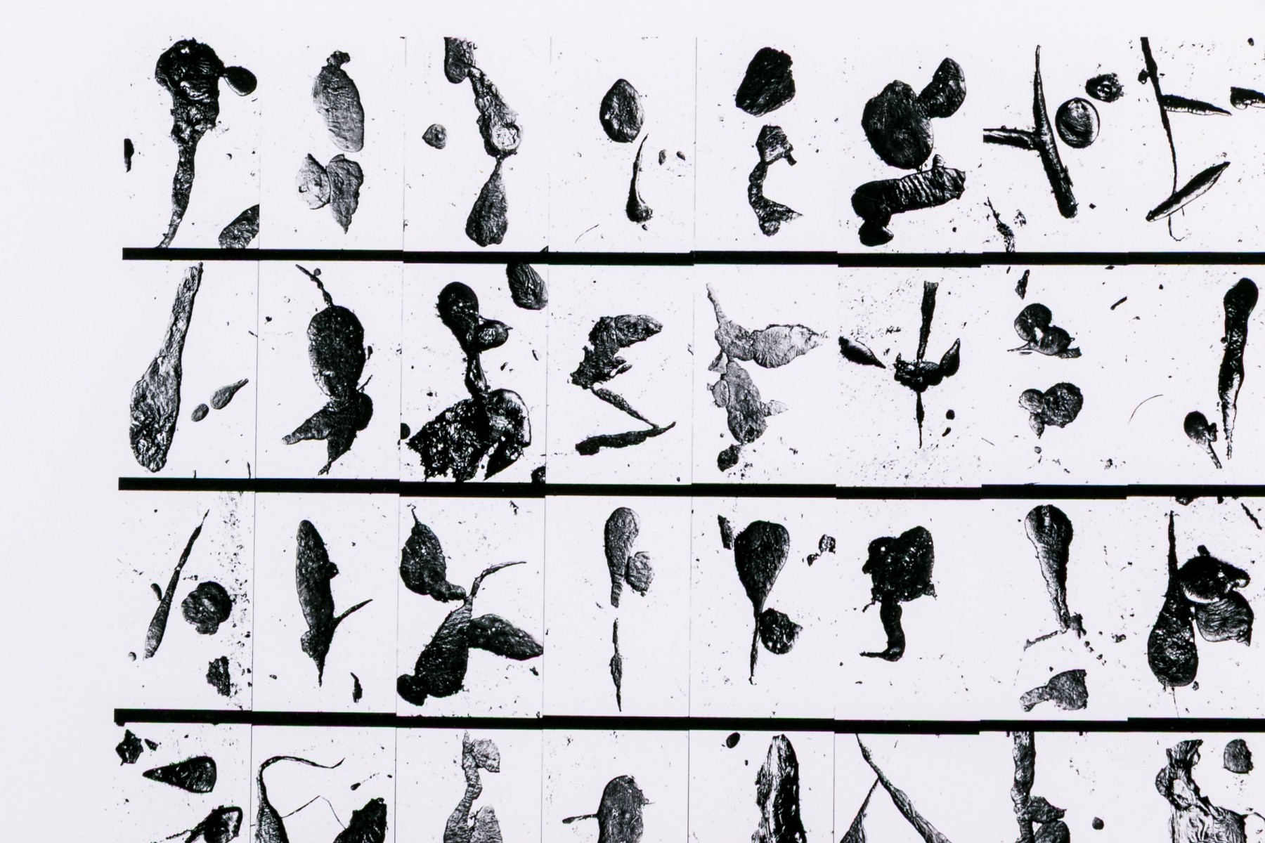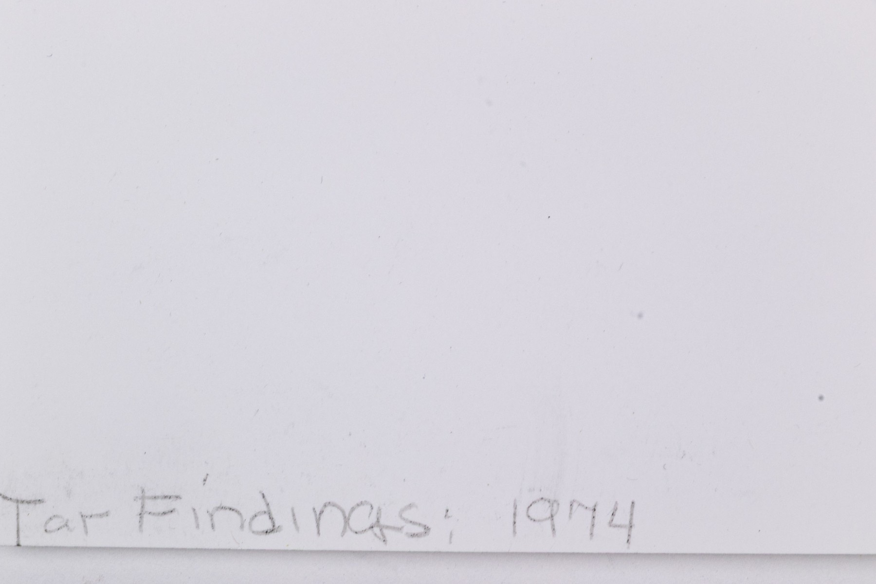 Barbara Crane (American, 1928-2019) "Tar Findings" print depicting rows of gestural black tar marks separated by horizontal lines against a white ground. Handwritten labels to verso. Unframed.