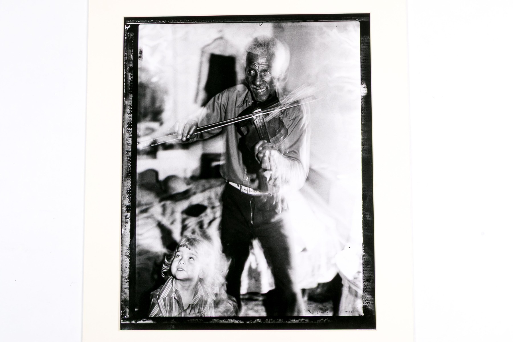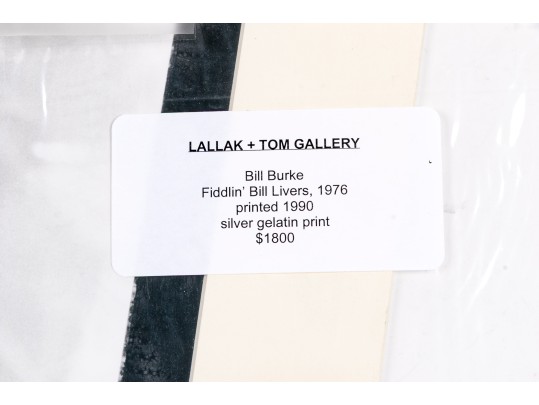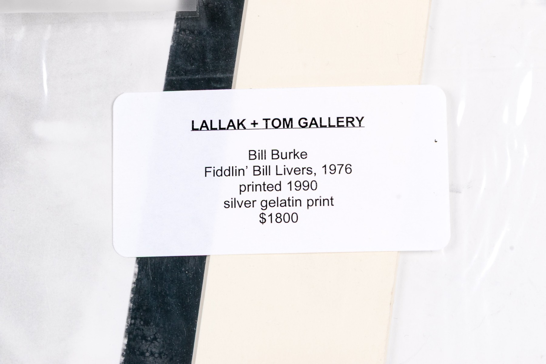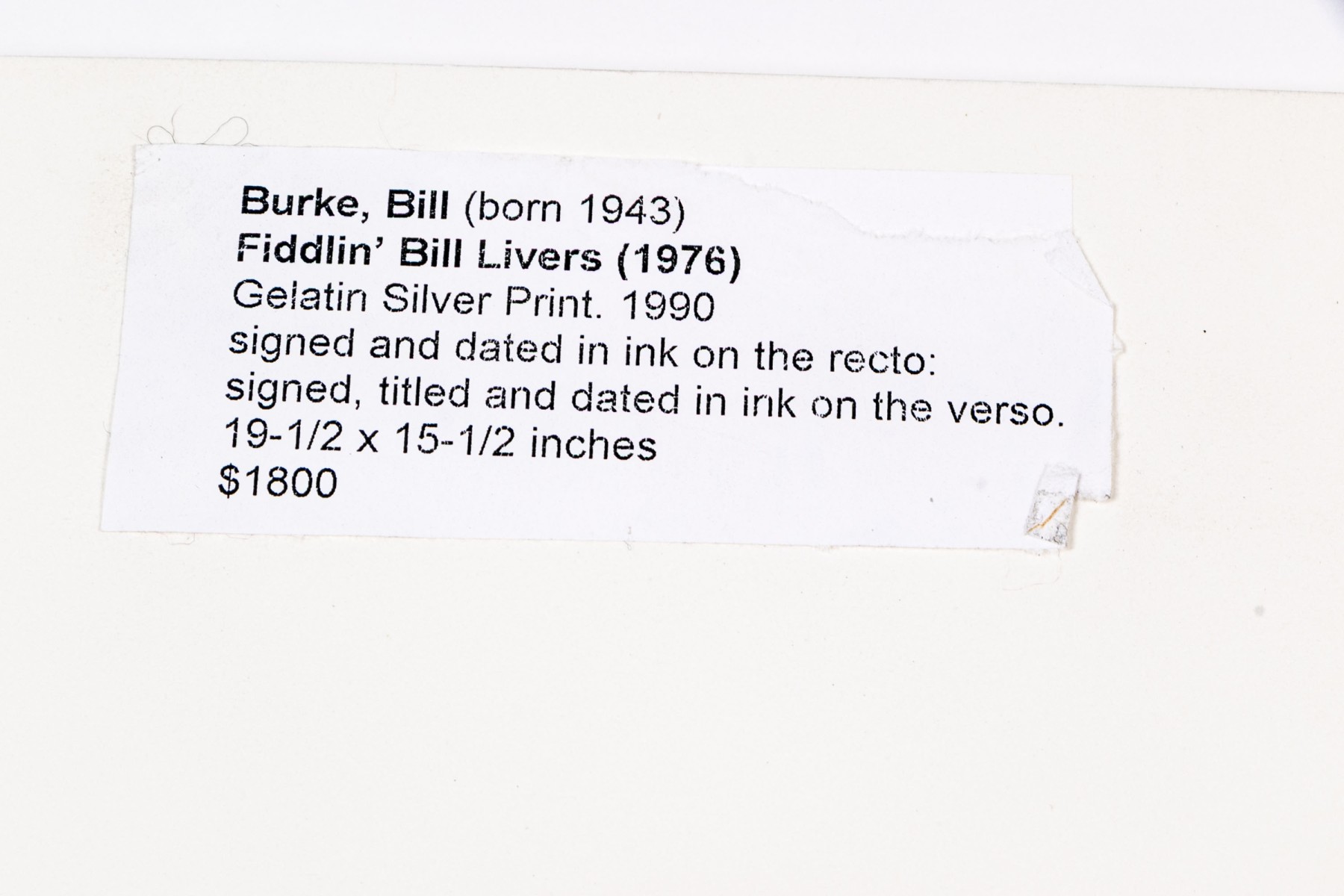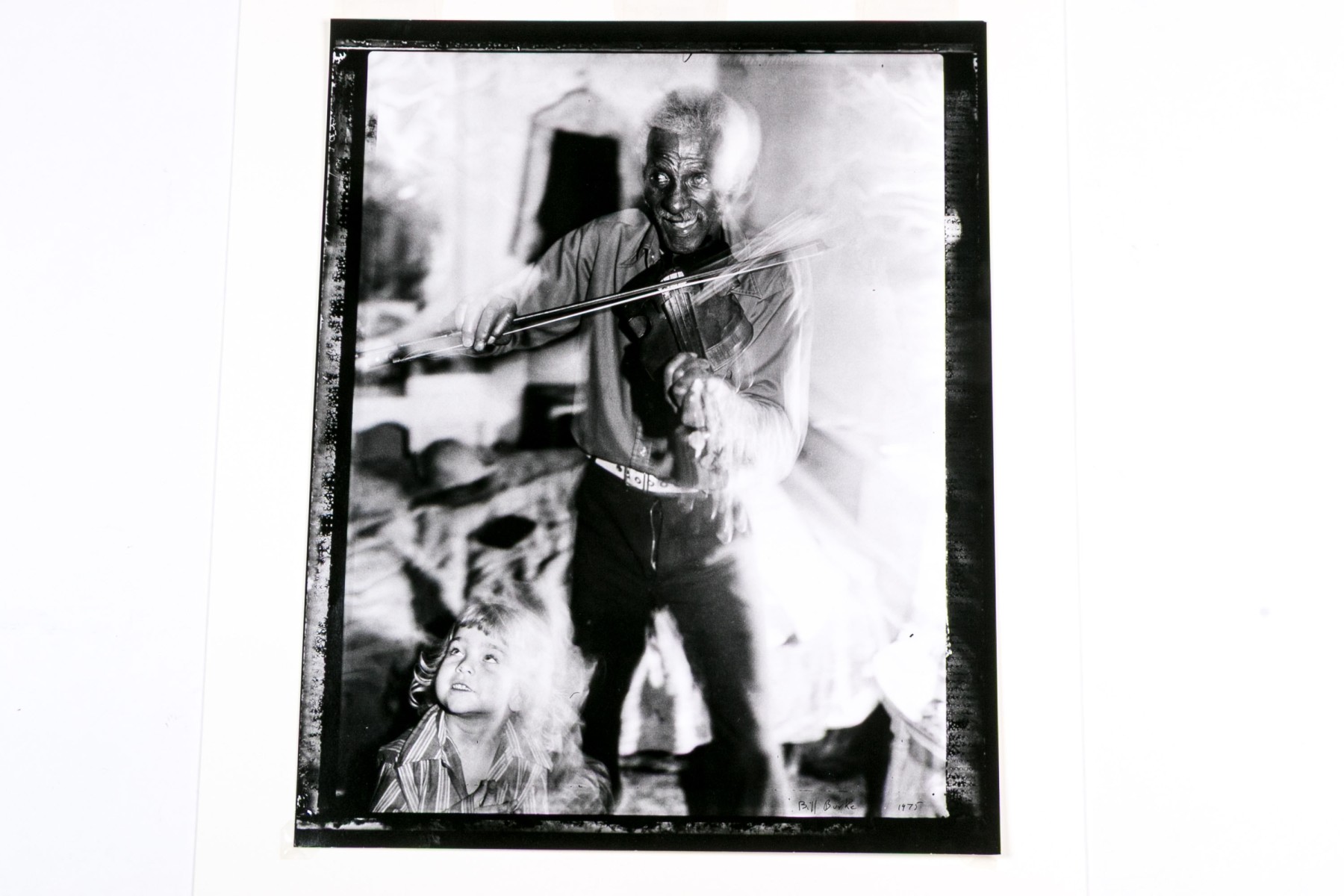 Bill Burke (American, b. 1943) “Fiddlin’ Bill Livers, 1976" gelatin silver print depicting a smiling man playing a fiddle with a young child nearby in a room interior. Signed and dated 1975 lower right. Bearing a label from Lallak + Tom Gallery denoting the original gallery price $1,800. Unframed.