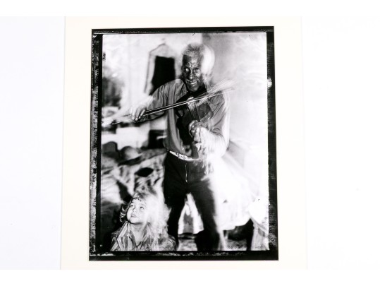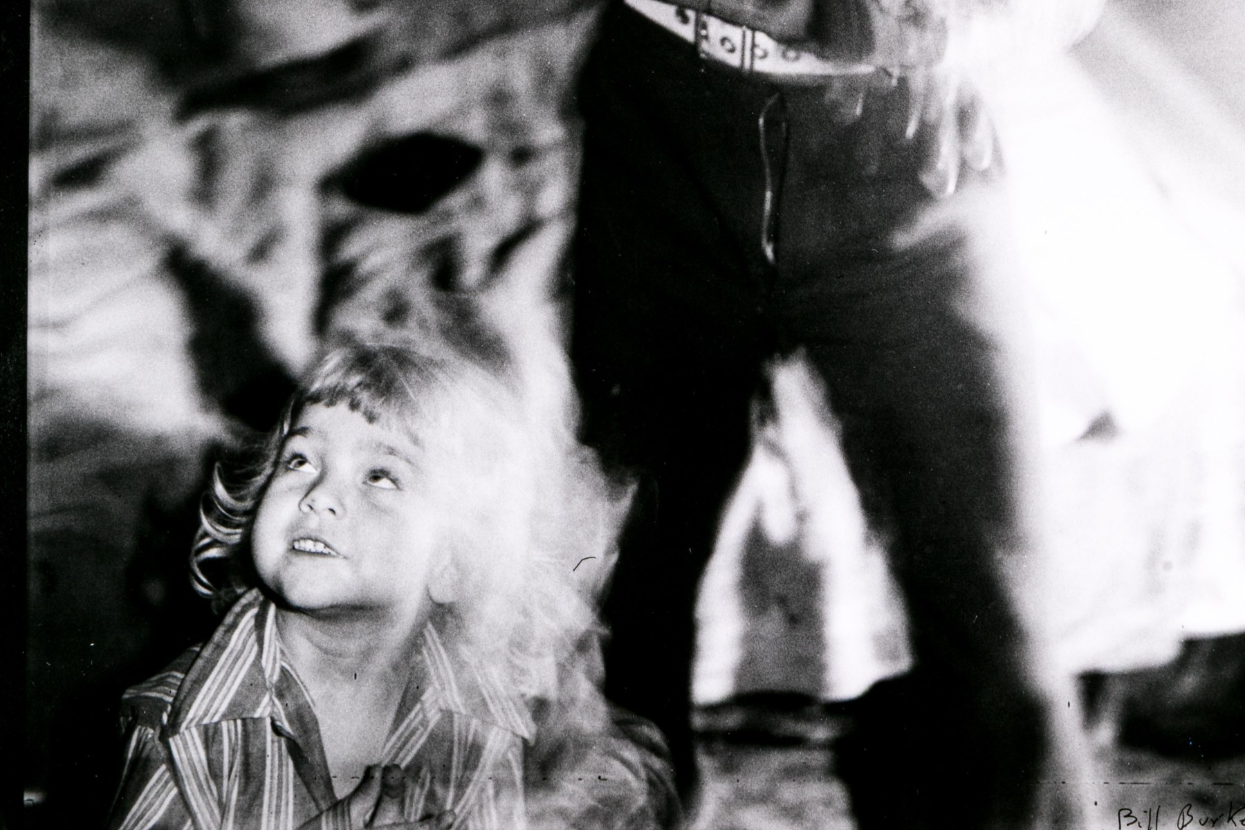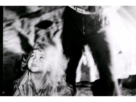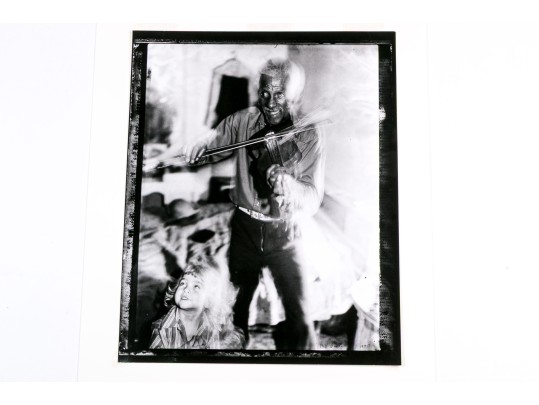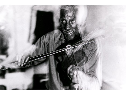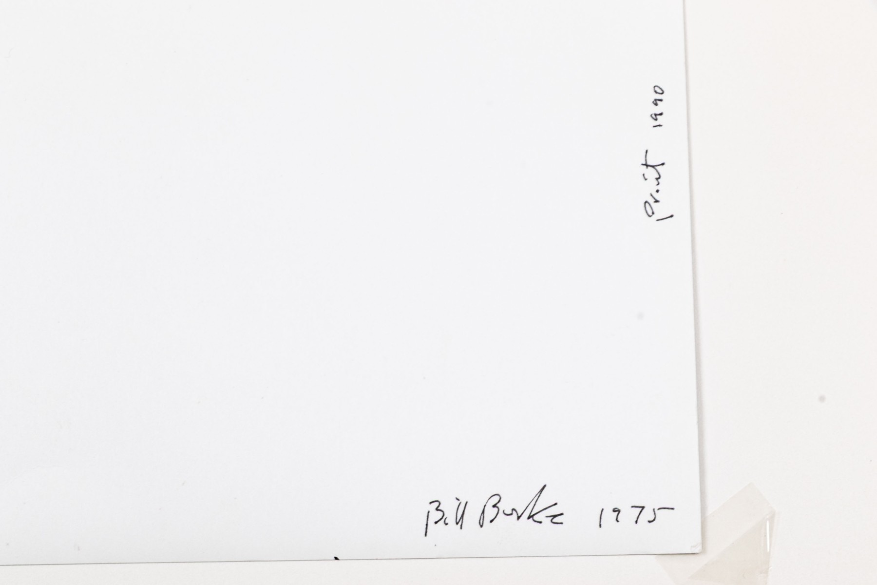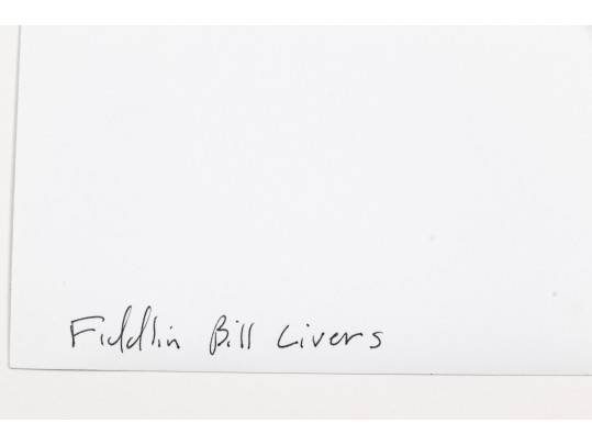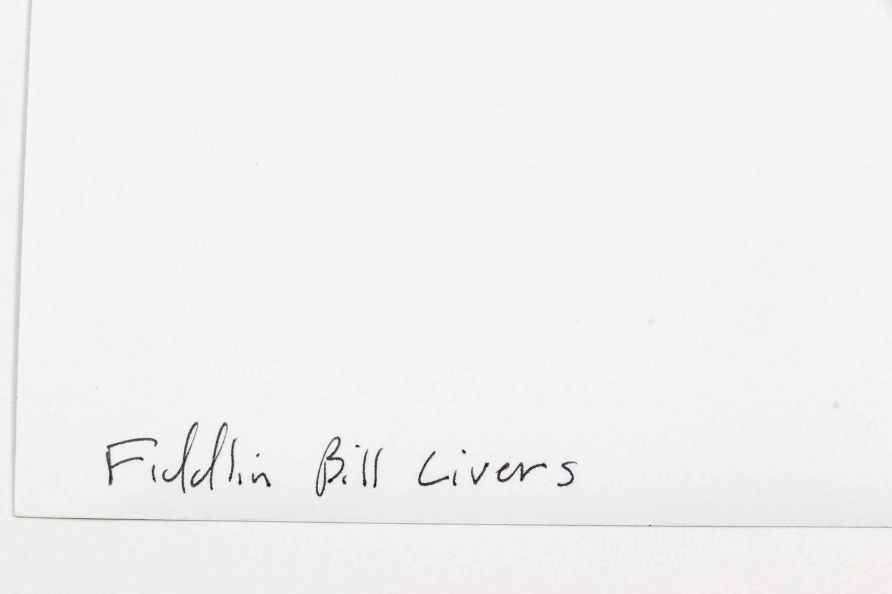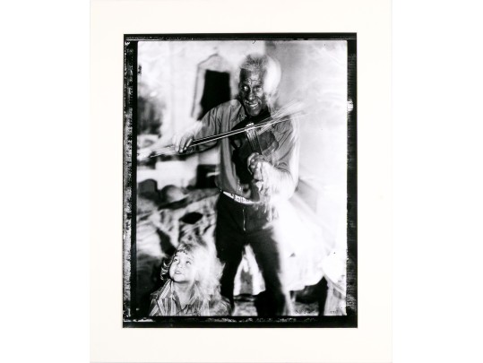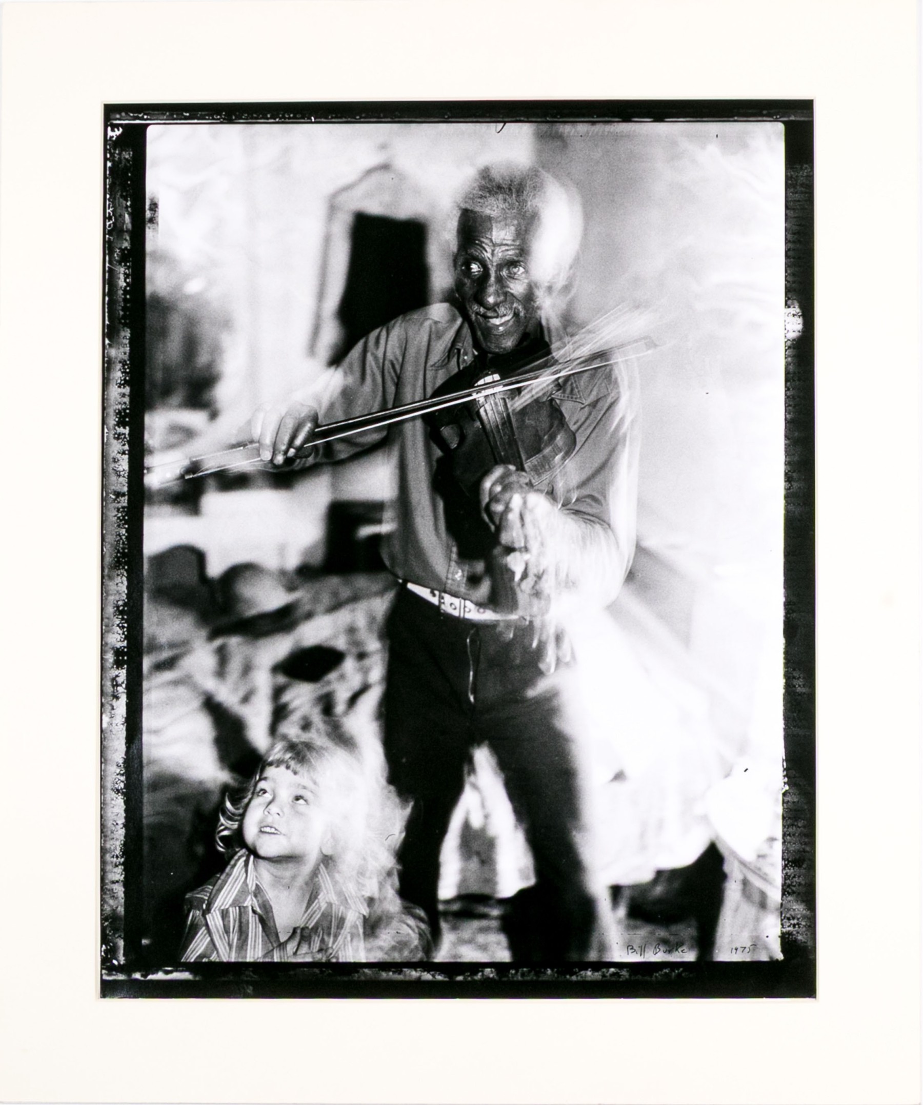 Bill Burke (American, b. 1943) “Fiddlin’ Bill Livers, 1976" gelatin silver print depicting a smiling man playing a fiddle with a young child nearby in a room interior. Signed and dated 1975 lower right. Bearing a label from Lallak + Tom Gallery denoting the original gallery price $1,800. Unframed.