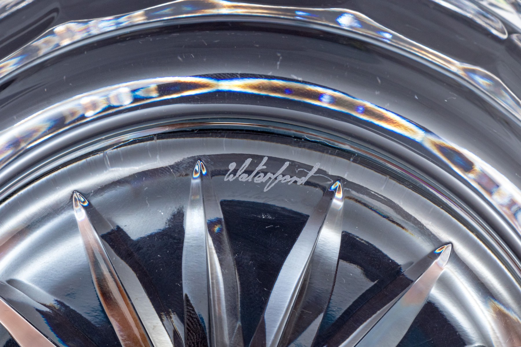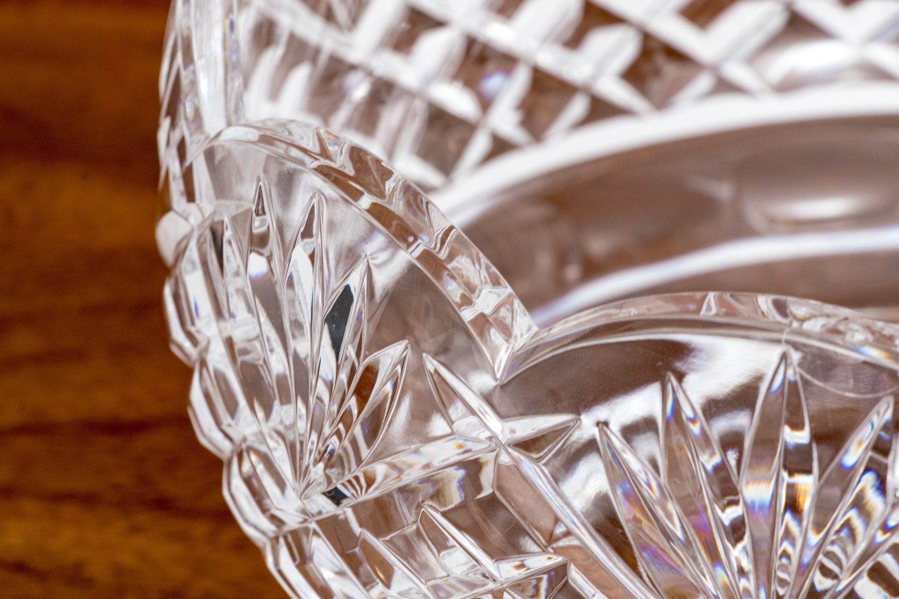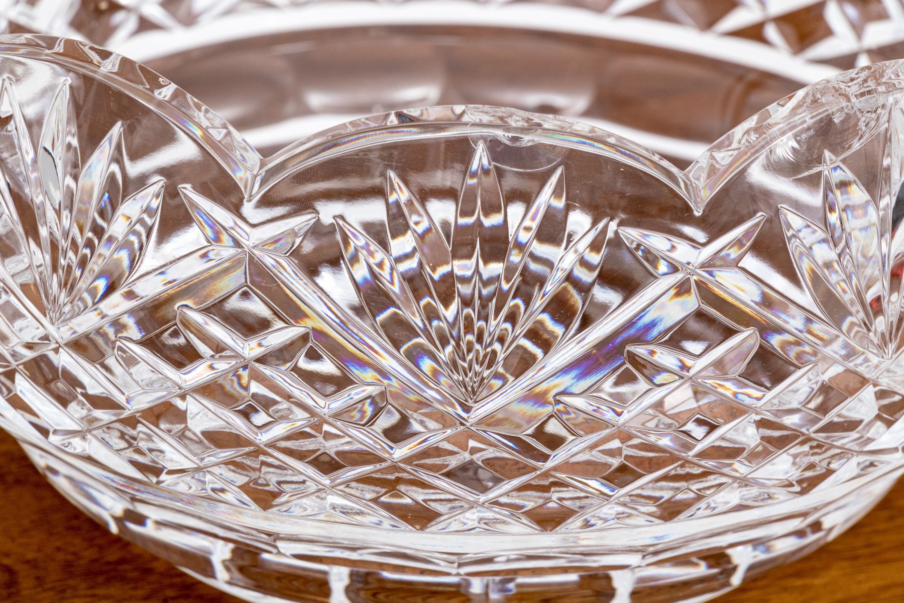 An elegant Waterford crystal serving bowl with elegant cut designs and a scalloped rim. Marked underfoot.