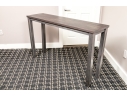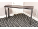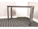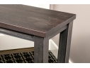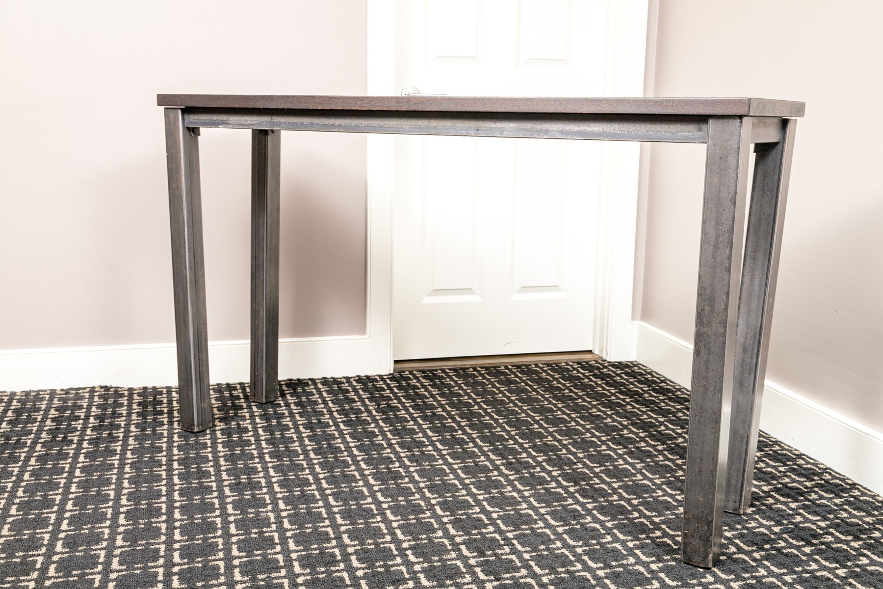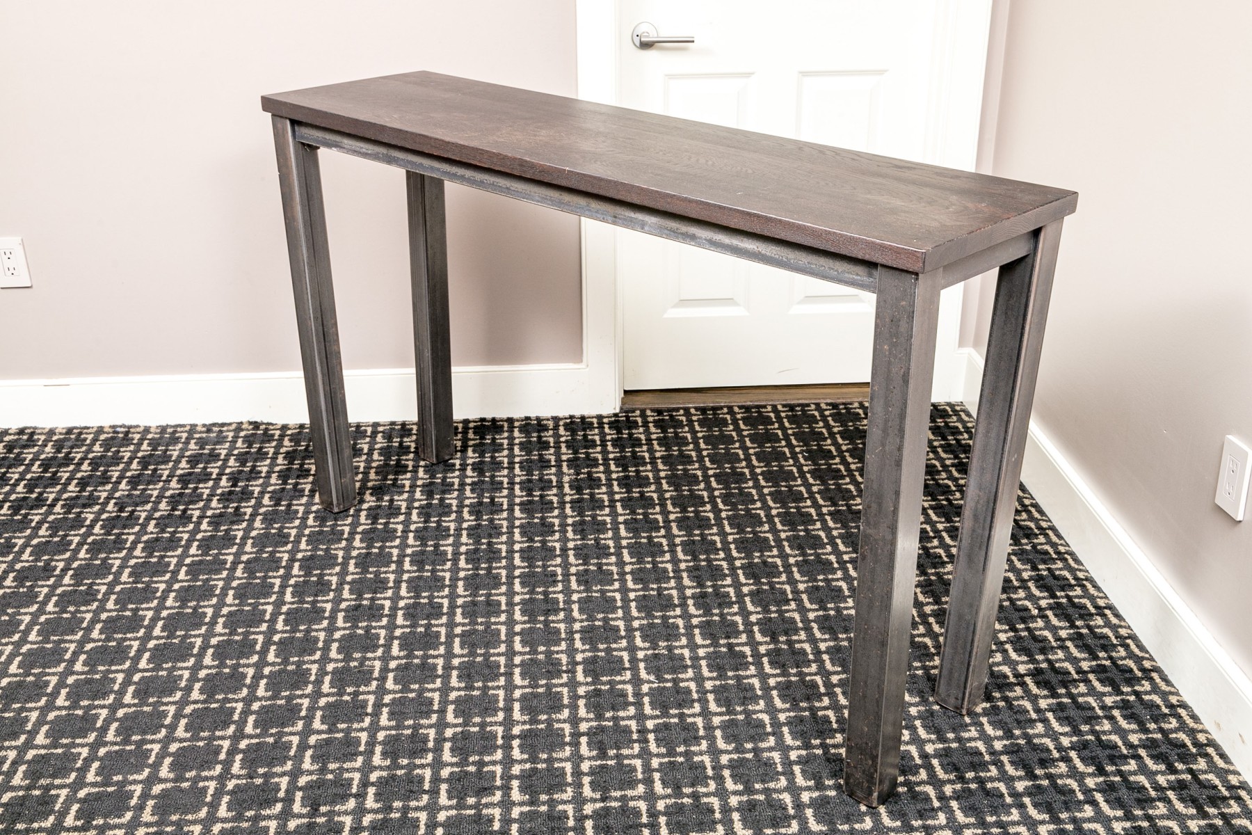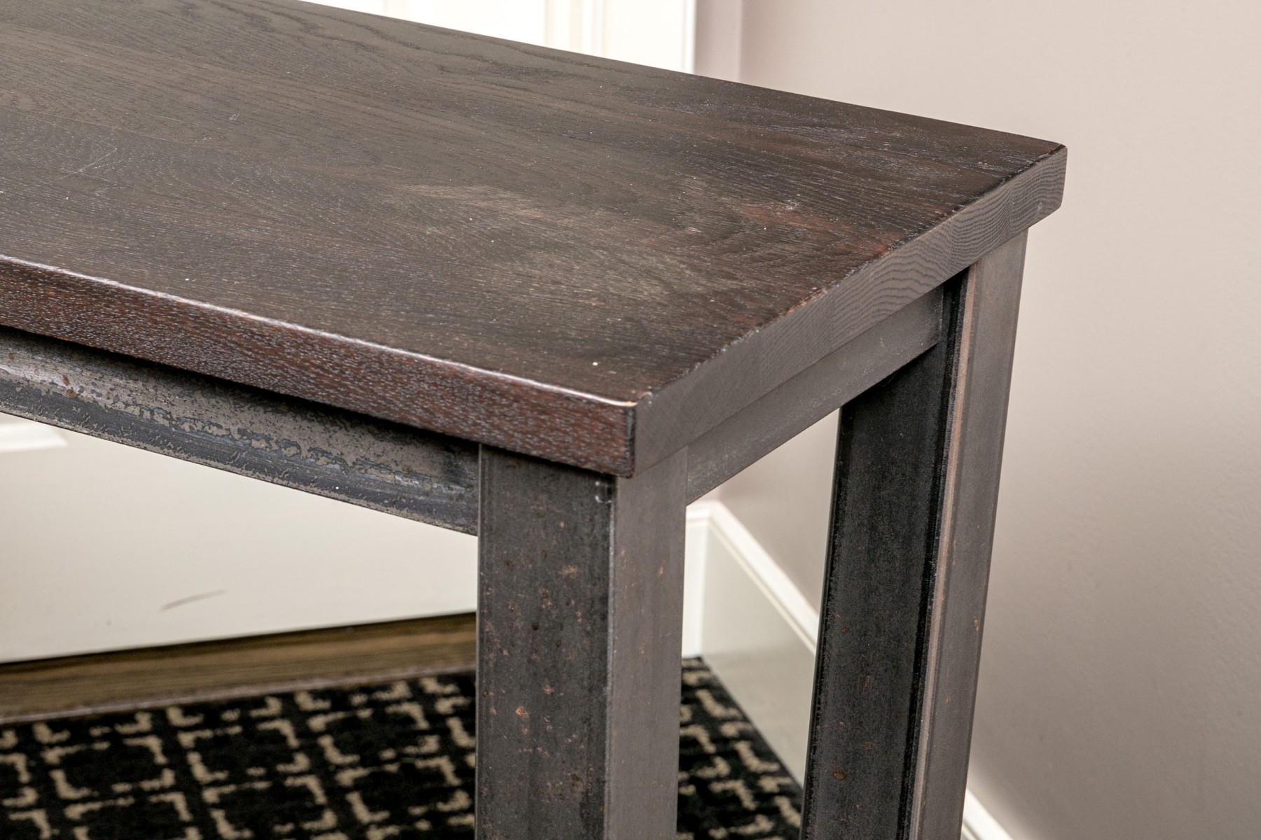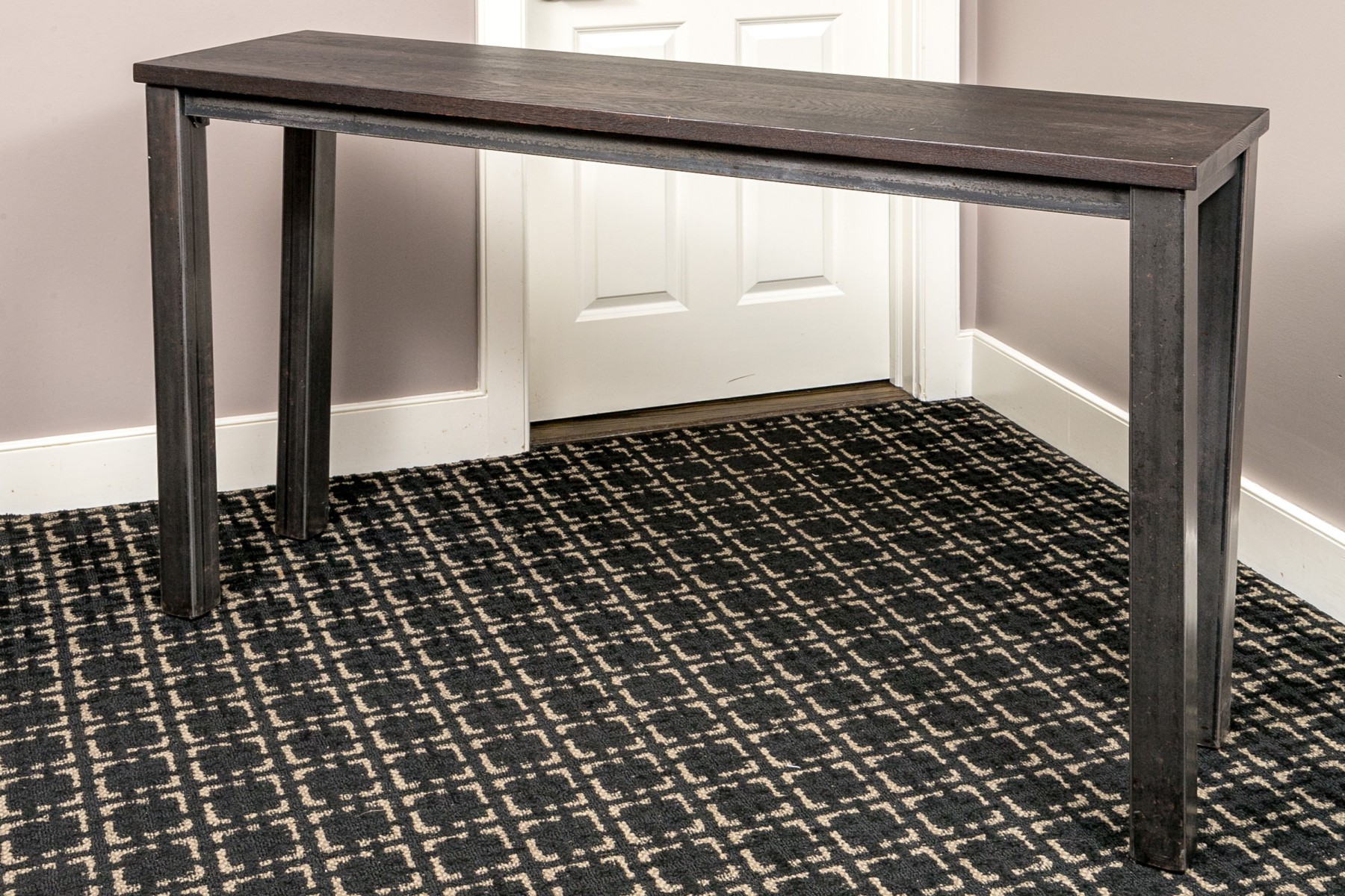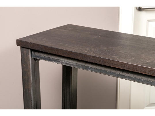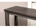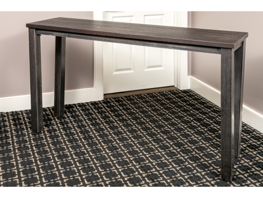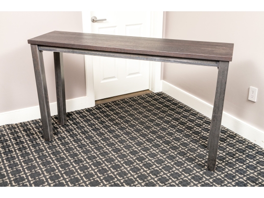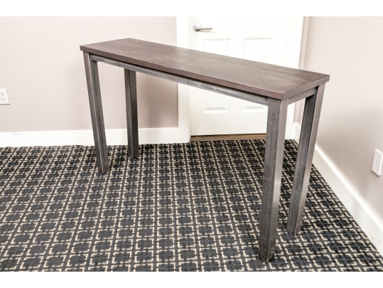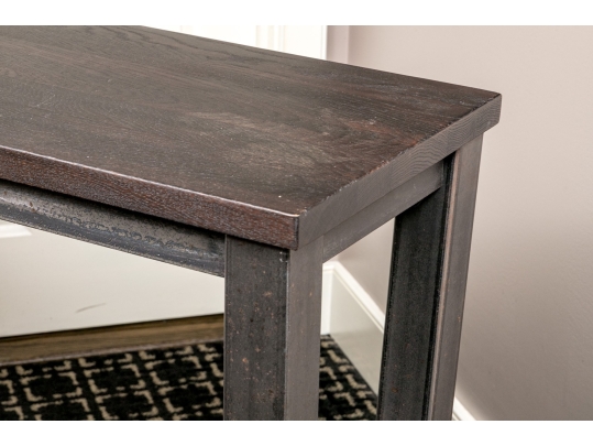 A handsome console with brutalist and industrial influence, displaying a long, dark brown wood top over a rustic metal frame with simple, straight legs.