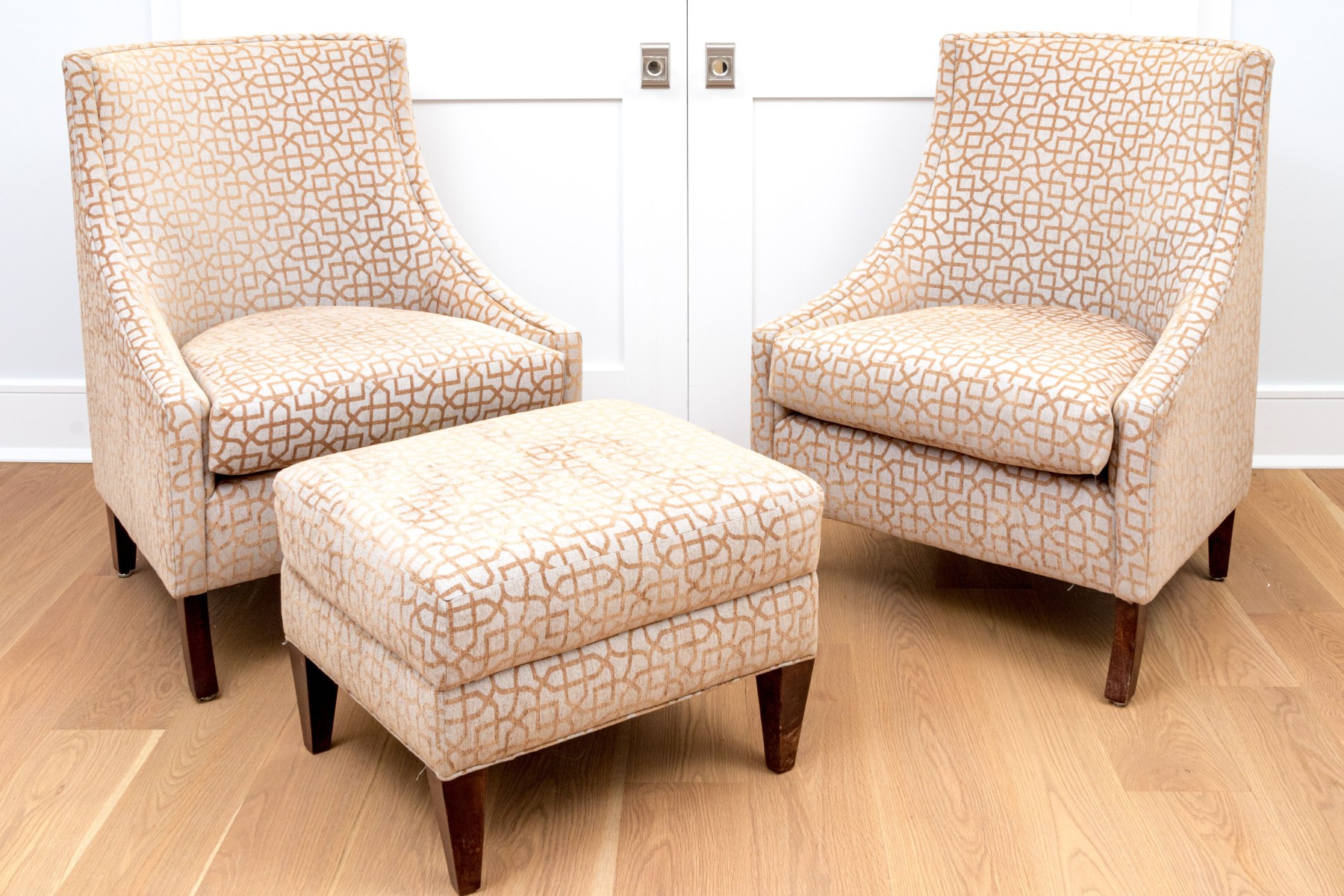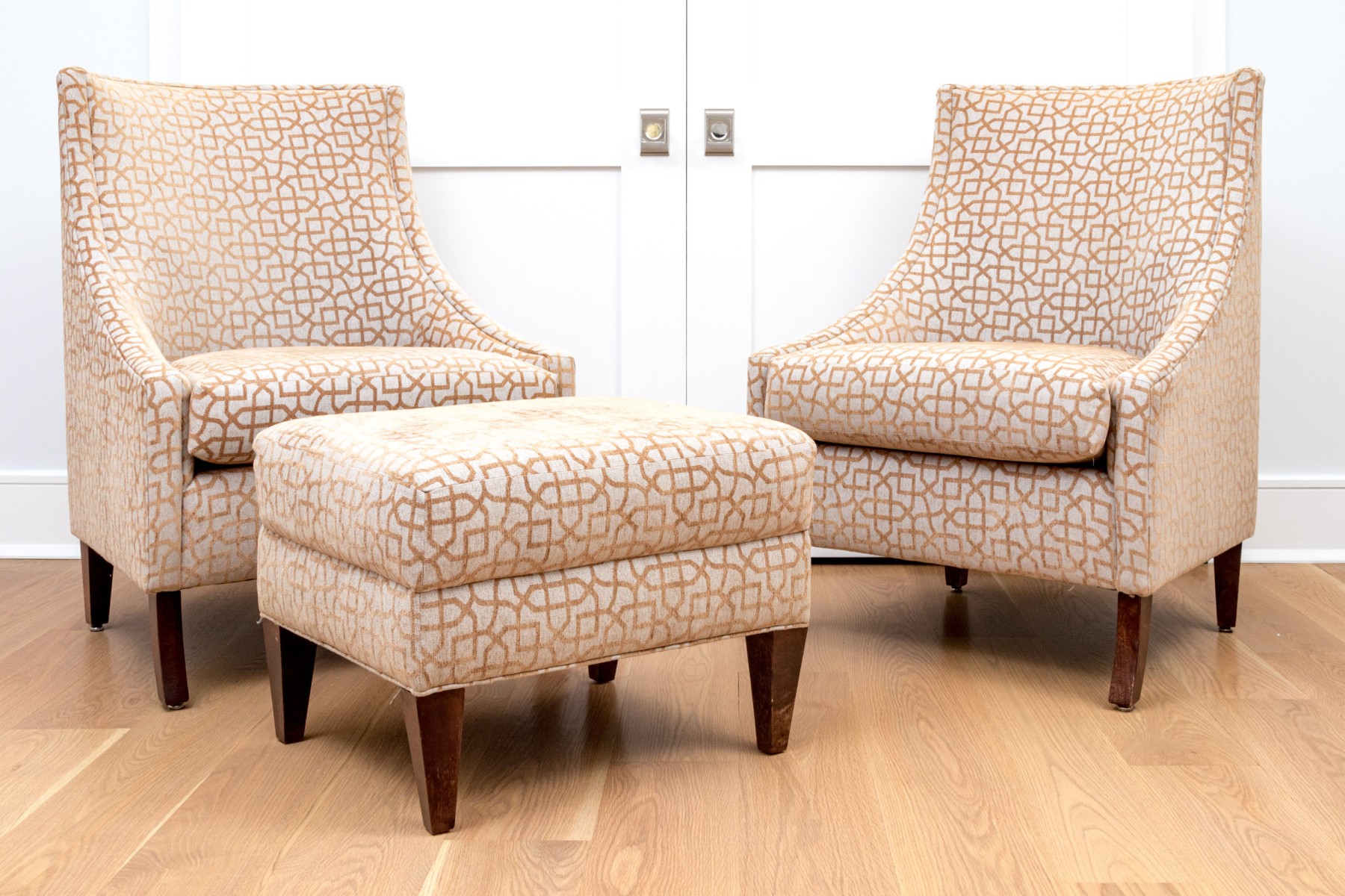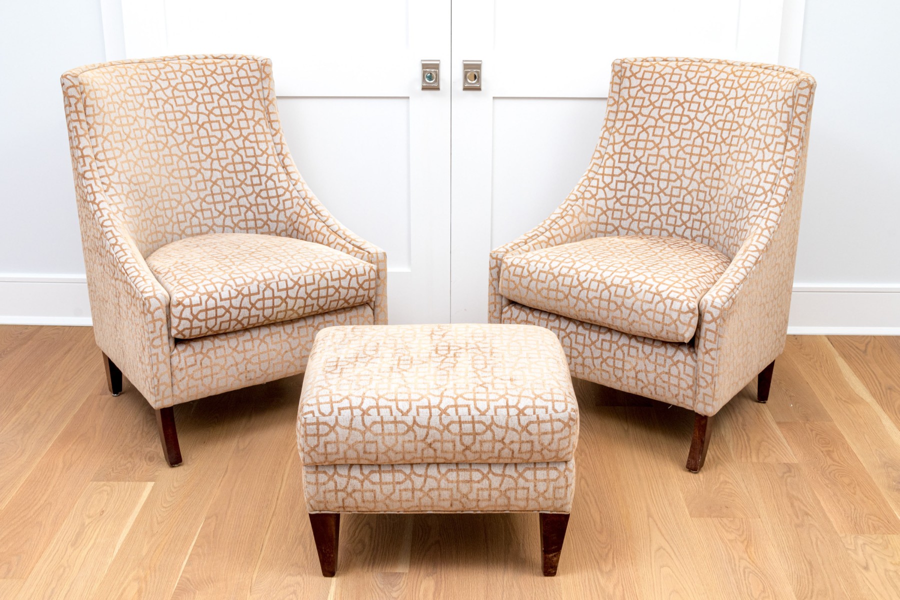 Chic Pair Of Upholstered Accent Chairs With Single Ottoman #338247. Black Rock Galleries provides high end estate liquidation services through online estate auctions and a 50,000 sq ft designer showroom. estate liquidator, estate sale, online auction, antiques, fine art, liquidation, clean outs, auction, consignment, interior design, fine jewelry, collectibles, appraisals, estate appraisals, estate services, decor, furniture, furniture consignment, antique center, consignment shop. We offer appraisal services and specialize in fine art, jewelry, antiques and decorative arts. Sell with us. Black Rock Galleries is the tri-state's largest estate liquidator serving New England and the greater New York City area. We are the trusted source for expert appraisals, auction services, estate sales, and consignments. Black Rock Galleries is the east coast's largest and most trusted estate liquidator, with locations in Connecticut, greater Boston, MA and Raleigh, NC, Fairfield, Southport, Apex, TX. We are the best source for expert appraisals, auction services, estate sales and consignments. We have served thousands of families and estates with compassion, professionalism and expertise. BRG works with attorneys, executors, realtors and families to bring the greatest return on personal and estate property in the current market. Our unique combination of services make us the easy choice to get the job done in a timely and stress-free manner. We are with you from the initial consultation to the final clean out. Our house-built online auction software platform offers clients a dynamic approach to liquidating their personal property. This venue is most successful in bringing the best return with the least amount of disruption for our clients. See our services page for a complete description of this offering. Chic Pair Of Upholstered Accent Chairs With Single Ottoman #338247