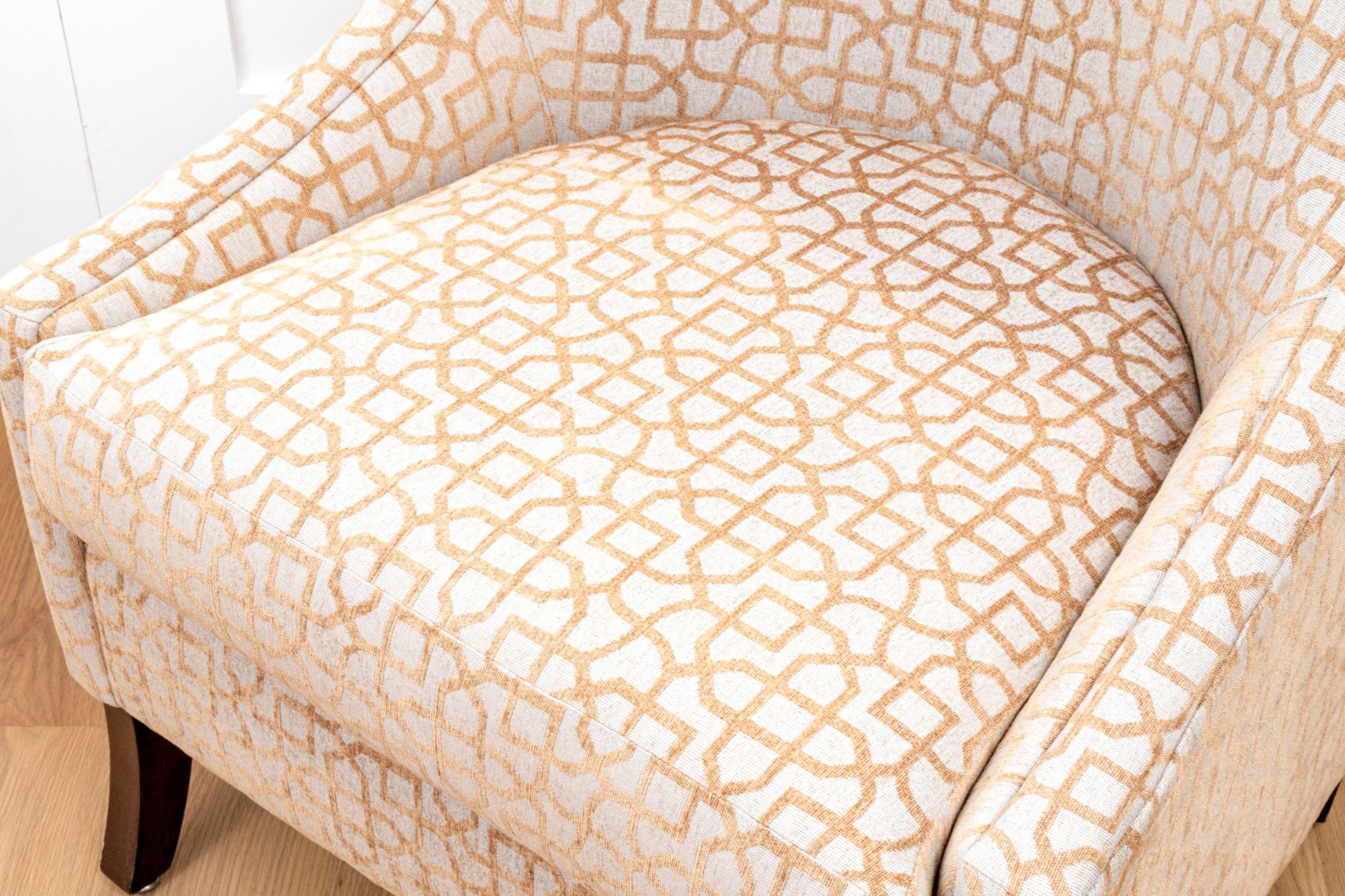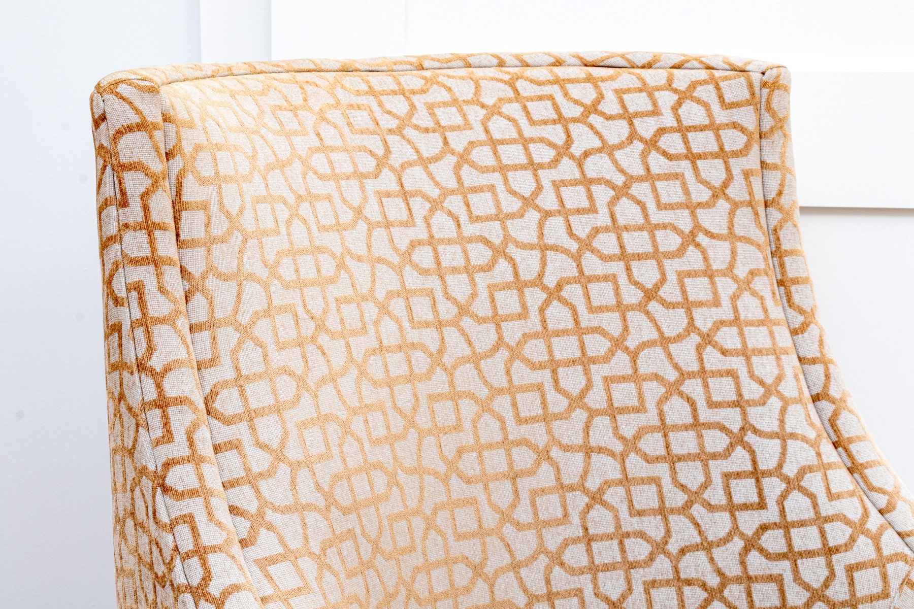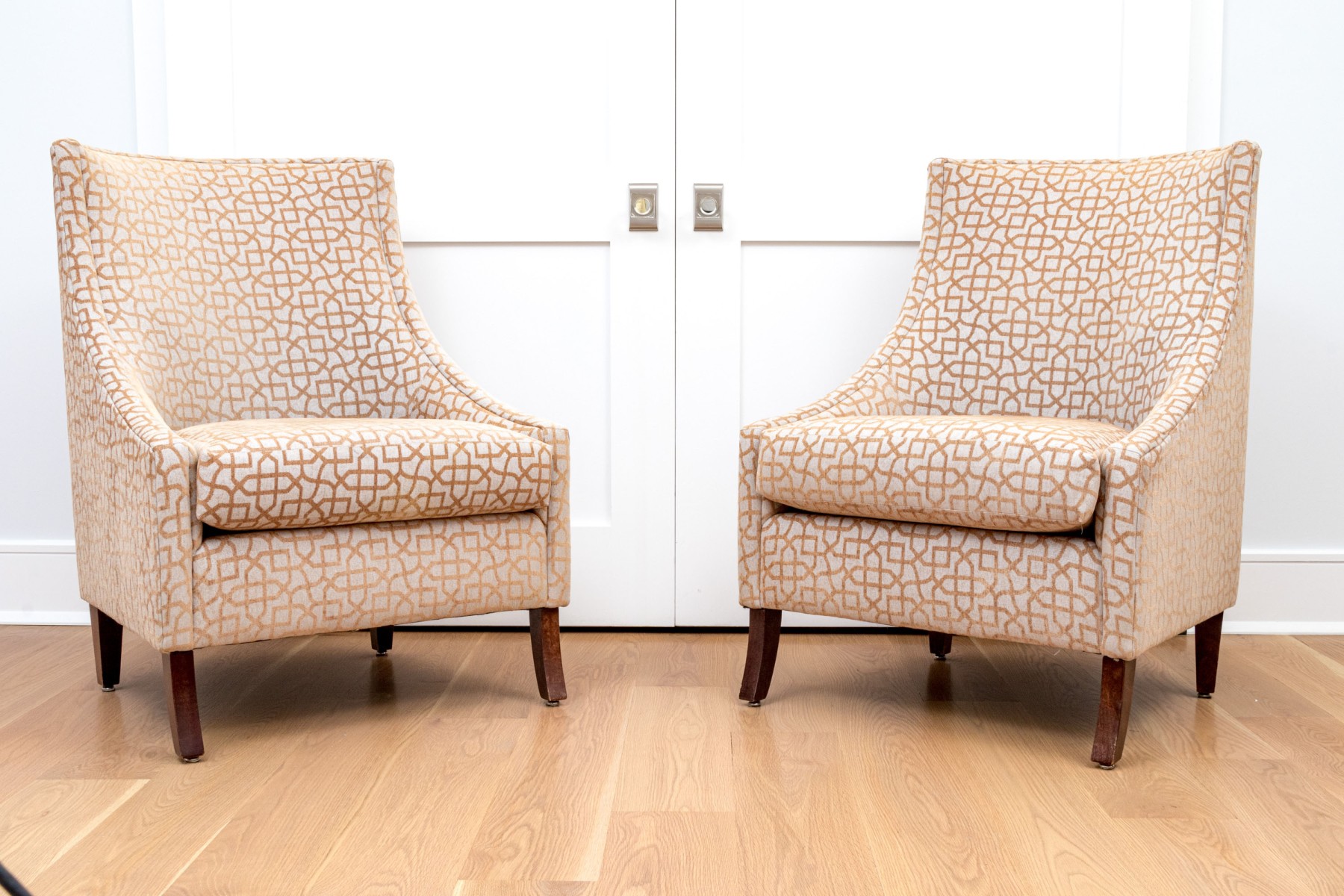 The chairs are each raised upon carved and finished wooden legs and upholstered in a contemporary patterned, textural fabric. Each chair with a loose upholstered seat cushion.