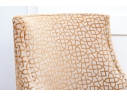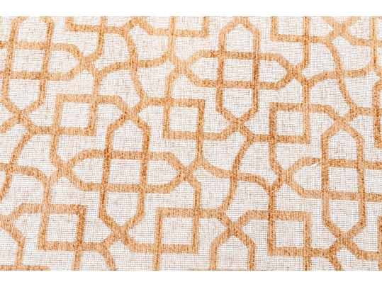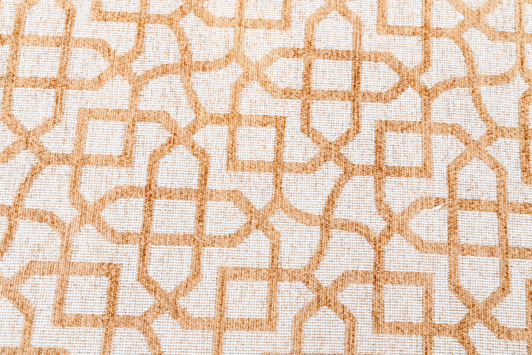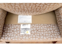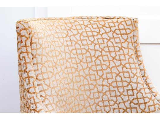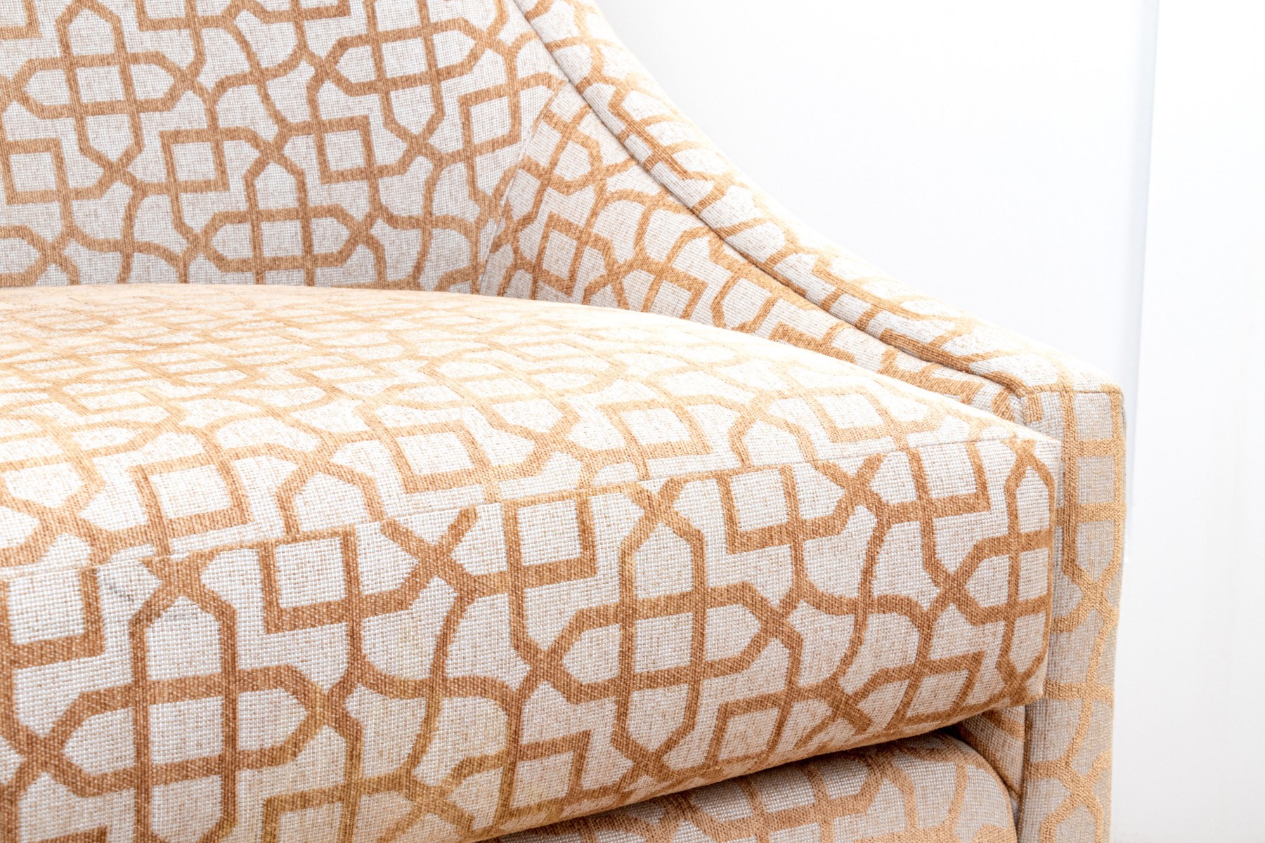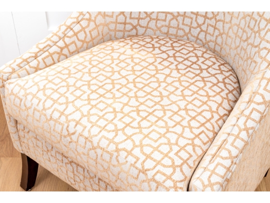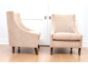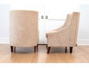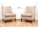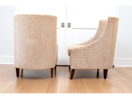 The chairs are each raised upon carved and finished wooden legs and upholstered in a contemporary patterned, textural fabric. Each chair with a loose upholstered seat cushion.