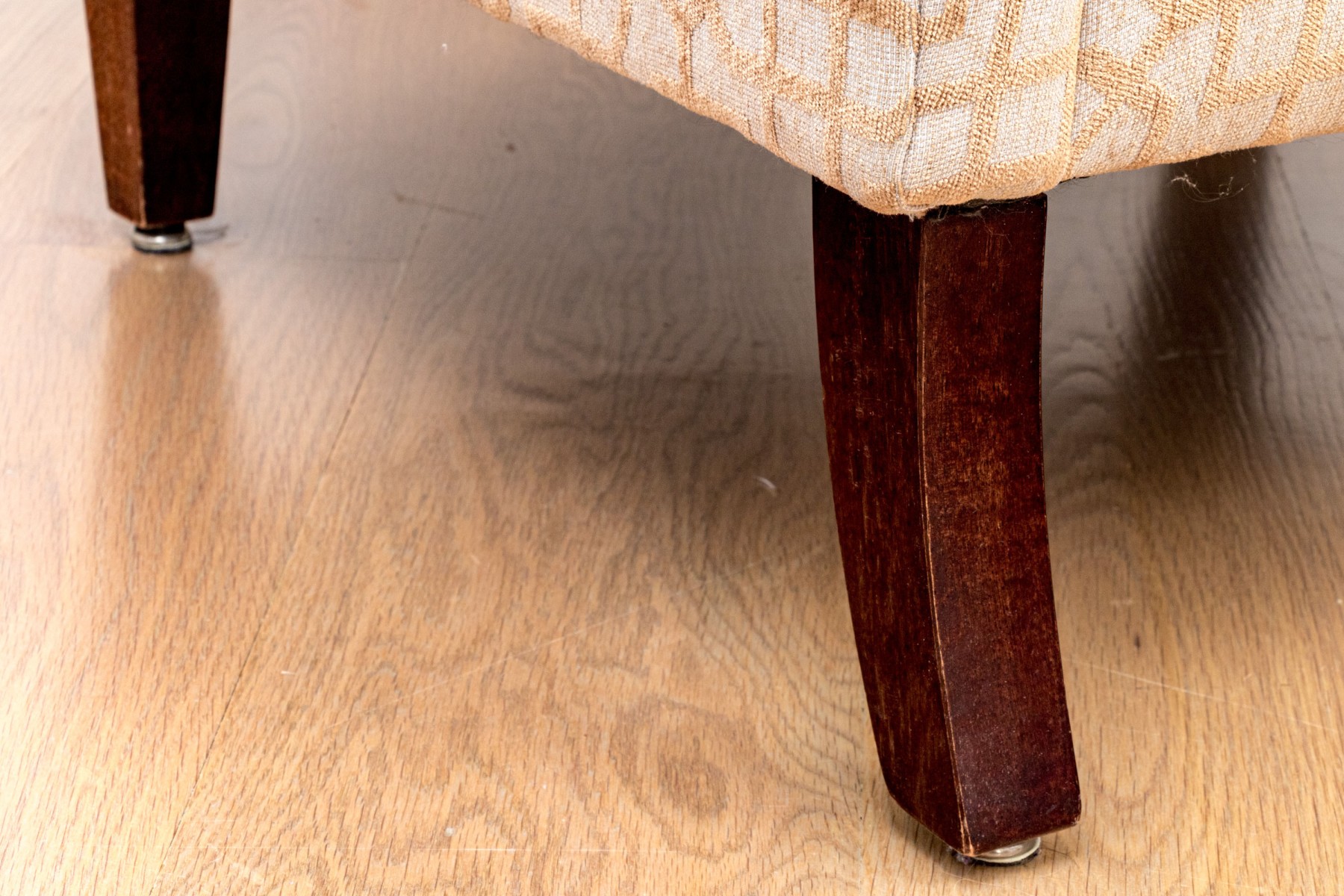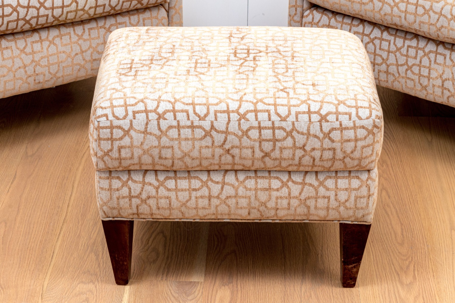 A fantastic pair of upholstered sloped armchairs, together with a single ottoman.