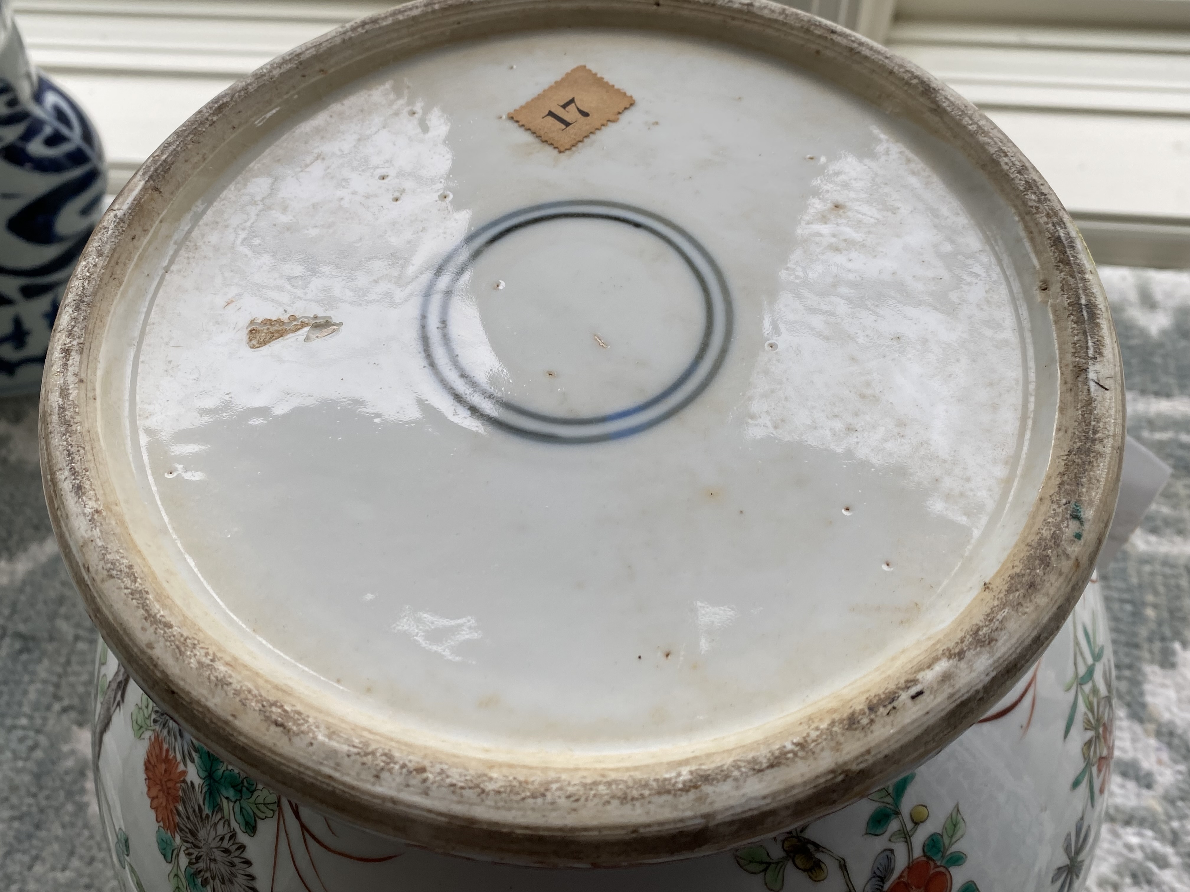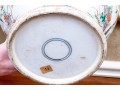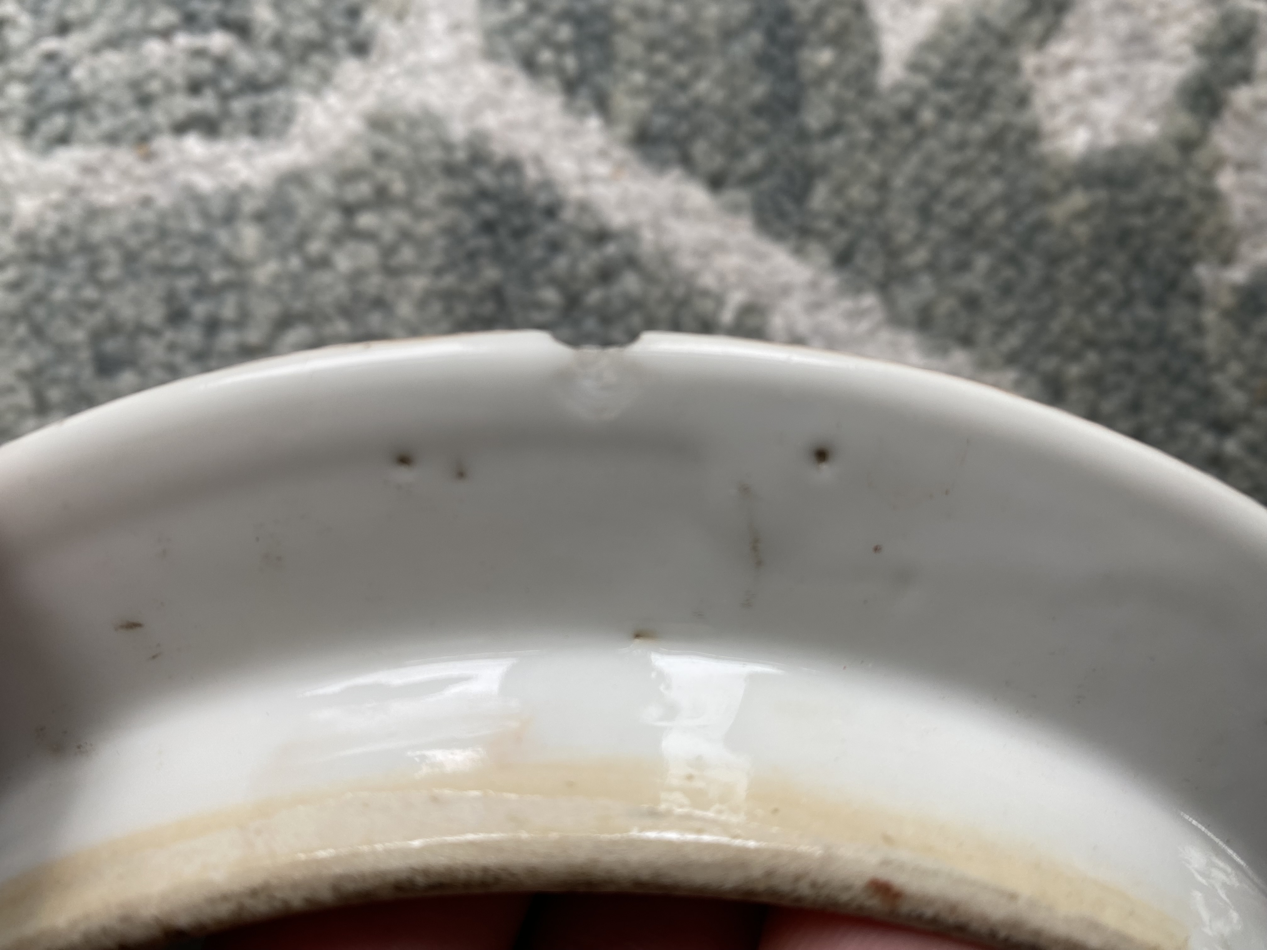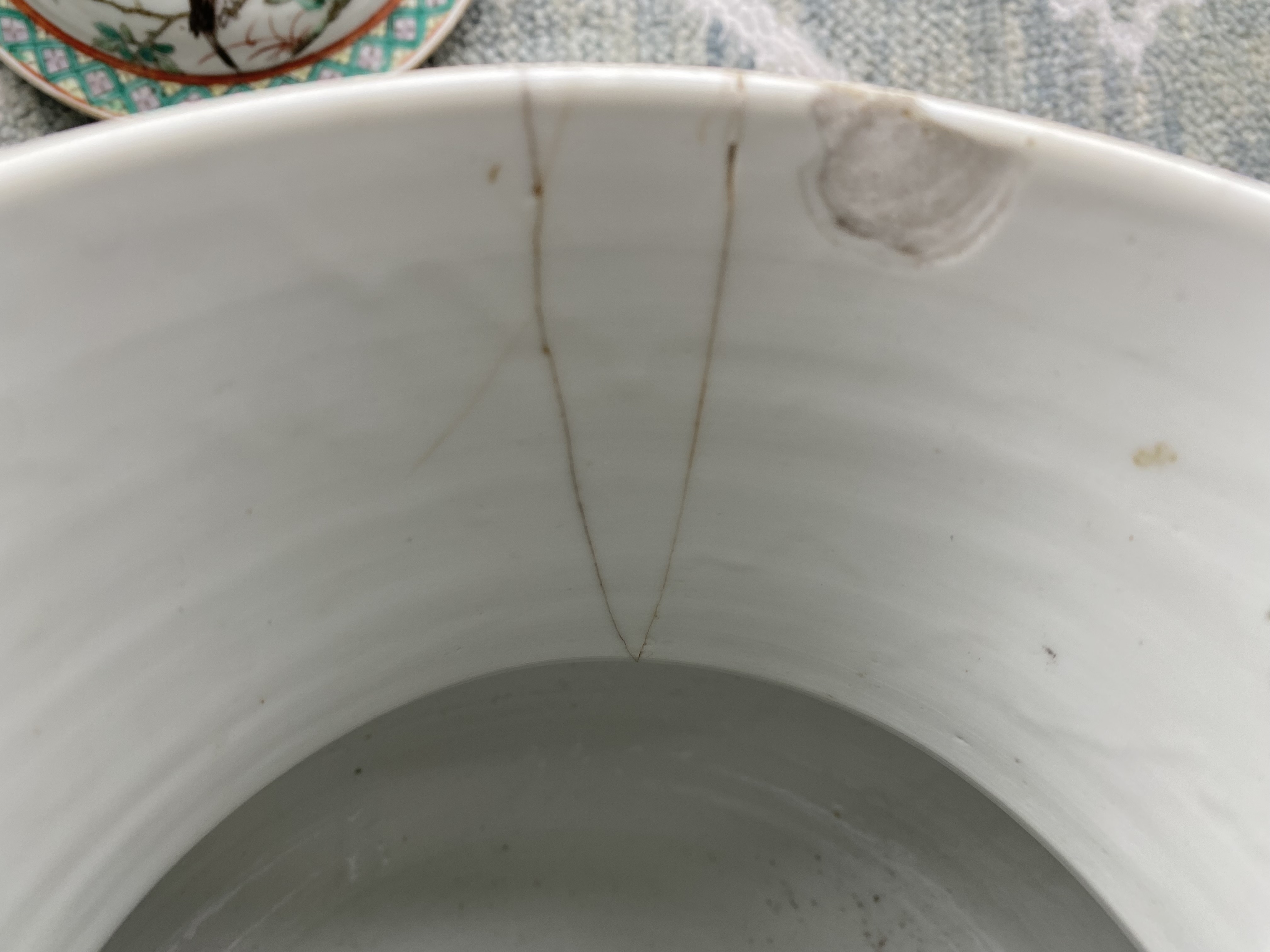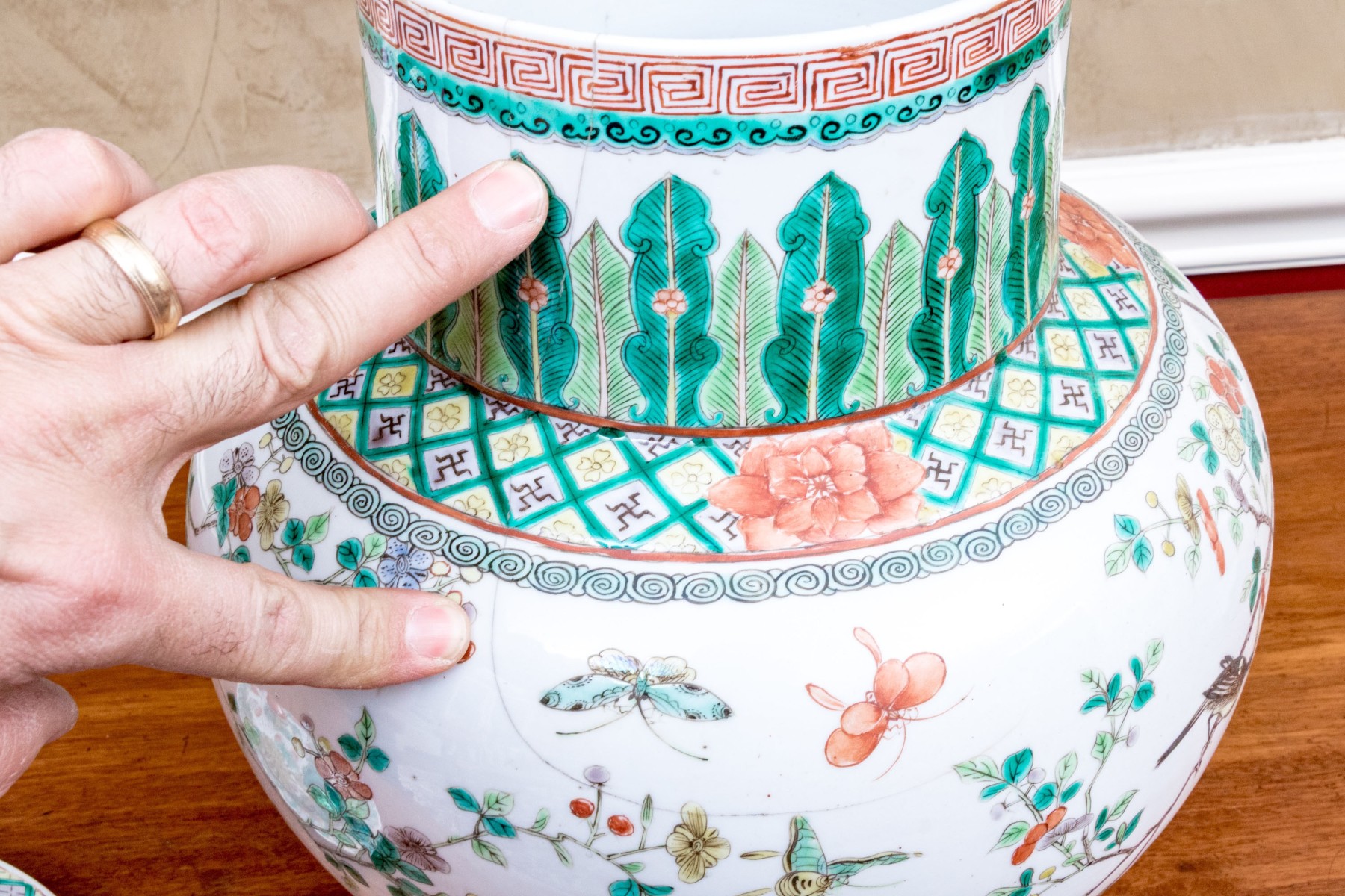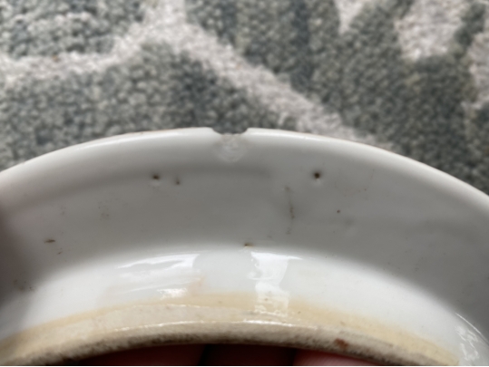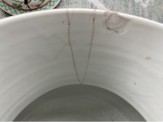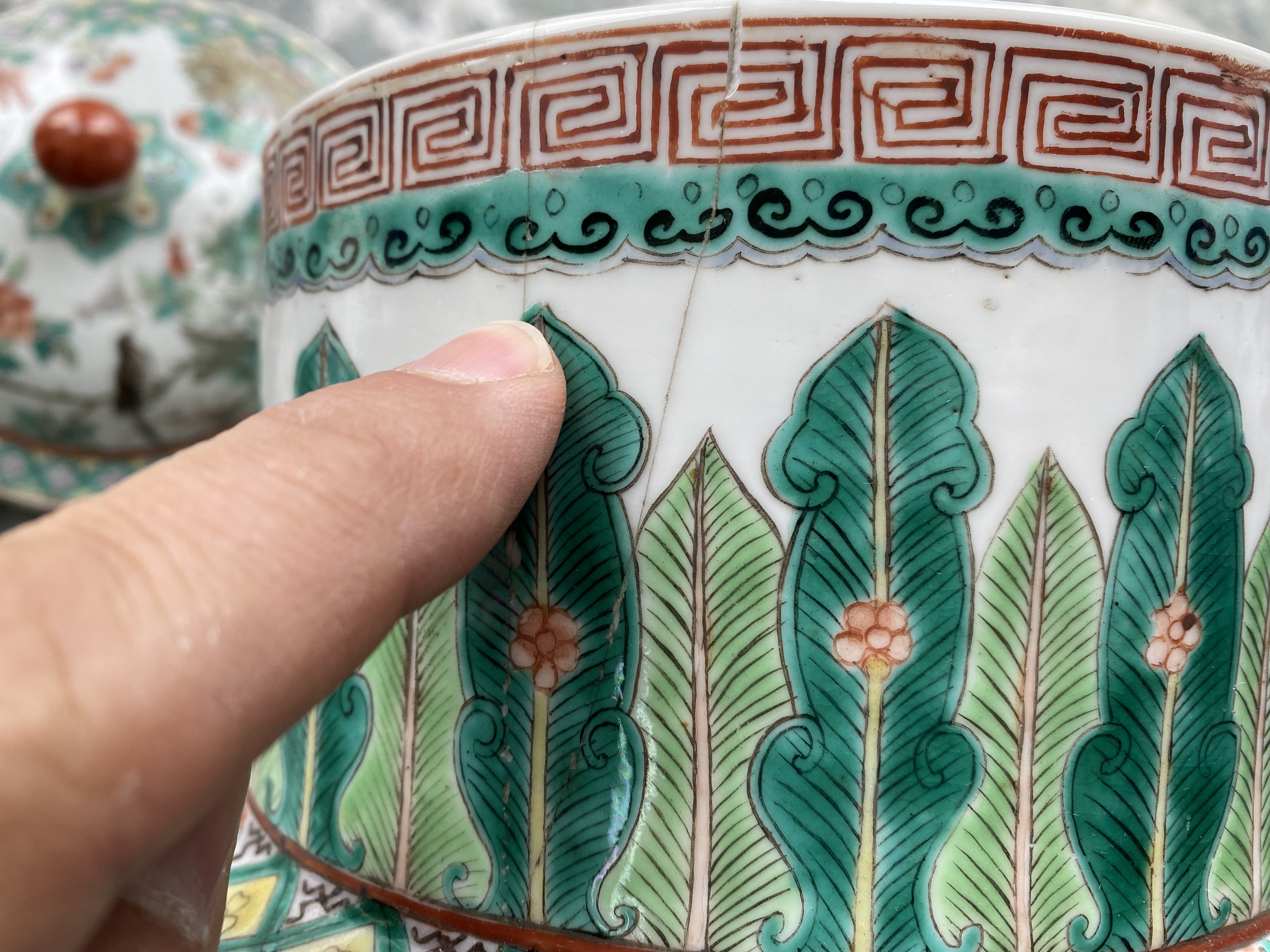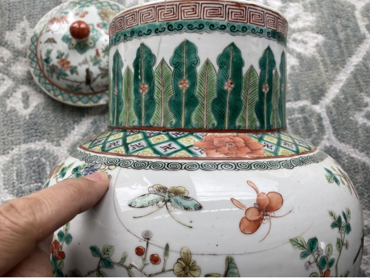 A chip to the lid rim and a hairline fracture to the neck and down part of the body. In the same area there is a chip to the inside of the rim of the body of the vase. The foot has wear. Please see photos.