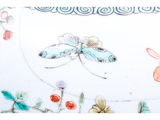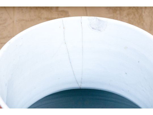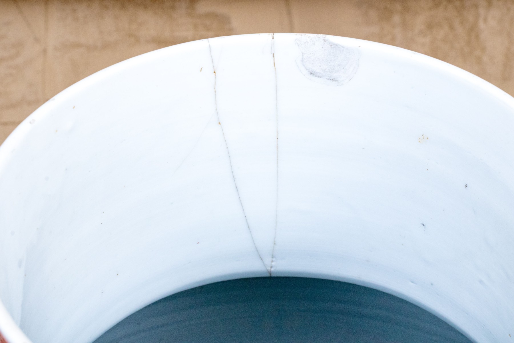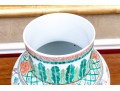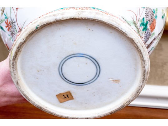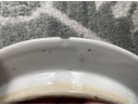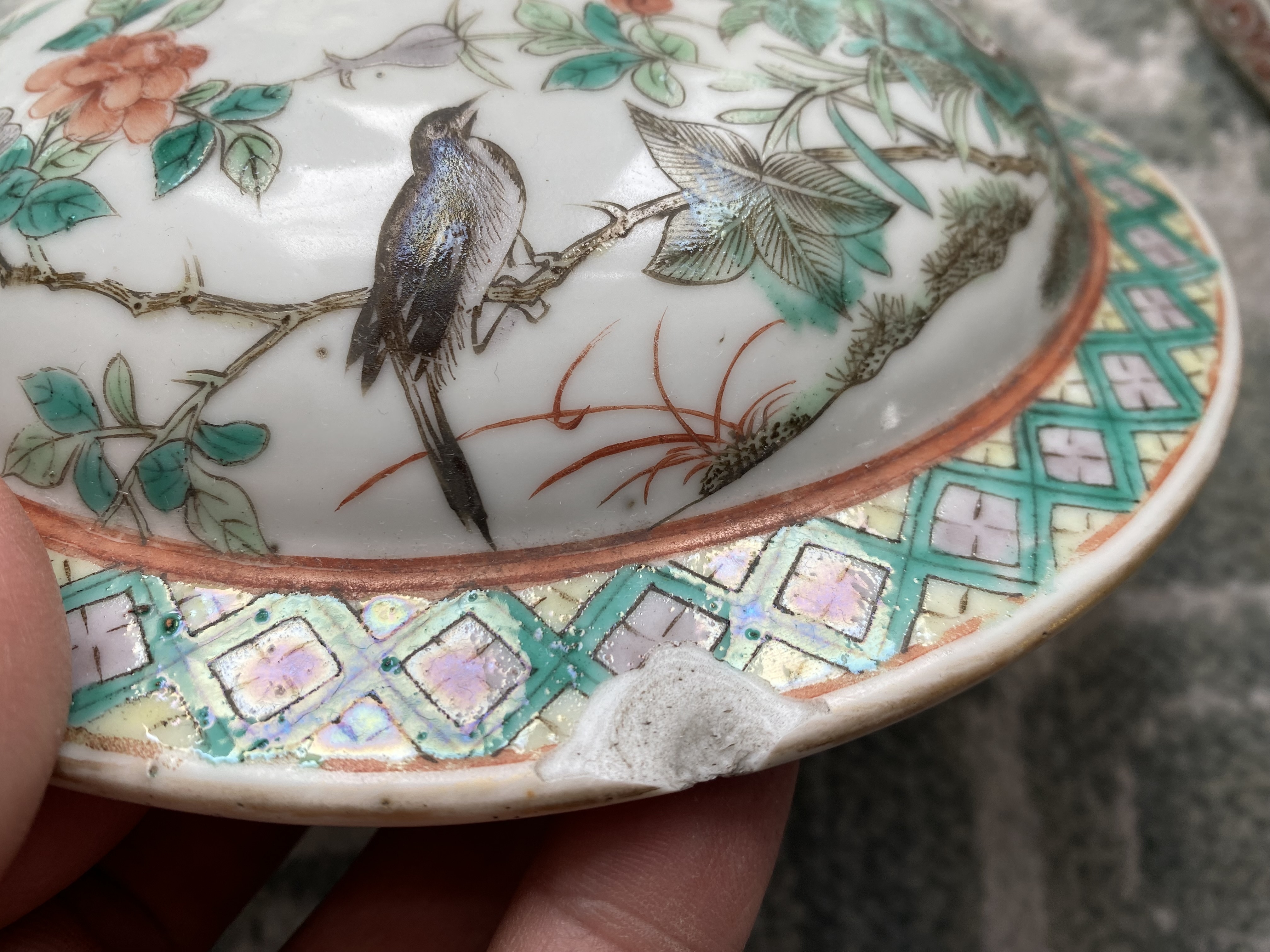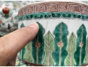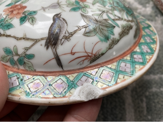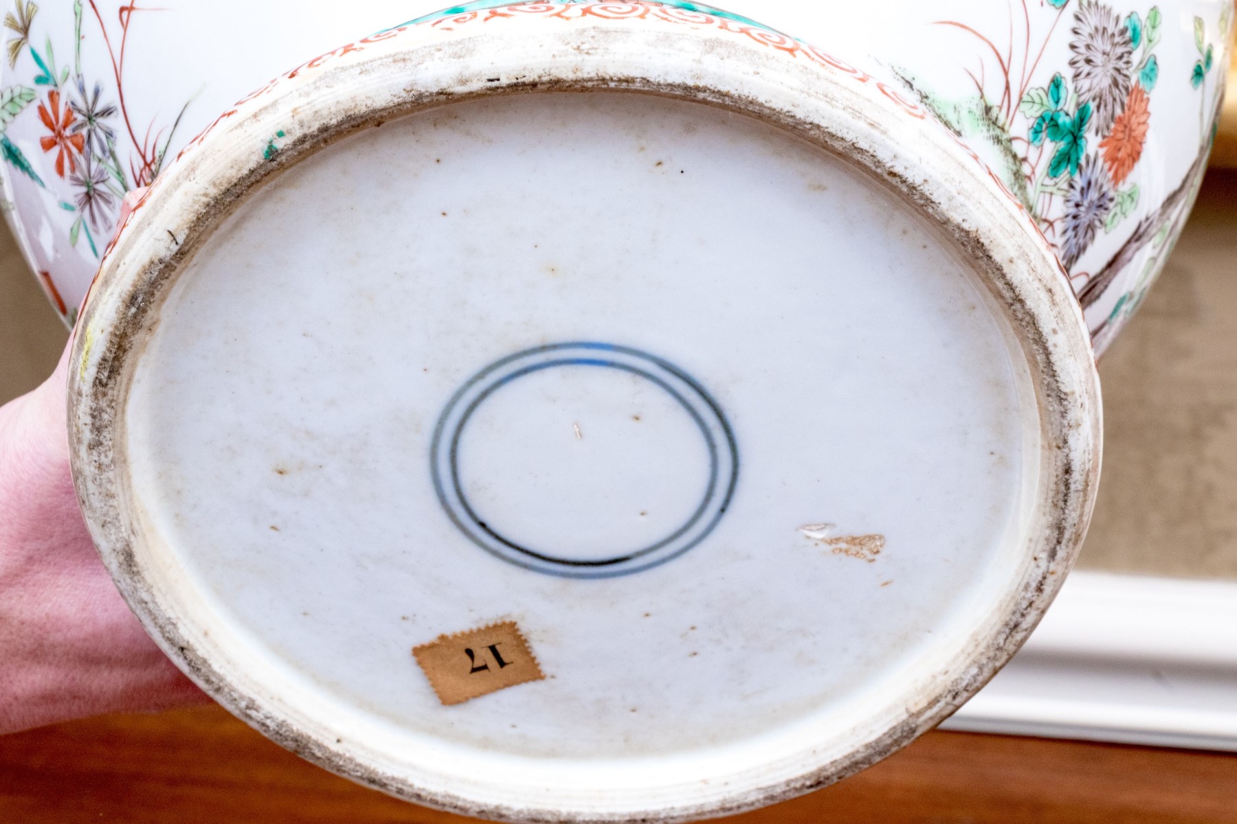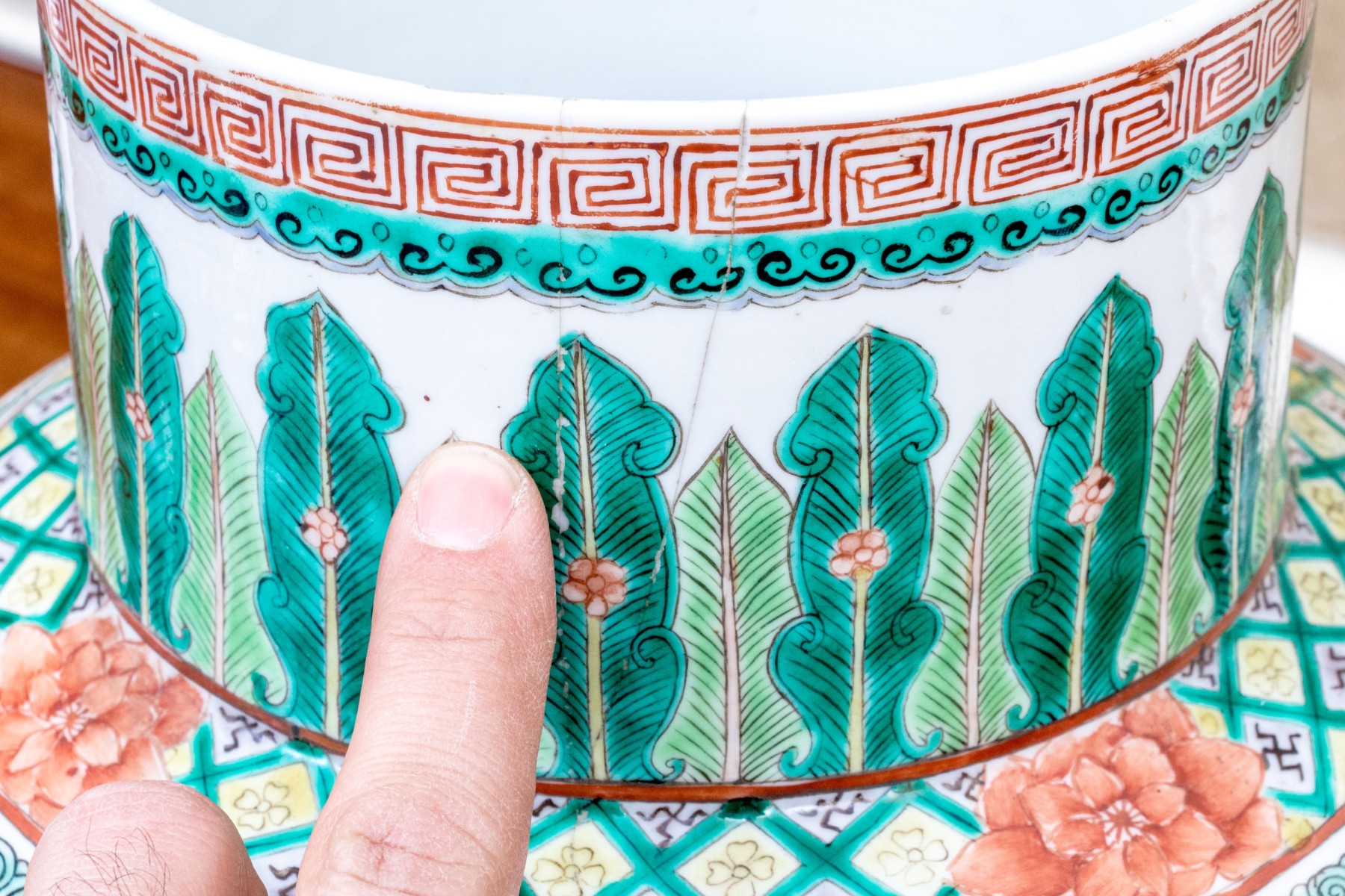 A chip to the lid rim and a hairline fracture to the neck and down part of the body. In the same area there is a chip to the inside of the rim of the body of the vase. The foot has wear. Please see photos.