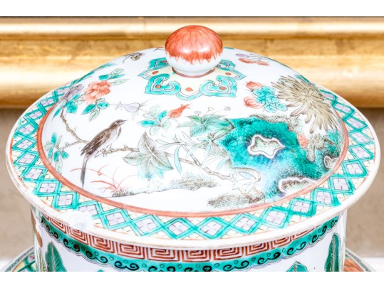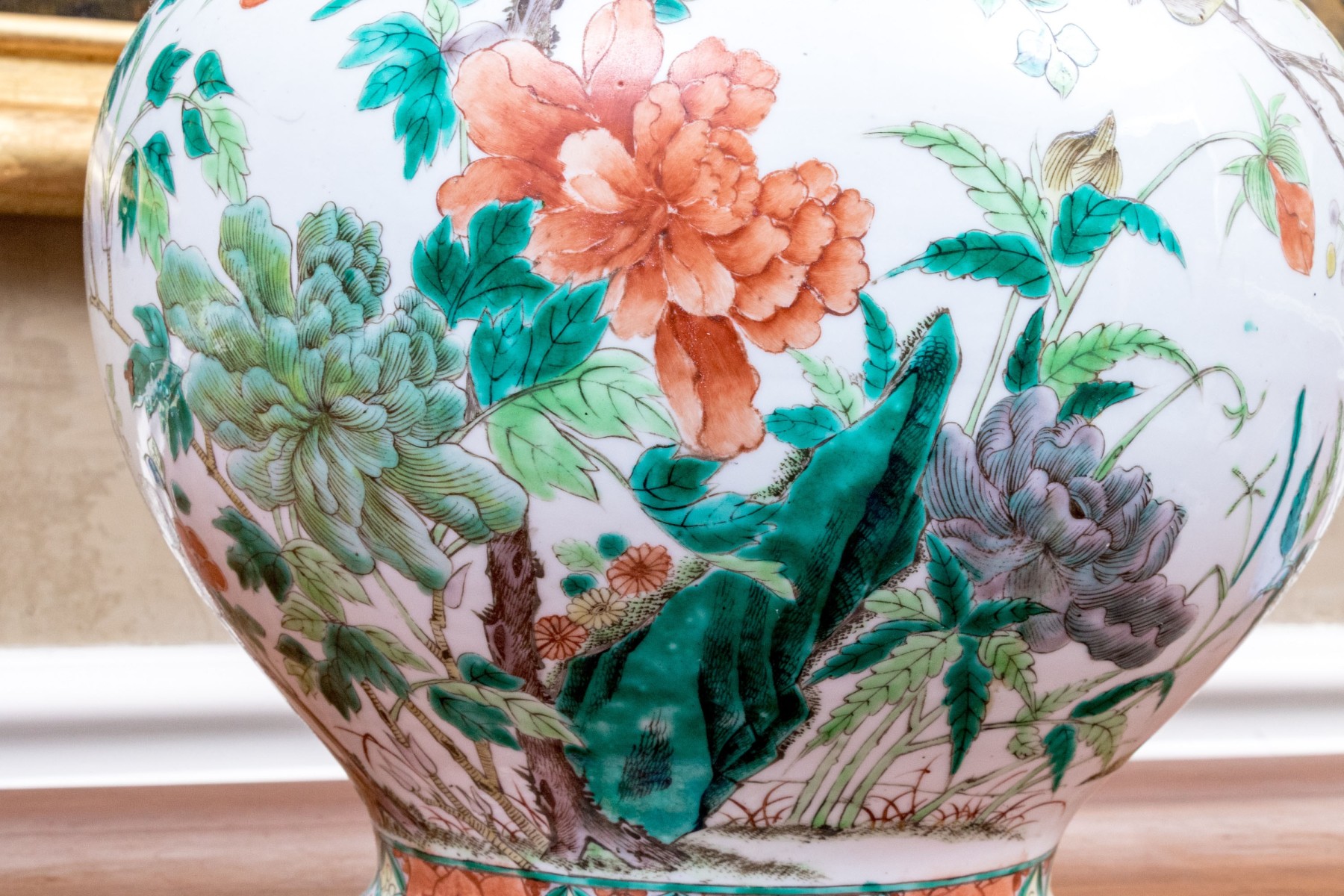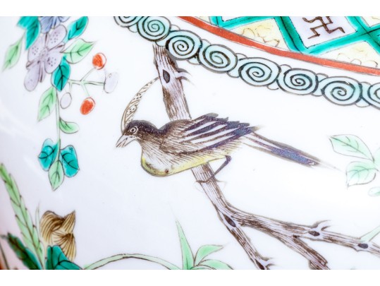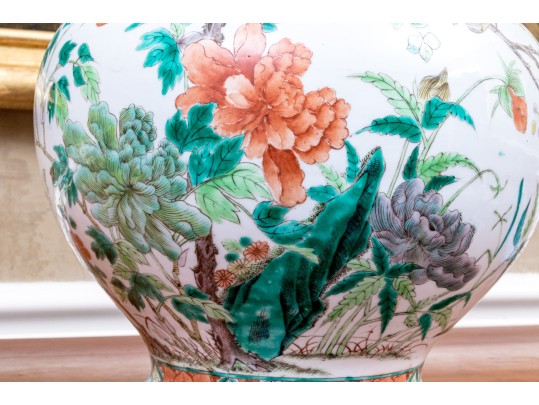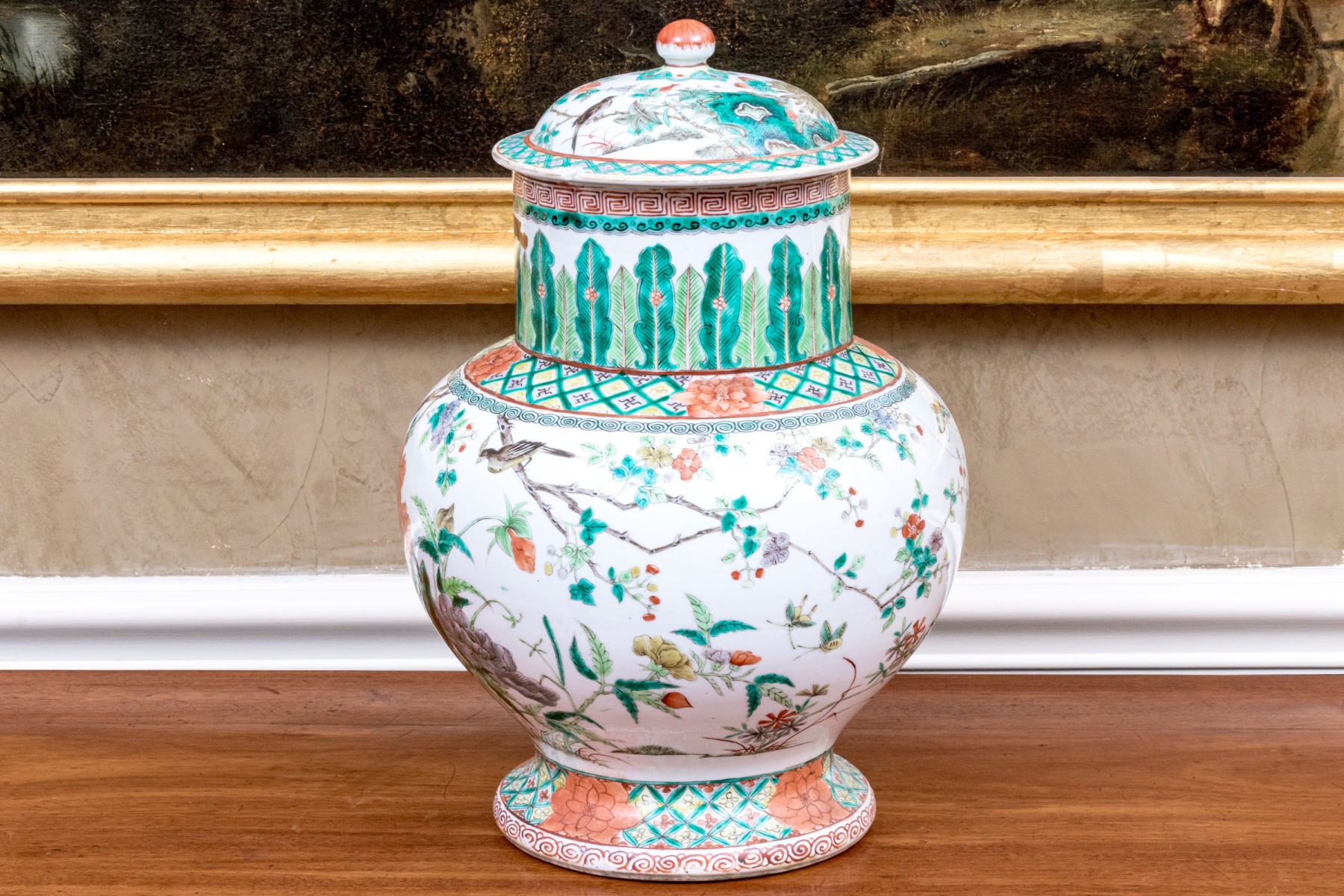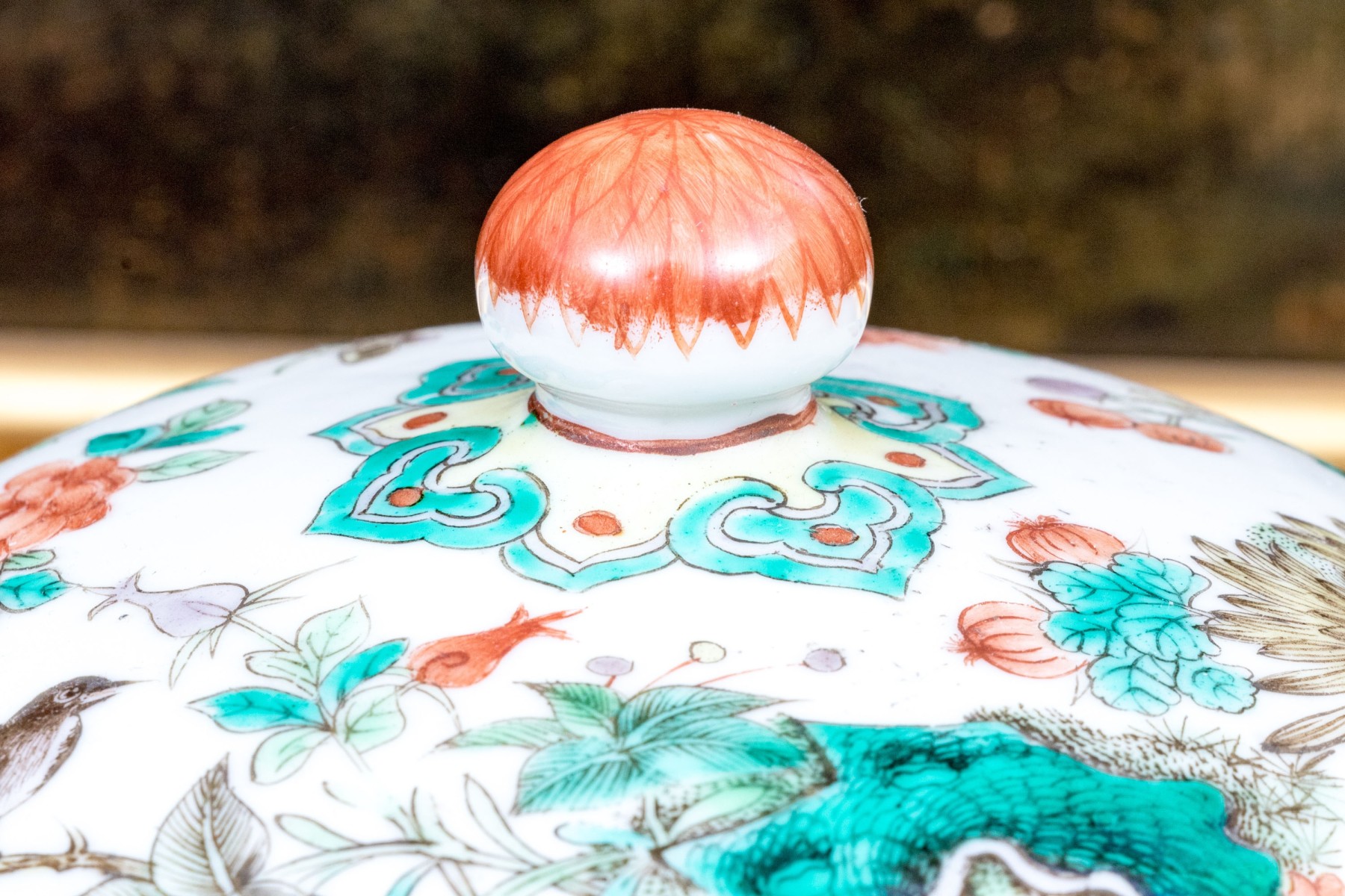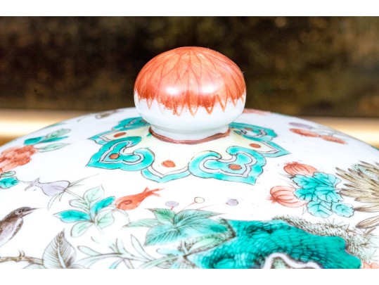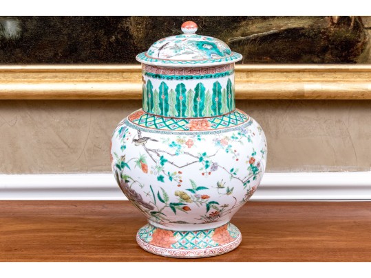 A beautiful Chinese Qing Dynasty porcelain jar showcasing a sphere finial over a domed lid with a flared rim sitting atop a rotund, cylindrical neck leading to an apple form body on a raised circular foot. Decorated in beautiful famille verte with scenes of rockery and birds perched on flowering branches across the lid and body. The neck is detailed with a red key fret border over a tall band of alternating tall and short green leaves, complemented by lattices interrupted by large orange flowers around the top of the body and the foot.