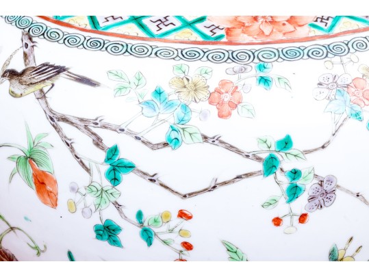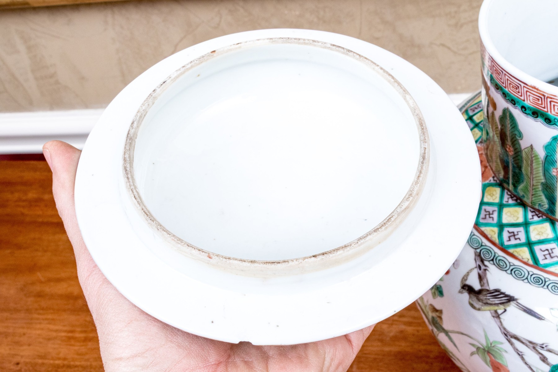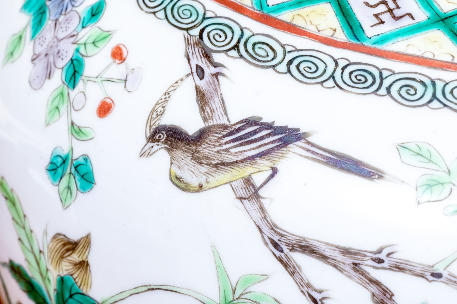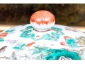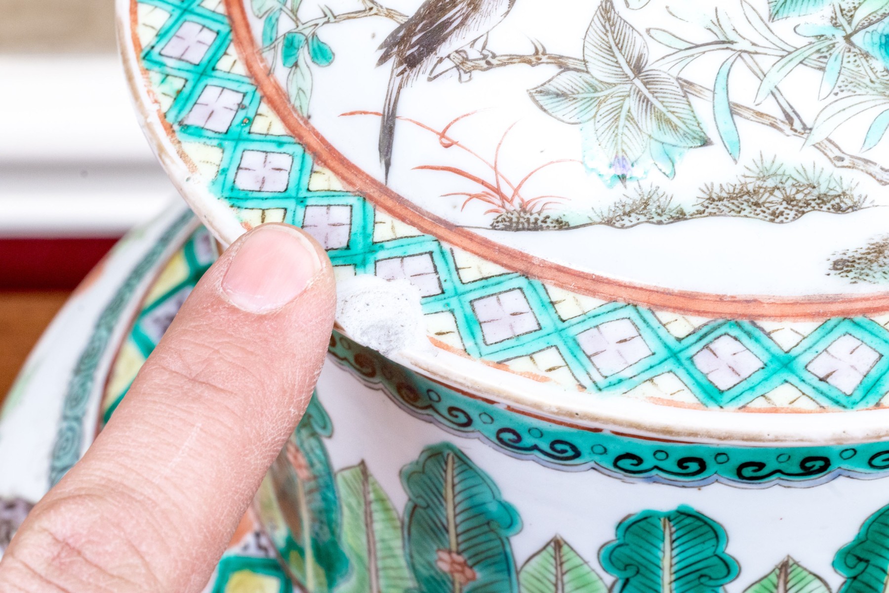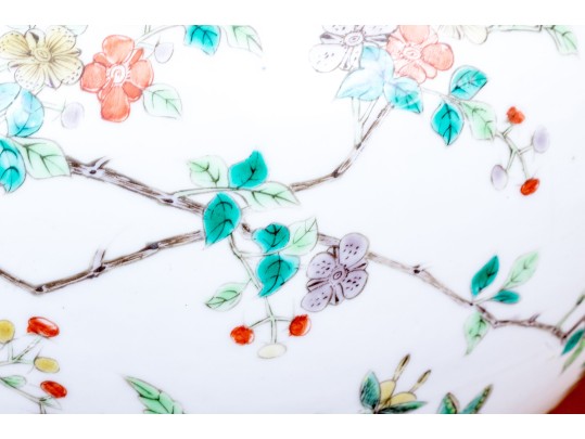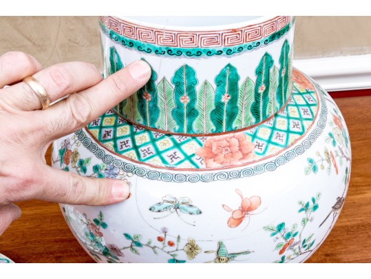 A beautiful Chinese Qing Dynasty porcelain jar showcasing a sphere finial over a domed lid with a flared rim sitting atop a rotund, cylindrical neck leading to an apple form body on a raised circular foot. Decorated in beautiful famille verte with scenes of rockery and birds perched on flowering branches across the lid and body. The neck is detailed with a red key fret border over a tall band of alternating tall and short green leaves, complemented by lattices interrupted by large orange flowers around the top of the body and the foot.