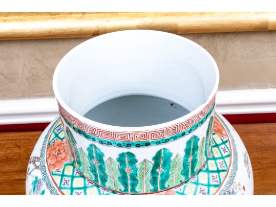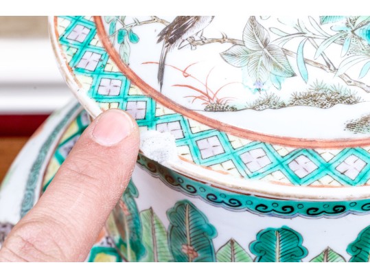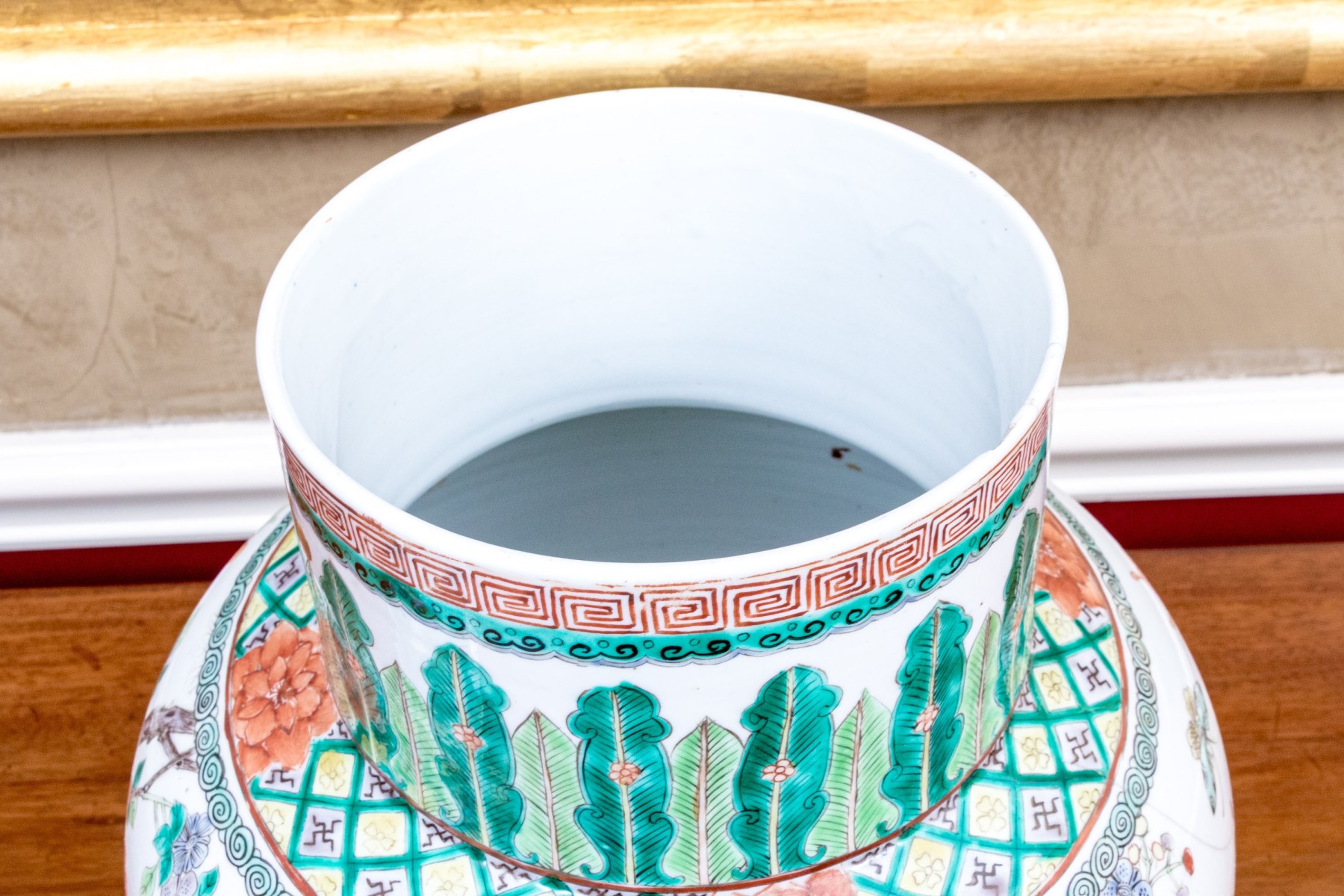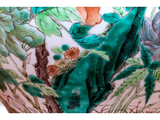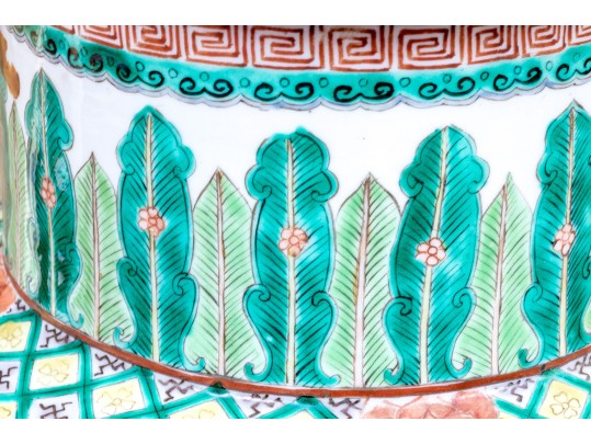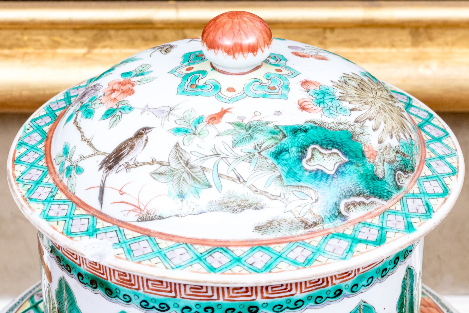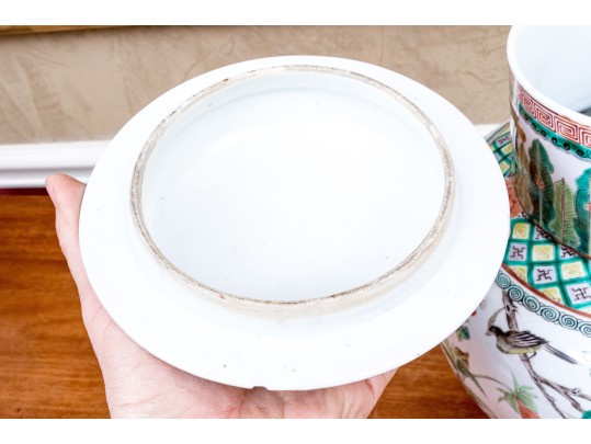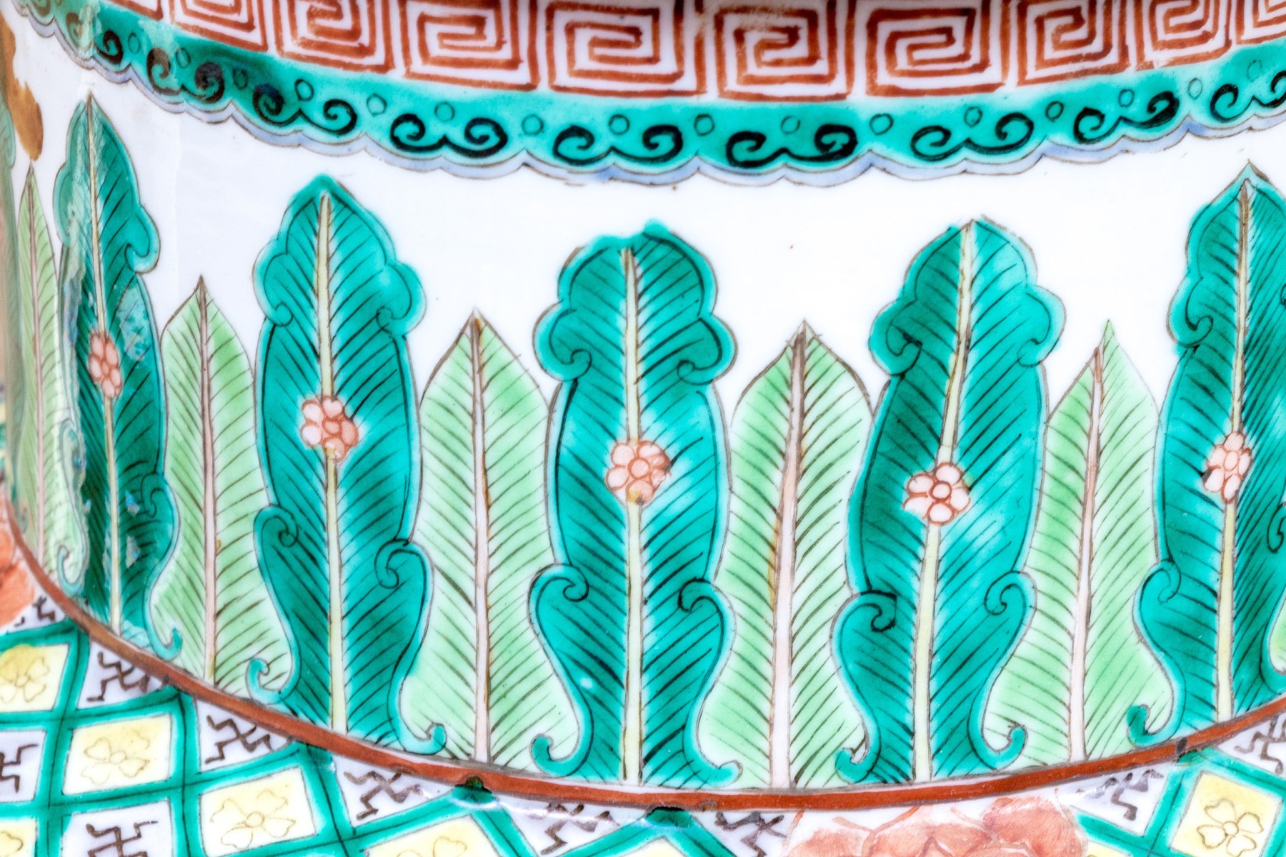A beautiful Chinese Qing Dynasty porcelain jar showcasing a sphere finial over a domed lid with a flared rim sitting atop a rotund, cylindrical neck leading to an apple form body on a raised circular foot. Decorated in beautiful famille verte with scenes of rockery and birds perched on flowering branches across the lid and body. The neck is detailed with a red key fret border over a tall band of alternating tall and short green leaves, complemented by lattices interrupted by large orange flowers around the top of the body and the foot.