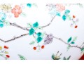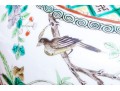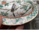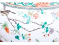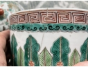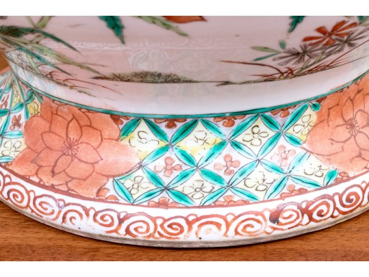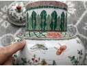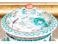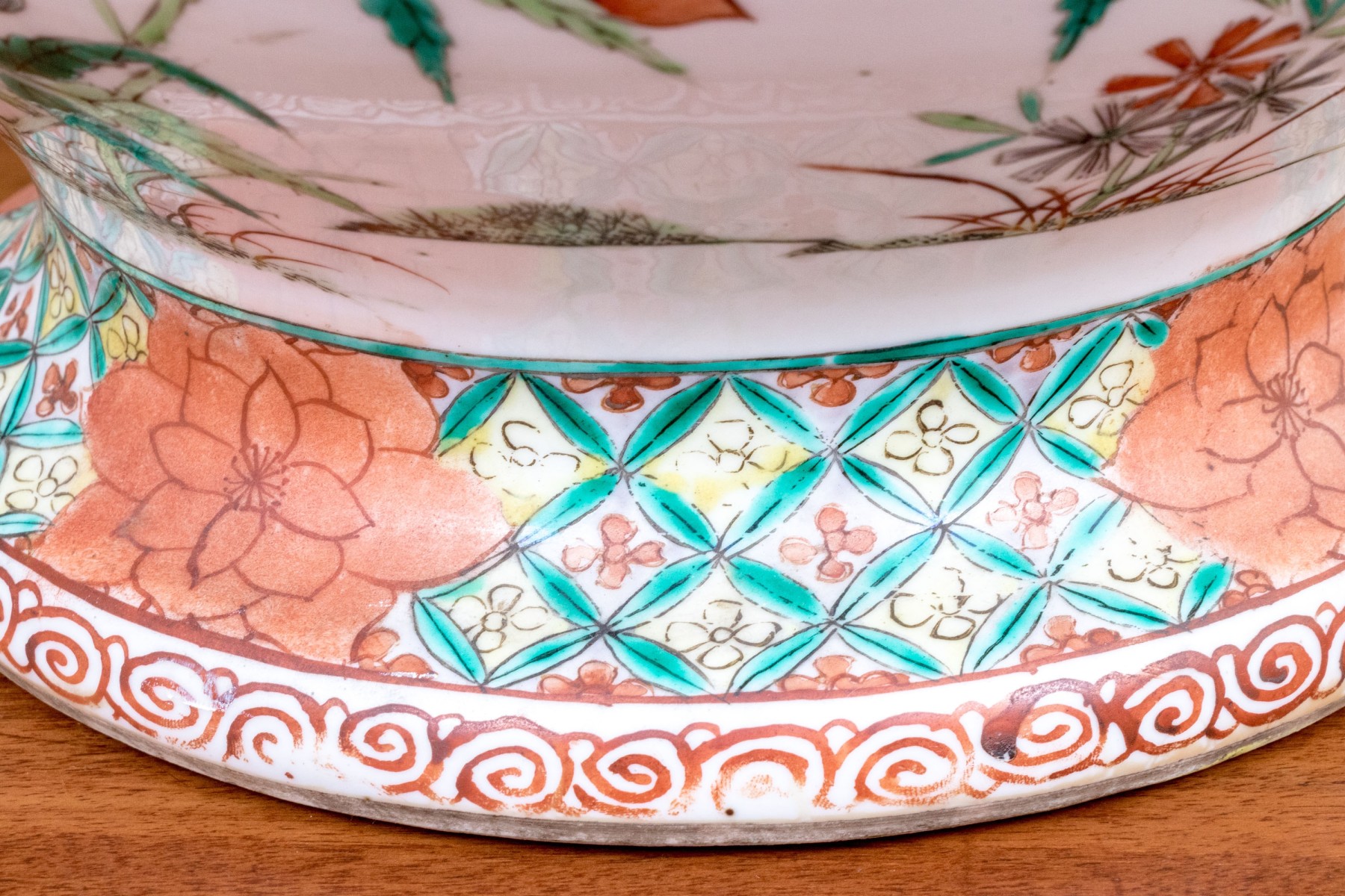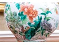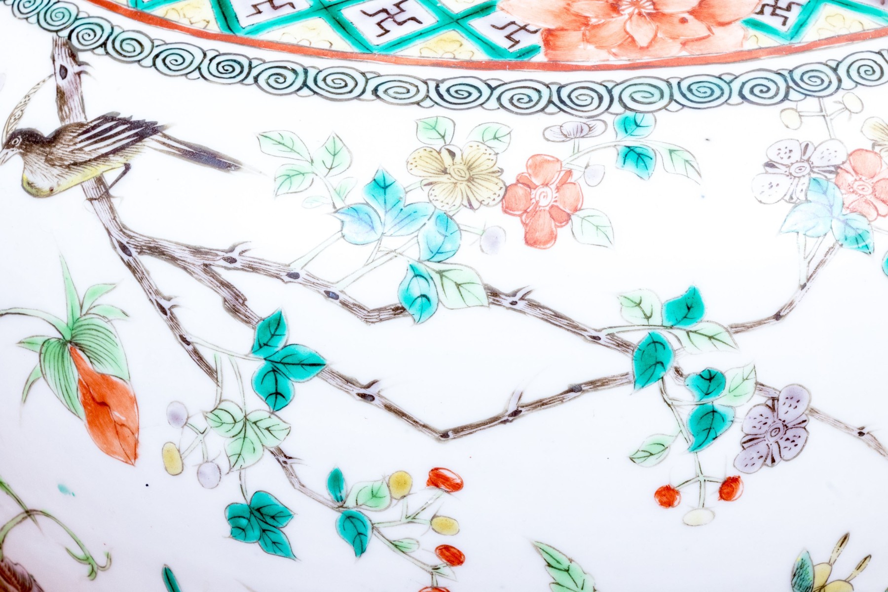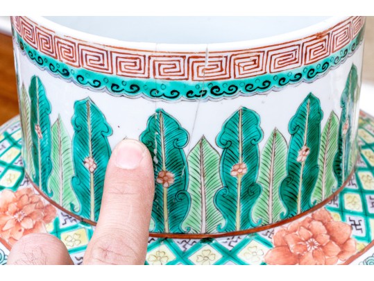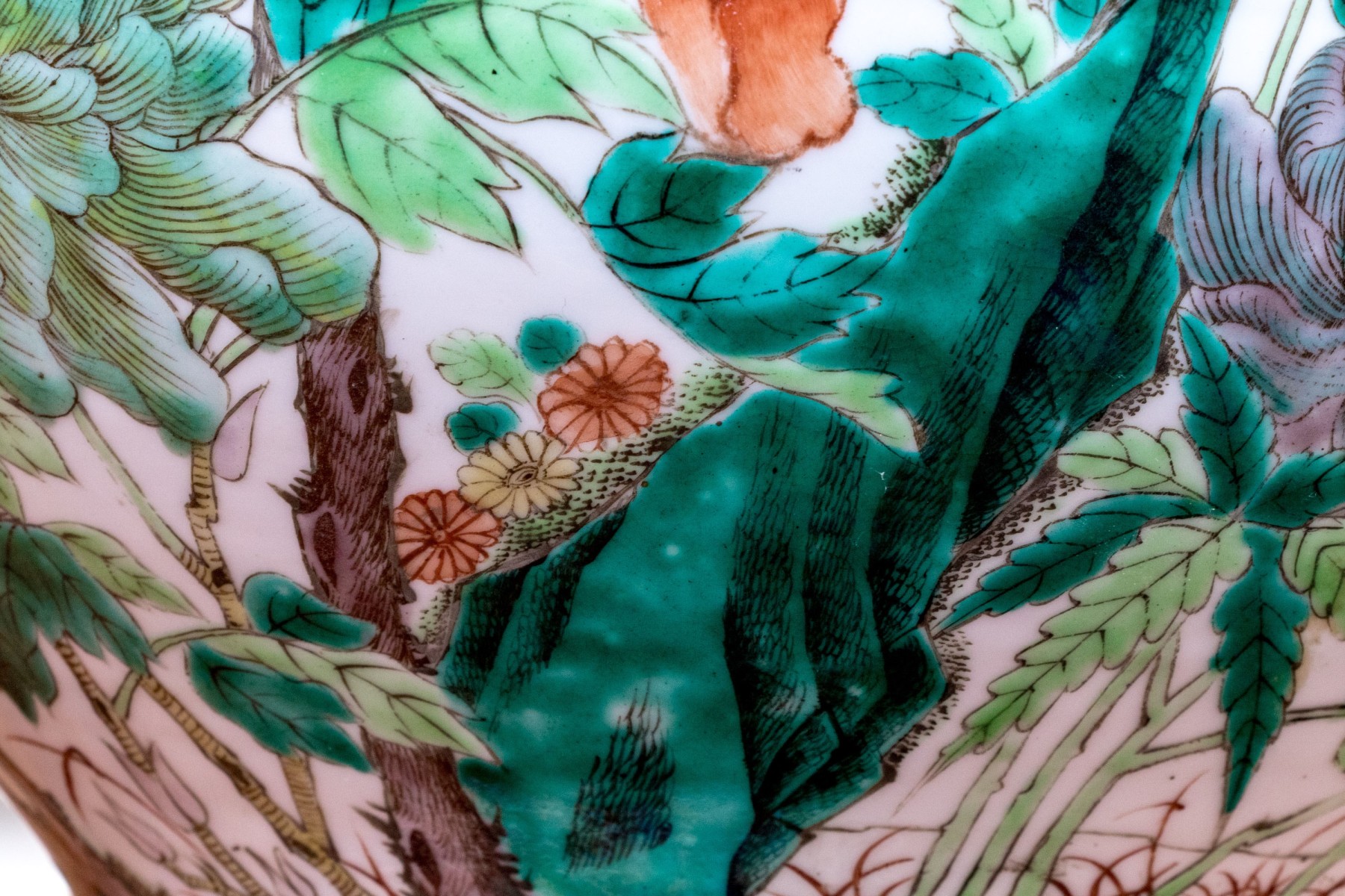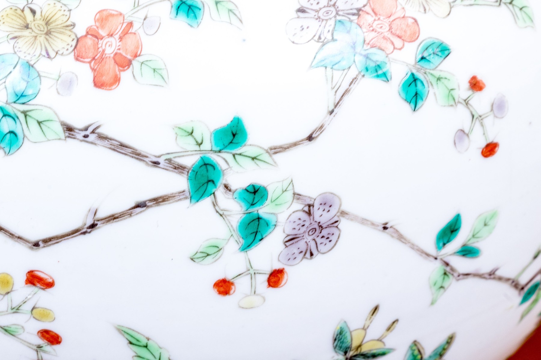 A beautiful Chinese Qing Dynasty porcelain jar showcasing a sphere finial over a domed lid with a flared rim sitting atop a rotund, cylindrical neck leading to an apple form body on a raised circular foot. Decorated in beautiful famille verte with scenes of rockery and birds perched on flowering branches across the lid and body. The neck is detailed with a red key fret border over a tall band of alternating tall and short green leaves, complemented by lattices interrupted by large orange flowers around the top of the body and the foot.