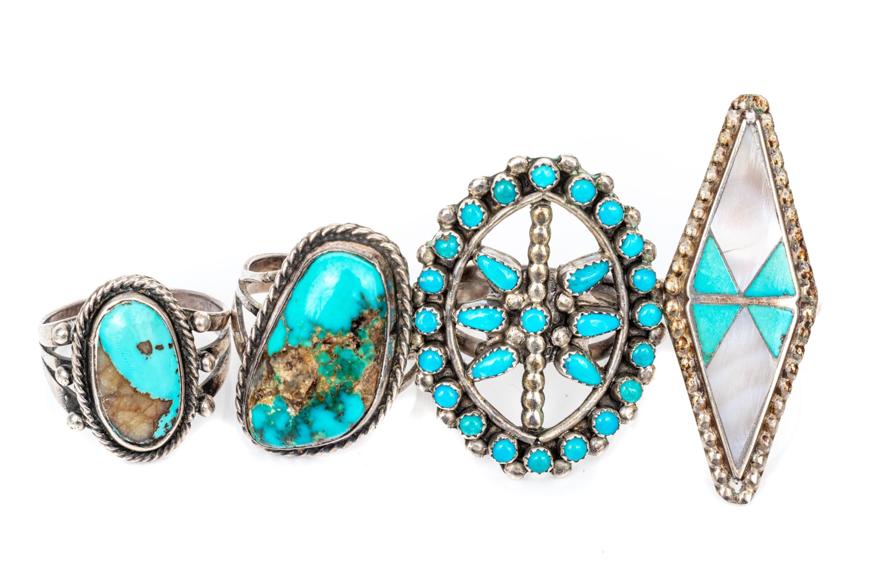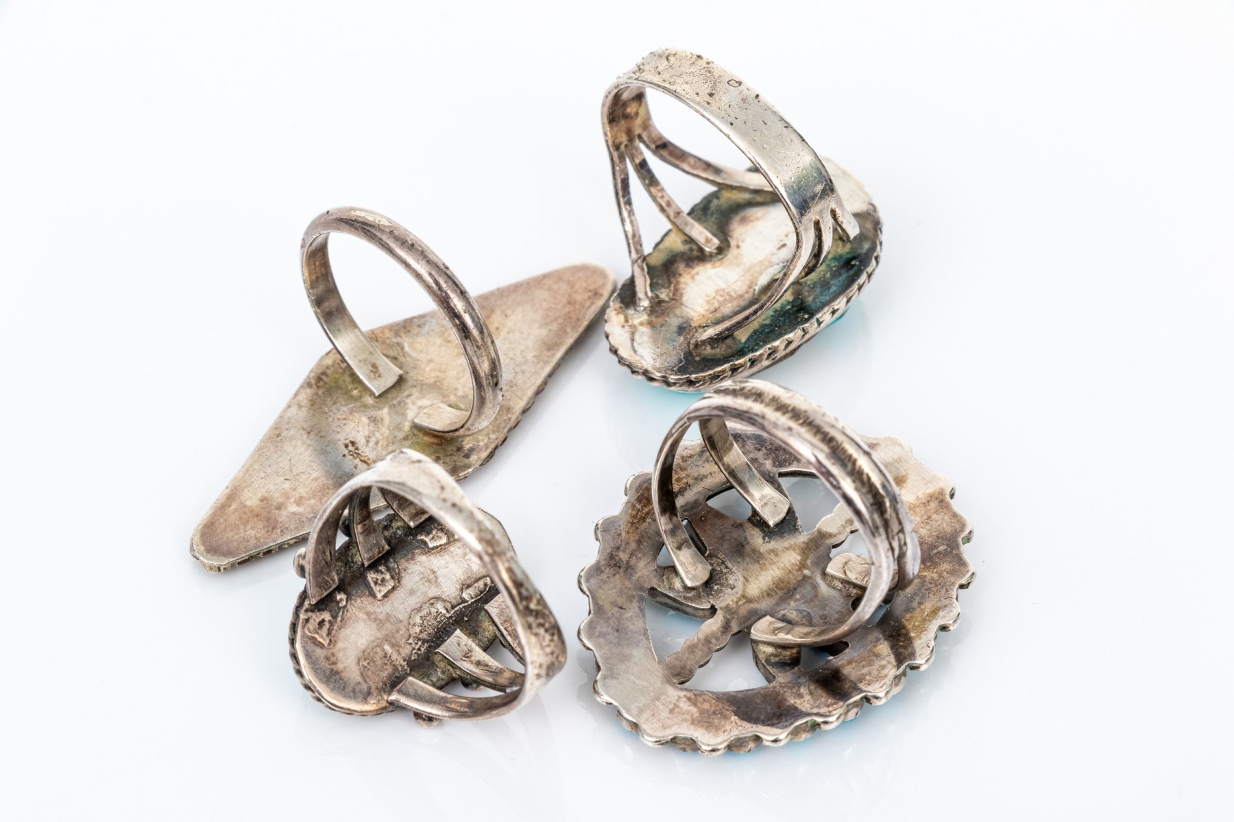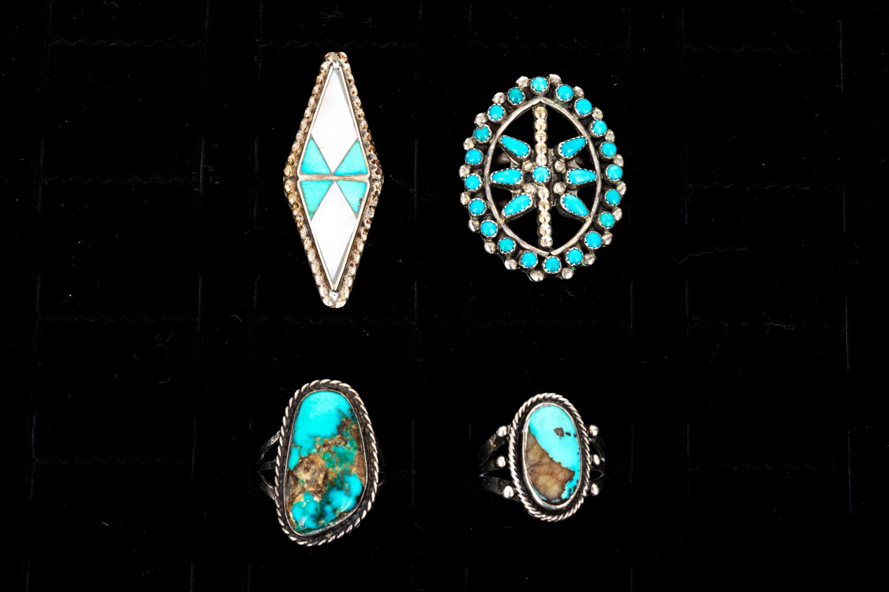 Collection of fun sterling silver Southwestern motif rings, sizes 5.75 to 7