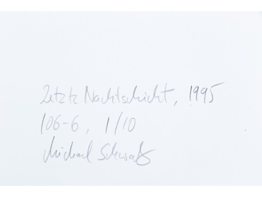 A fine collection of nine photographic works by Michael Schwab depicting atmospheric urban architecture, figures, and landscapes. Signed on the verso. Unframed.