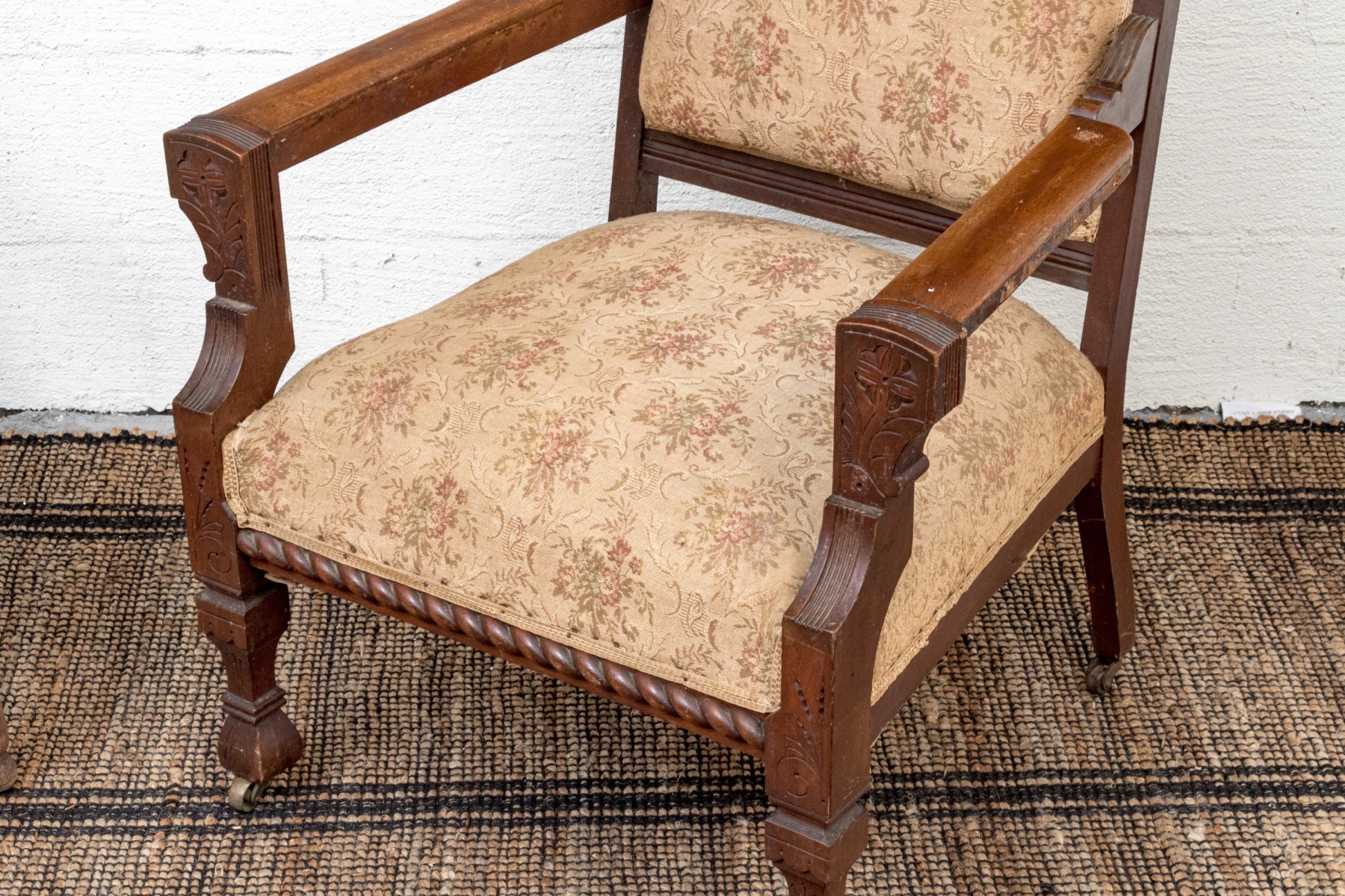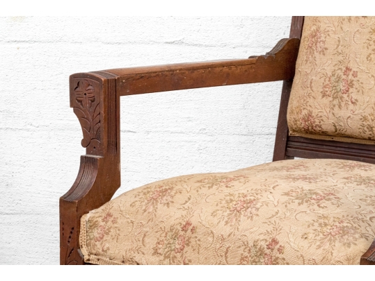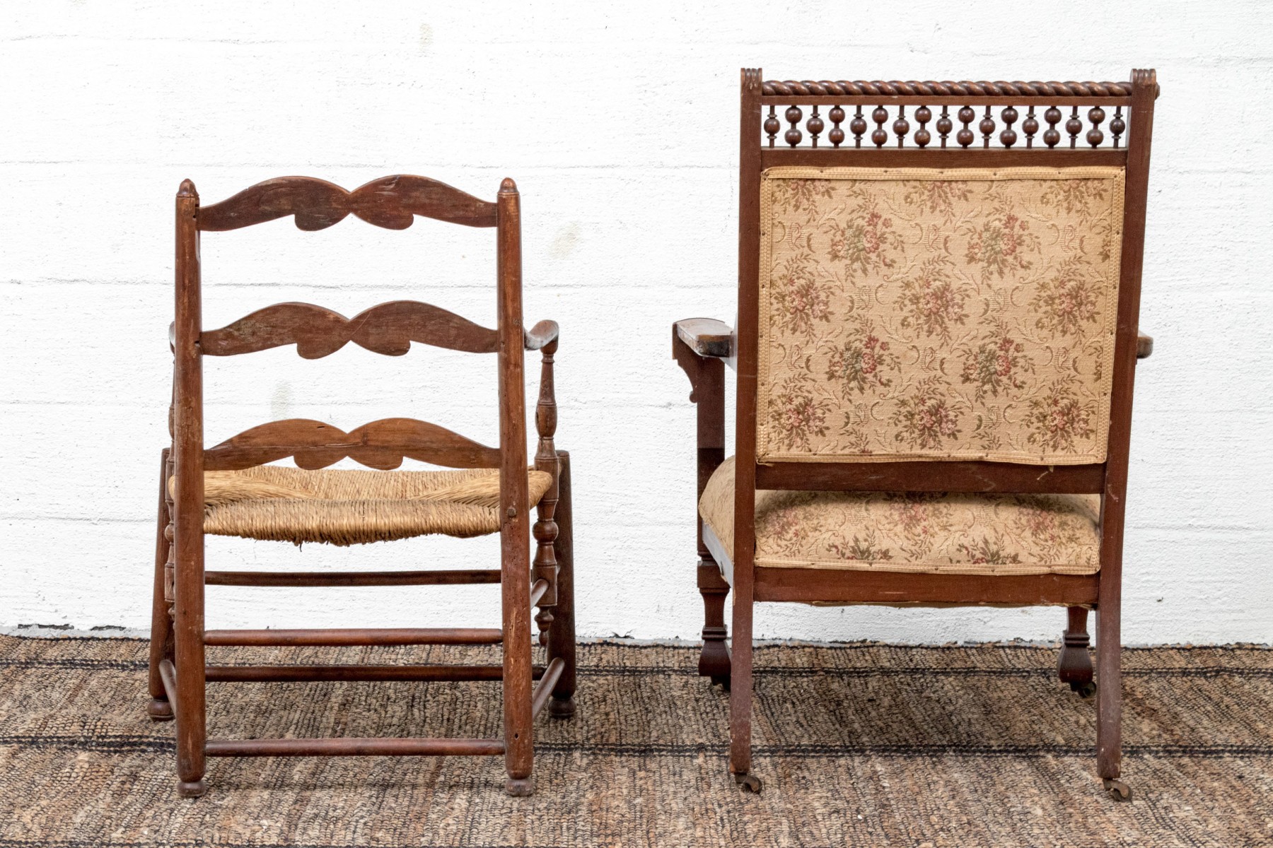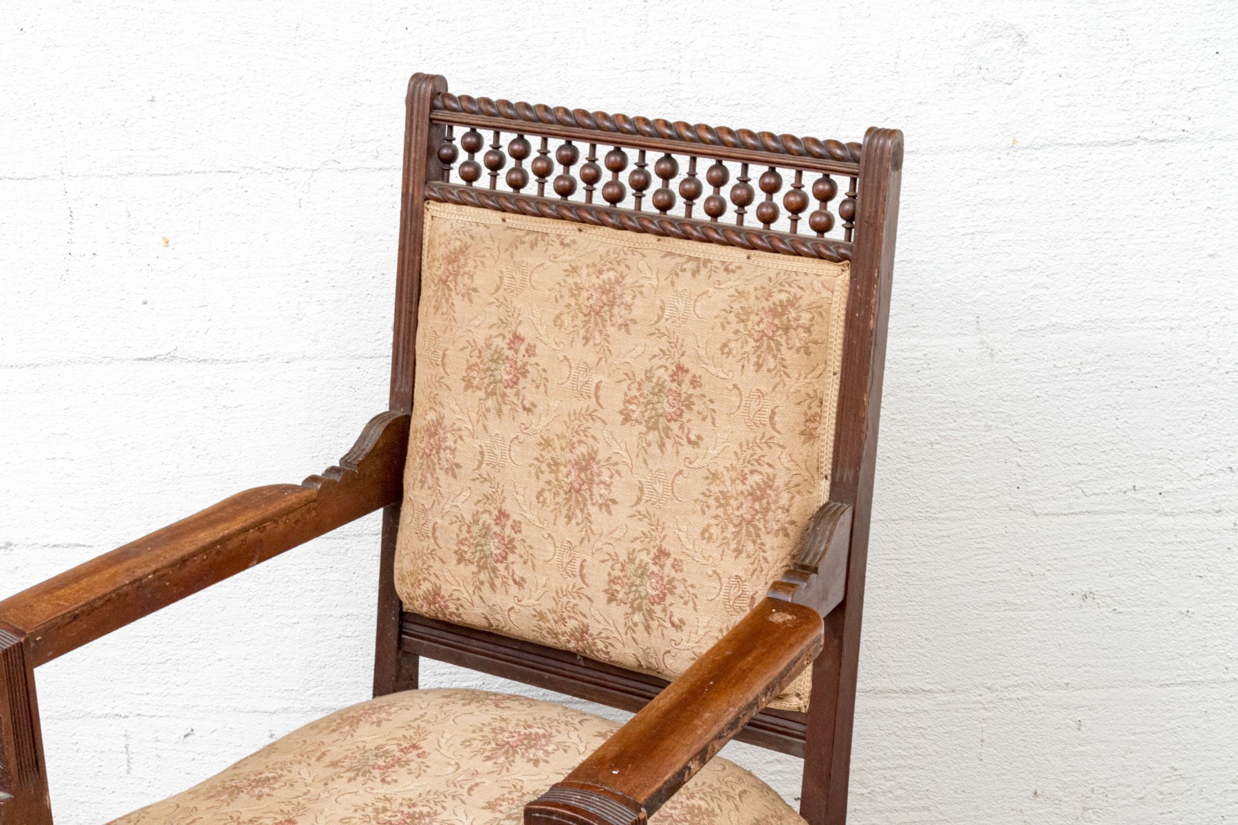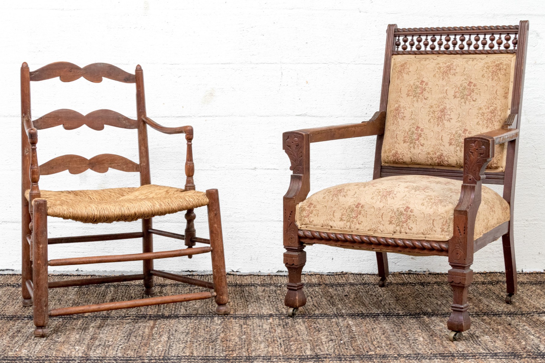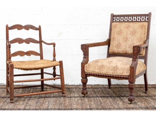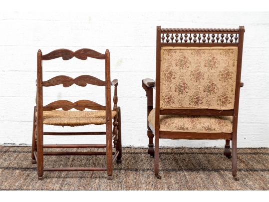 A delightful duo of nicely aged armchairs. The first features an attractive French colonial ladderback design, with three rows of wing-like splats heralding gently curved arms that flank a rust seat. The second armchair exudes Eastlake and Gothic Victorian elegance, sporting a unique openwork bauble design along the top rail flanked by rope twist borders. The back and seat are nicely upholstered in beige with dainty foliate sprays. The arm supports are beautifully detailed with florals and foliage, leading to shapely carved legs over caster feet.