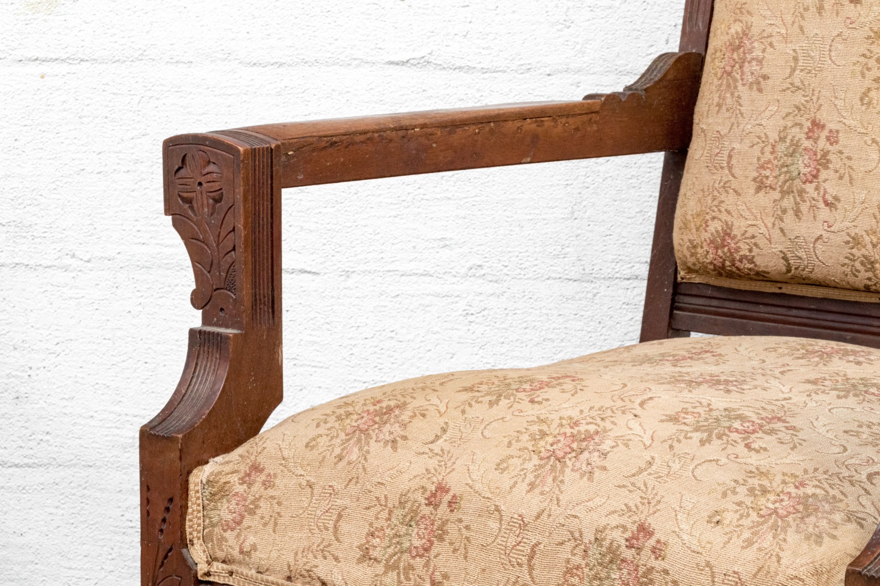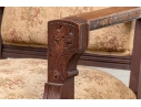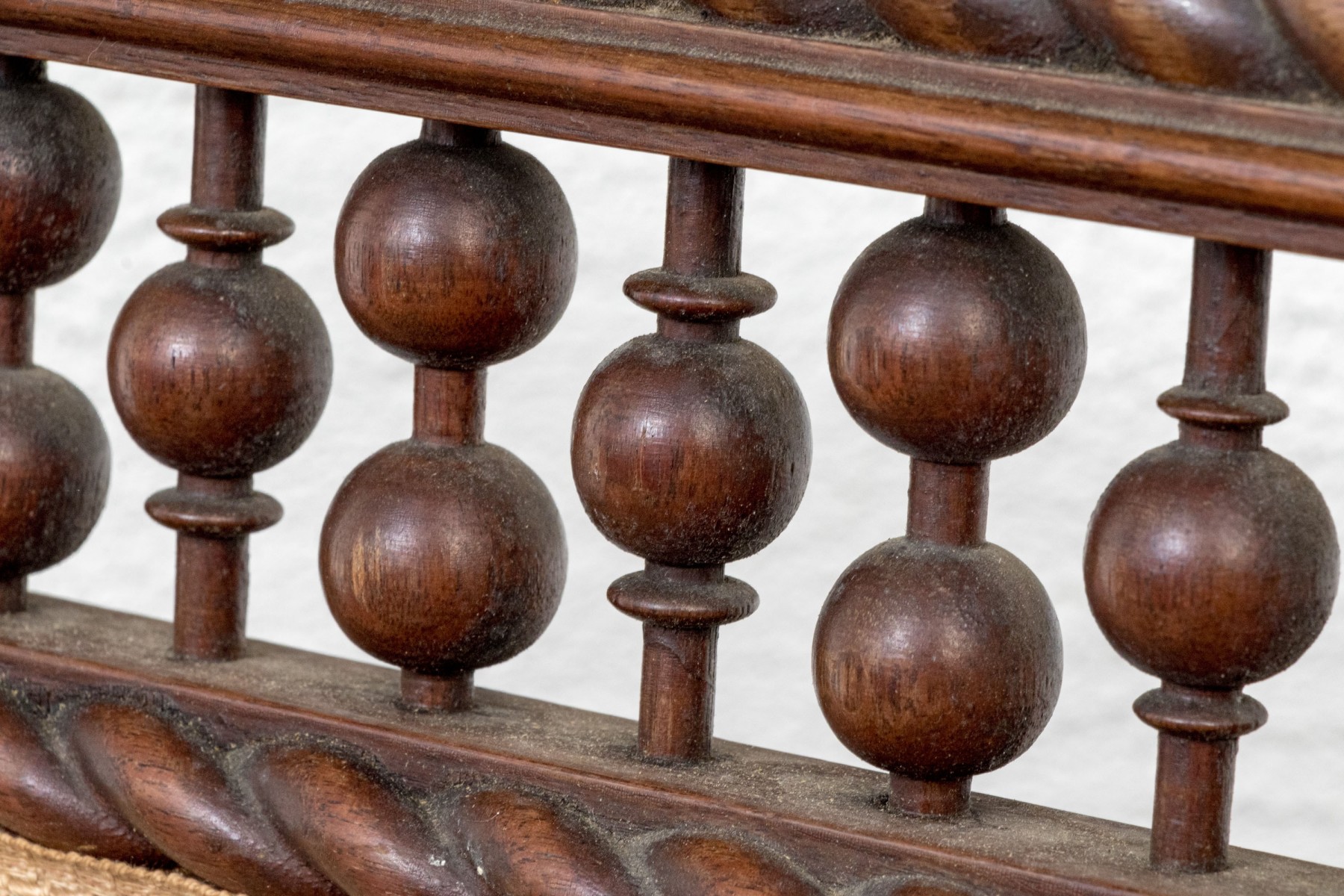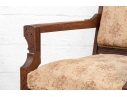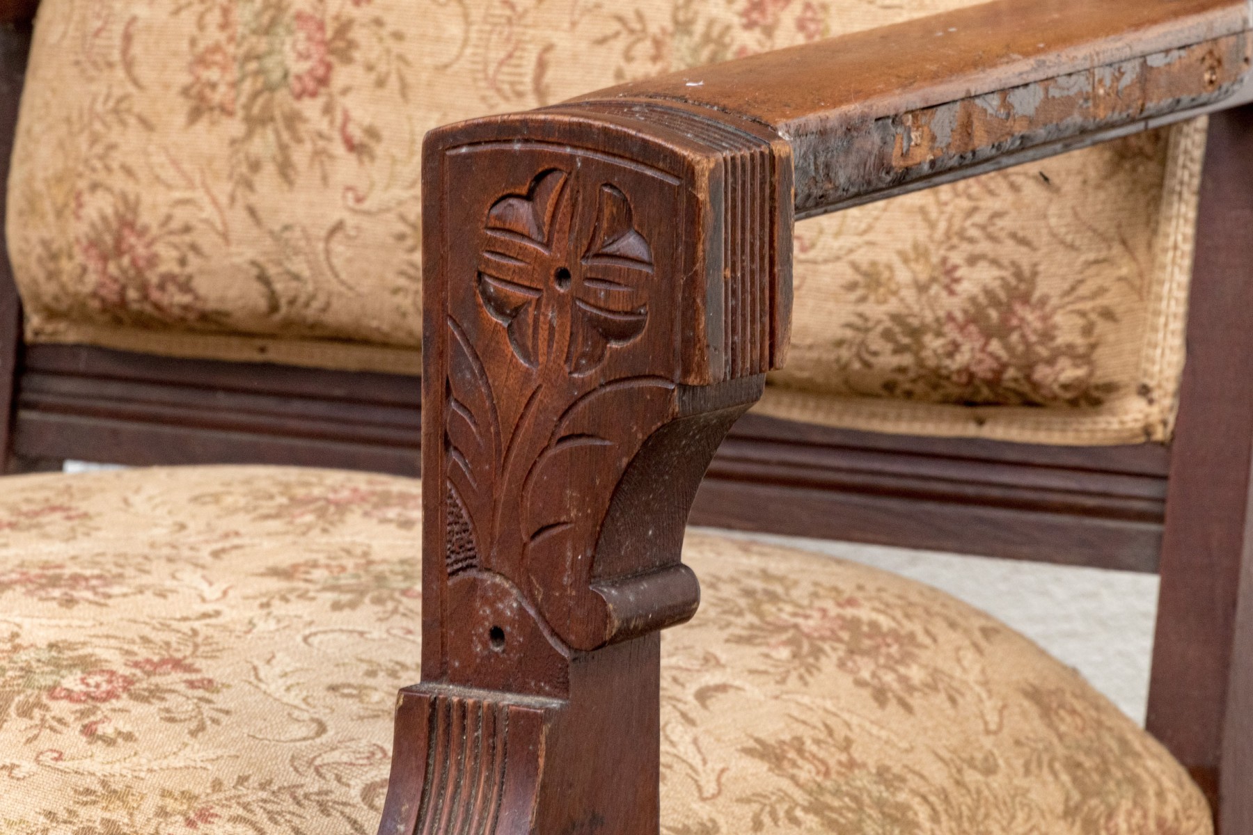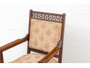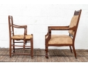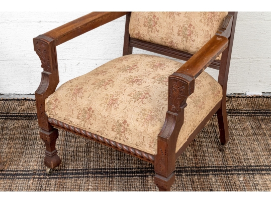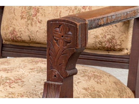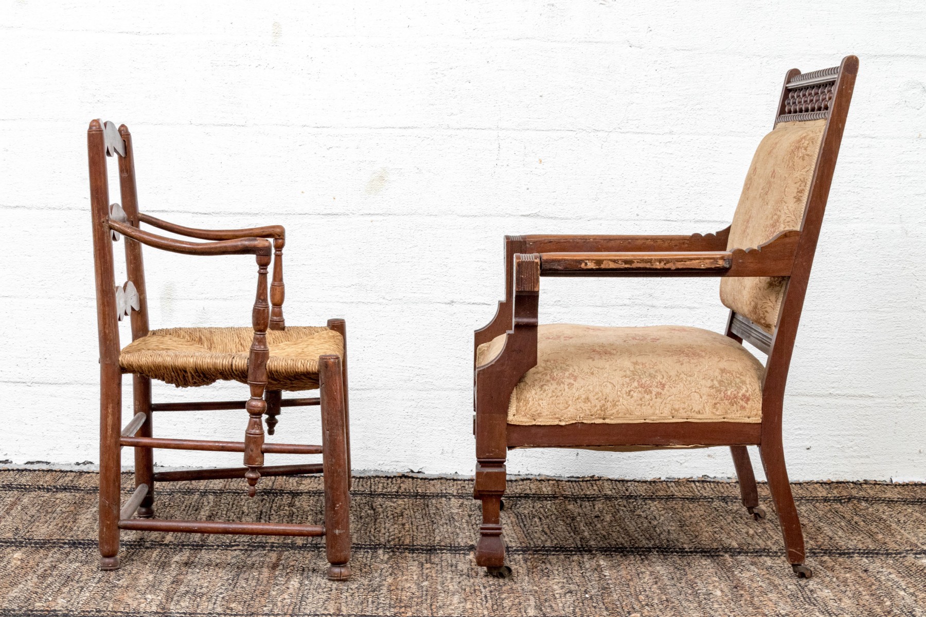 A delightful duo of nicely aged armchairs. The first features an attractive French colonial ladderback design, with three rows of wing-like splats heralding gently curved arms that flank a rust seat. The second armchair exudes Eastlake and Gothic Victorian elegance, sporting a unique openwork bauble design along the top rail flanked by rope twist borders. The back and seat are nicely upholstered in beige with dainty foliate sprays. The arm supports are beautifully detailed with florals and foliage, leading to shapely carved legs over caster feet.