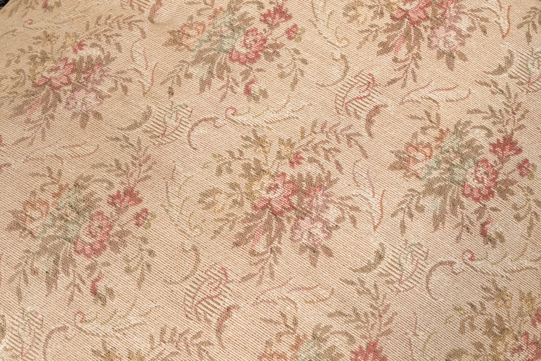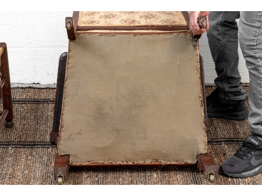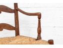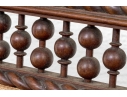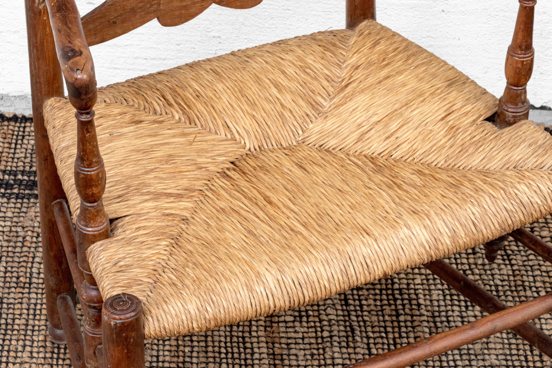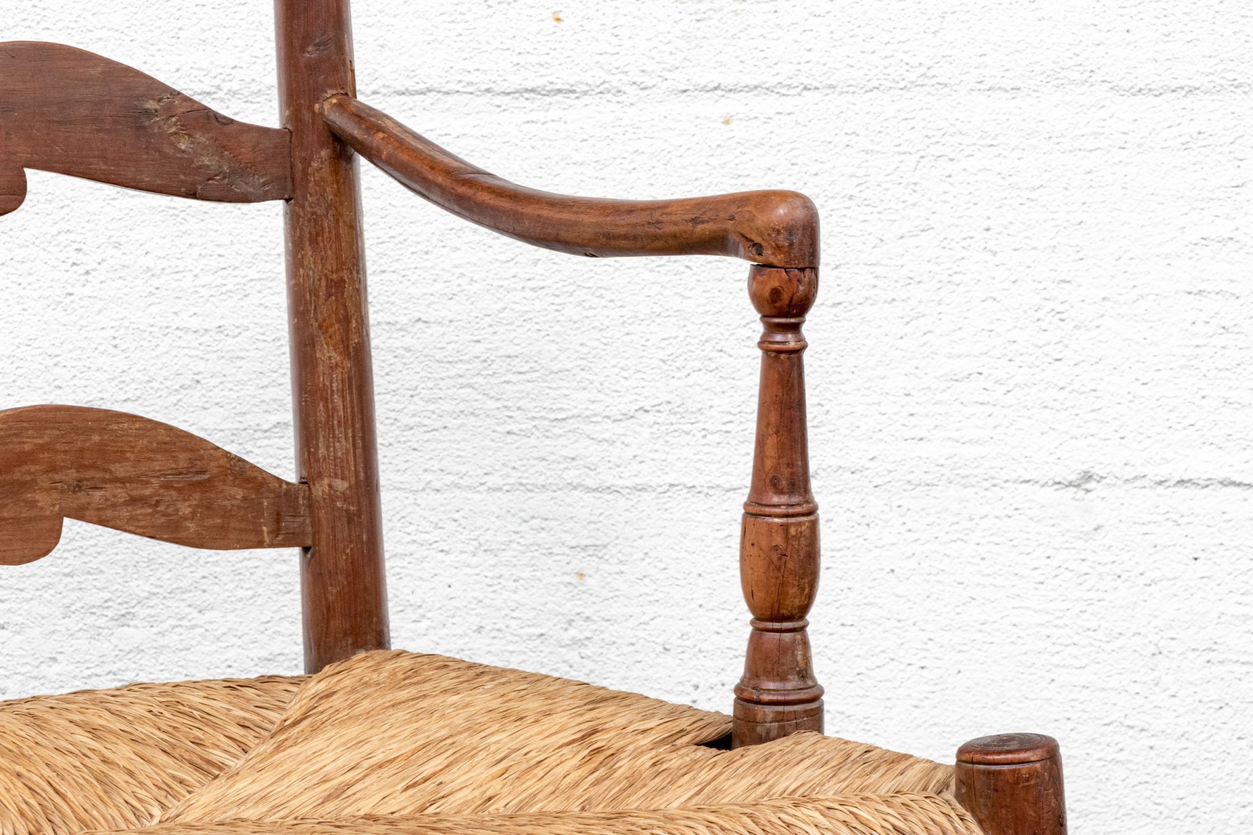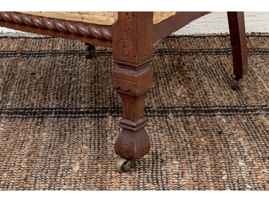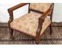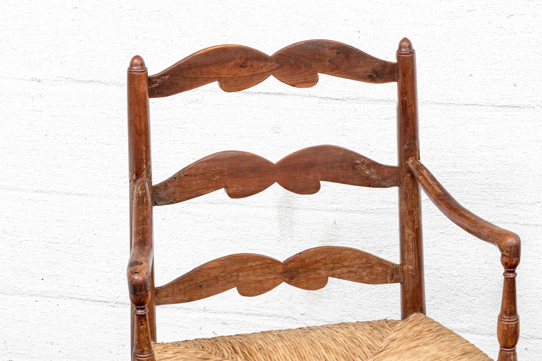 A delightful duo of nicely aged armchairs. The first features an attractive French colonial ladderback design, with three rows of wing-like splats heralding gently curved arms that flank a rust seat. The second armchair exudes Eastlake and Gothic Victorian elegance, sporting a unique openwork bauble design along the top rail flanked by rope twist borders. The back and seat are nicely upholstered in beige with dainty foliate sprays. The arm supports are beautifully detailed with florals and foliage, leading to shapely carved legs over caster feet.