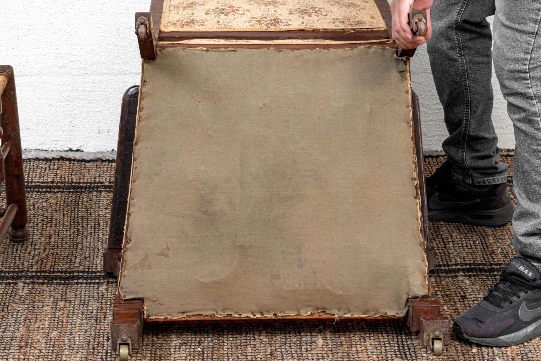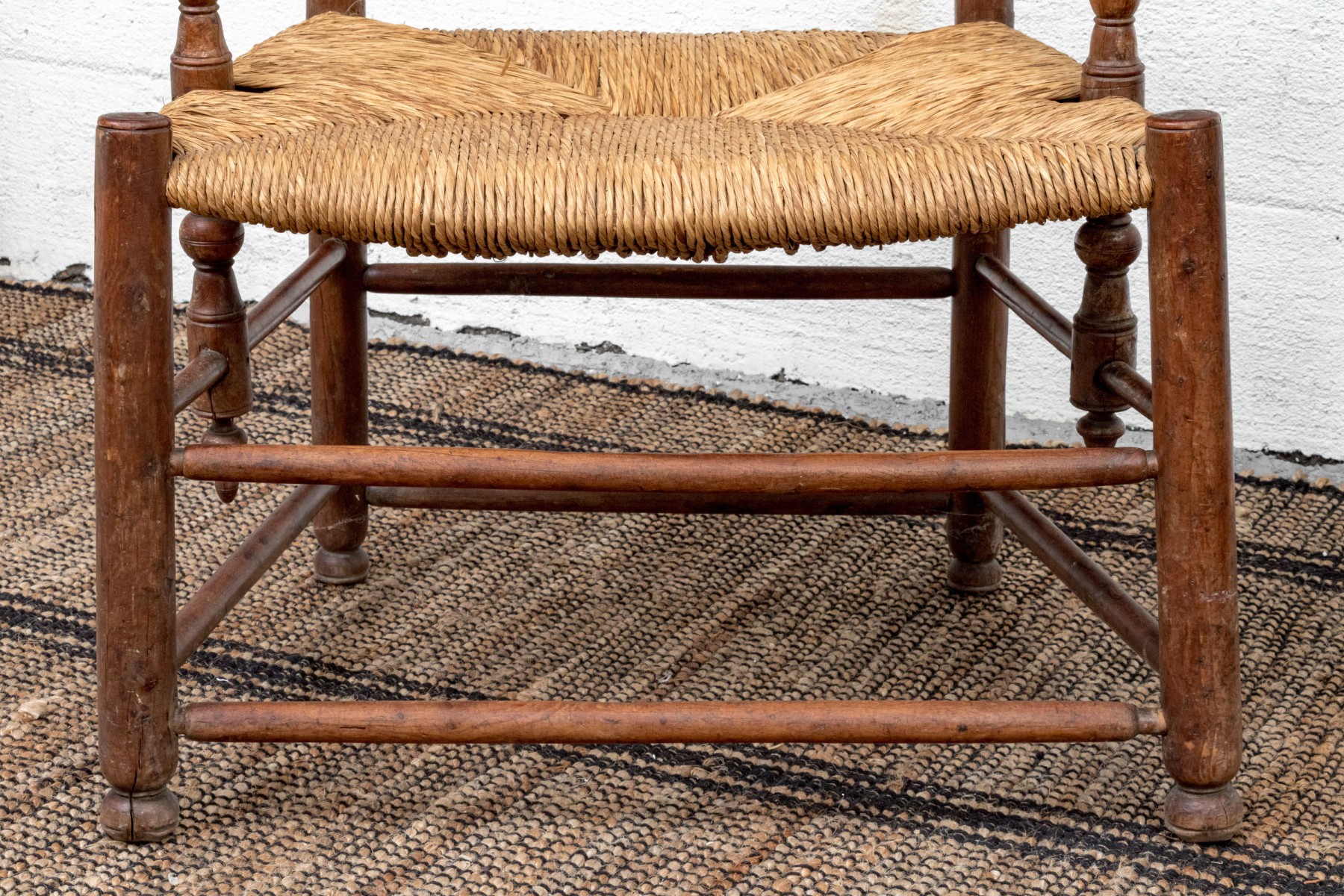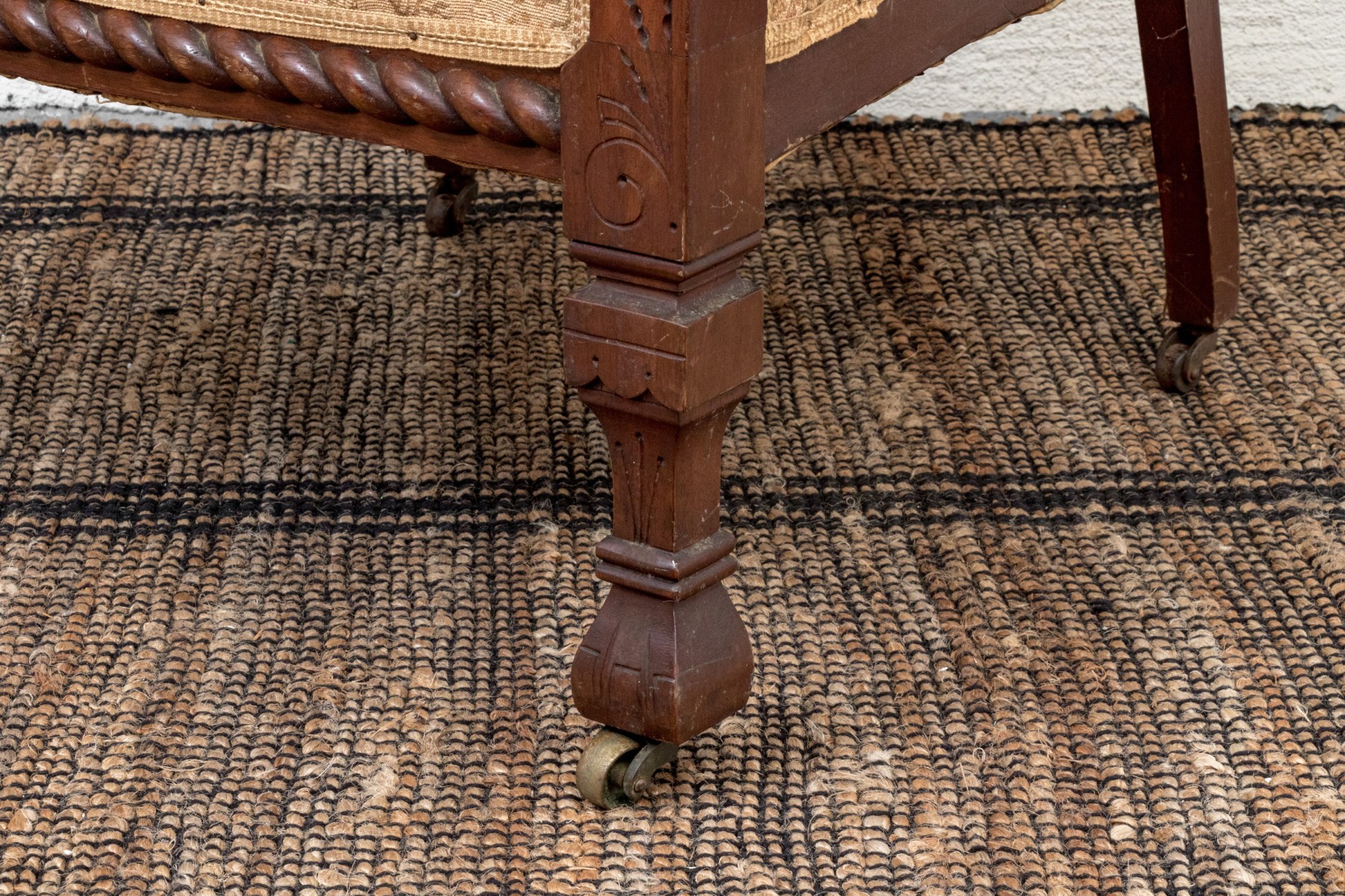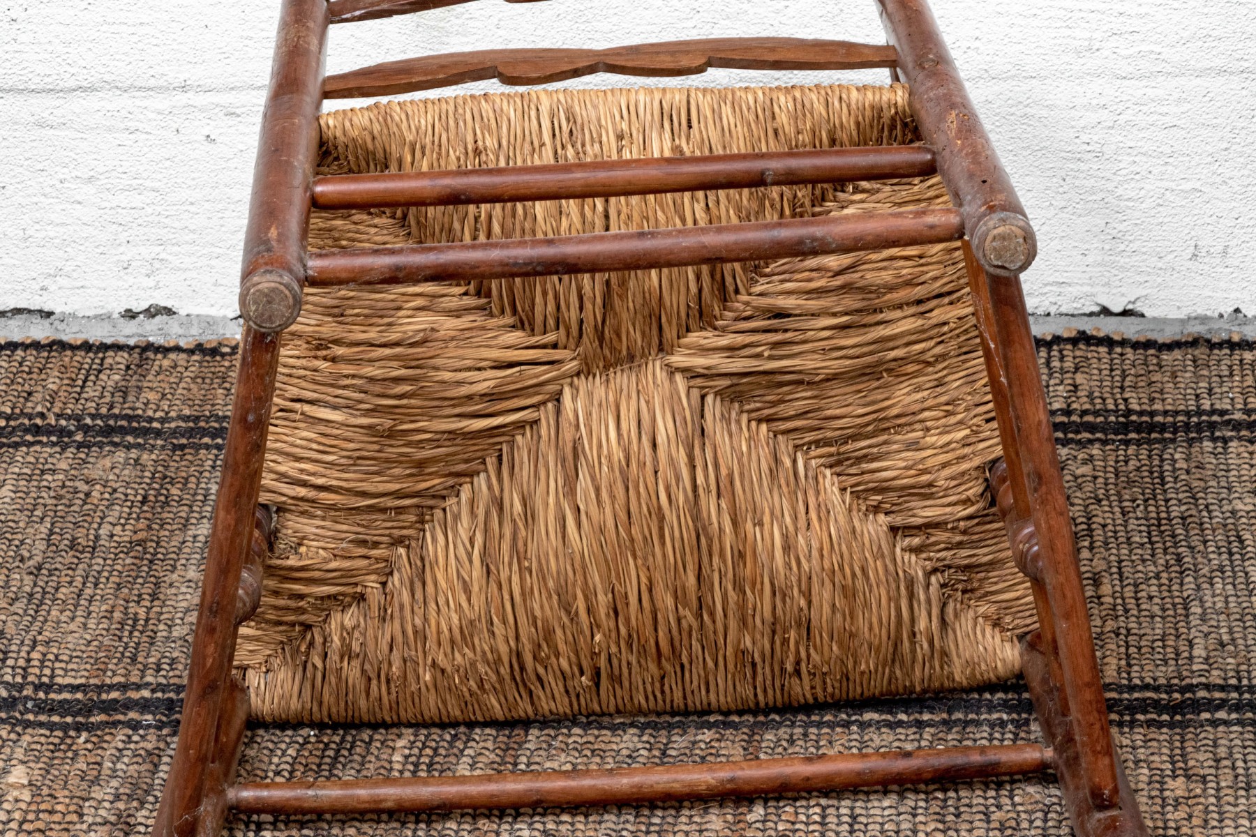 A delightful duo of nicely aged armchairs. The first features an attractive French colonial ladderback design, with three rows of wing-like splats heralding gently curved arms that flank a rust seat. The second armchair exudes Eastlake and Gothic Victorian elegance, sporting a unique openwork bauble design along the top rail flanked by rope twist borders. The back and seat are nicely upholstered in beige with dainty foliate sprays. The arm supports are beautifully detailed with florals and foliage, leading to shapely carved legs over caster feet.