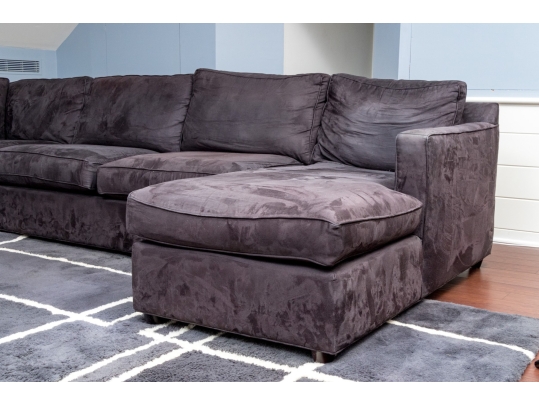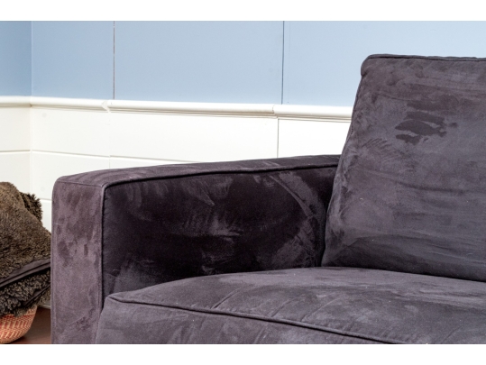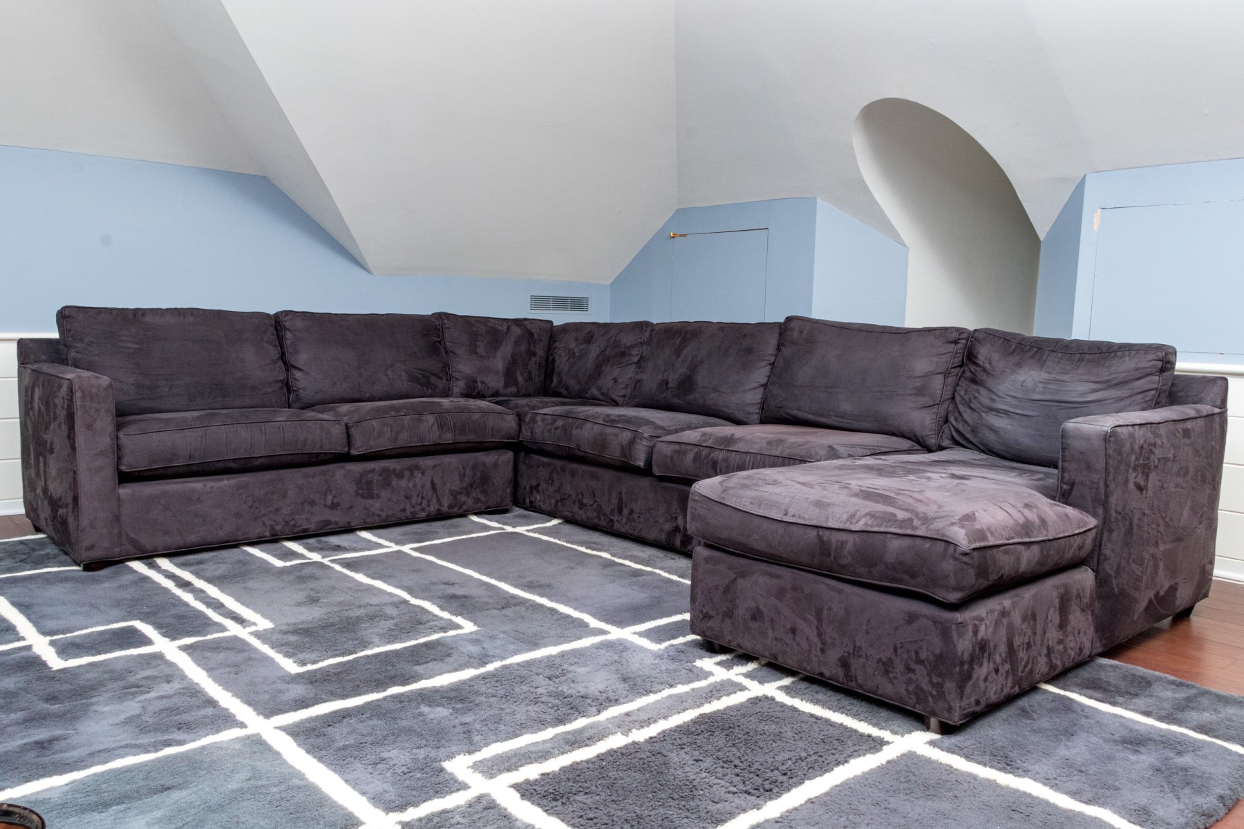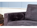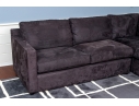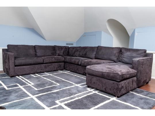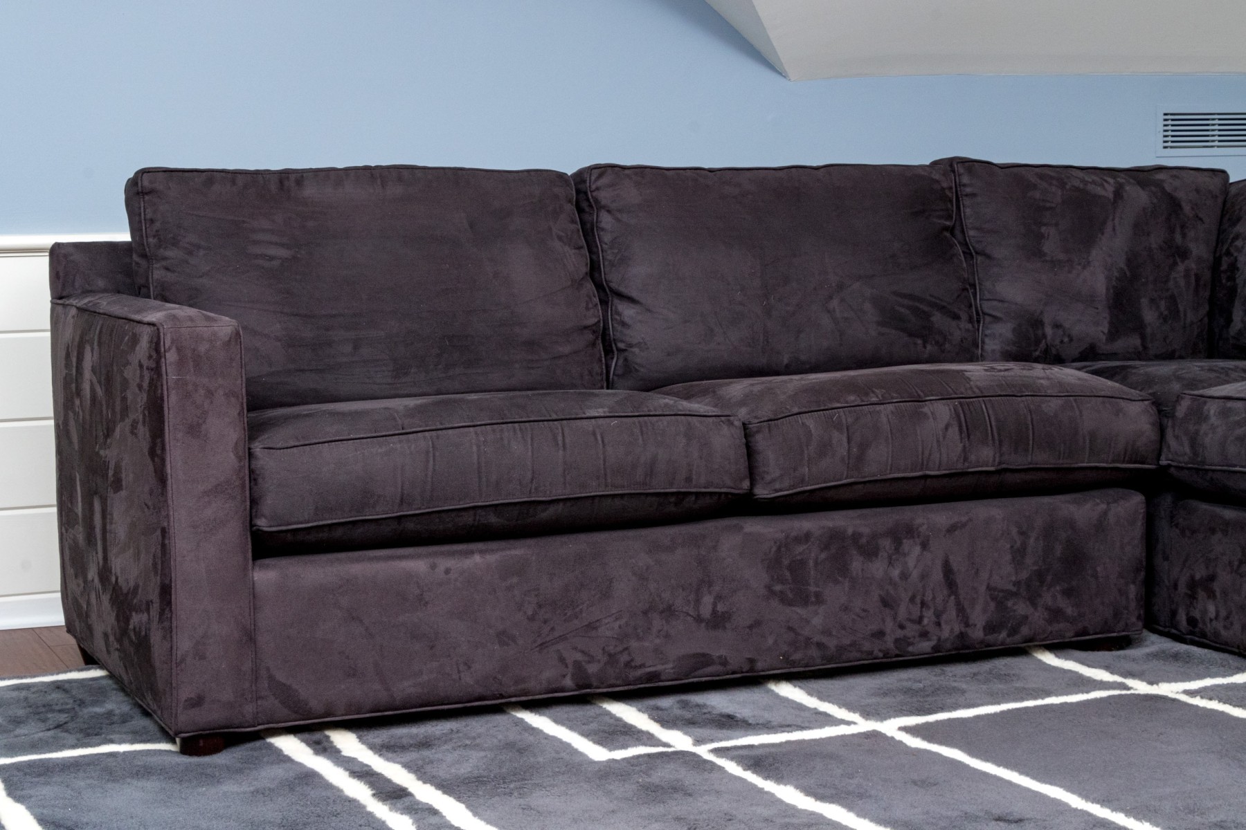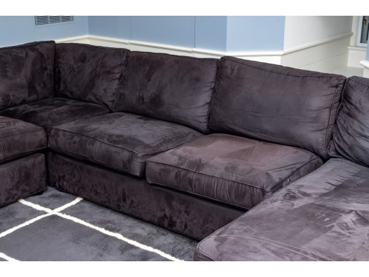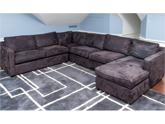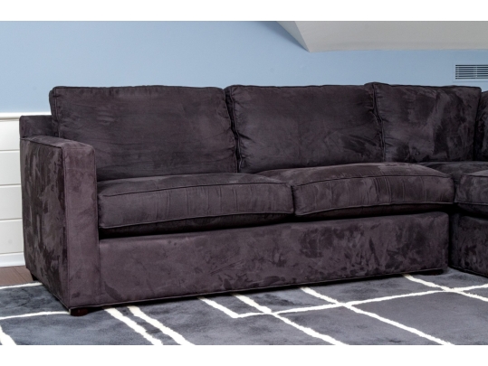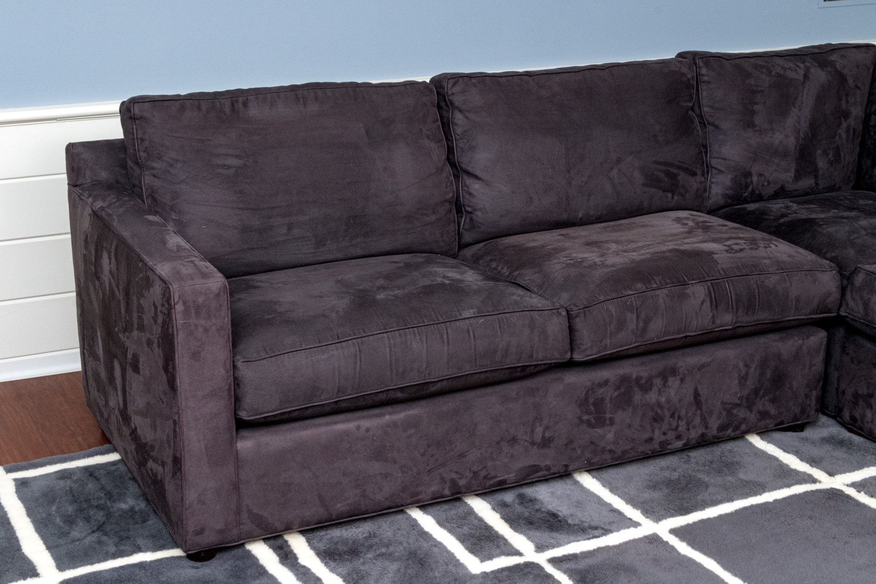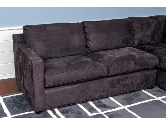 Crate & Barrel Troy sectional sofa in Diplomat Ebony black microsuede upholstery with a rich purple undertone. Features a four-piece arrangement including a single arm sleeper loveseat, corner, armless settee, and single arm chaise.