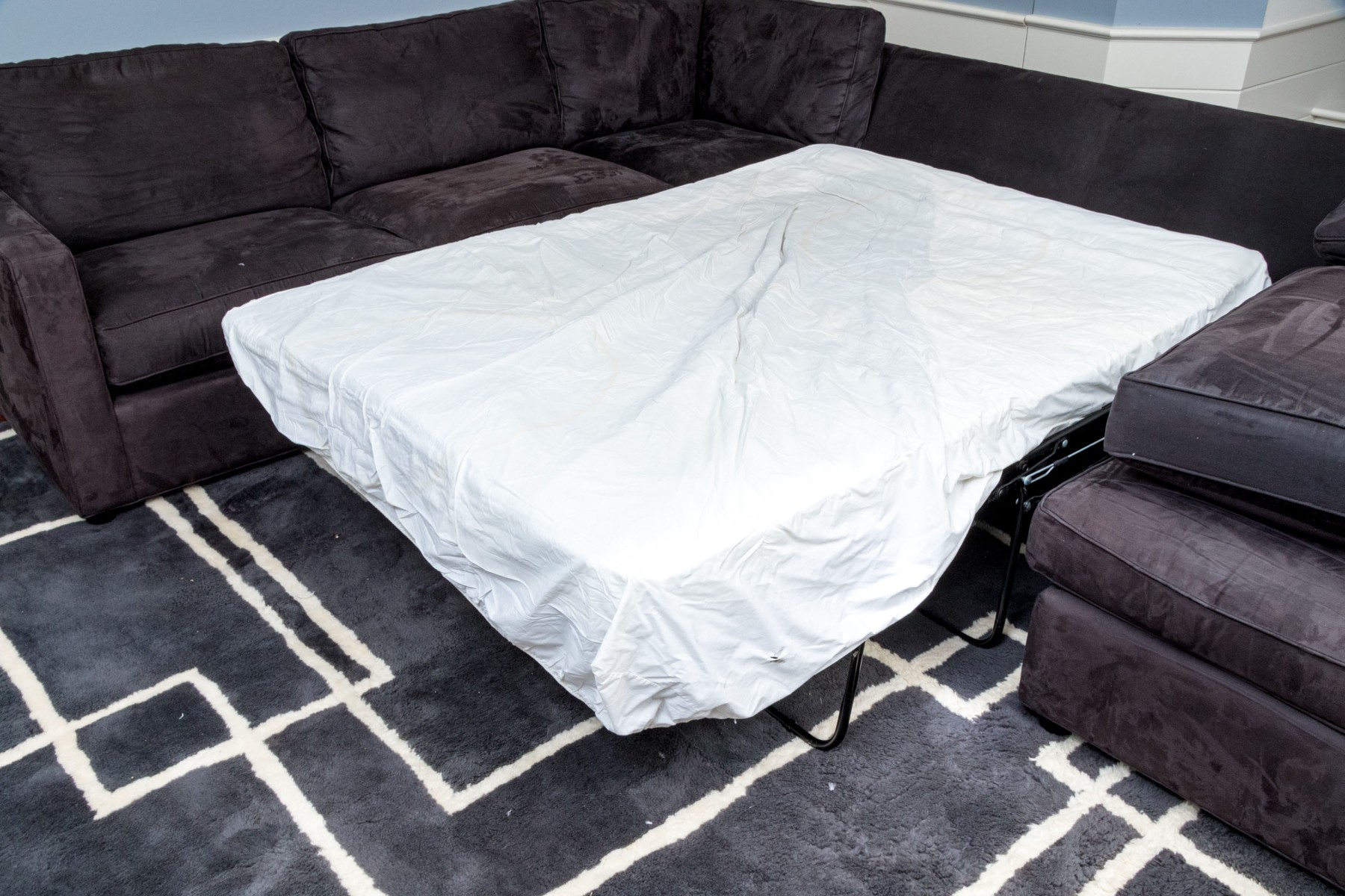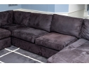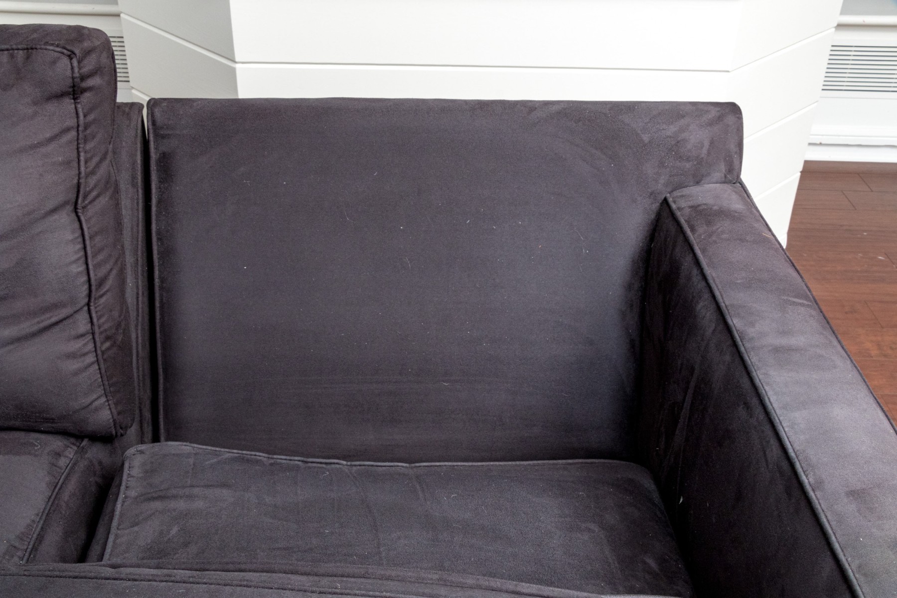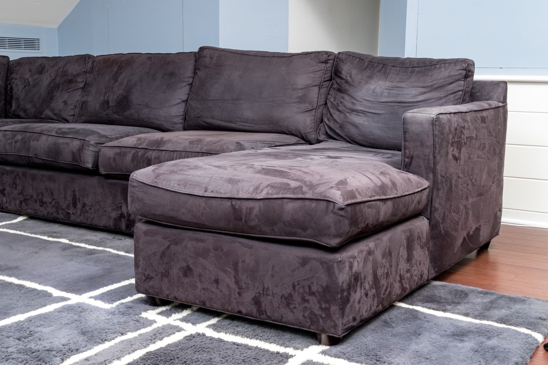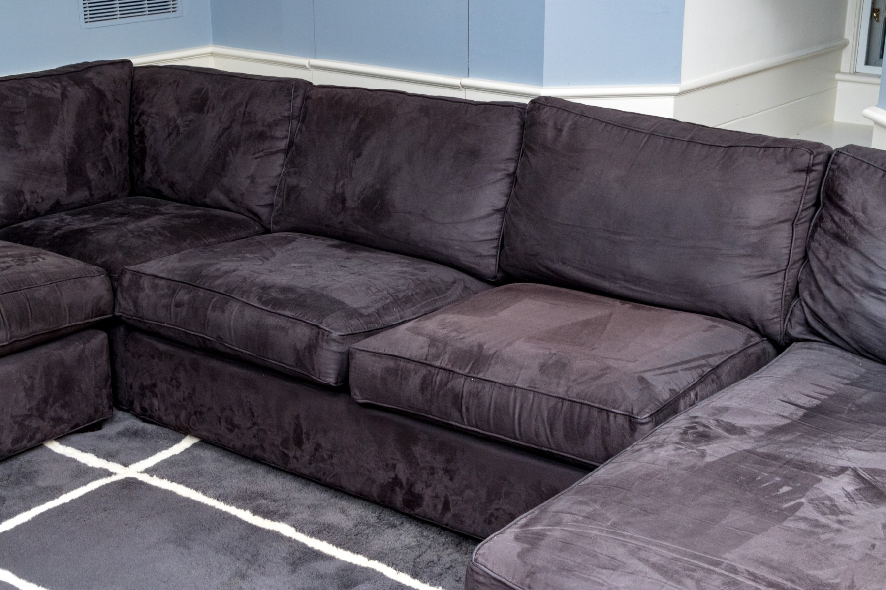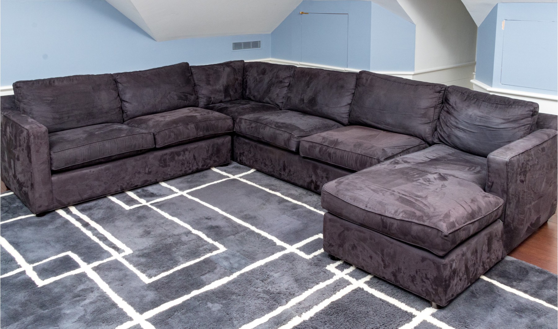 Crate & Barrel Troy sectional sofa in Diplomat Ebony black microsuede upholstery with a rich purple undertone. Features a four-piece arrangement including a single arm sleeper loveseat, corner, armless settee, and single arm chaise.