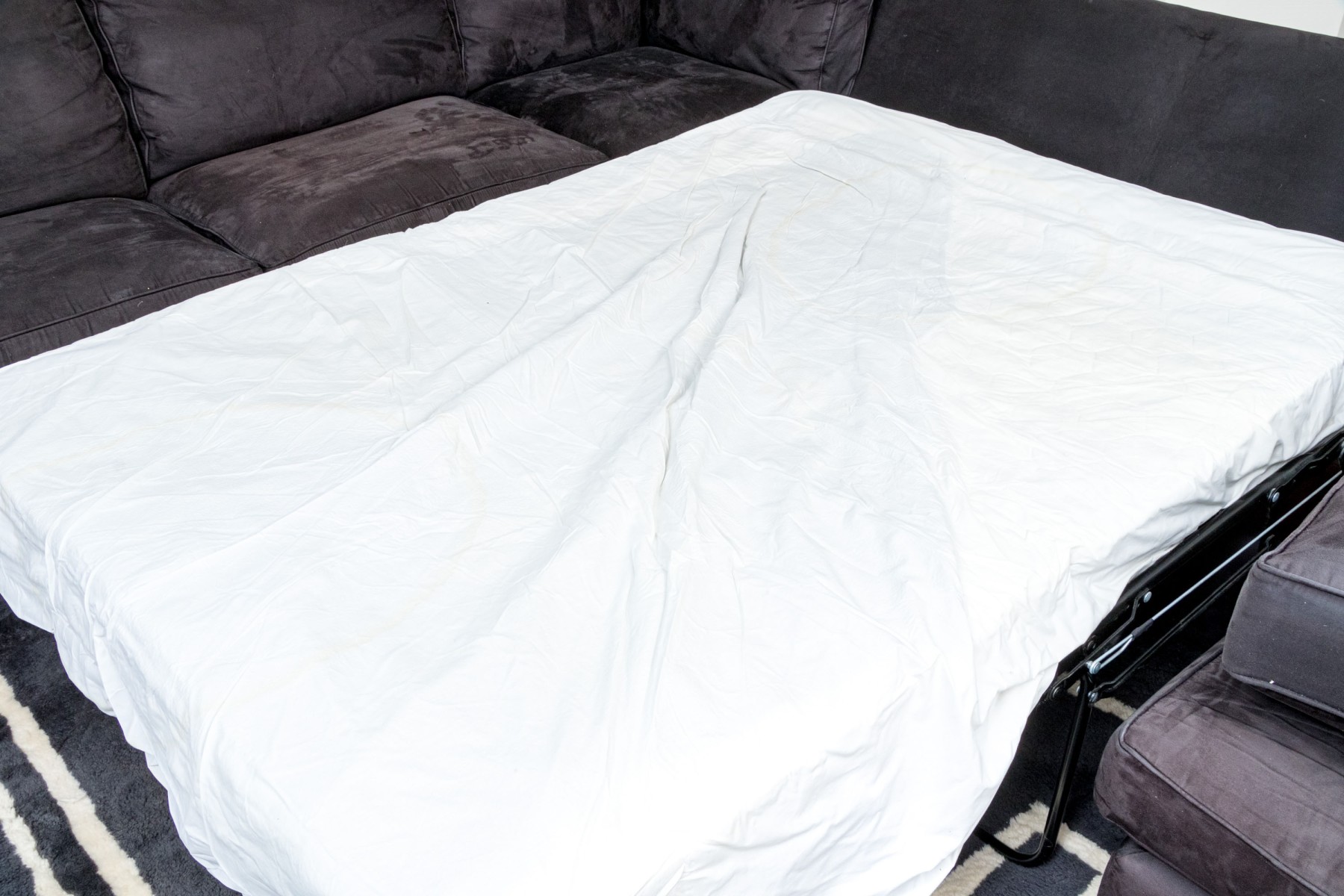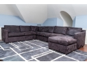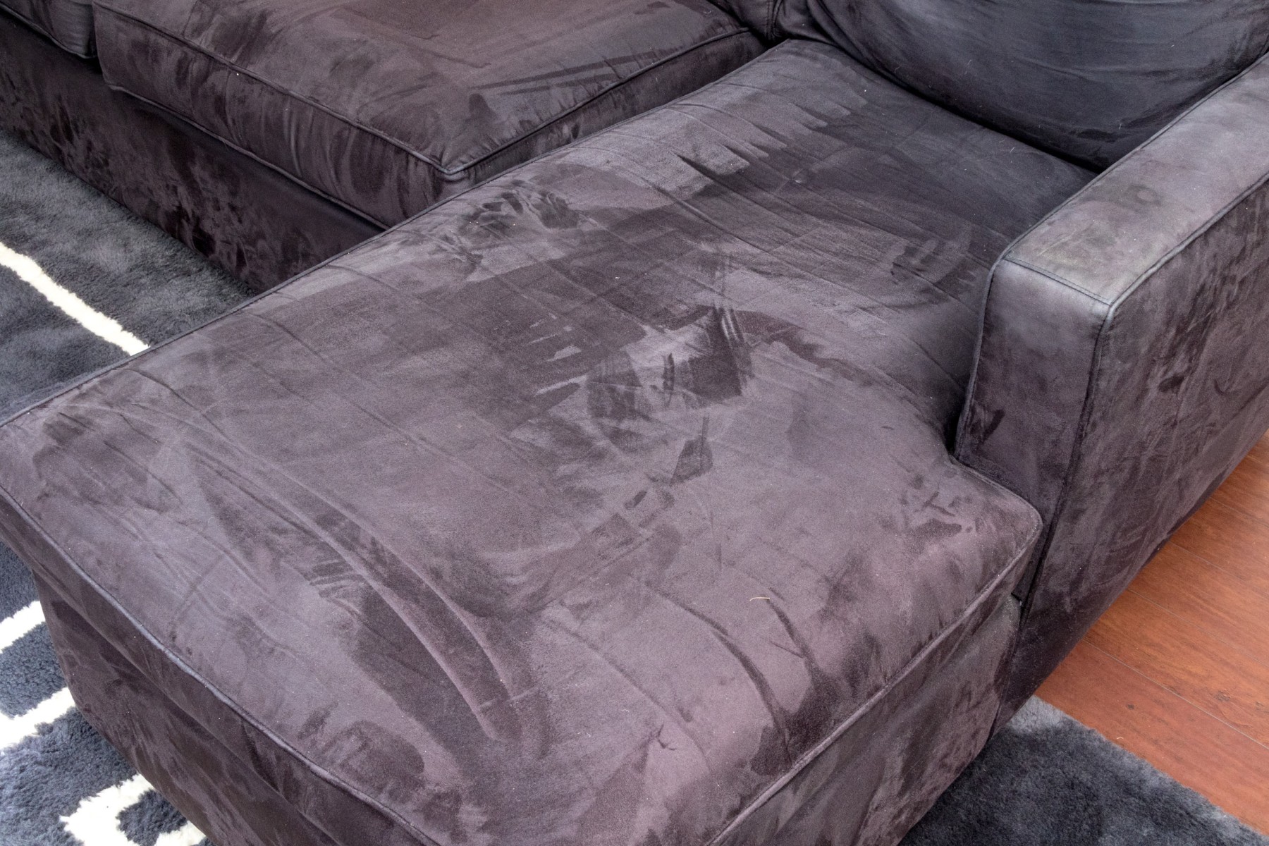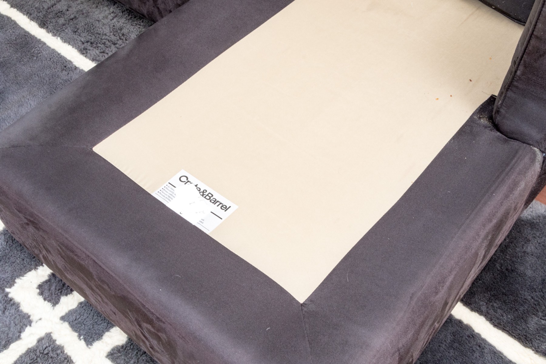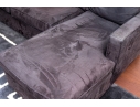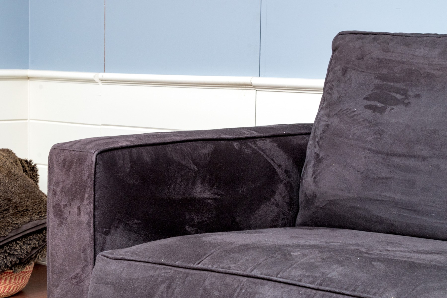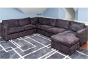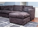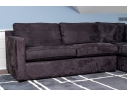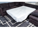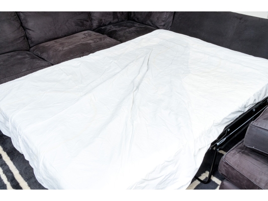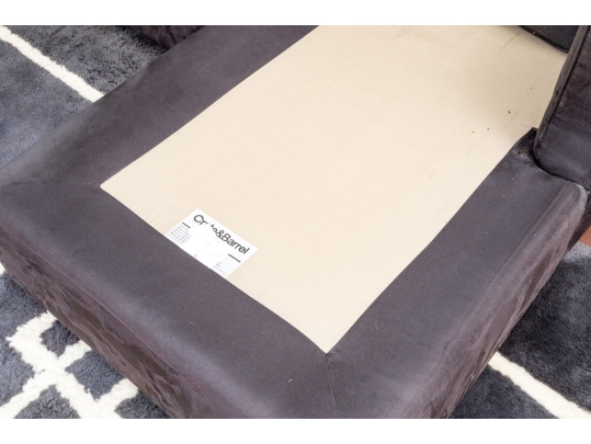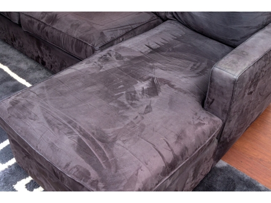 Crate & Barrel Troy sectional sofa in Diplomat Ebony black microsuede upholstery with a rich purple undertone. Features a four-piece arrangement including a single arm sleeper loveseat, corner, armless settee, and single arm chaise.