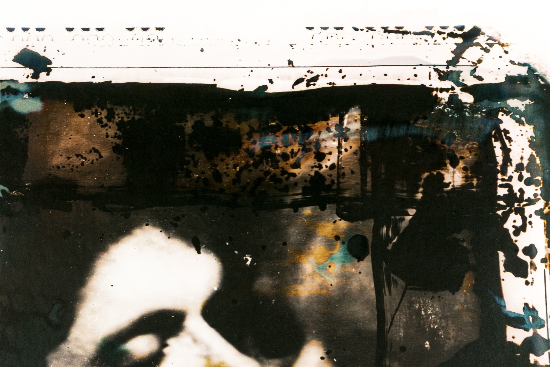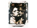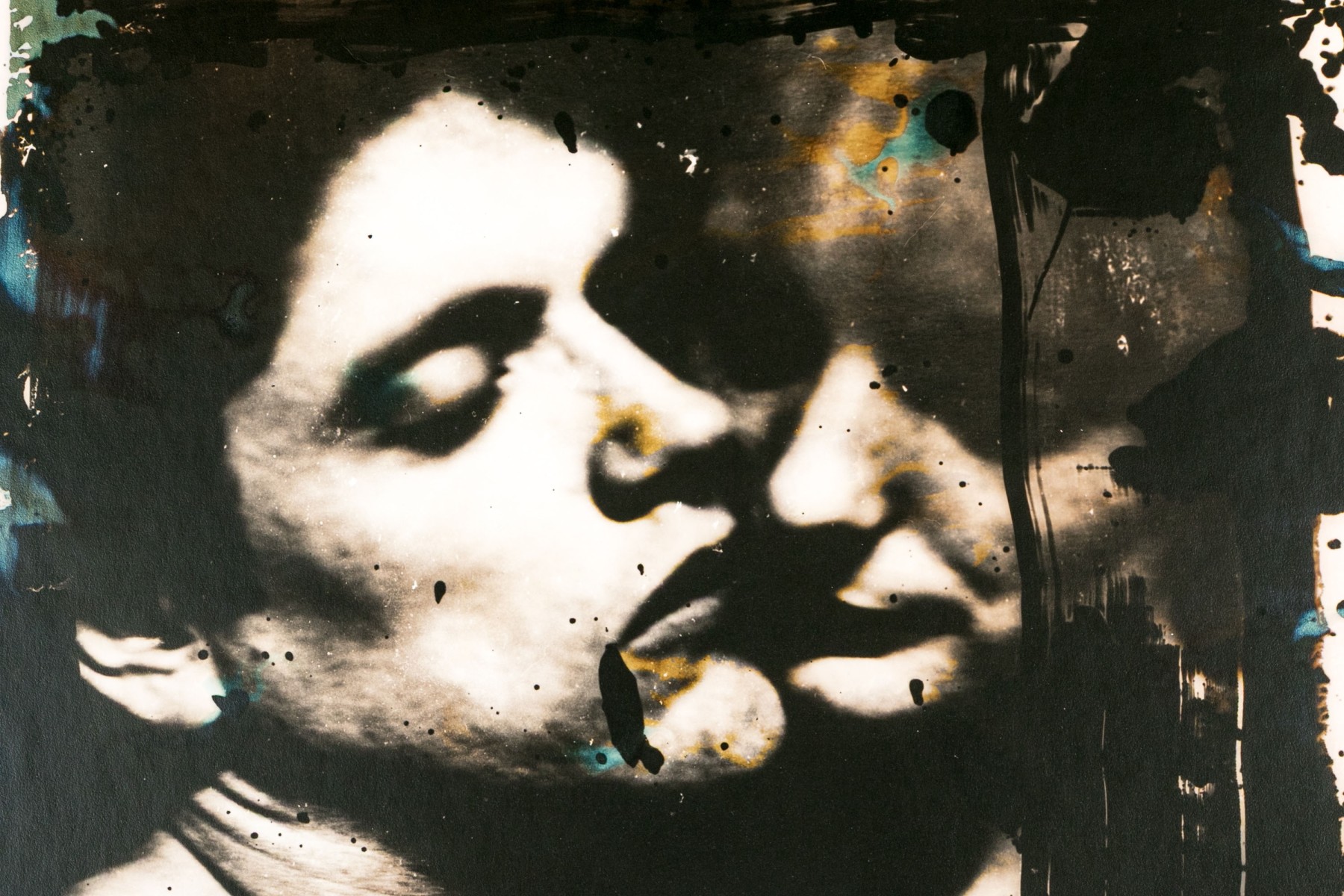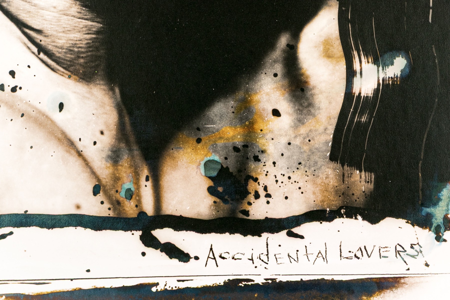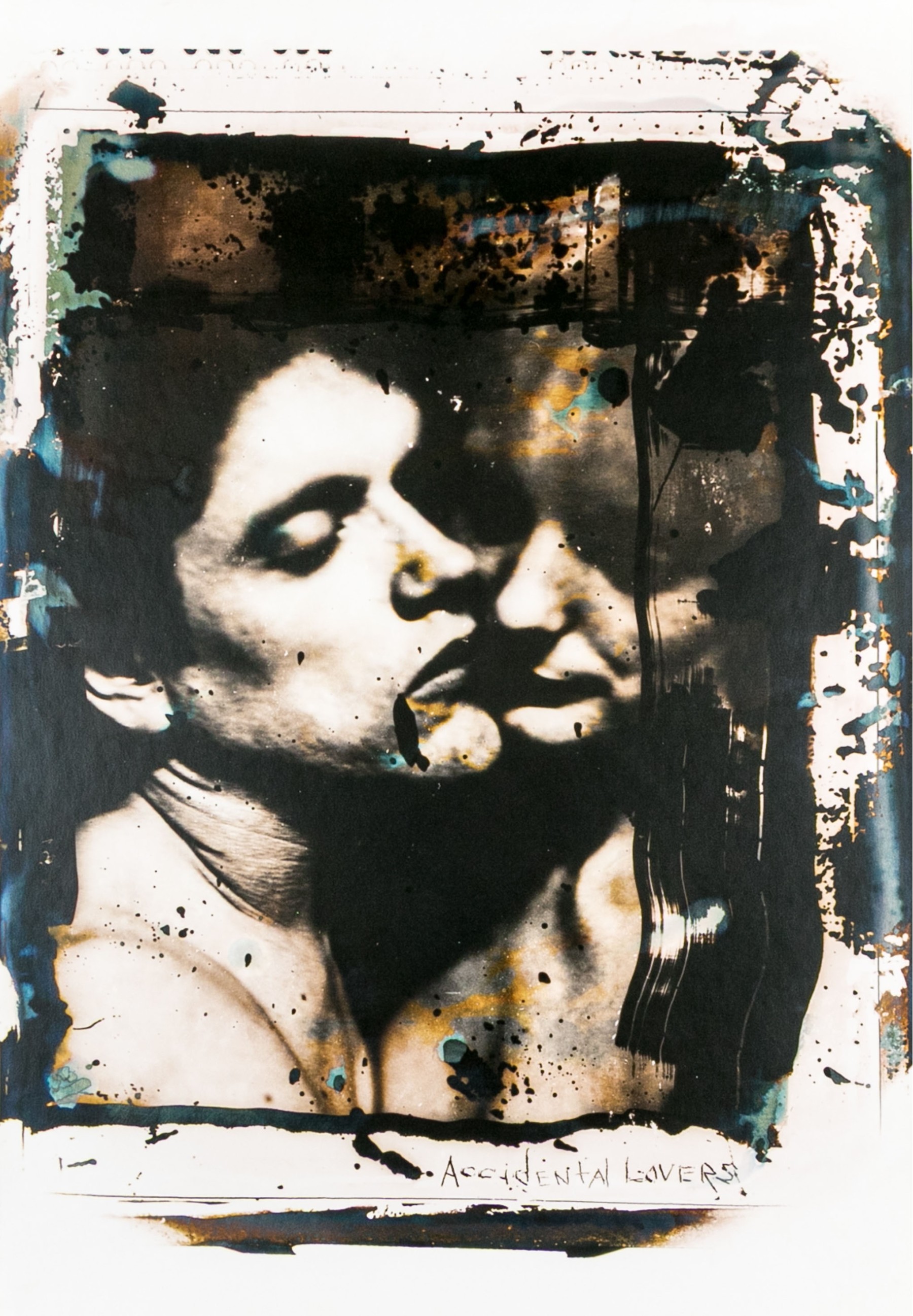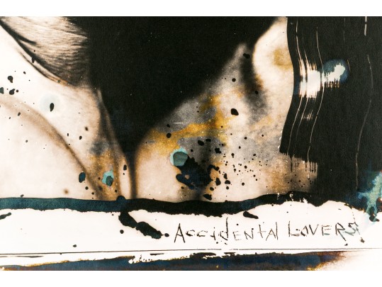 David Seltzer (American, B. 1947) "Accidental Lovers" large gelatin silver print depicting a man and a woman posed together as though close for a kiss, rendered in sepia tone with grungy brush strokes in black, green, and blue. Signed on the verso. Unframed.