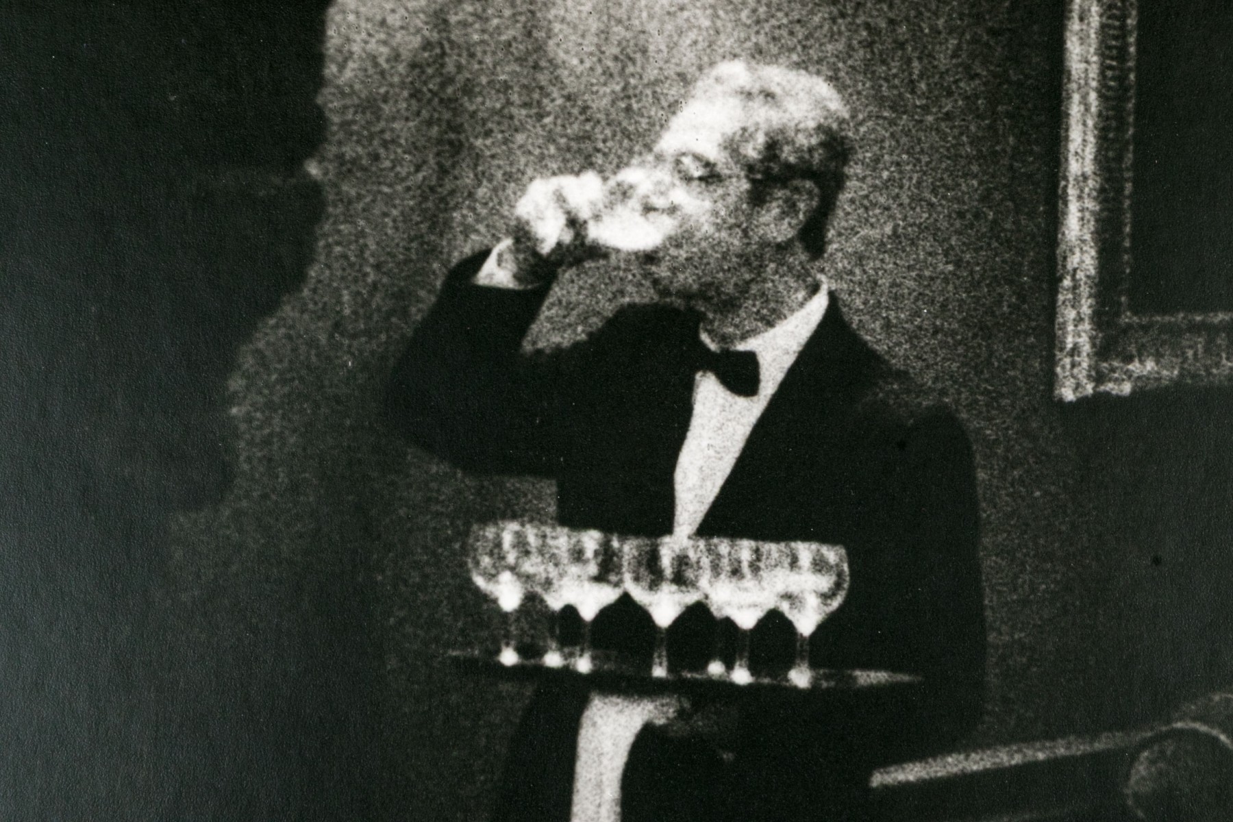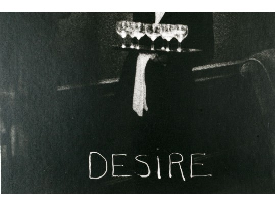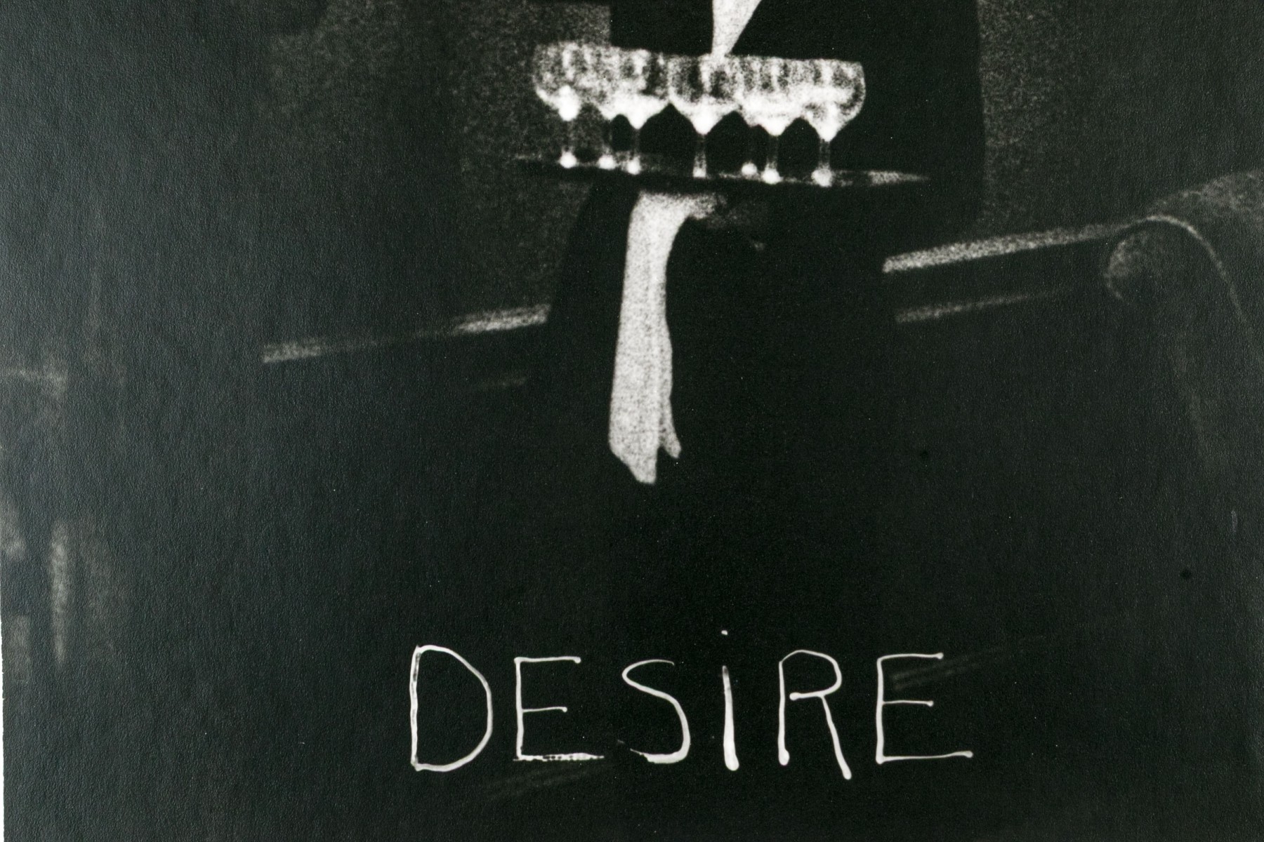 David Seltzer (American, B. 1947) "Desire" large gelatin silver print from "Knowledge of the Raw" depicting a butler carrying a tray of drinks taking a drink for himself in an elegant, dark interior. Signed on the verso. Unframed.