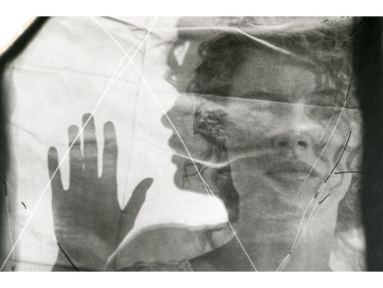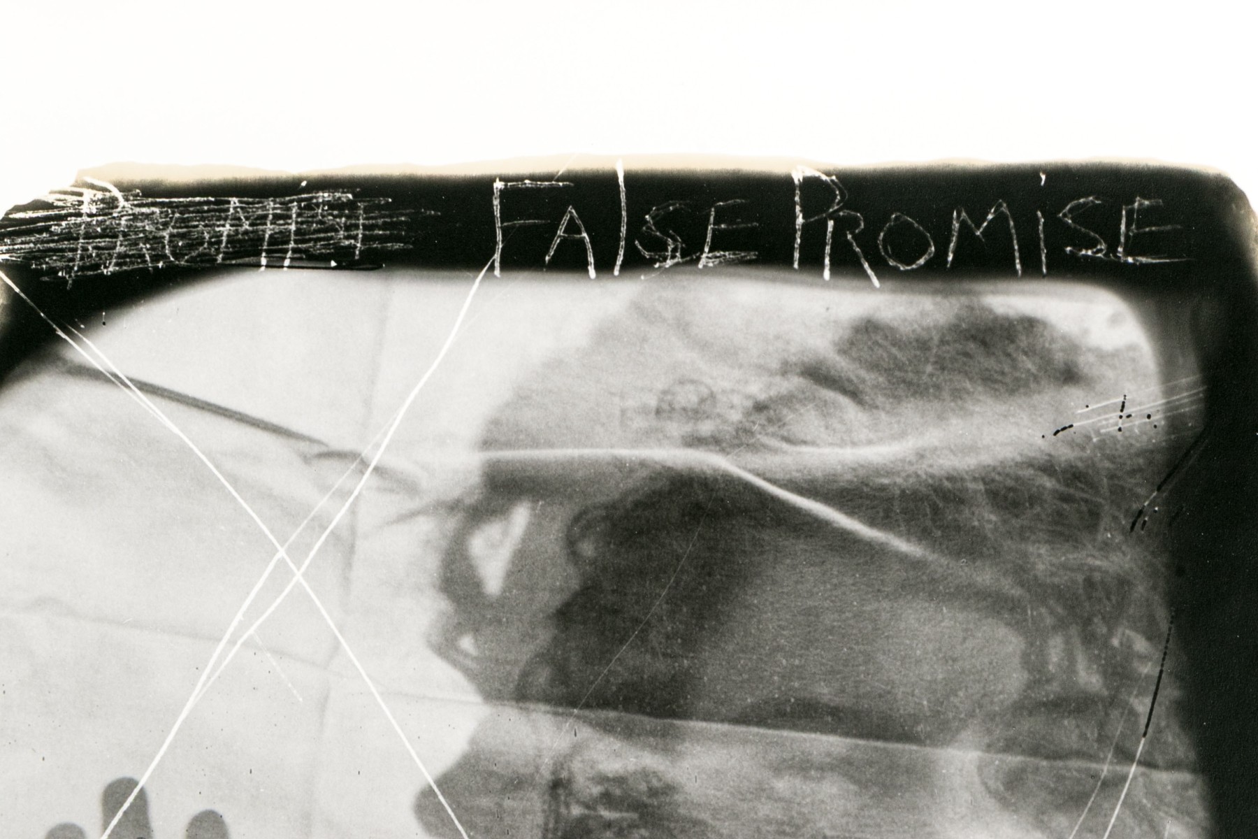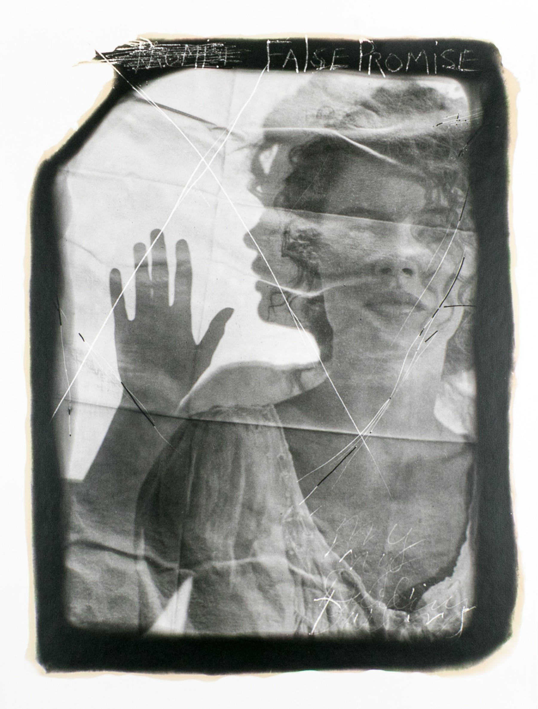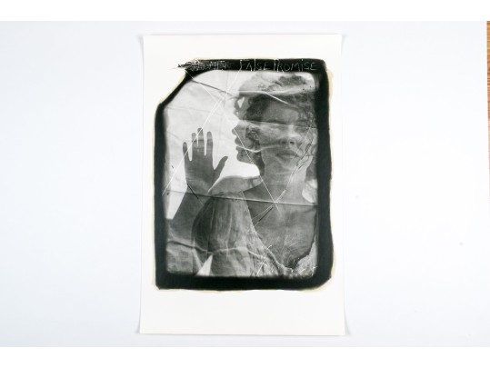 David Seltzer (American, B. 1947) "False Promise" large gelatin silver print depicting a woman with curly hair facing forward while her silhouette faces the left in profile with hand raised as though whispering. The imagery is designed with the appearance of once being crumpled and overlaid by white scratched handwriting with dark edges as if burned. Pencil signed on the verso. Unframed.