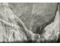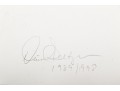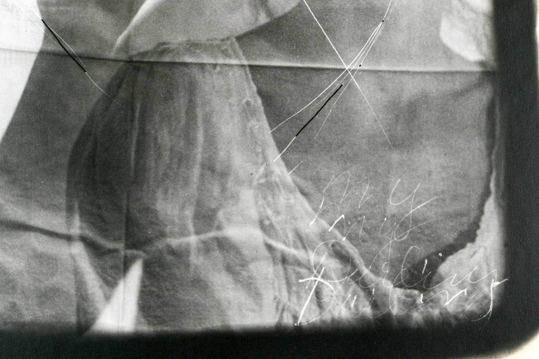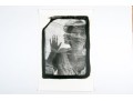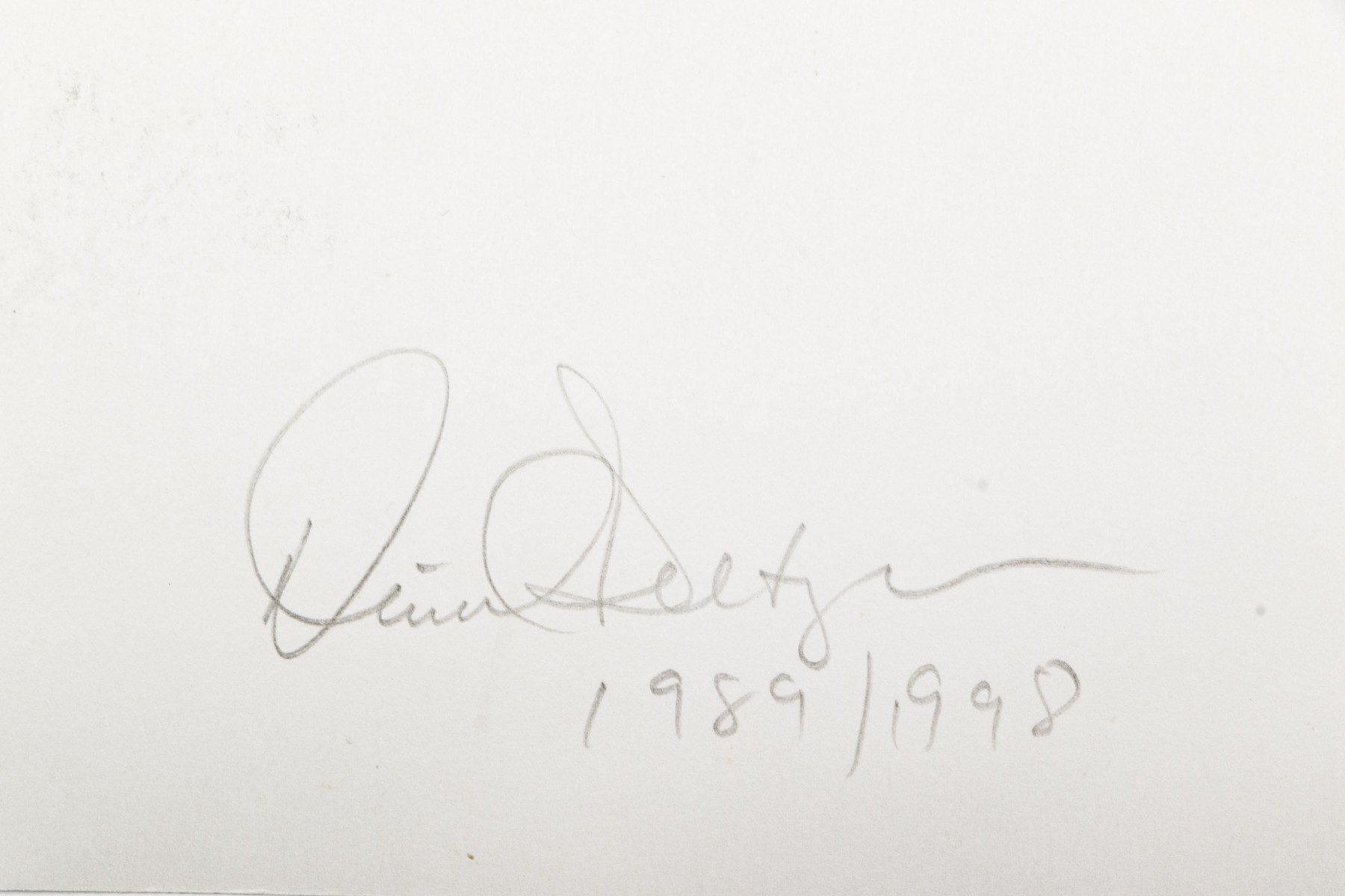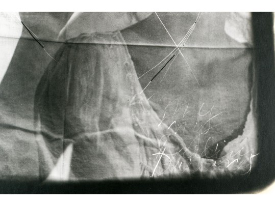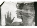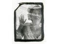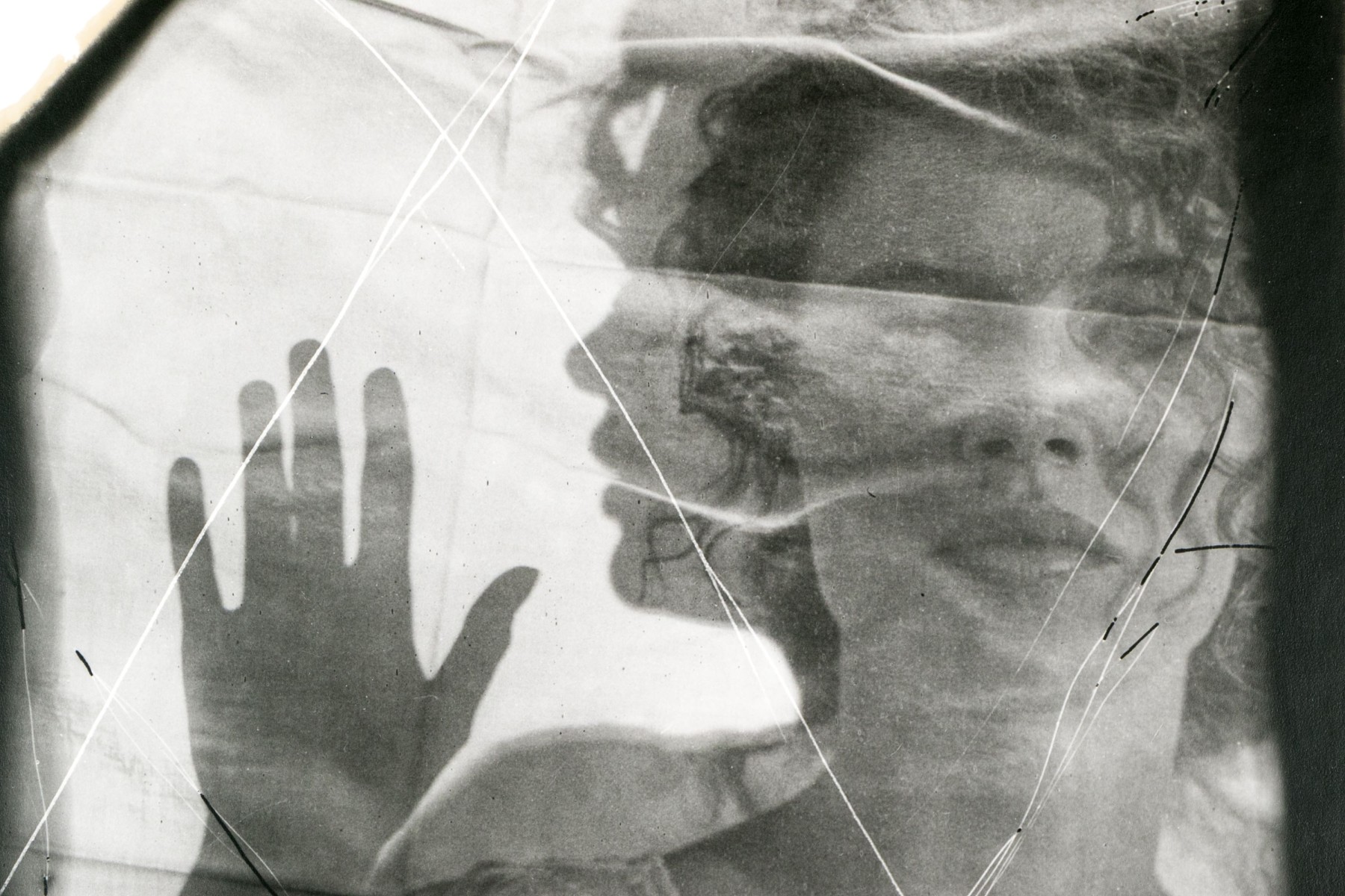 David Seltzer (American, B. 1947) "False Promise" large gelatin silver print depicting a woman with curly hair facing forward while her silhouette faces the left in profile with hand raised as though whispering. The imagery is designed with the appearance of once being crumpled and overlaid by white scratched handwriting with dark edges as if burned. Pencil signed on the verso. Unframed.