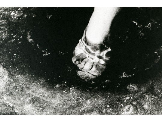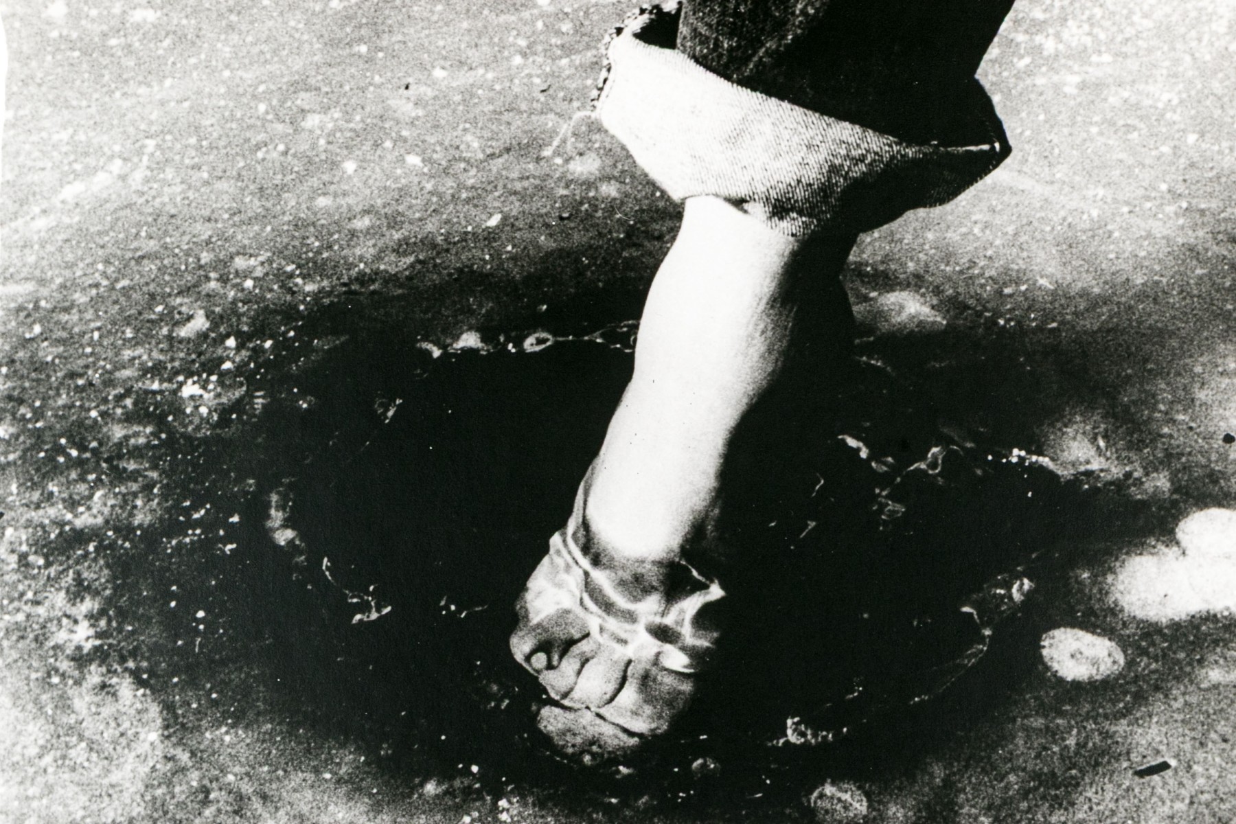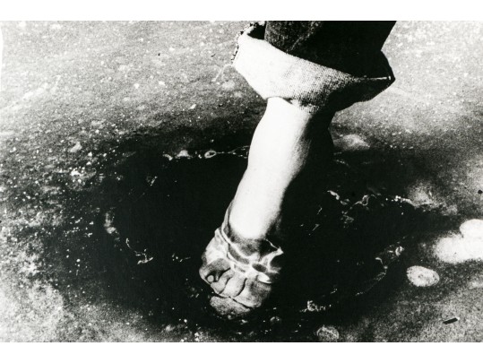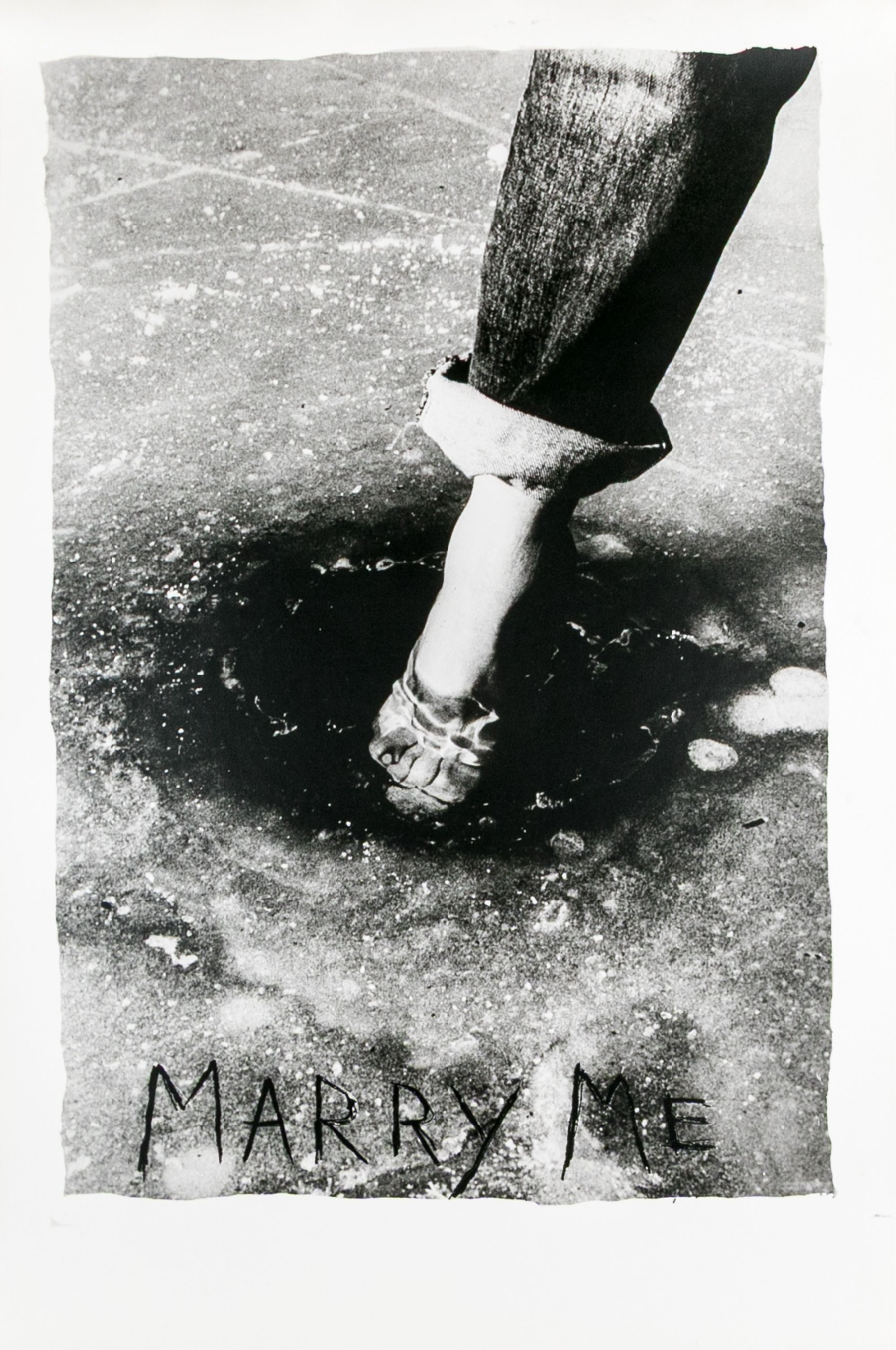 David Seltzer (American, B. 1947) "Marry Me" large gelatin silver print depicting a lone leg with pants rolled up at the ankle to dip toes into a small pool of water. Signed on the verso. Unframed.