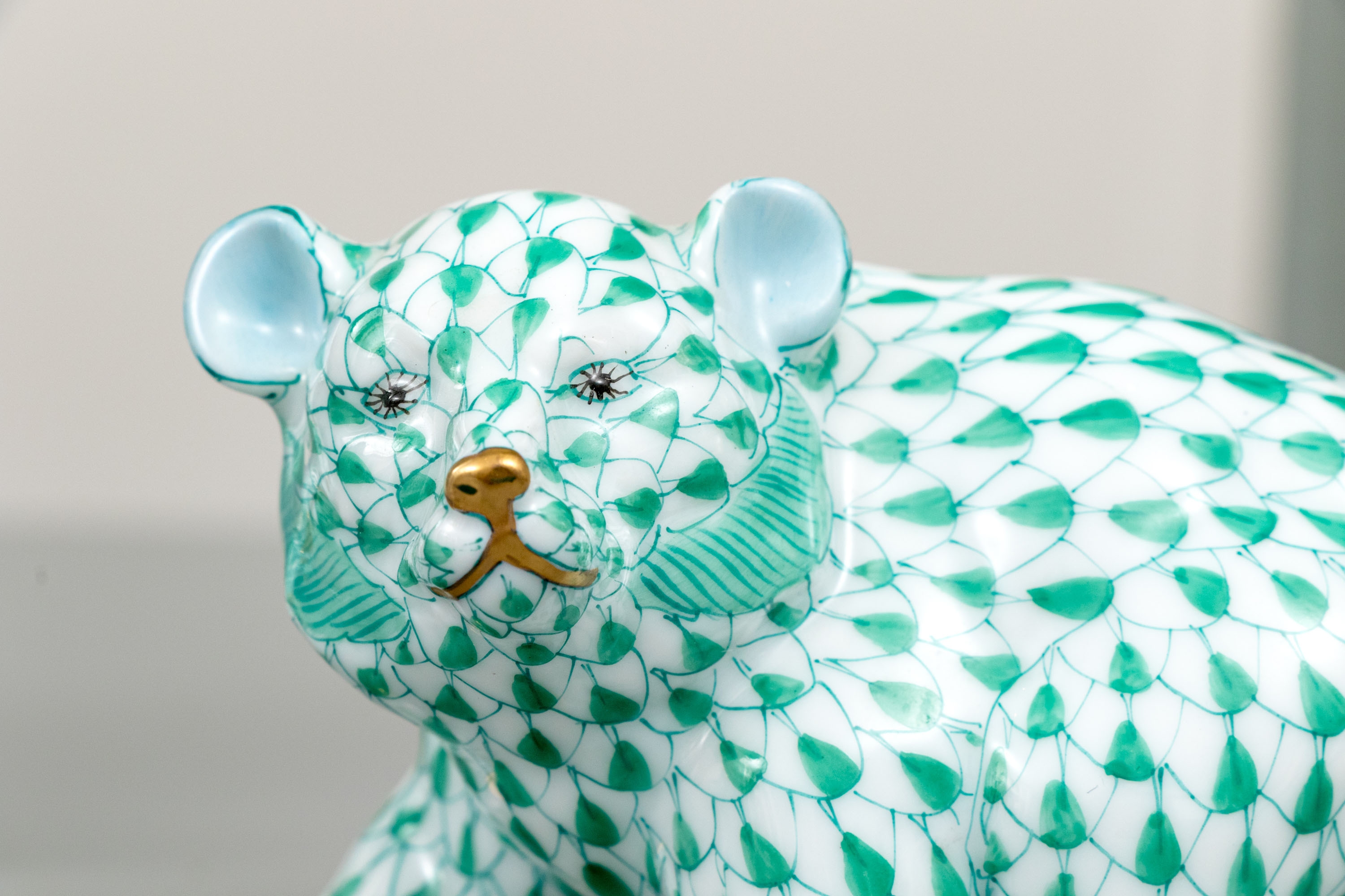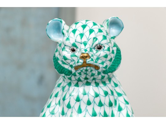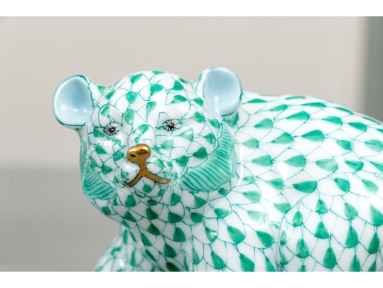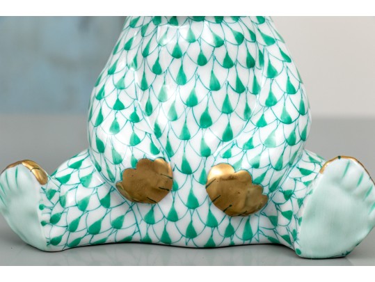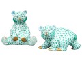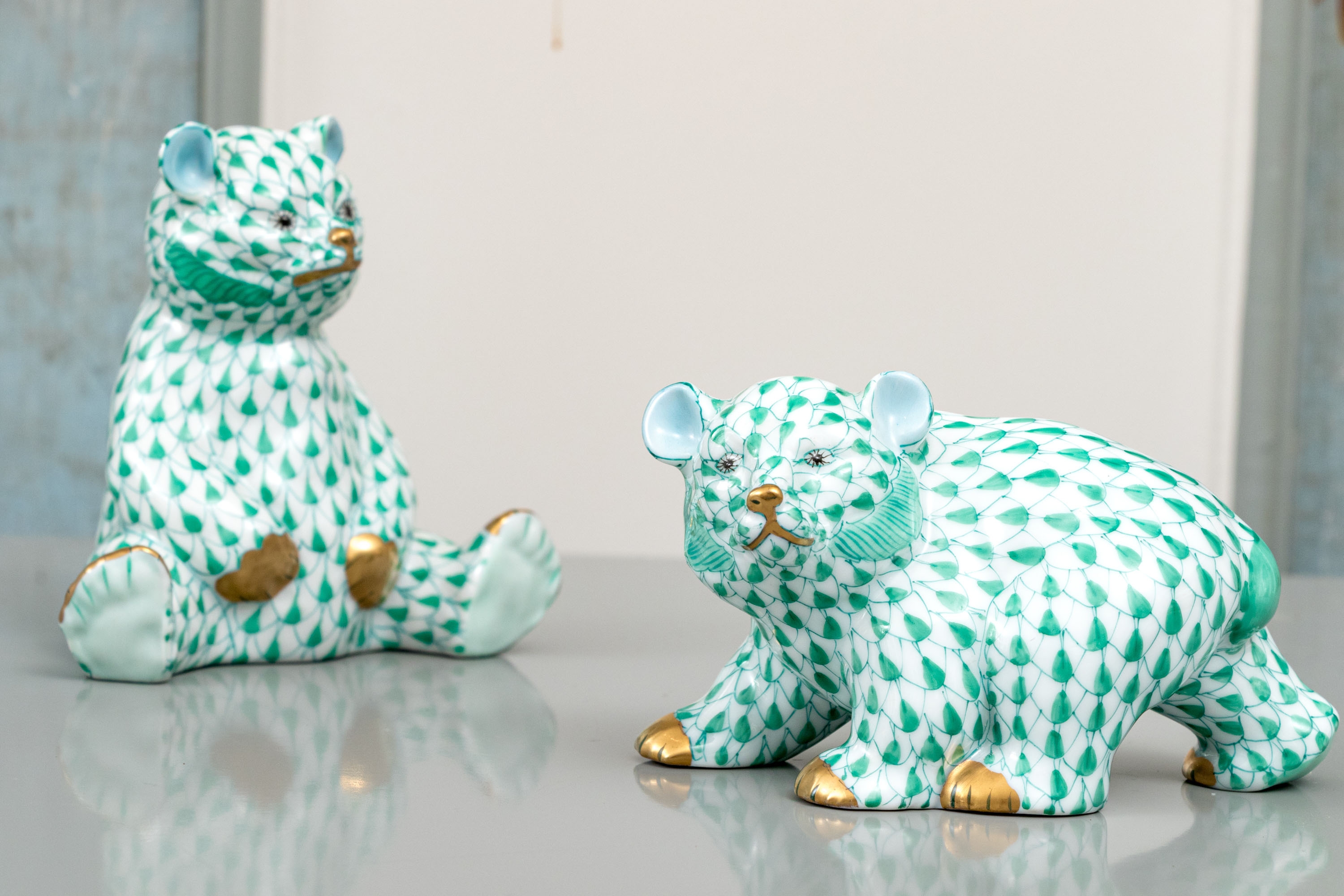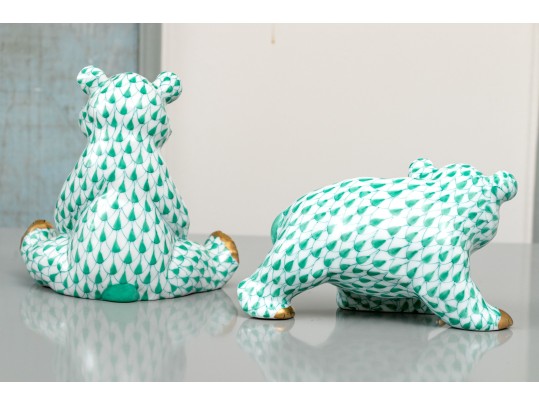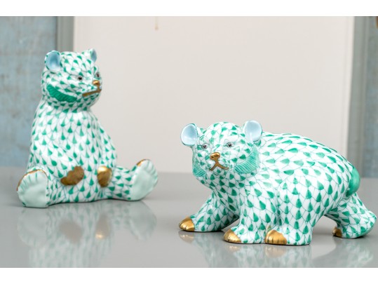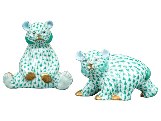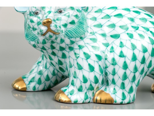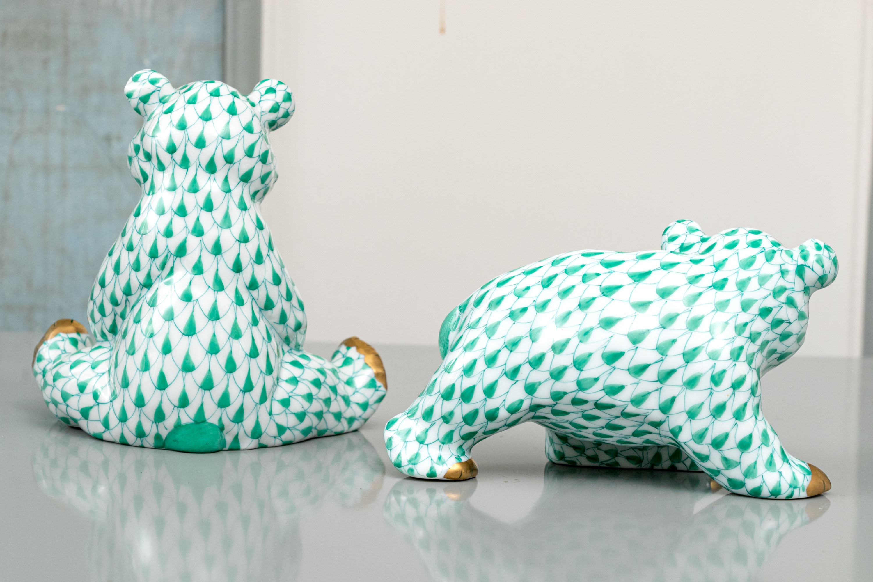 Herend Hungary porcelain bears, each exquisitely hand-painted in the iconic green fishnet (VHV) pattern with 24K gold accents. This delightful duo features one seated bear and one crouching bear. Each piece displays delicate teardrop-scale brushwork in shades of emerald and mint green over a glossy white glaze. The bears’ snouts, paws, and inner ears are finished in soft pastel tones, with gold-enriched paws and muzzles.