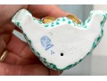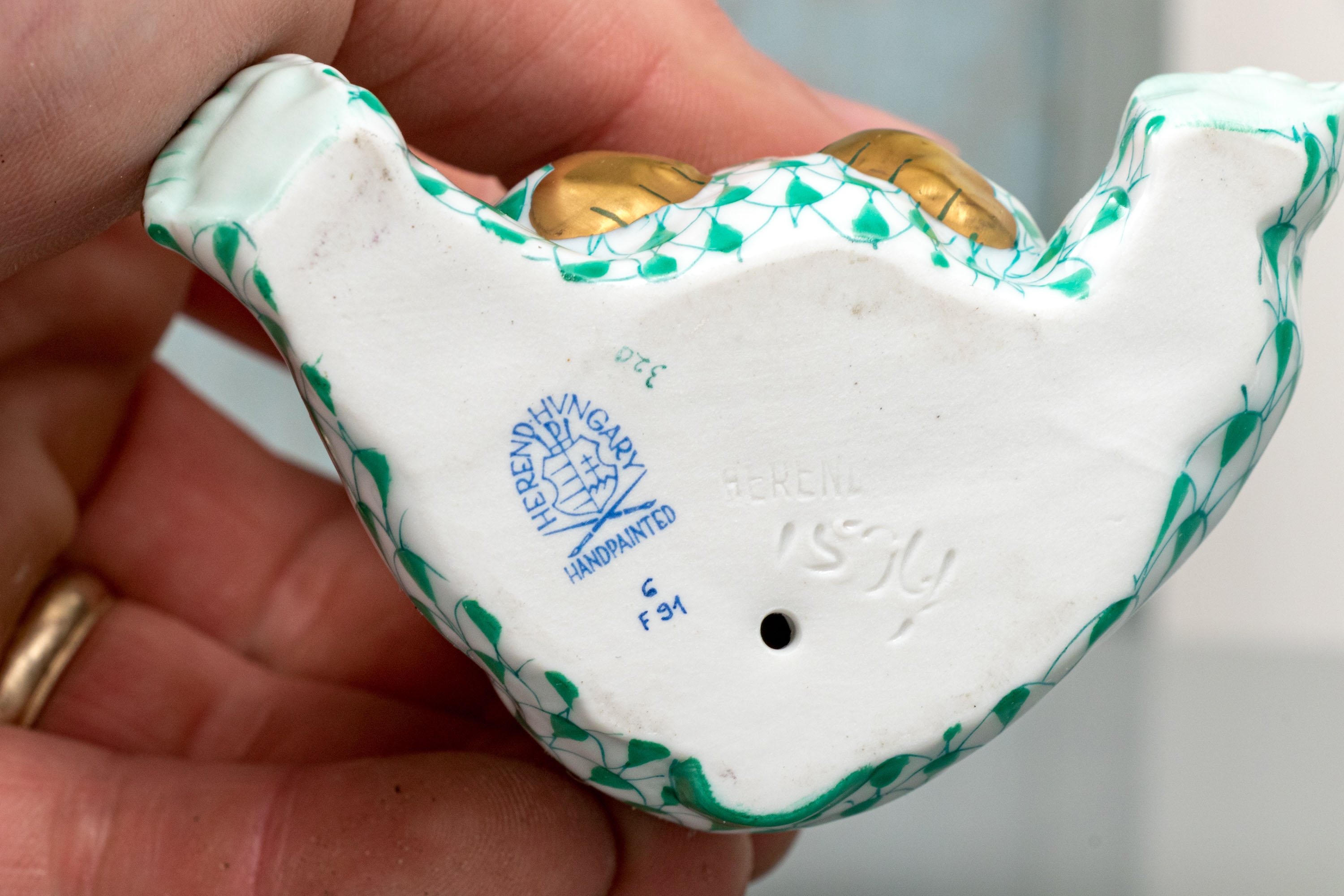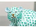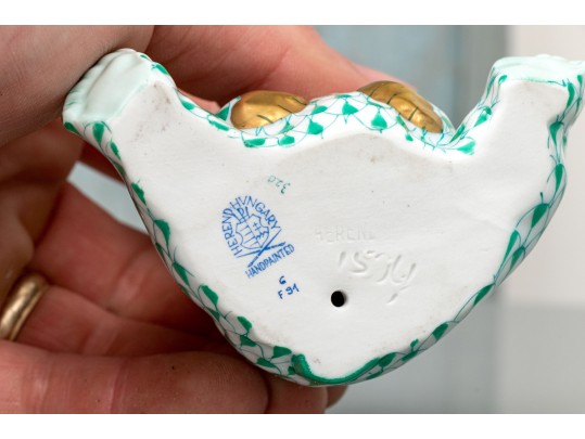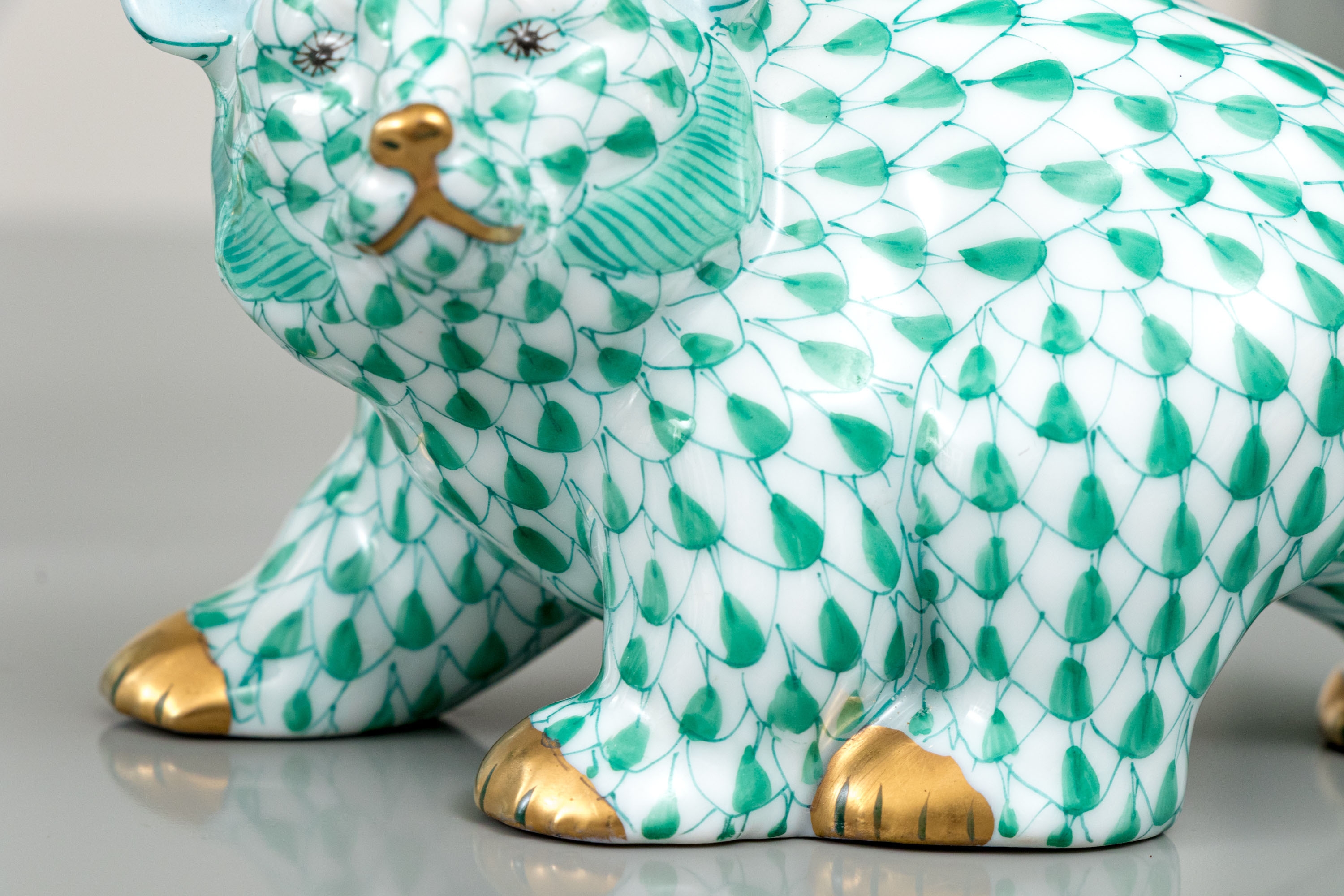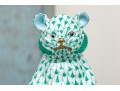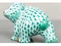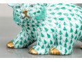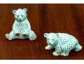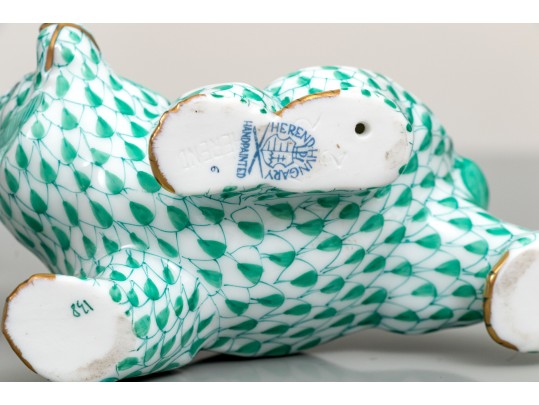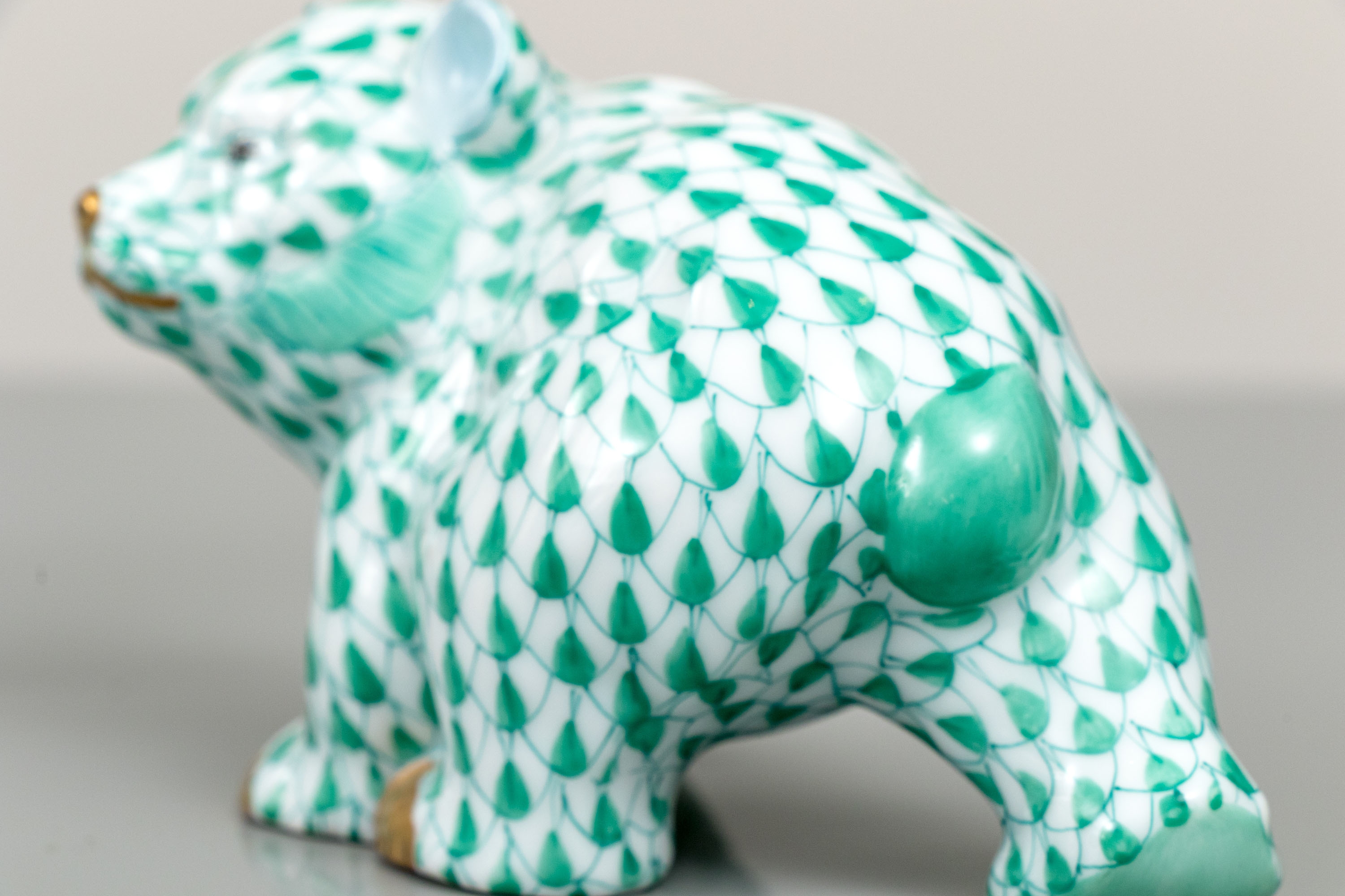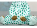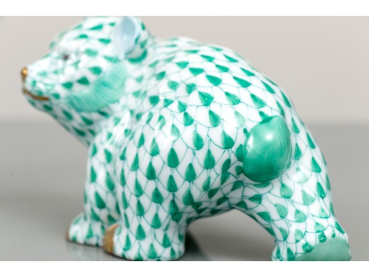 Herend Hungary porcelain bears, each exquisitely hand-painted in the iconic green fishnet (VHV) pattern with 24K gold accents. This delightful duo features one seated bear and one crouching bear. Each piece displays delicate teardrop-scale brushwork in shades of emerald and mint green over a glossy white glaze. The bears’ snouts, paws, and inner ears are finished in soft pastel tones, with gold-enriched paws and muzzles.