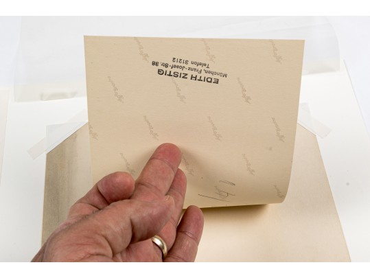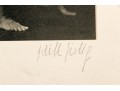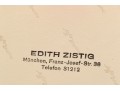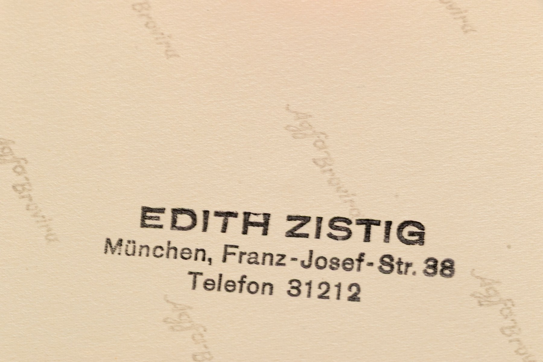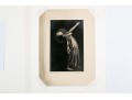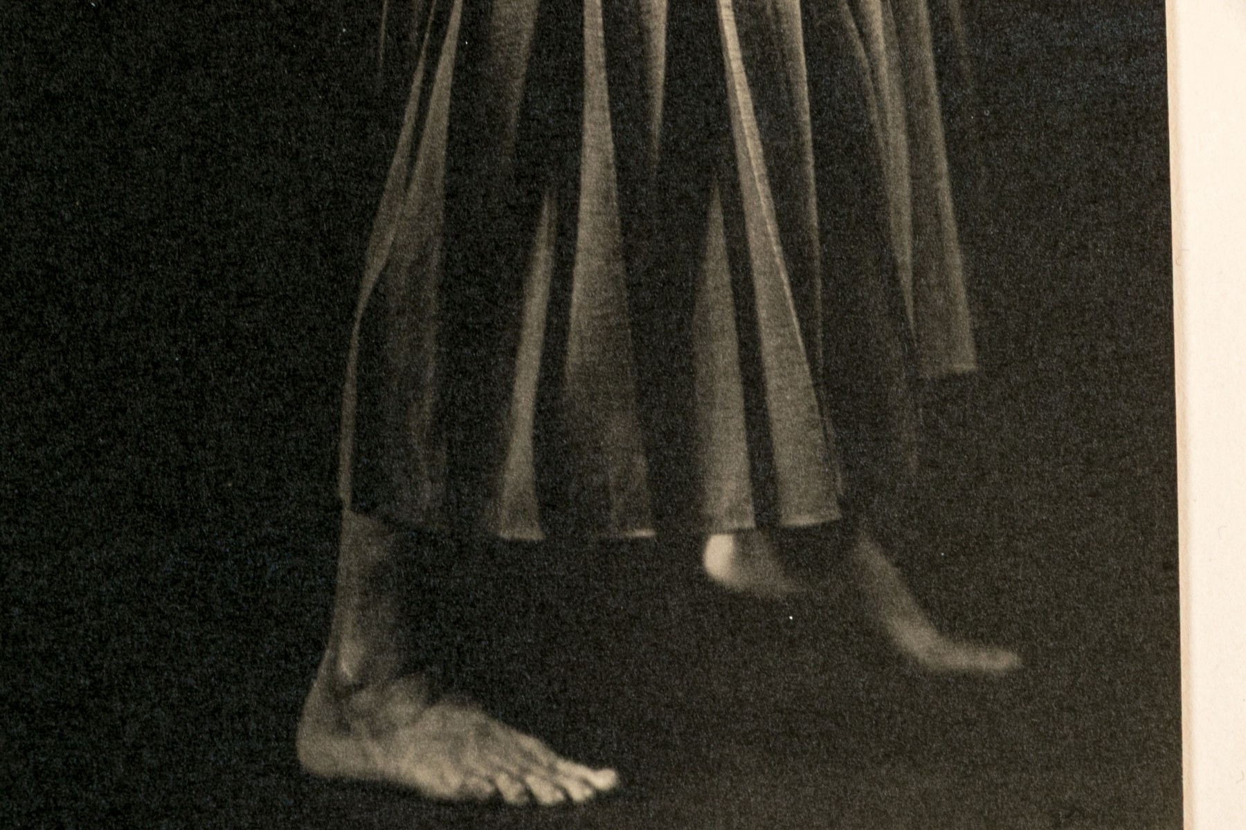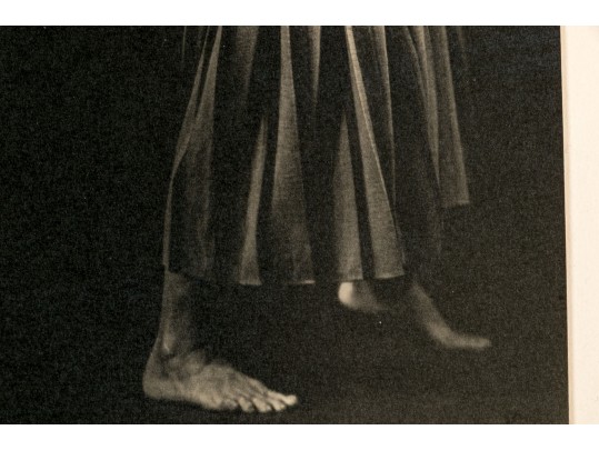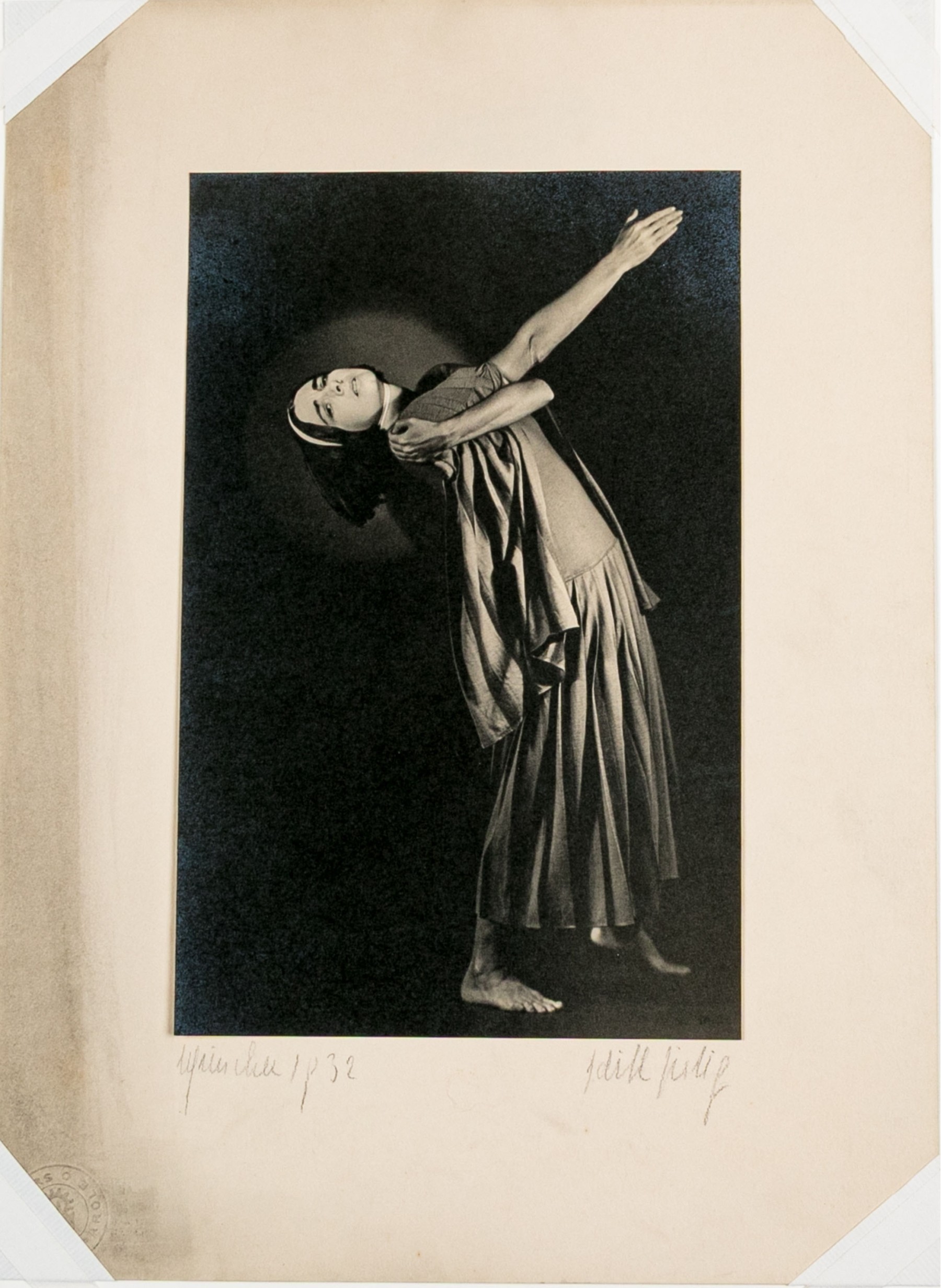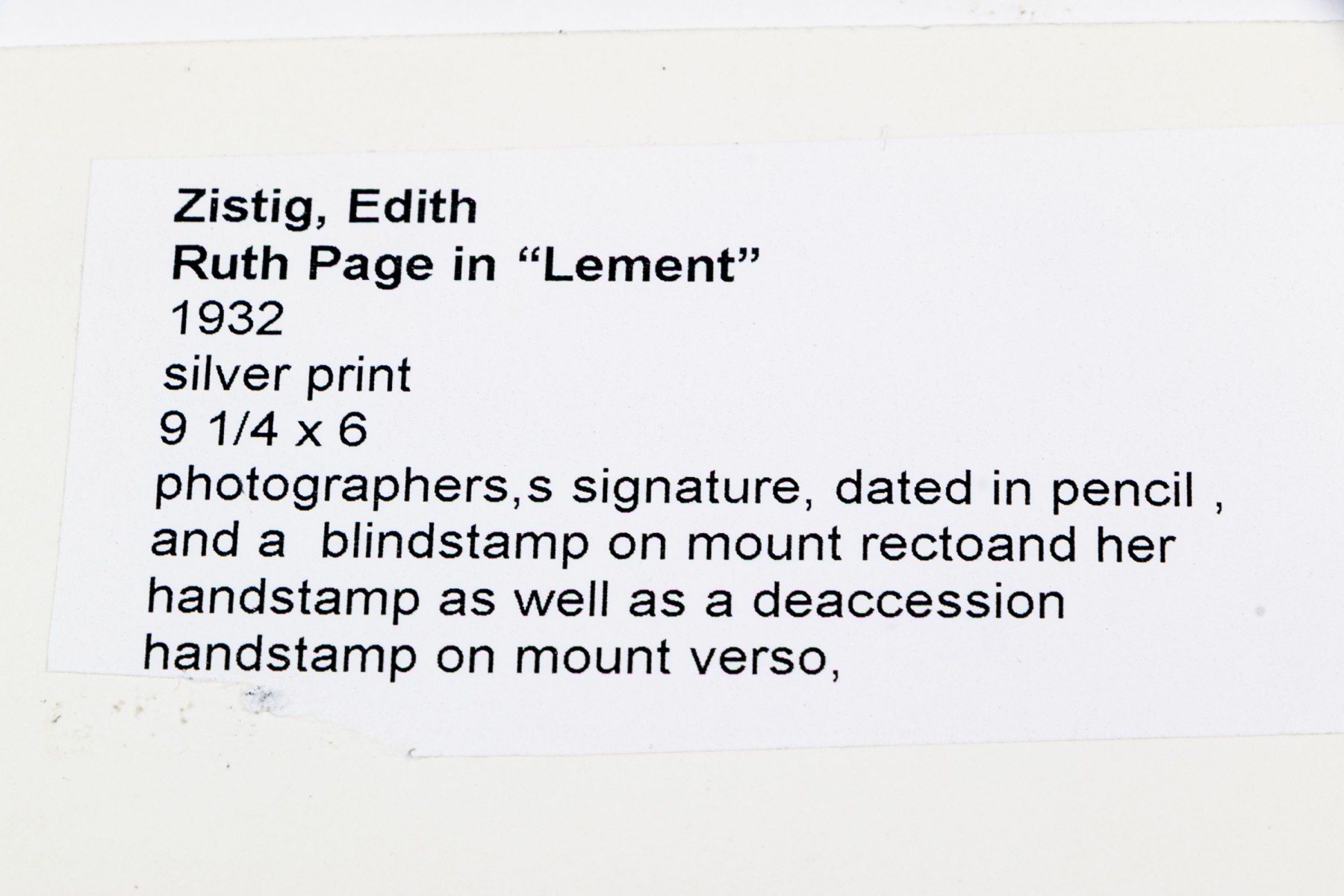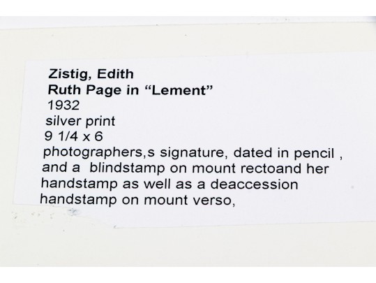 Edith Zistig (German, a. 1930's) Ruth Page in "Lement" gelatin silver print depicting a woman in a long dress standing in a dramatic stretching pose with one hand reaching around to the opposite shoulder, leaning backwards against a dark ground. Pencil signed lower right with blindstamps and handstamps. Unframed.