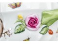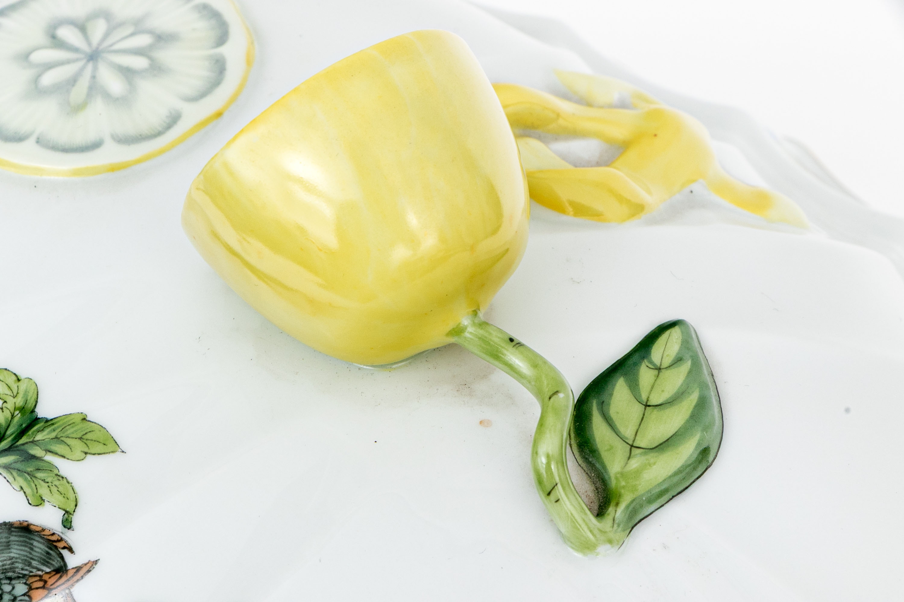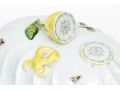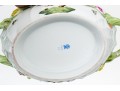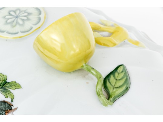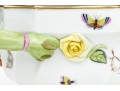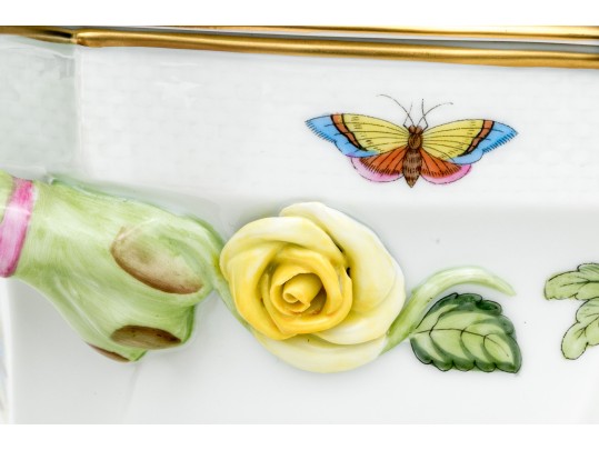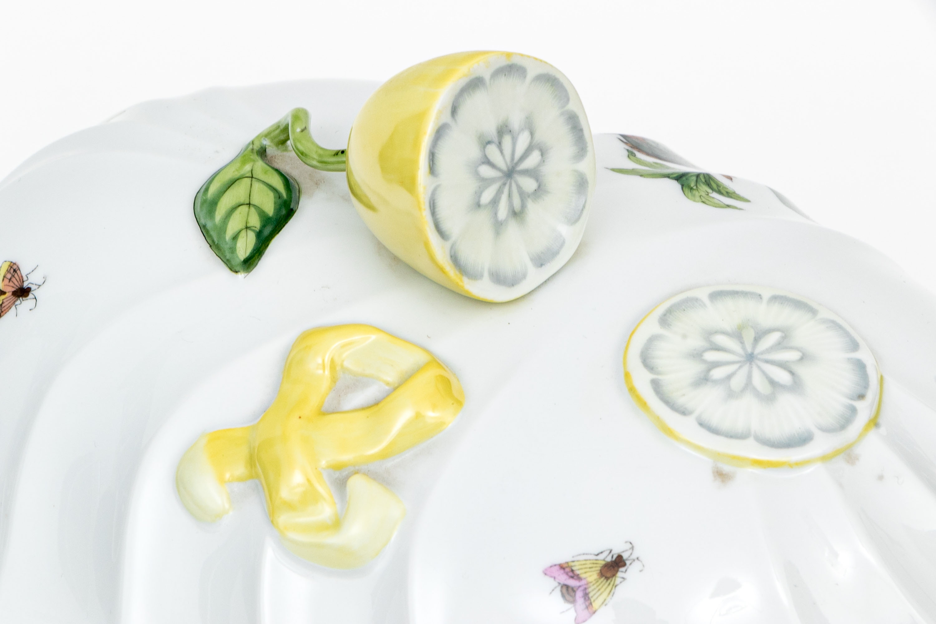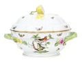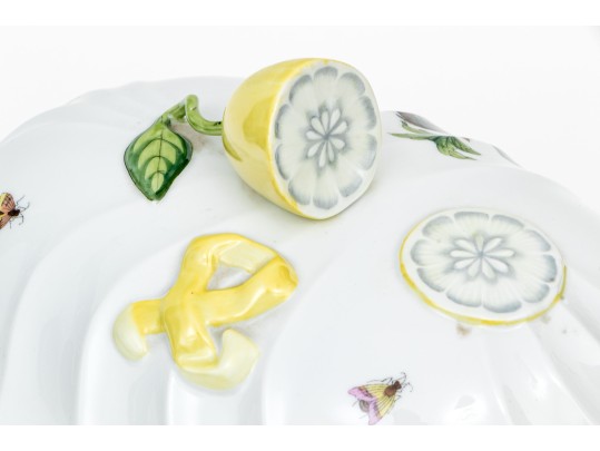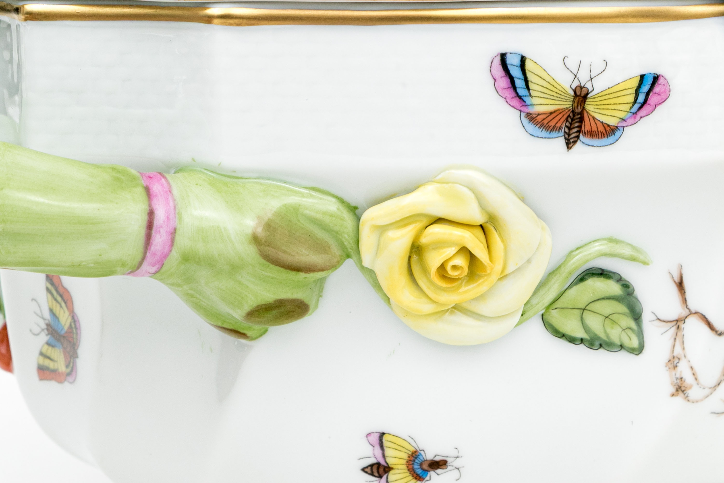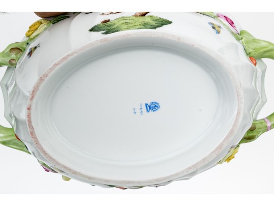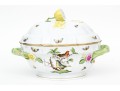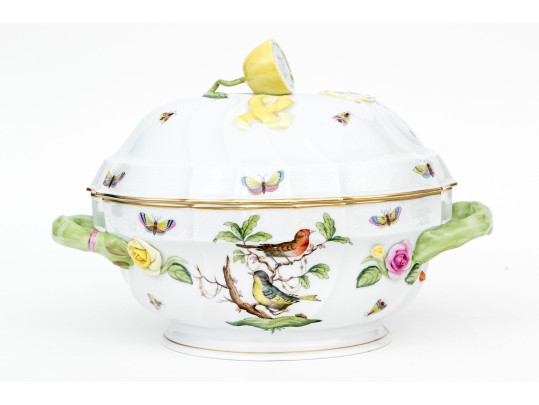 Herend Hungary hand-painted porcelain covered tureen, decorated in the Rothschild Bird (RO) pattern. The tureen features detailed songbirds perched on leafy branches with necklace, surrounded by vibrant butterflies, bees, and insects, all rendered in luminous hand-painted enamels. The vine-formed handles are painted in soft green with applied yellow and pink porcelain roses, while the lid is topped with a sculpted lemon finial and leaves. Both body and lid are finished with Herend’s signature basketweave embossed texture (fish-scale relief) and 24k gold accents along the rims. The underside bears the Herend Hungary blue shield hallmark with crossed paintbrushes, HANDPAINTED inscription, and pattern number 1015/RO.