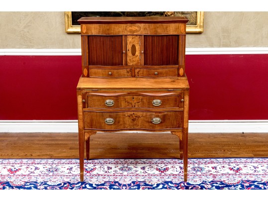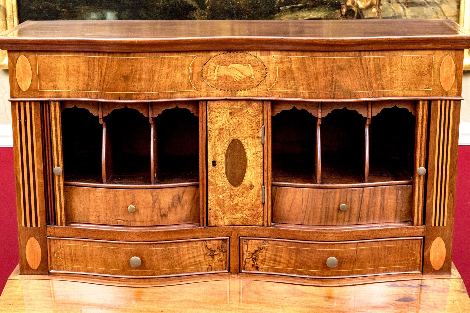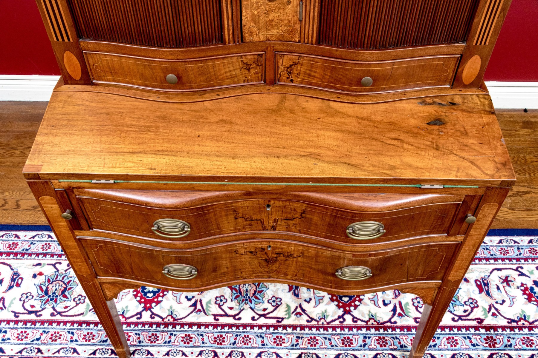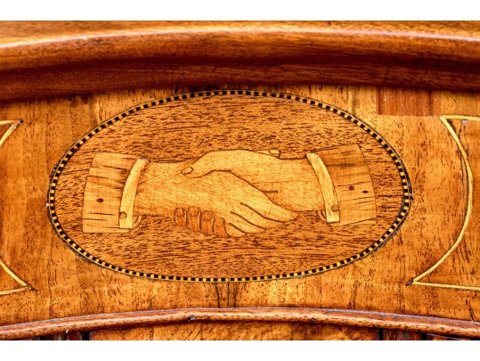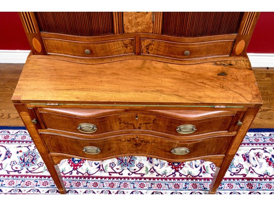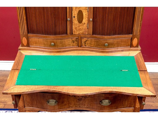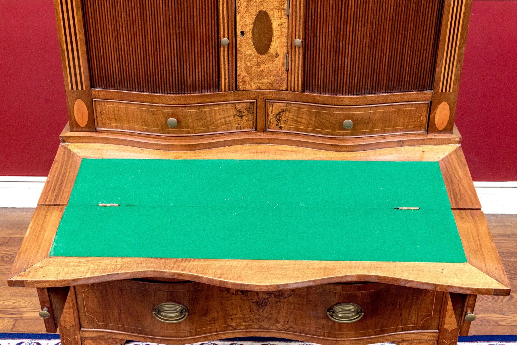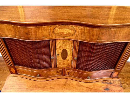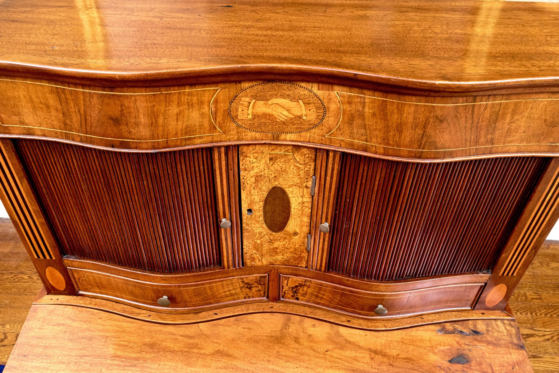 Standing on four square tapered legs with satinwood inlay. Carved bracket supports with two fabulous serpentine form drawer fronts with the top drawer flanked by pulls which support the flip top desk. The above section with a pair of drawers below a pair of tambour doors. A marvelous marquetry inlaid oval medallion to center top depicting hands shaking.