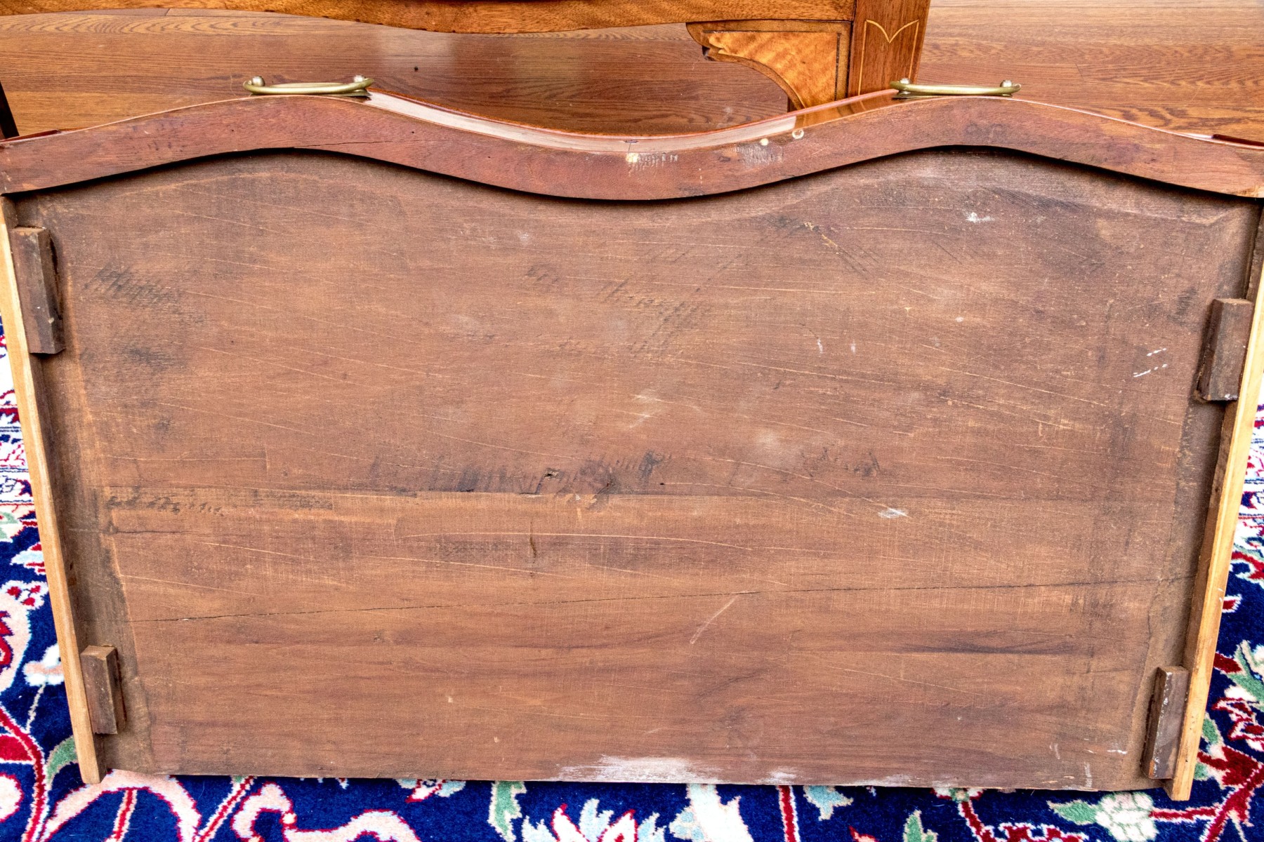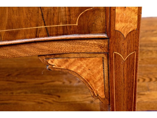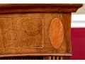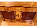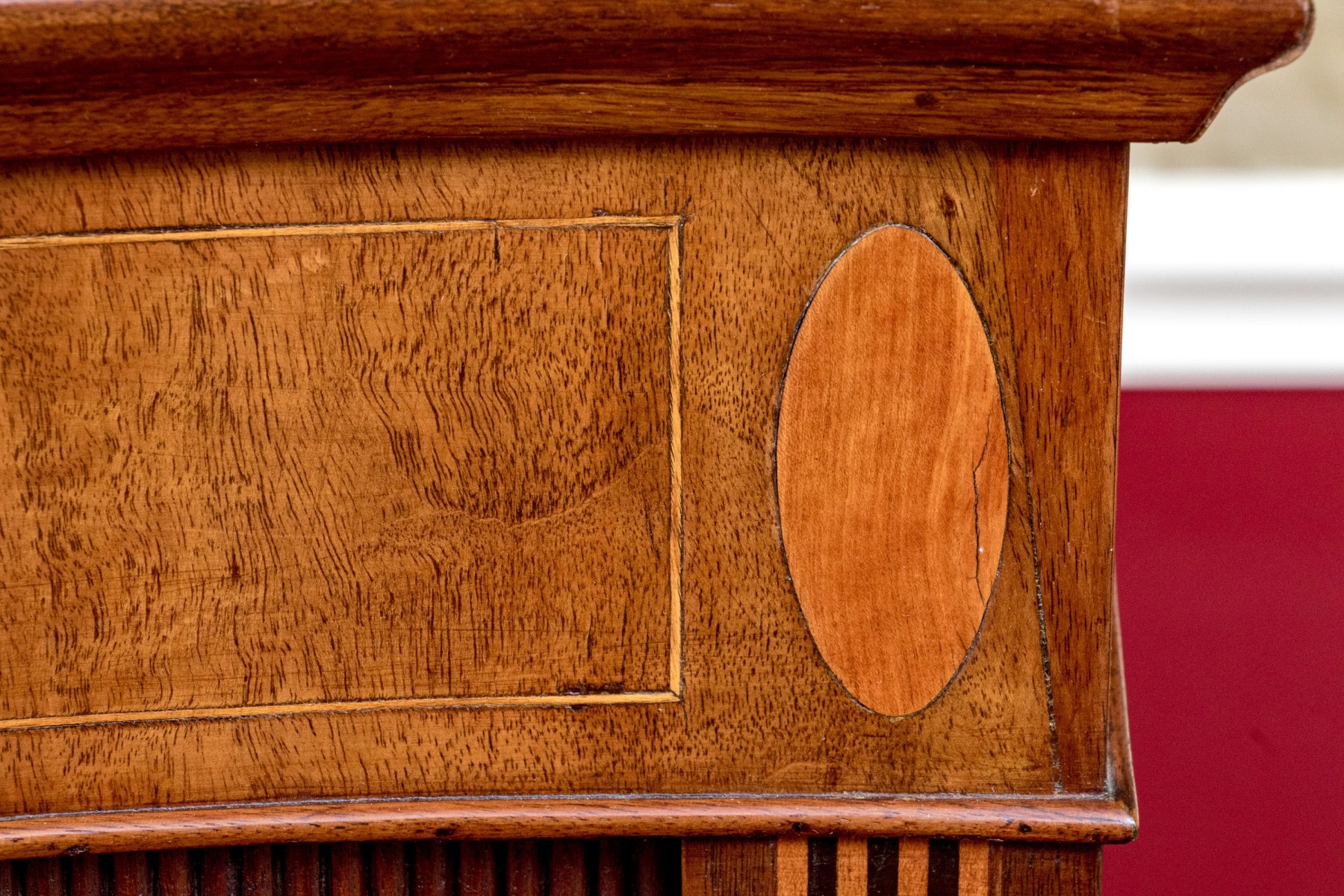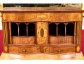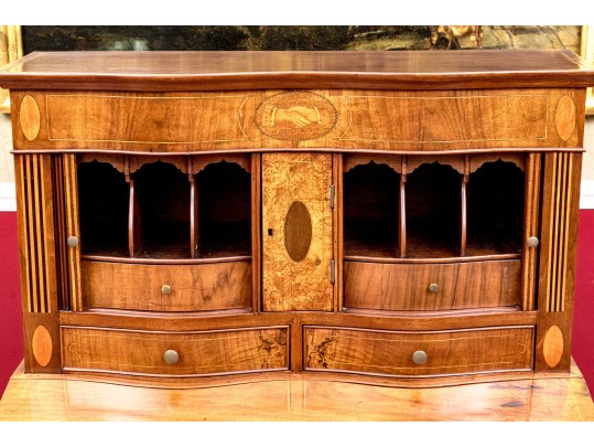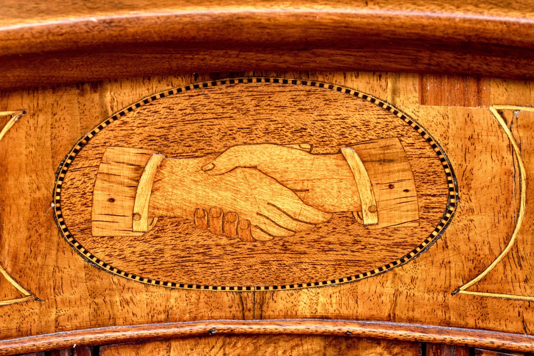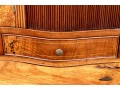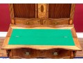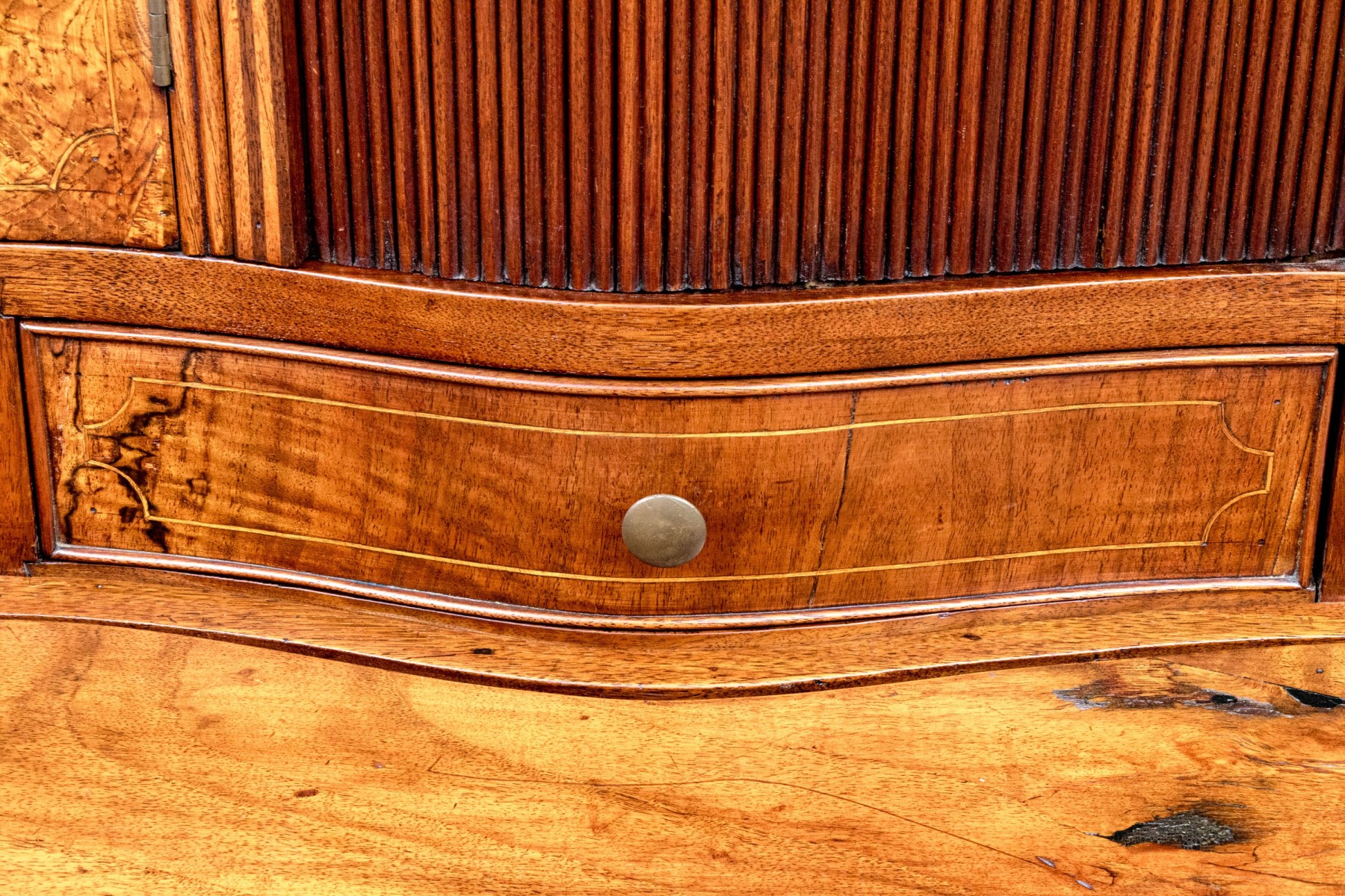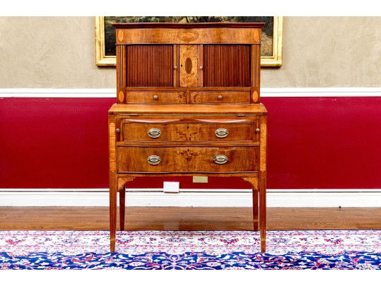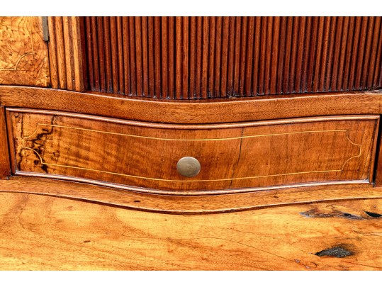 Standing on four square tapered legs with satinwood inlay. Carved bracket supports with two fabulous serpentine form drawer fronts with the top drawer flanked by pulls which support the flip top desk. The above section with a pair of drawers below a pair of tambour doors. A marvelous marquetry inlaid oval medallion to center top depicting hands shaking.