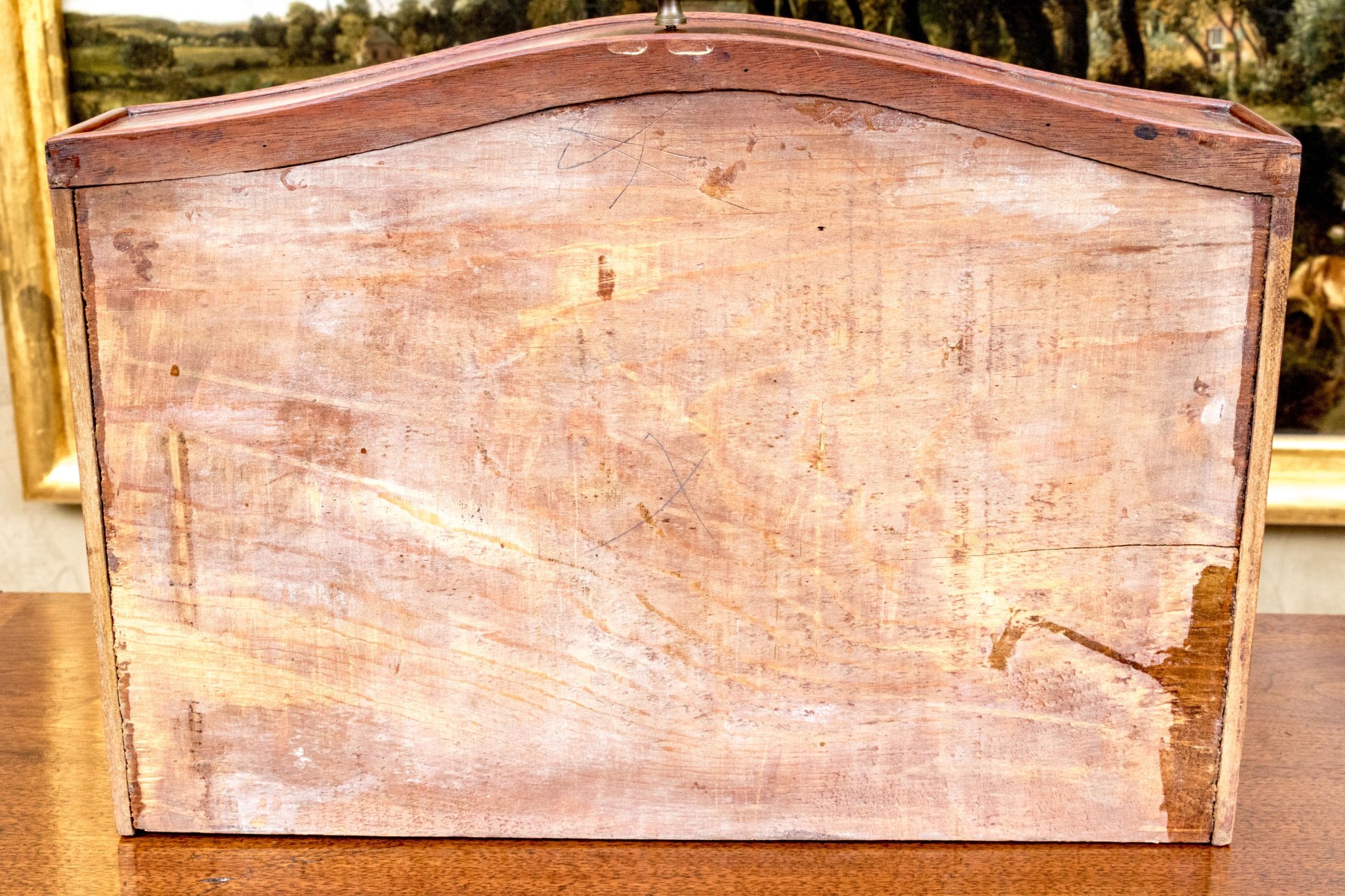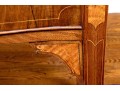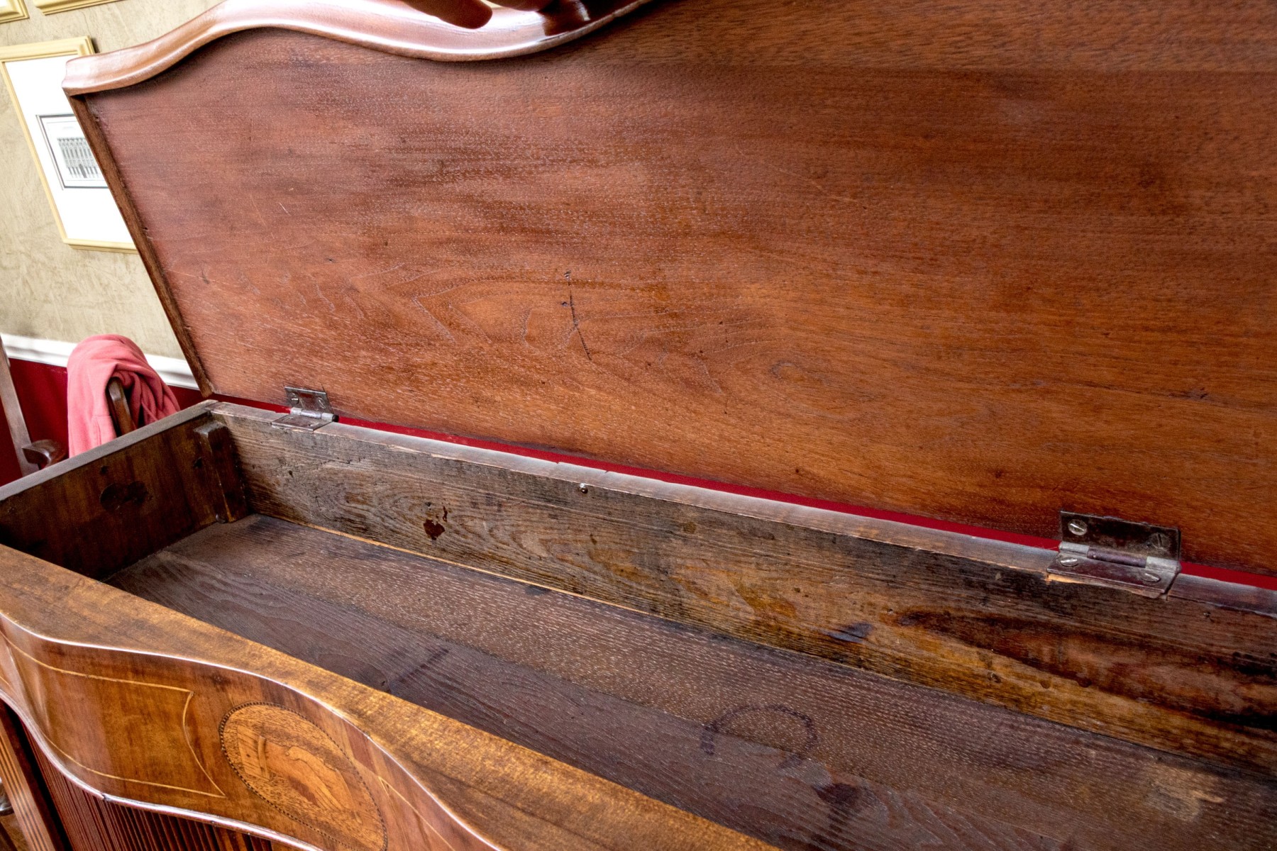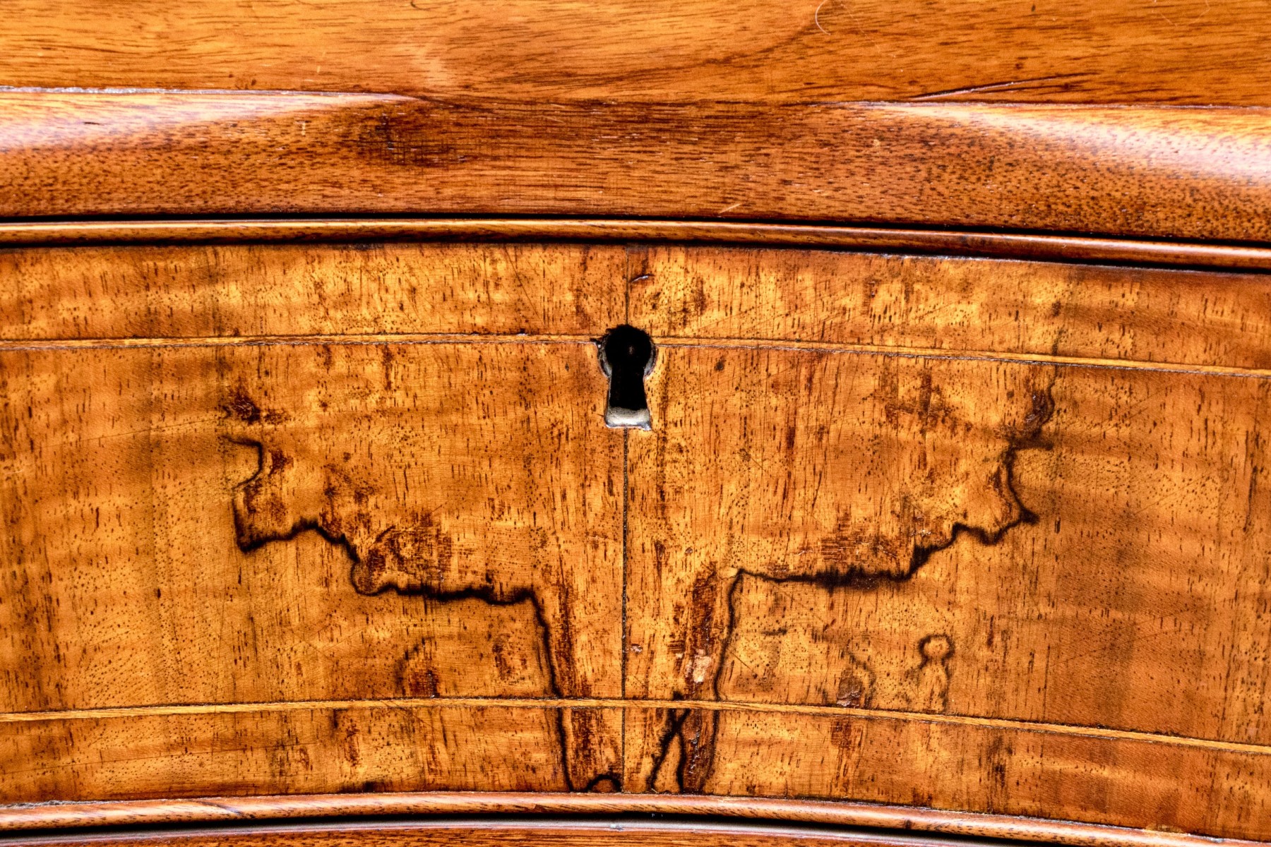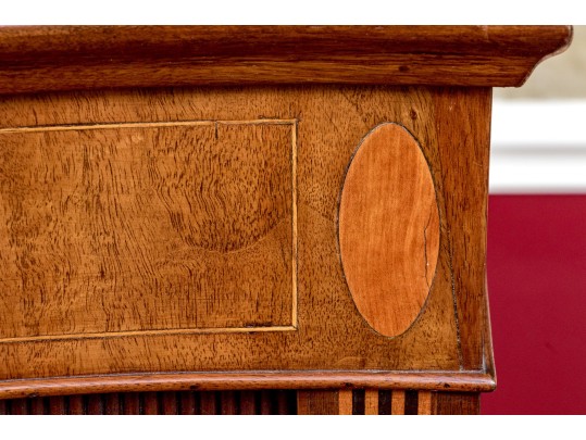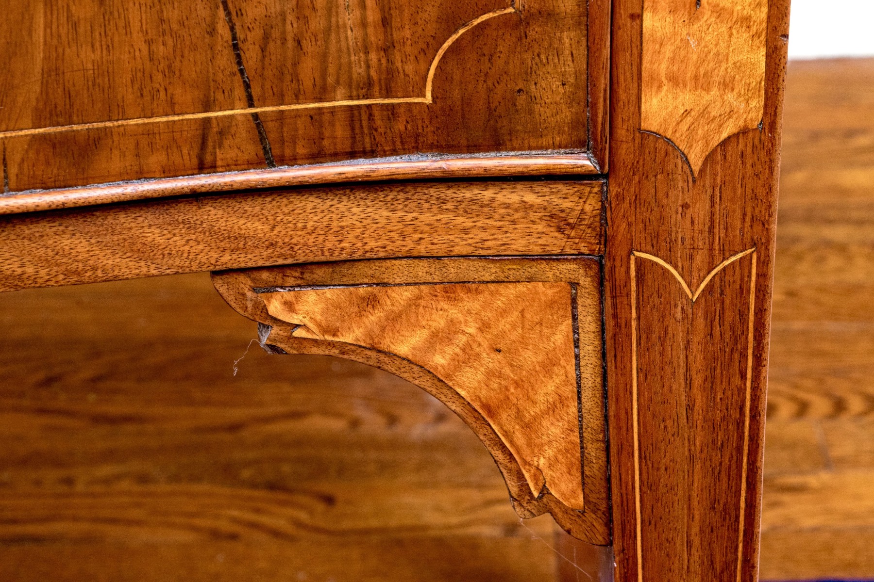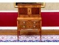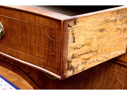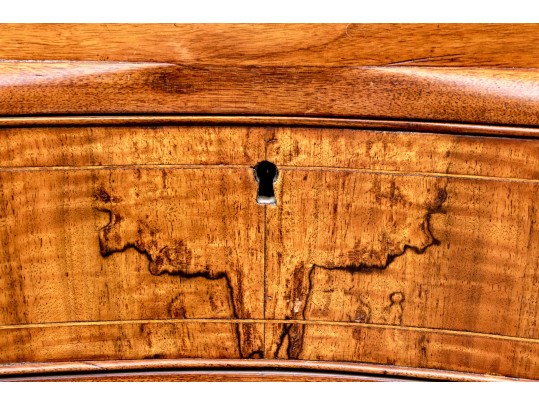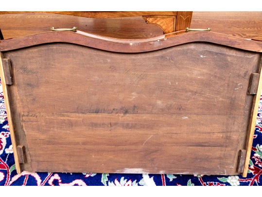 Standing on four square tapered legs with satinwood inlay. Carved bracket supports with two fabulous serpentine form drawer fronts with the top drawer flanked by pulls which support the flip top desk. The above section with a pair of drawers below a pair of tambour doors. A marvelous marquetry inlaid oval medallion to center top depicting hands shaking.