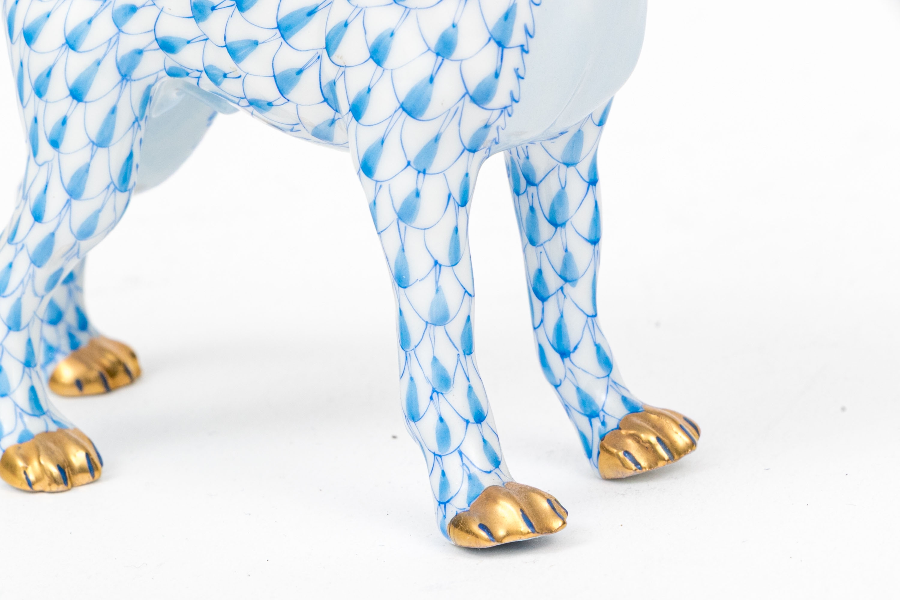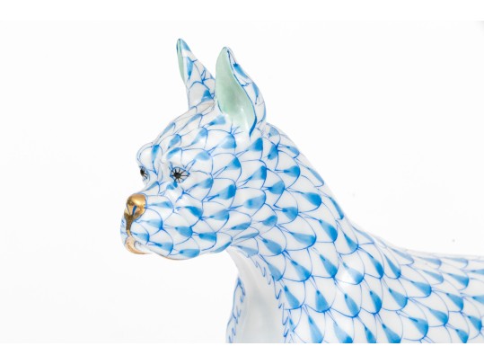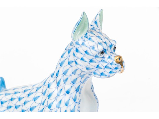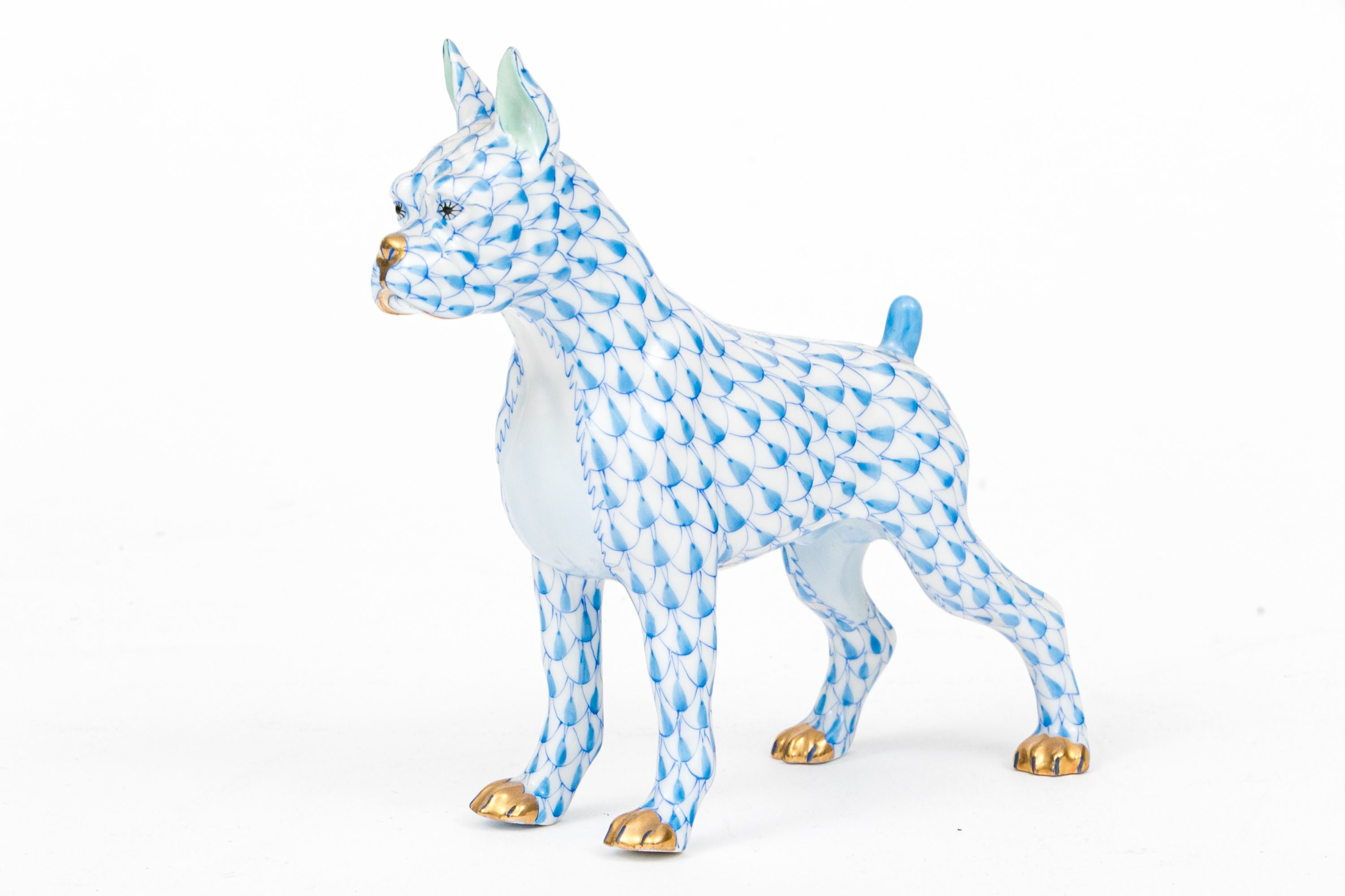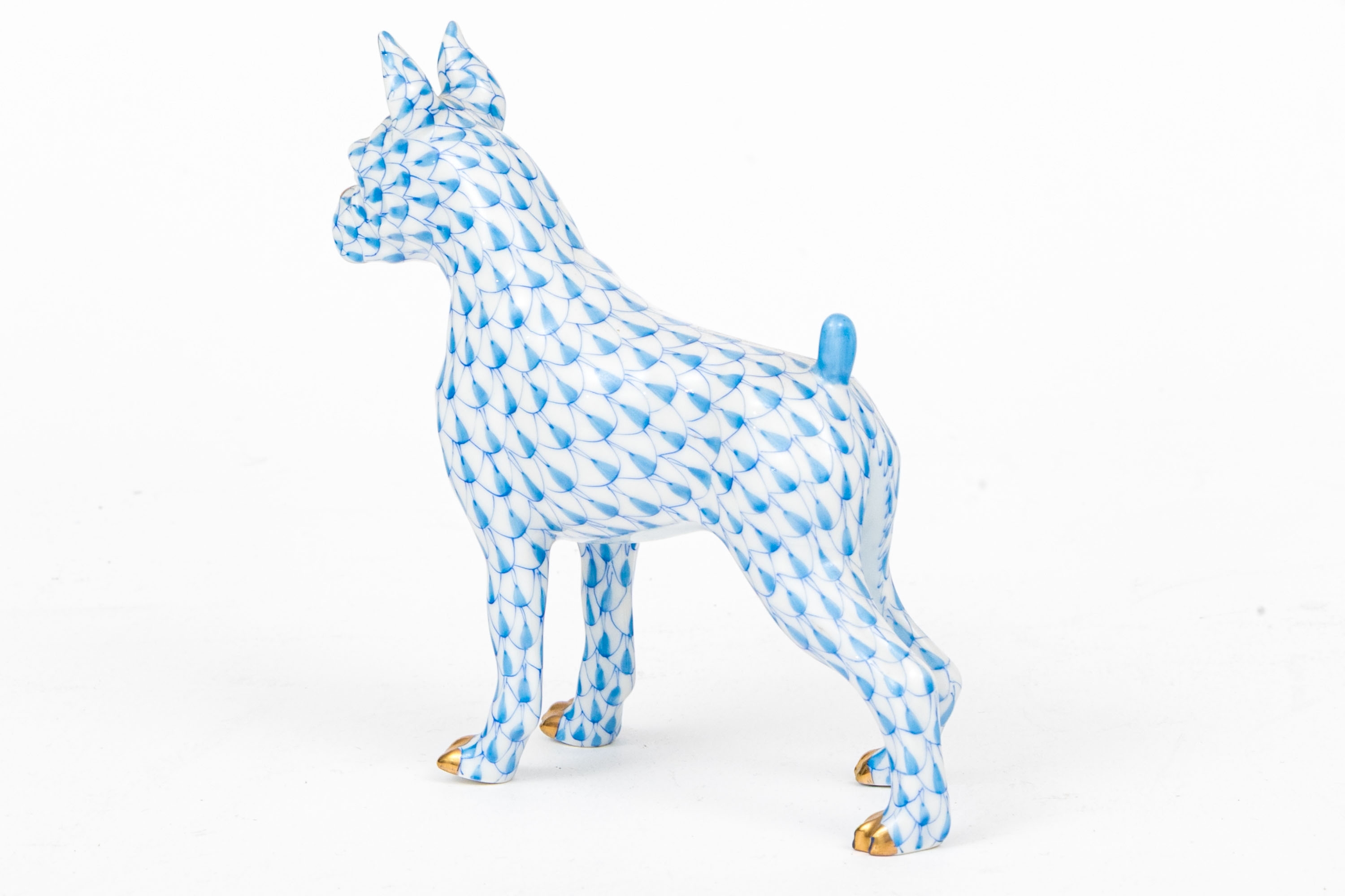 Exquisite hand-painted porcelain figure by Herend Hungary depicting a boxer dog in the classic fishnet blue pattern. The dog stands alert, modeled with precise musculature and an expressive stance, accented with 24K gilt detailing at the paws, nose, and tail tip. The inner ears are painted in soft green tones. Marked on the underside with the blue Herend Hungary shield and crossed paintbrushes, inscribed First Edition, and pattern/model number 15565/SVHB.