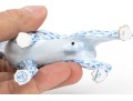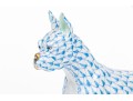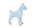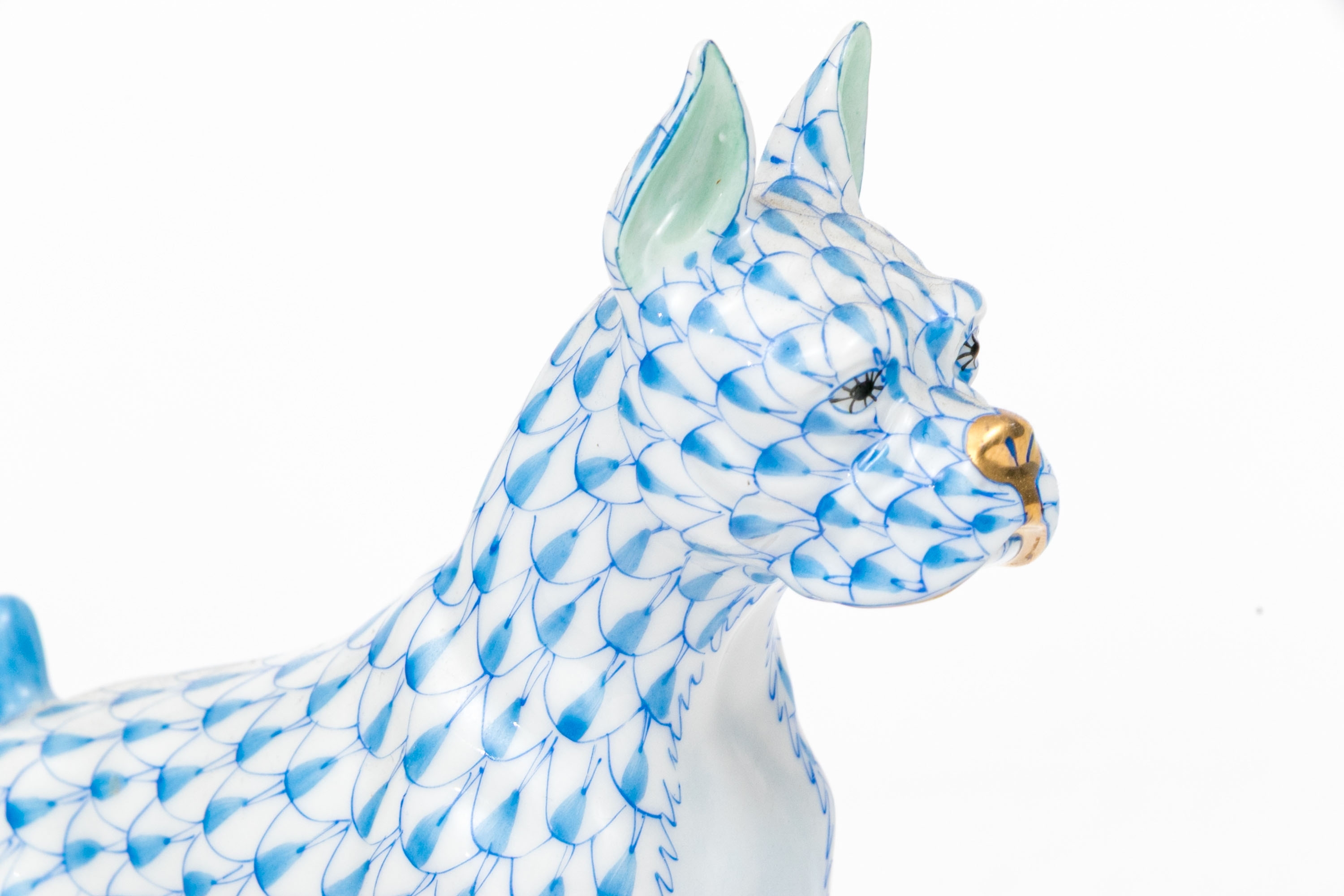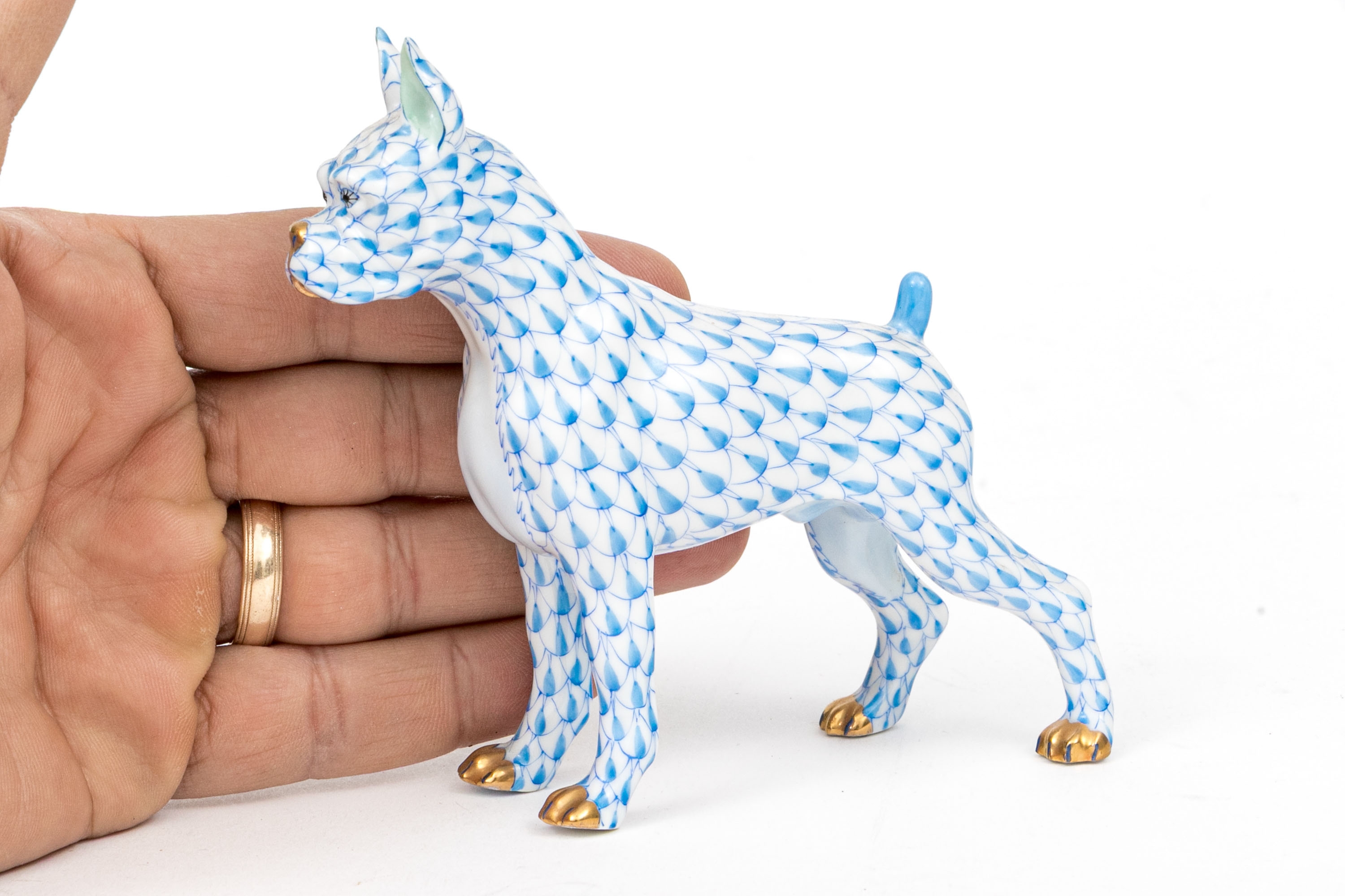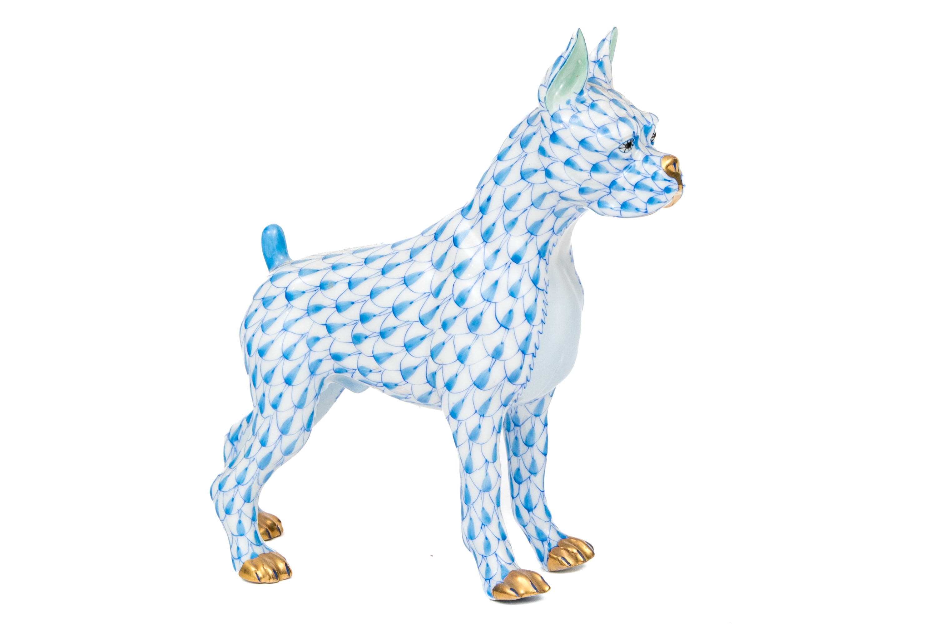 Exquisite hand-painted porcelain figure by Herend Hungary depicting a boxer dog in the classic fishnet blue pattern. The dog stands alert, modeled with precise musculature and an expressive stance, accented with 24K gilt detailing at the paws, nose, and tail tip. The inner ears are painted in soft green tones. Marked on the underside with the blue Herend Hungary shield and crossed paintbrushes, inscribed First Edition, and pattern/model number 15565/SVHB.