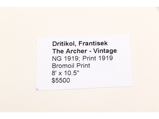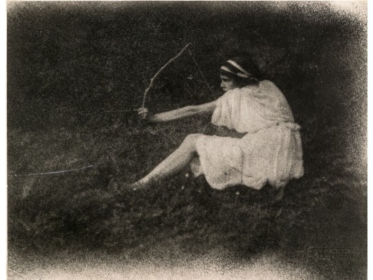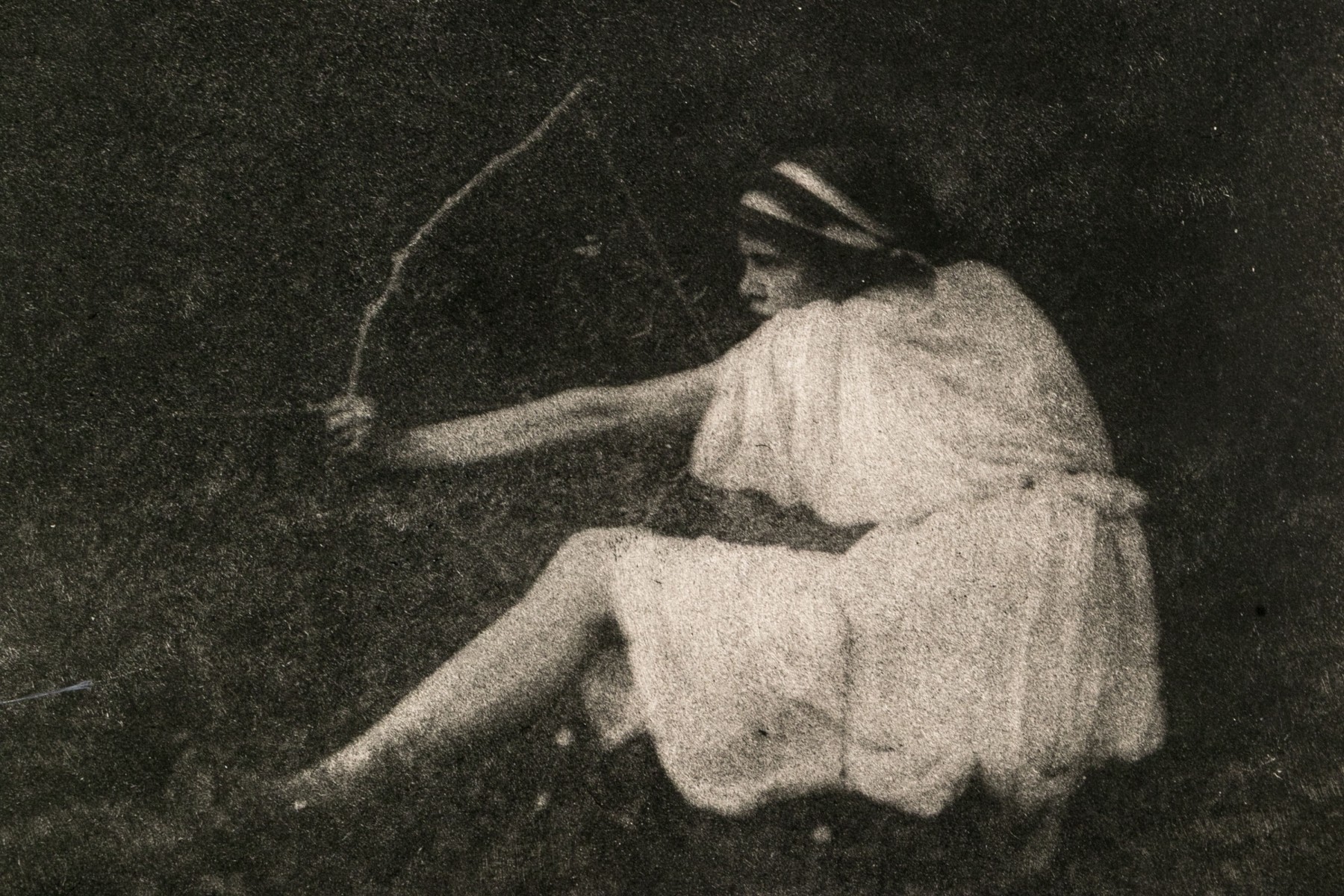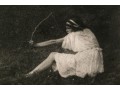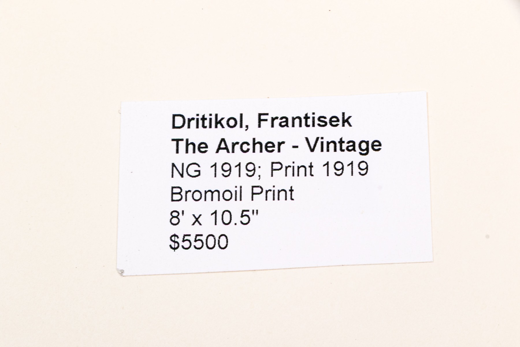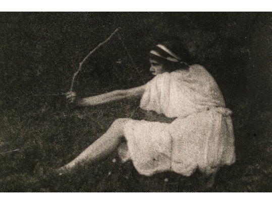 Frantisek Drtikol (Czech, 1883-1961) "The Archer (1919)" bromoil print depicting a woman with dark hair wearing a headband and white dress seated in a grassy field in profile, pulling a bow and arrow taught with a focused expression. Unframed.